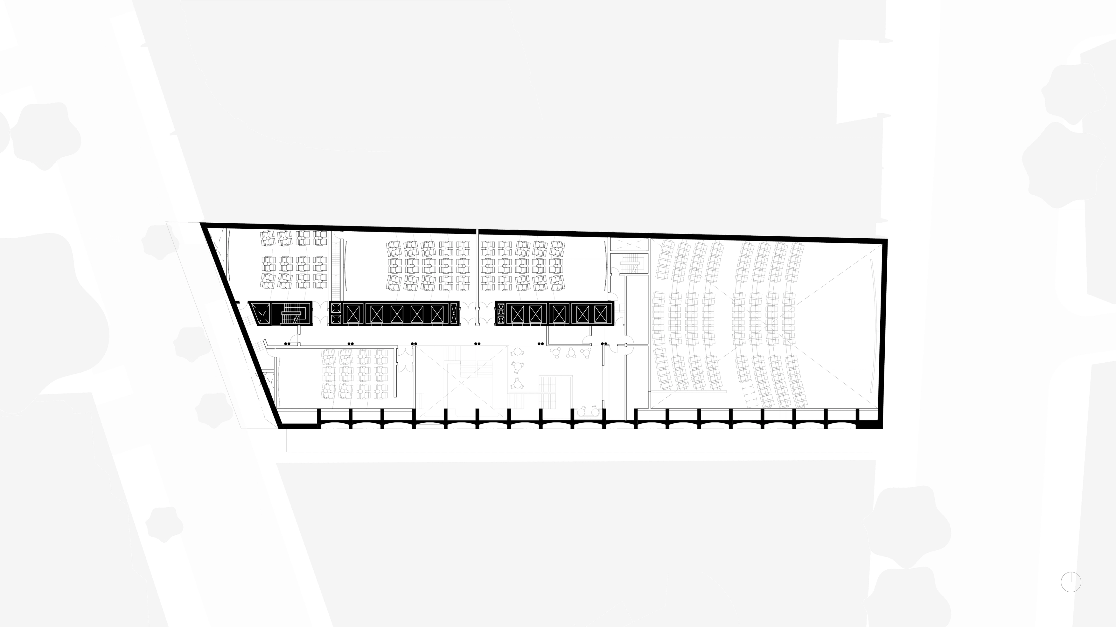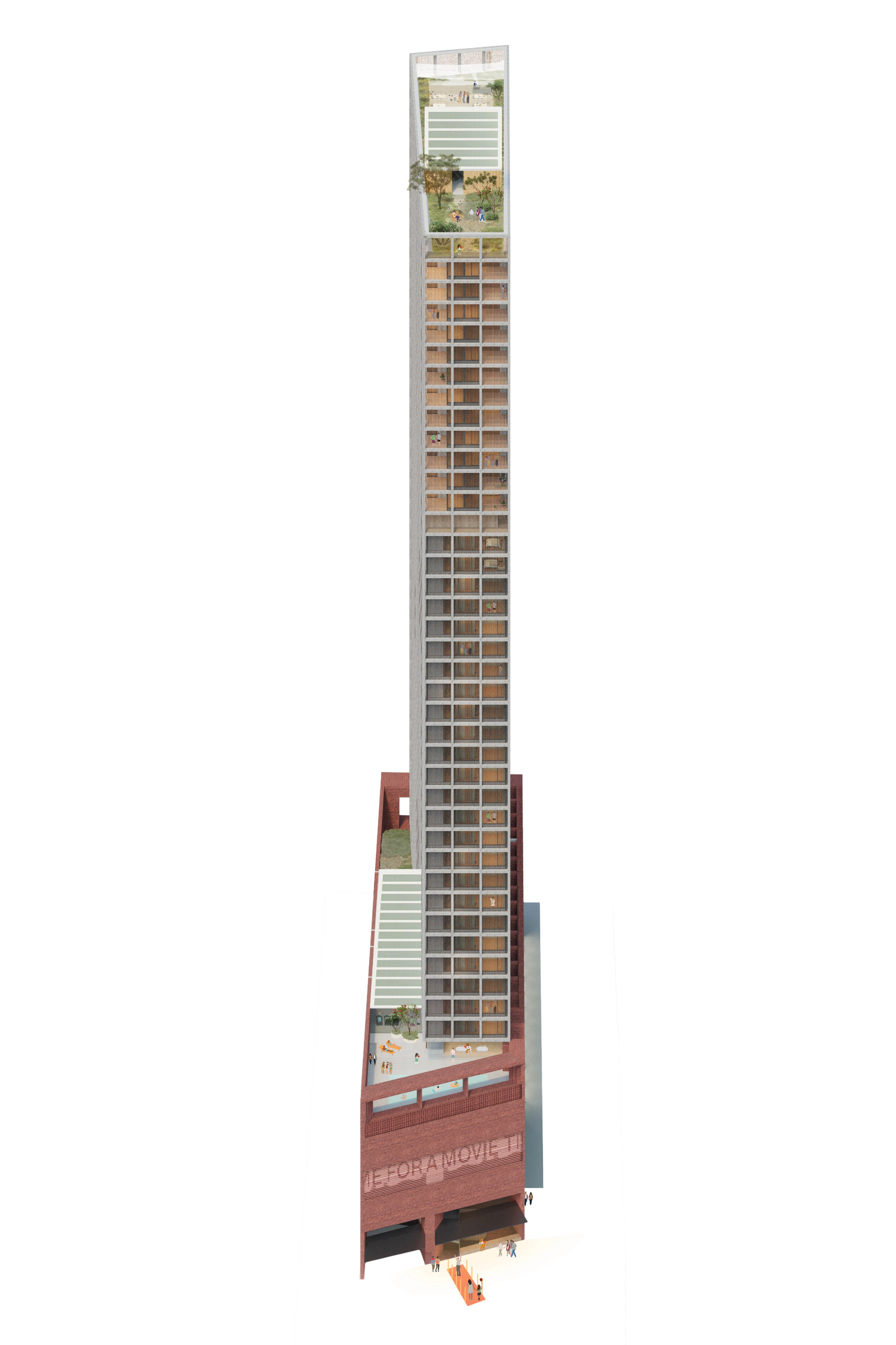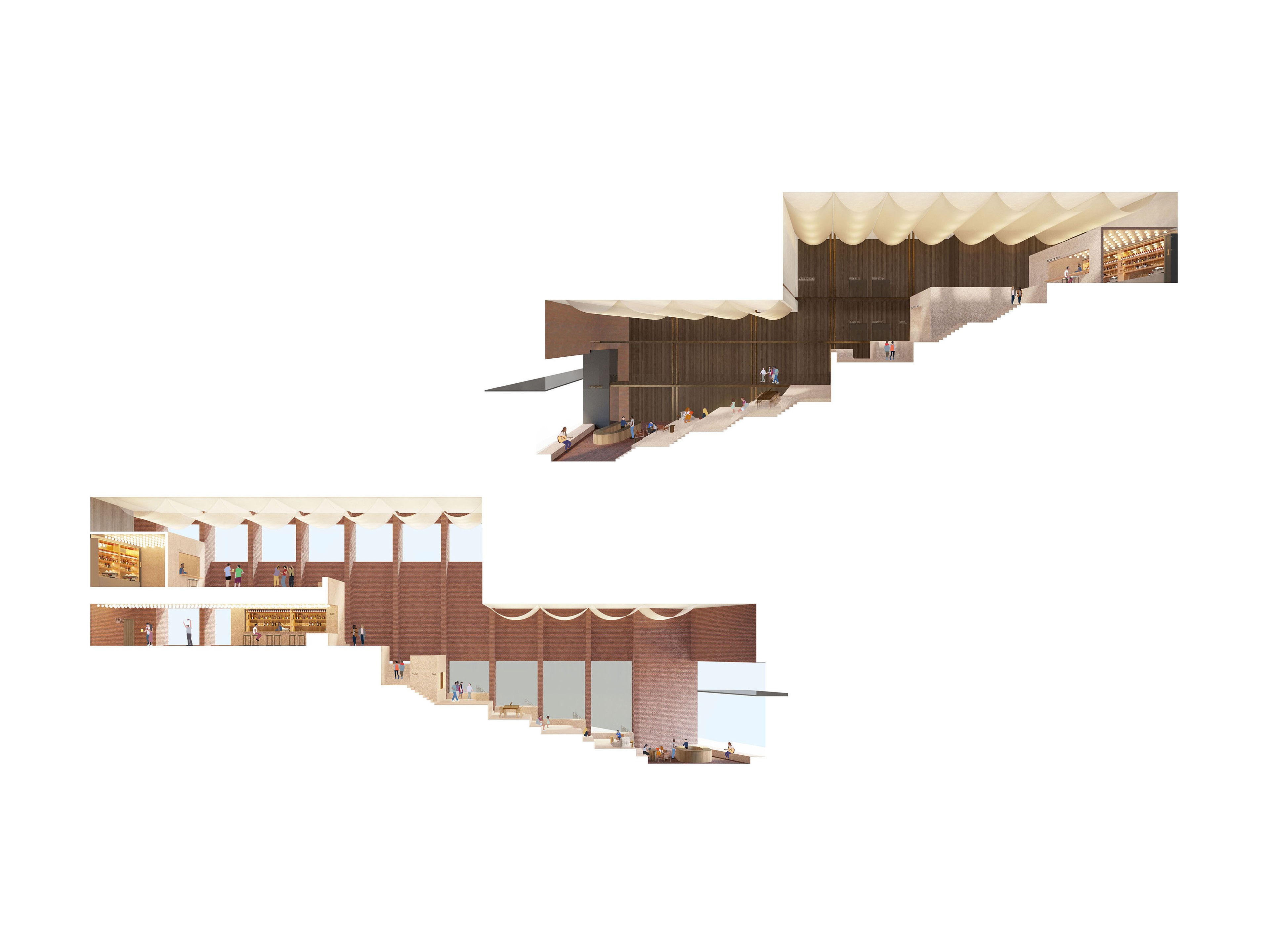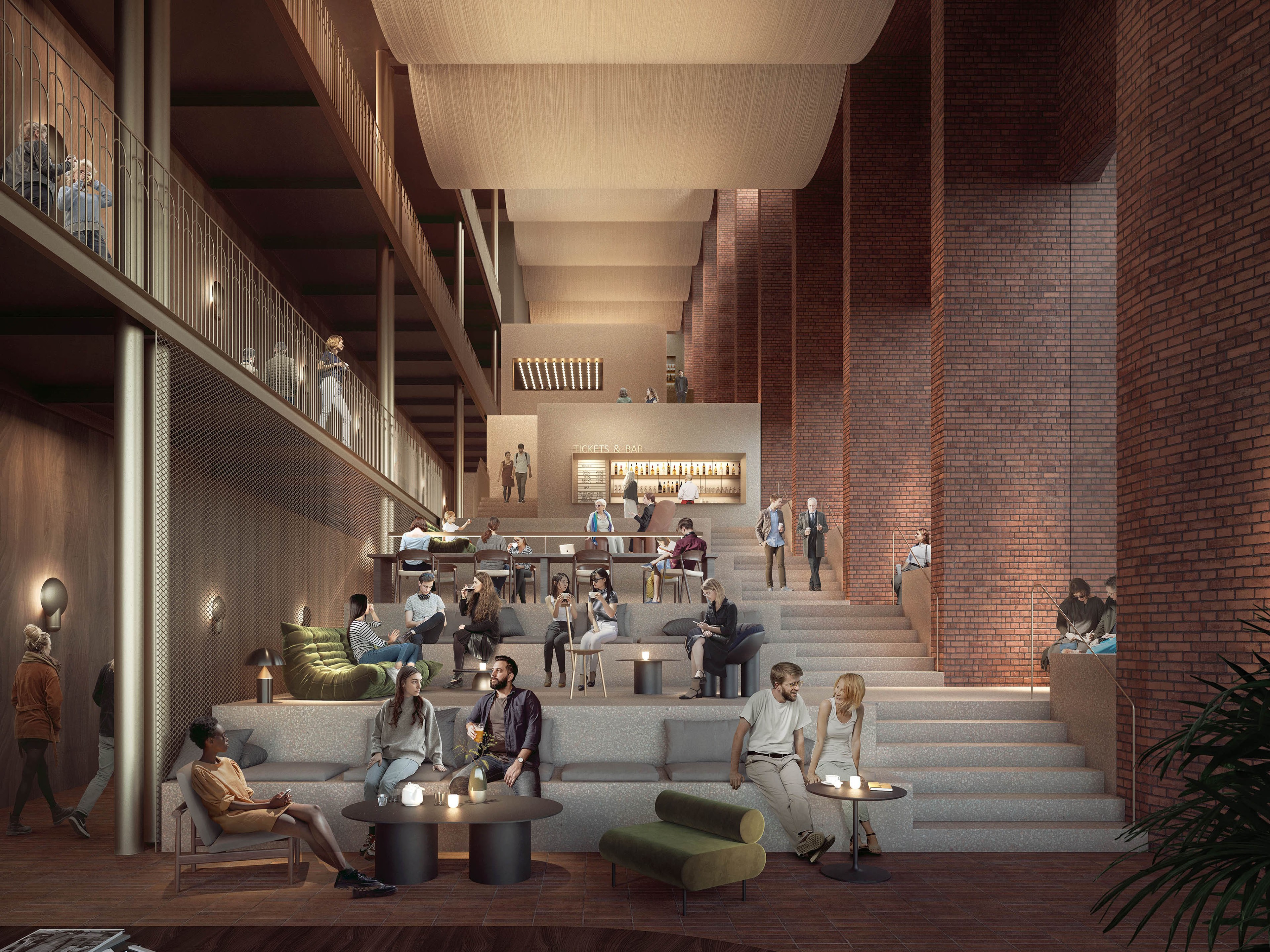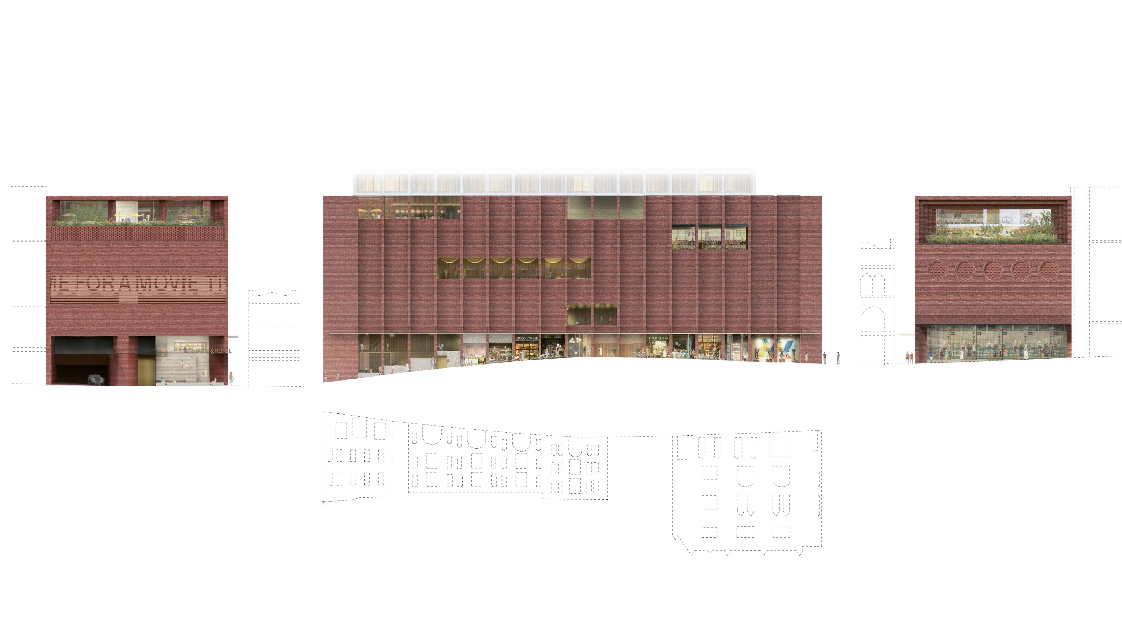 A terraced lobby inspired by the lost theatricality of cinema architecture, intertwining the cinema and hotel programs as a distinct characteristic of the podium experience.
