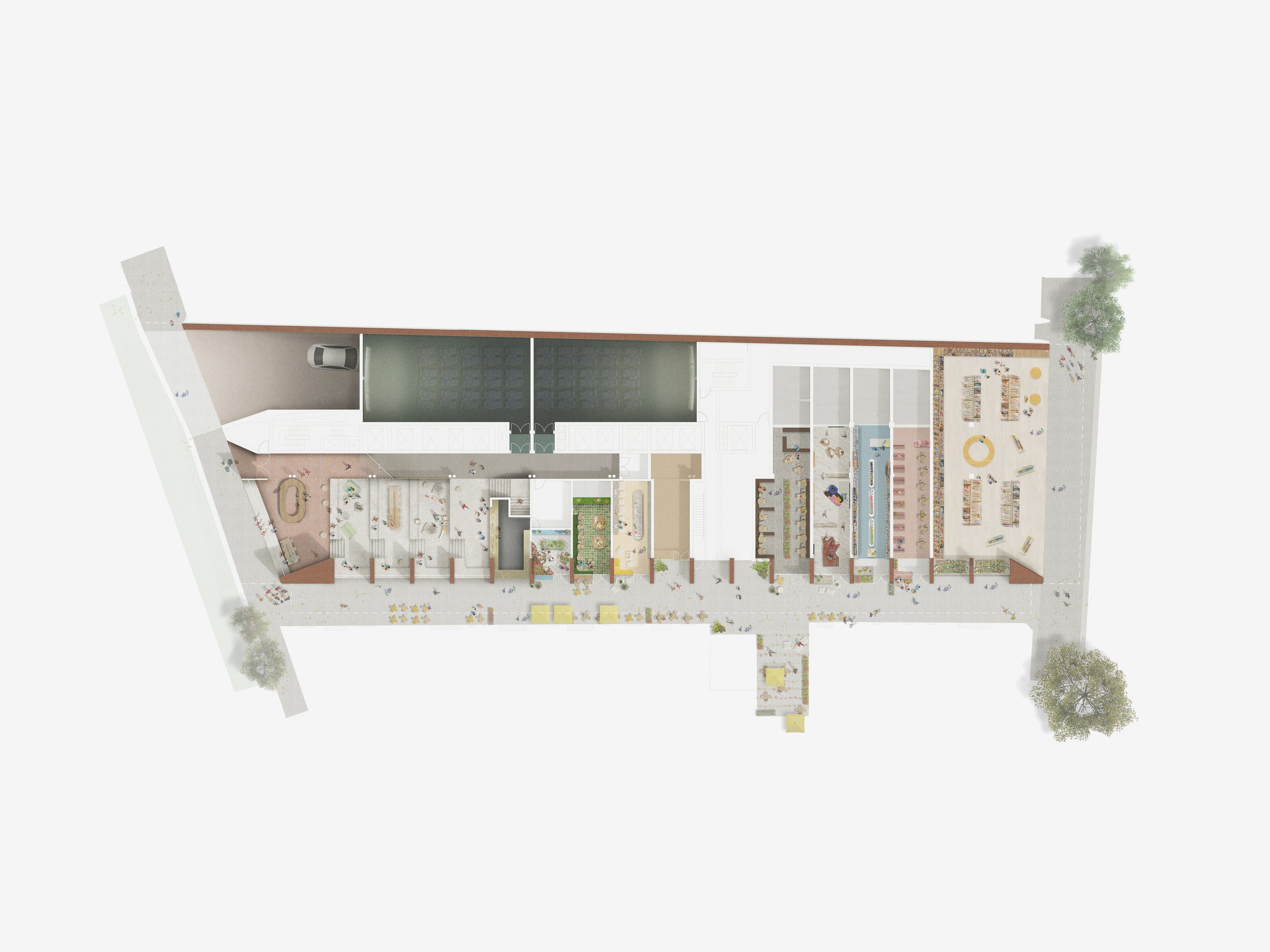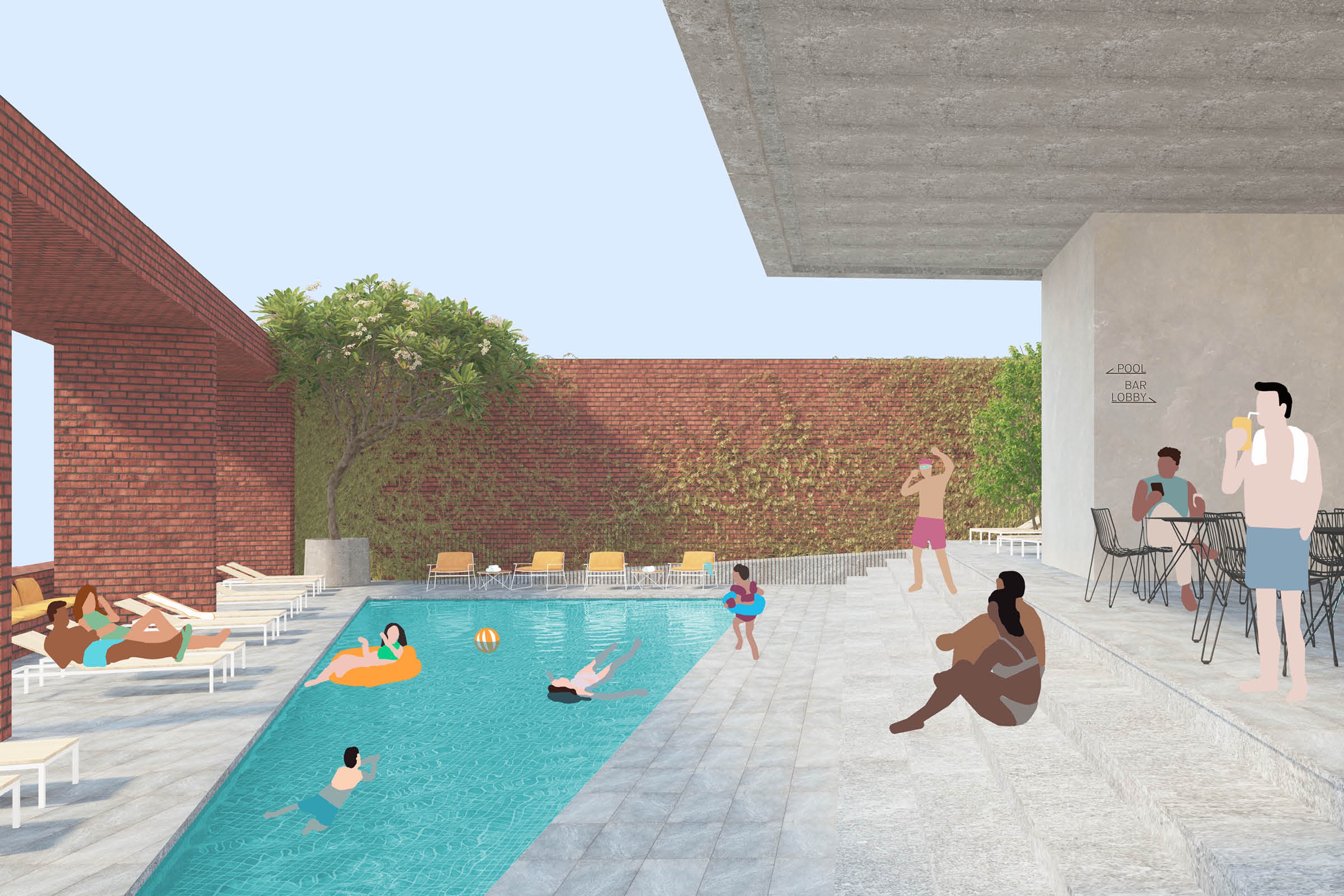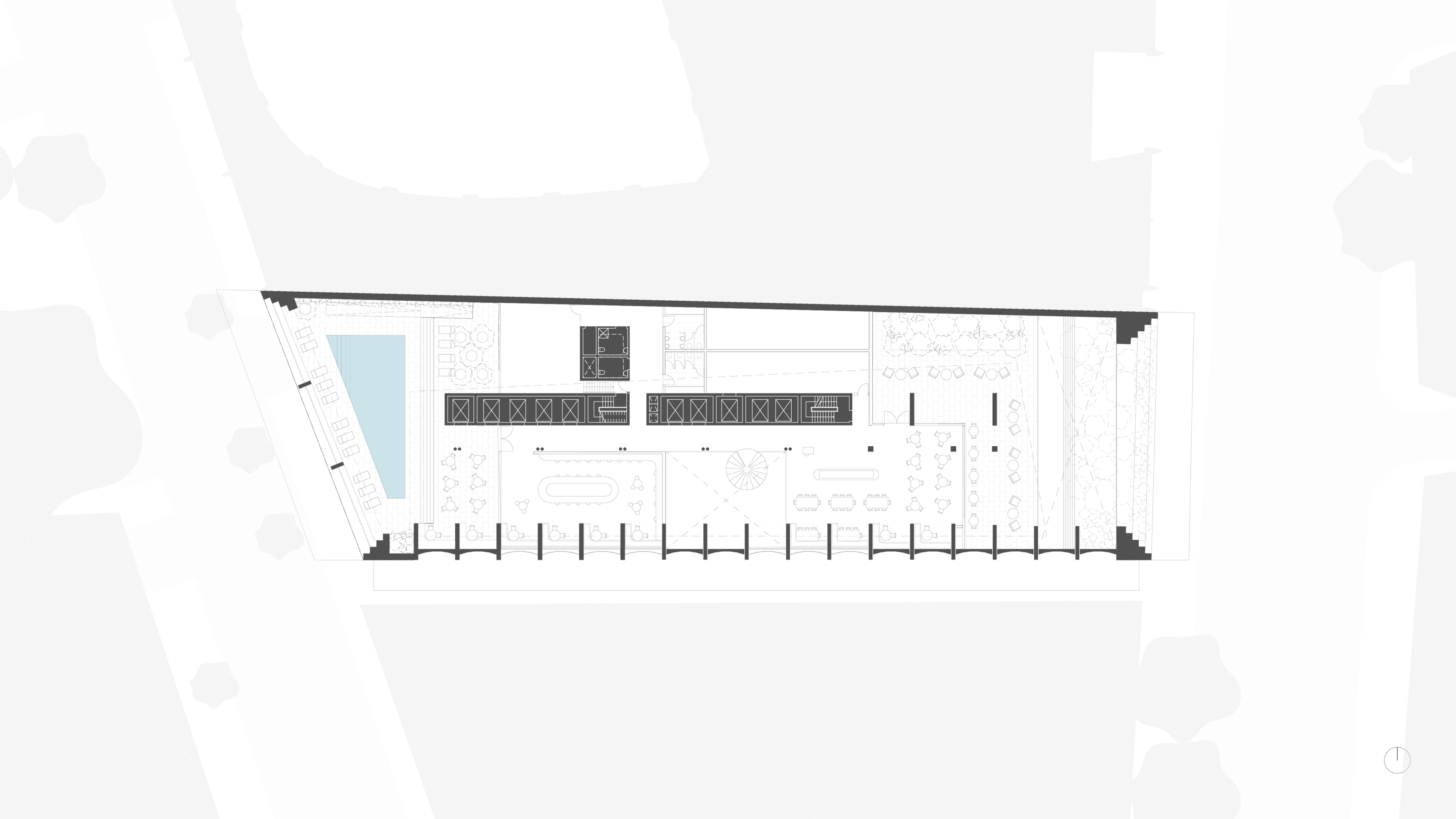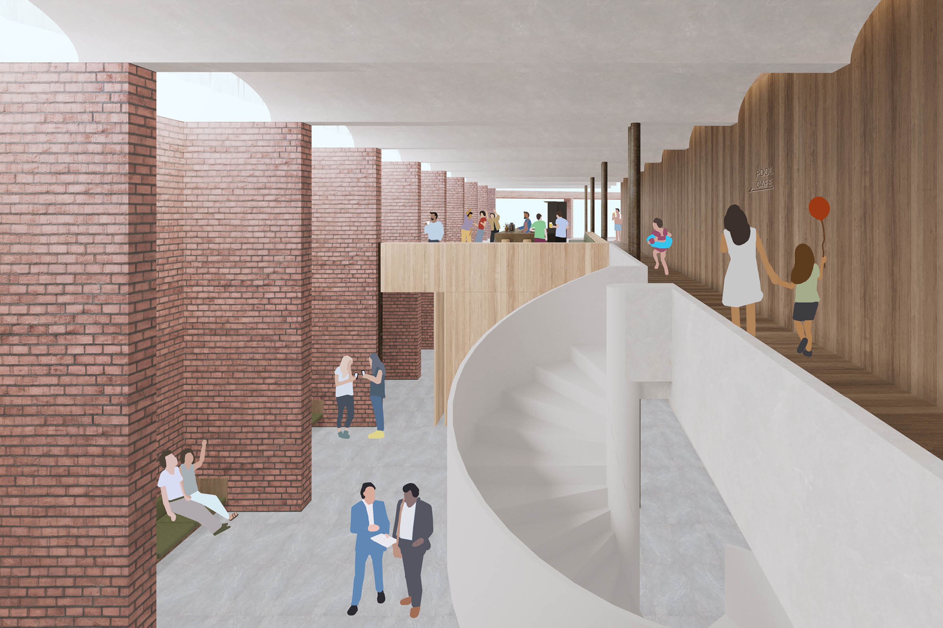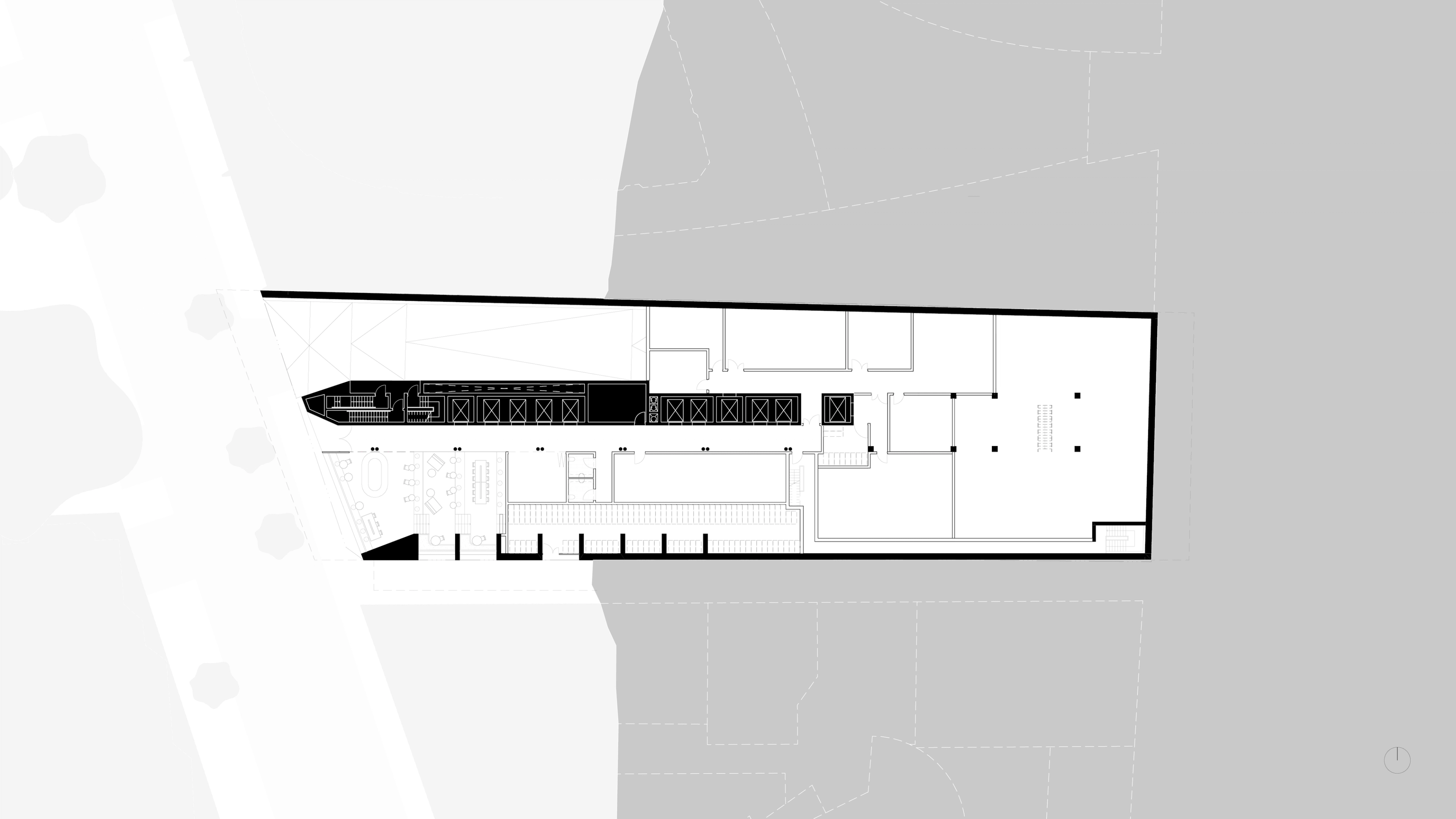 A terraced lobby inspired by the lost theatricality of cinema architecture, intertwining the cinema and hotel programs as a distinct characteristic of the podium experience.