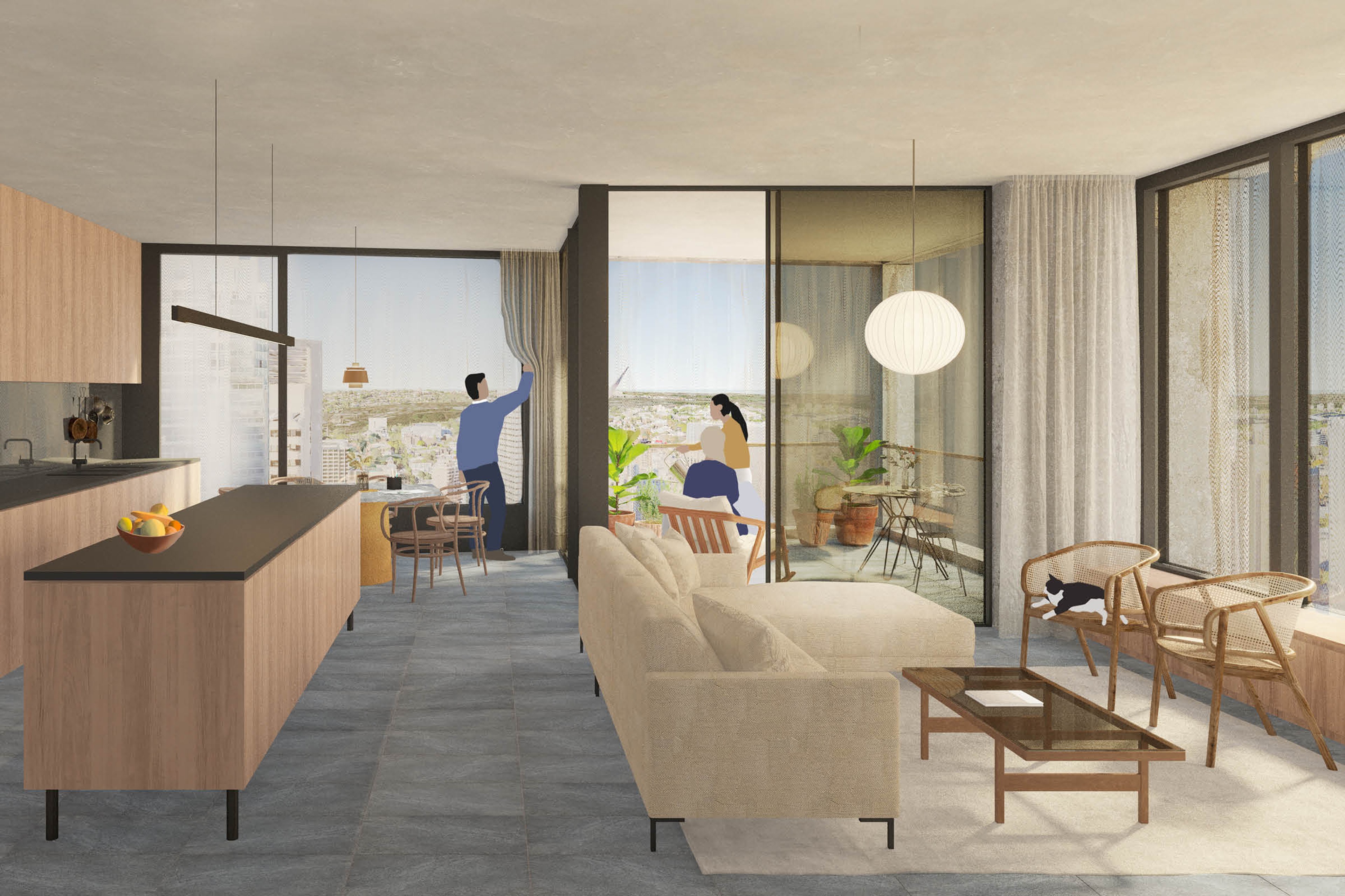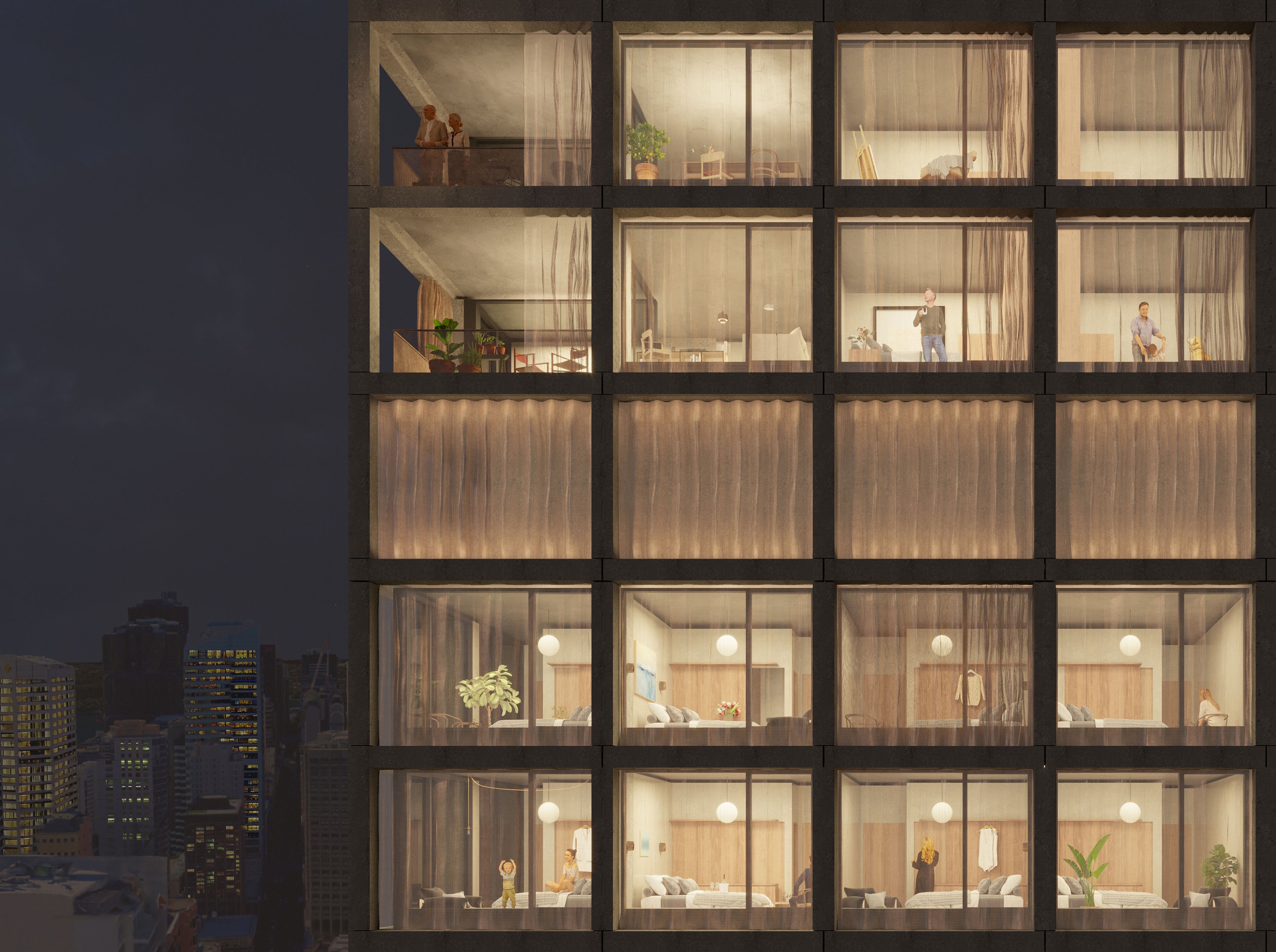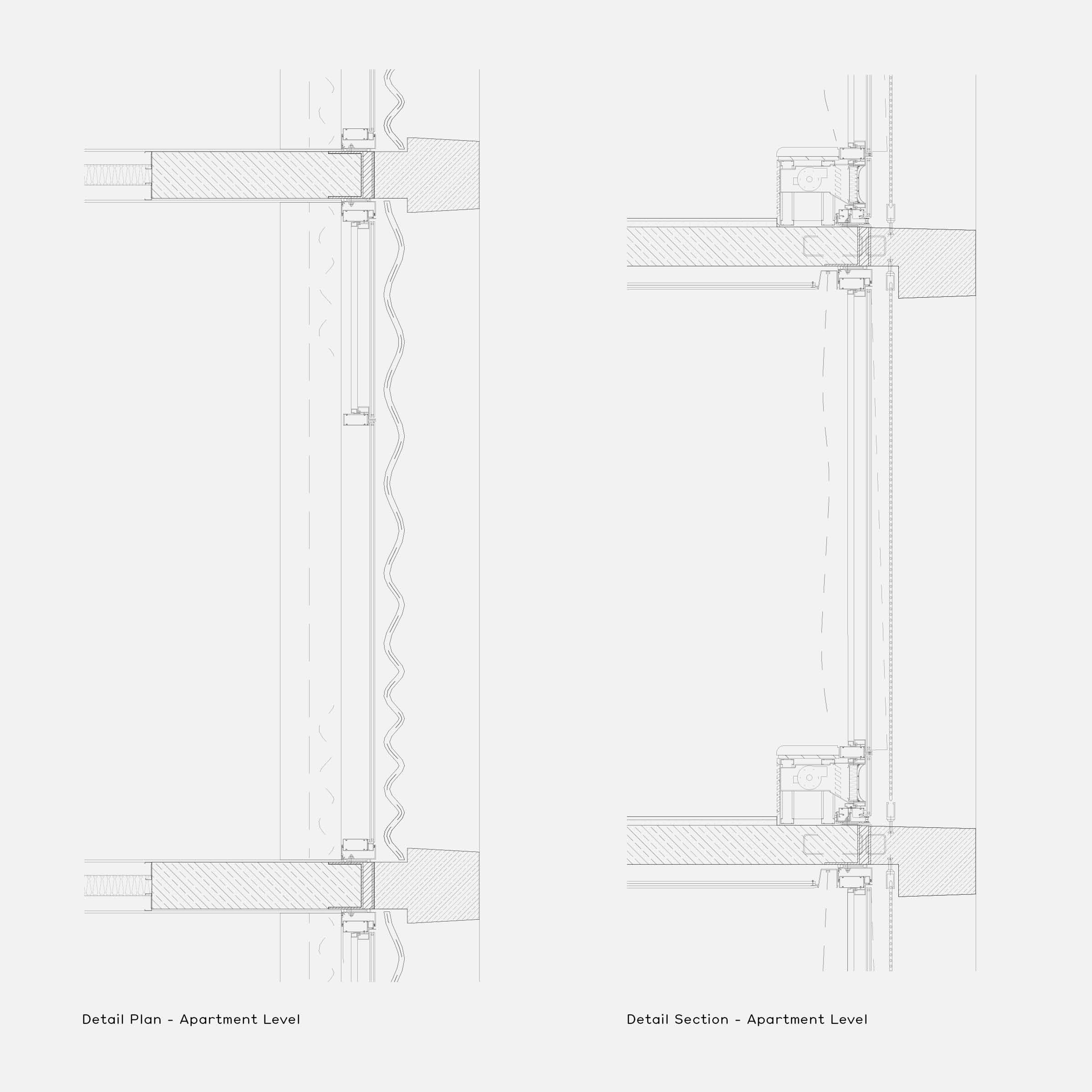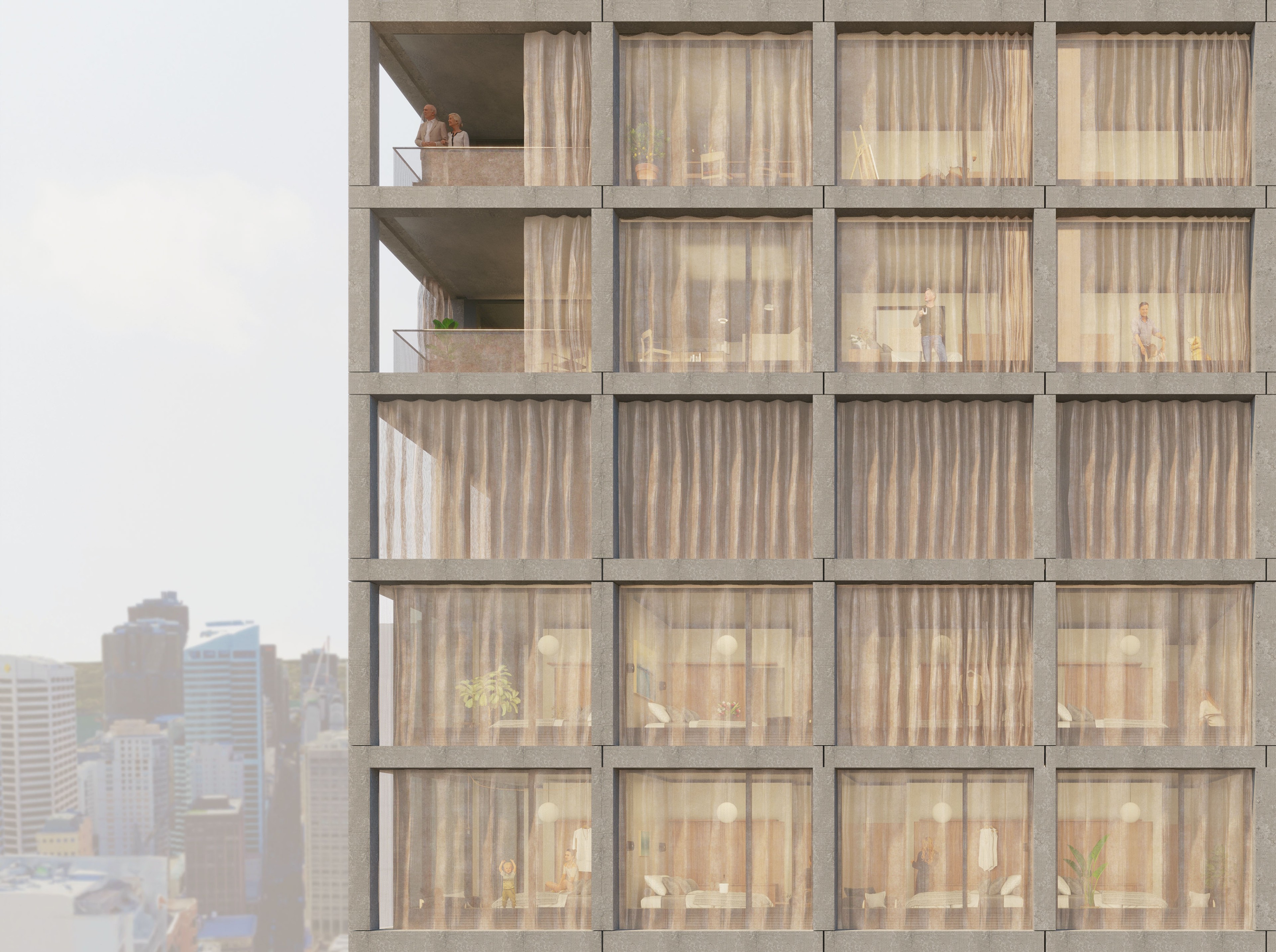 A gridded lattice forms the primary expression of the tower, common to all elevations. Projecting 400mm beyond the façade glazing, it provides a deep shading overhang above and to the side of the glazing line, reducing heat load on the façade. Incorporated into the glazing panel is a ventilation system as part of the Passivehaus design of the tower programs. The proposed pre-cast is a sandblasted, exposed aggregate finish creating a stone like character.
