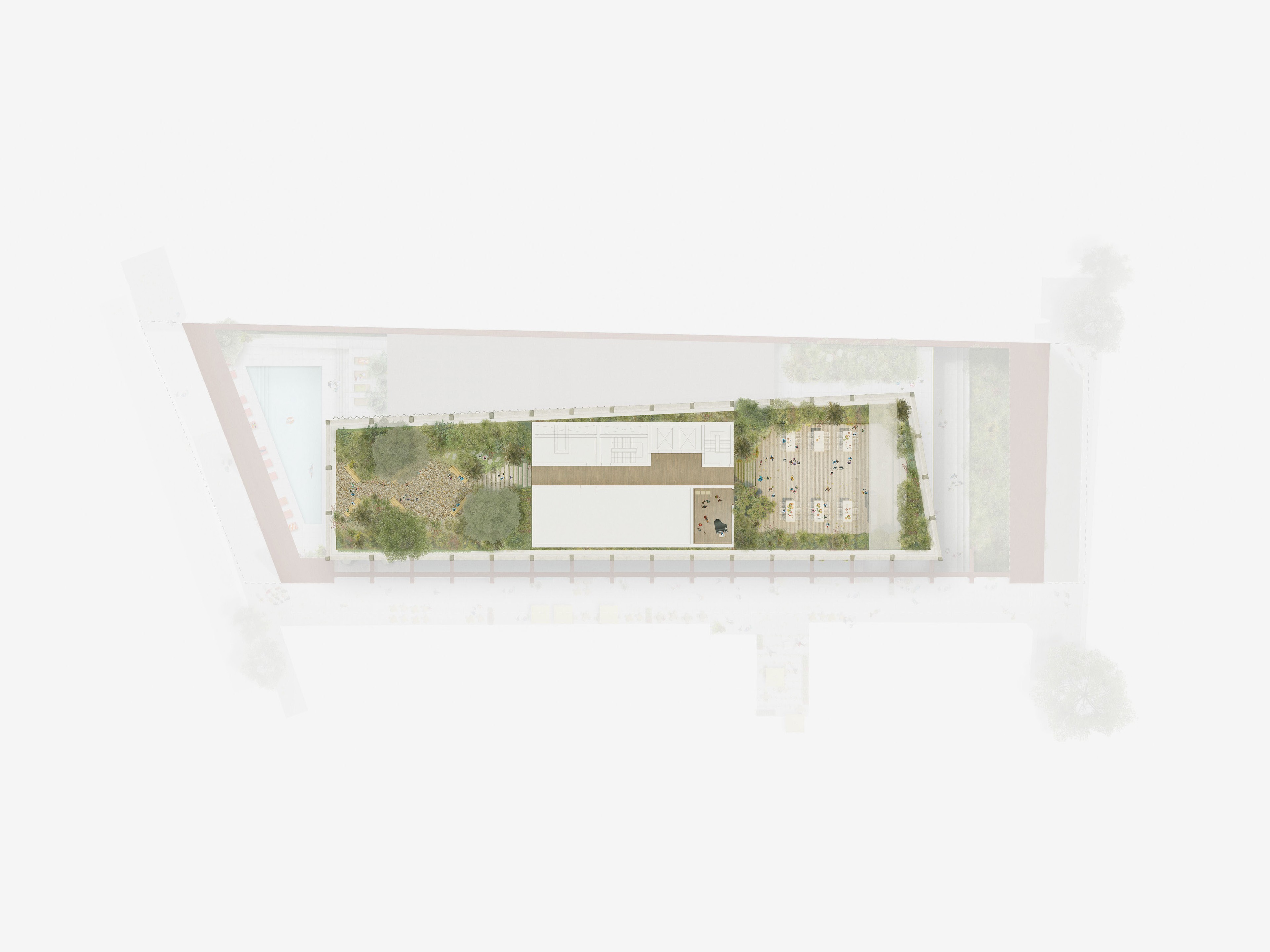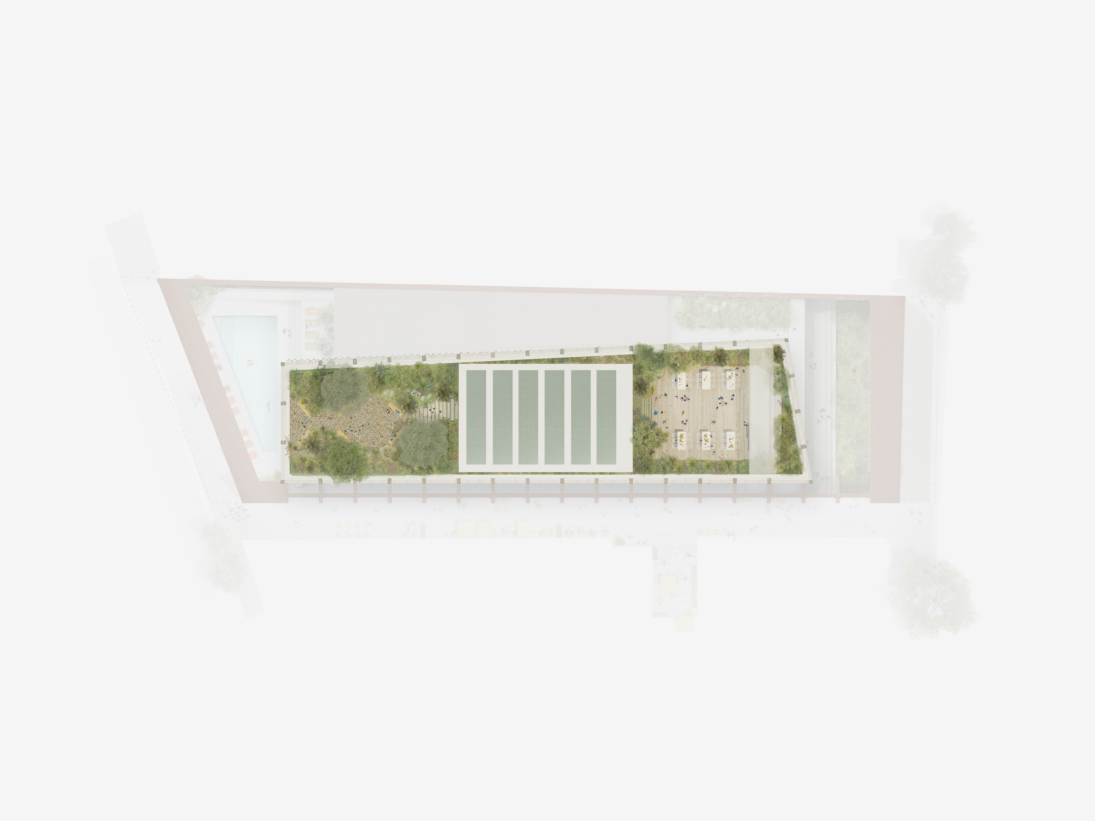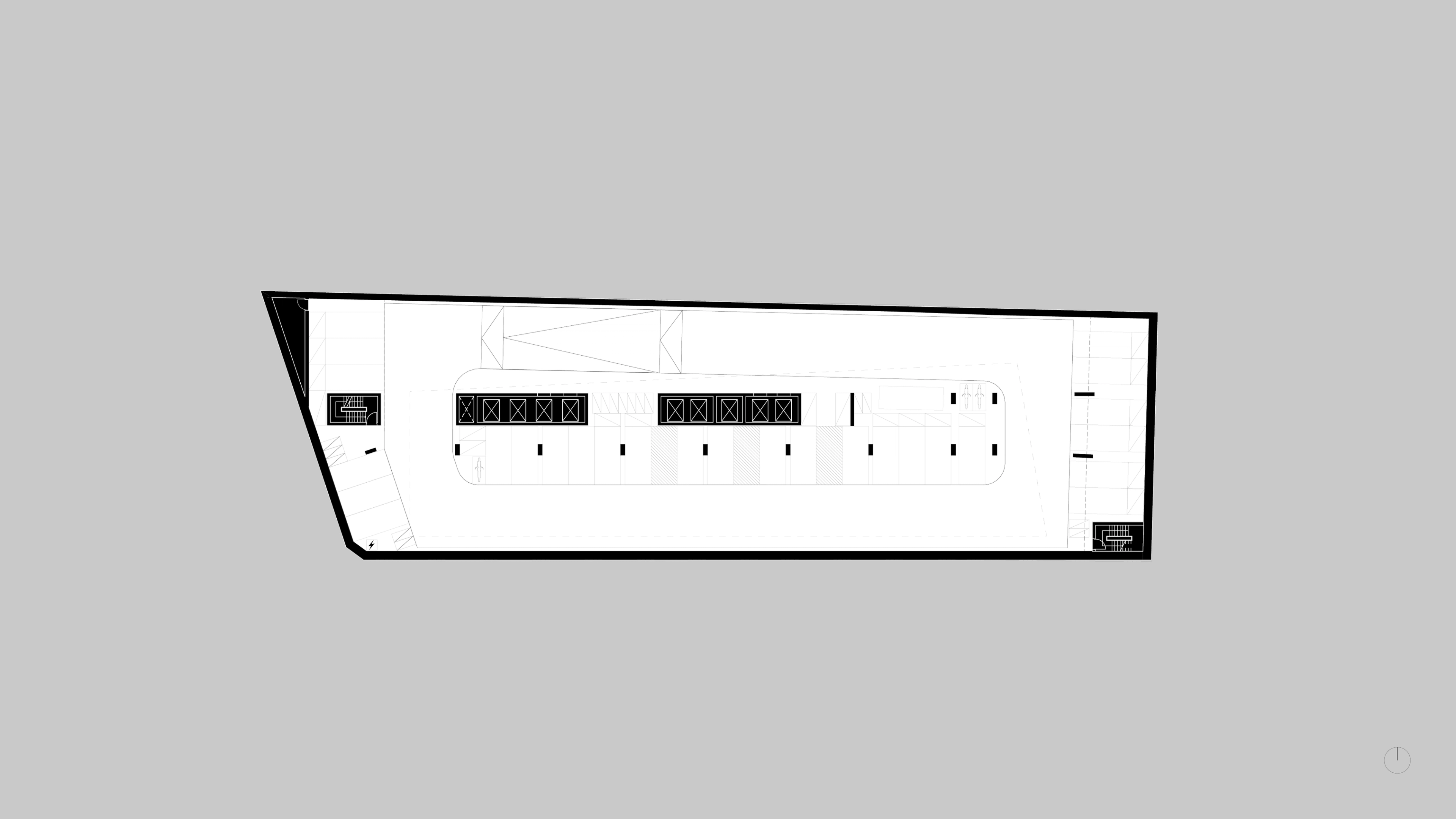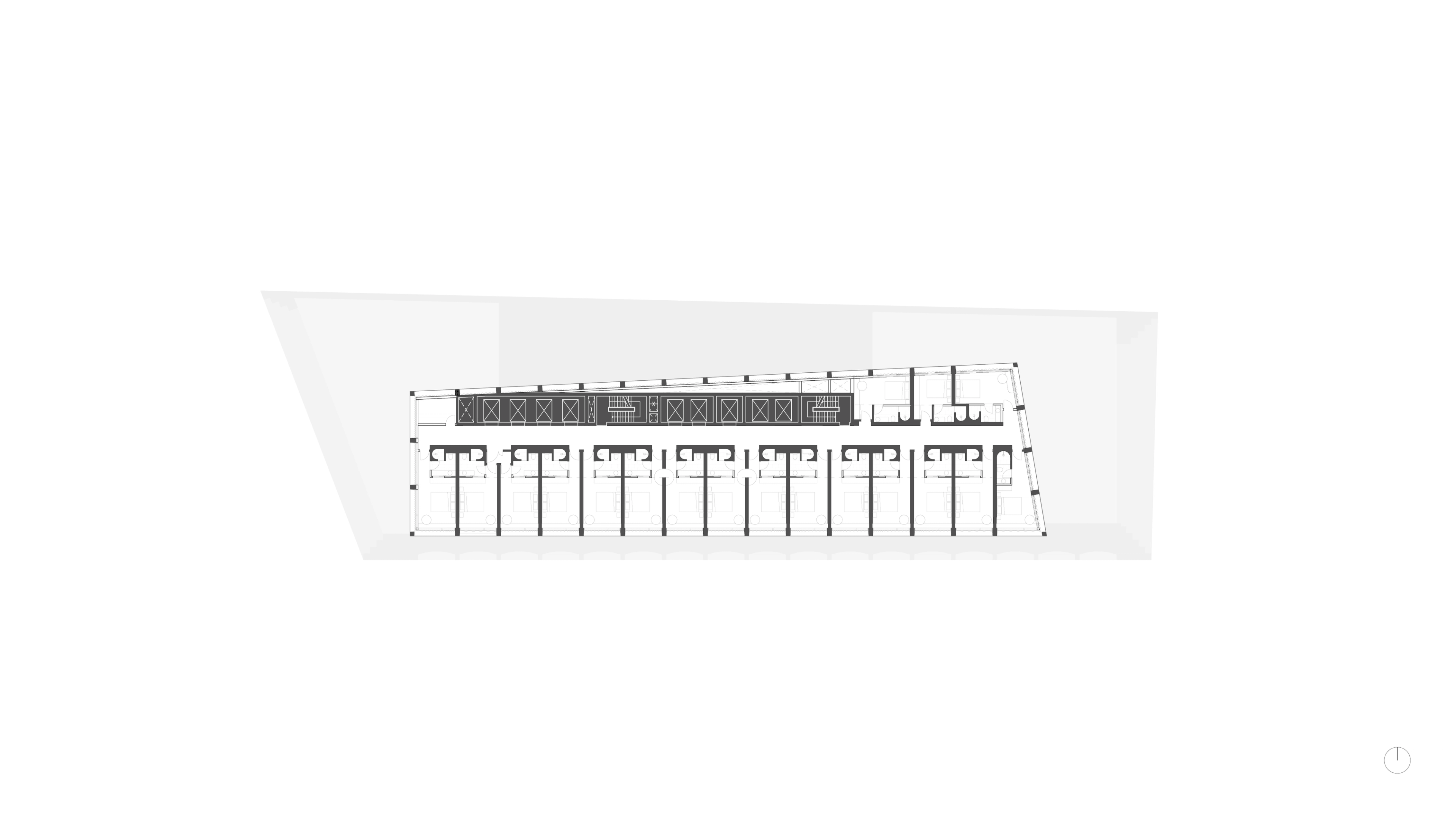 A linear core that frees up the podium footprint, allowing a generous spatial experience for the hotel and cinema lobby and tower, while also providing the required blank wall screening to the neighbouring 505 development.