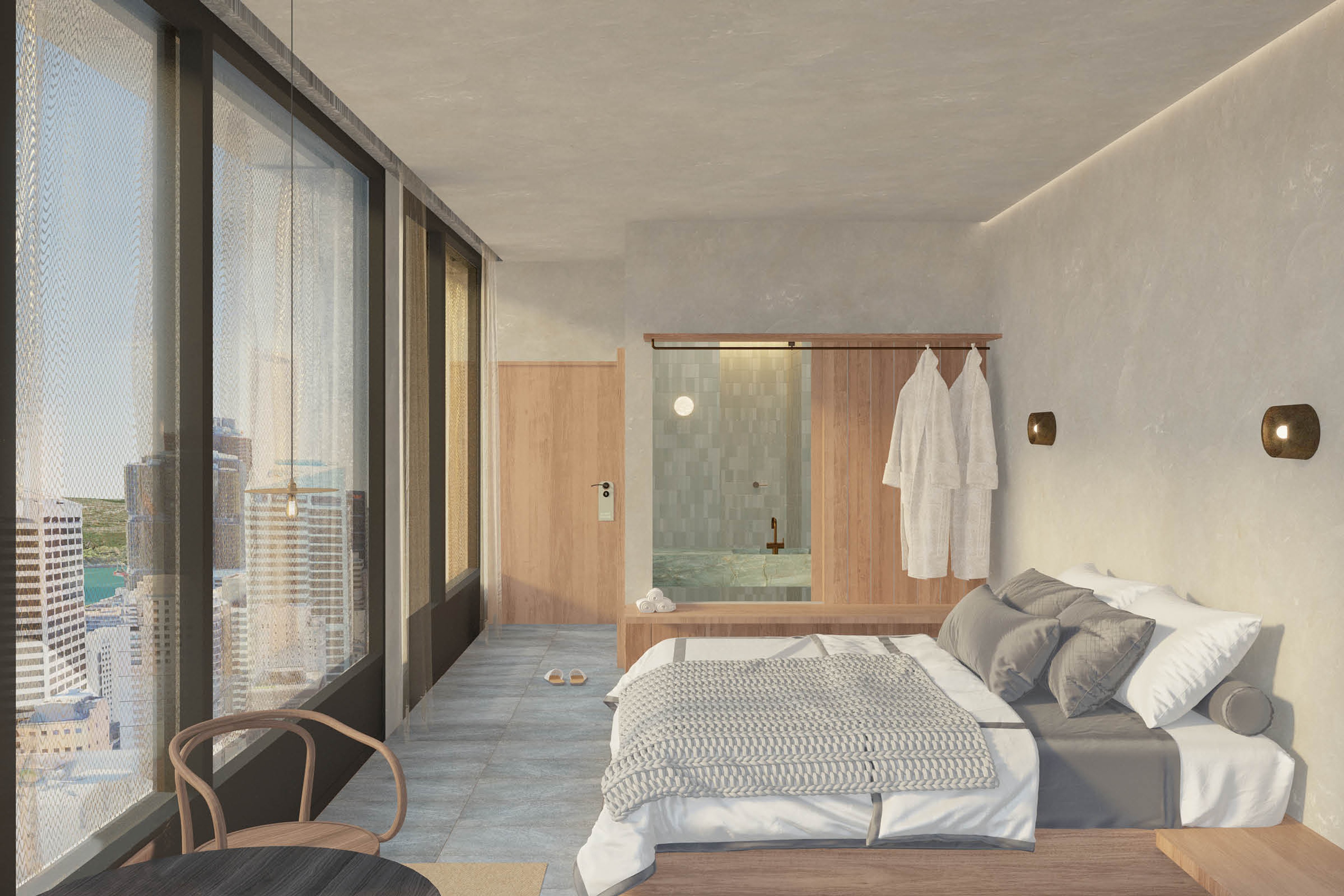 A gridded lattice forms the primary expression of the tower, which contain a hotel, apartments and a rooftop garden. The lattice provides a deep shading overhang above and to the side of the glazing line, reducing heat load on the façade.In contrast to the universality of the lattice, a series of transparent mesh curtains sit within the grid to provide a more localised layer of performance for the façade.