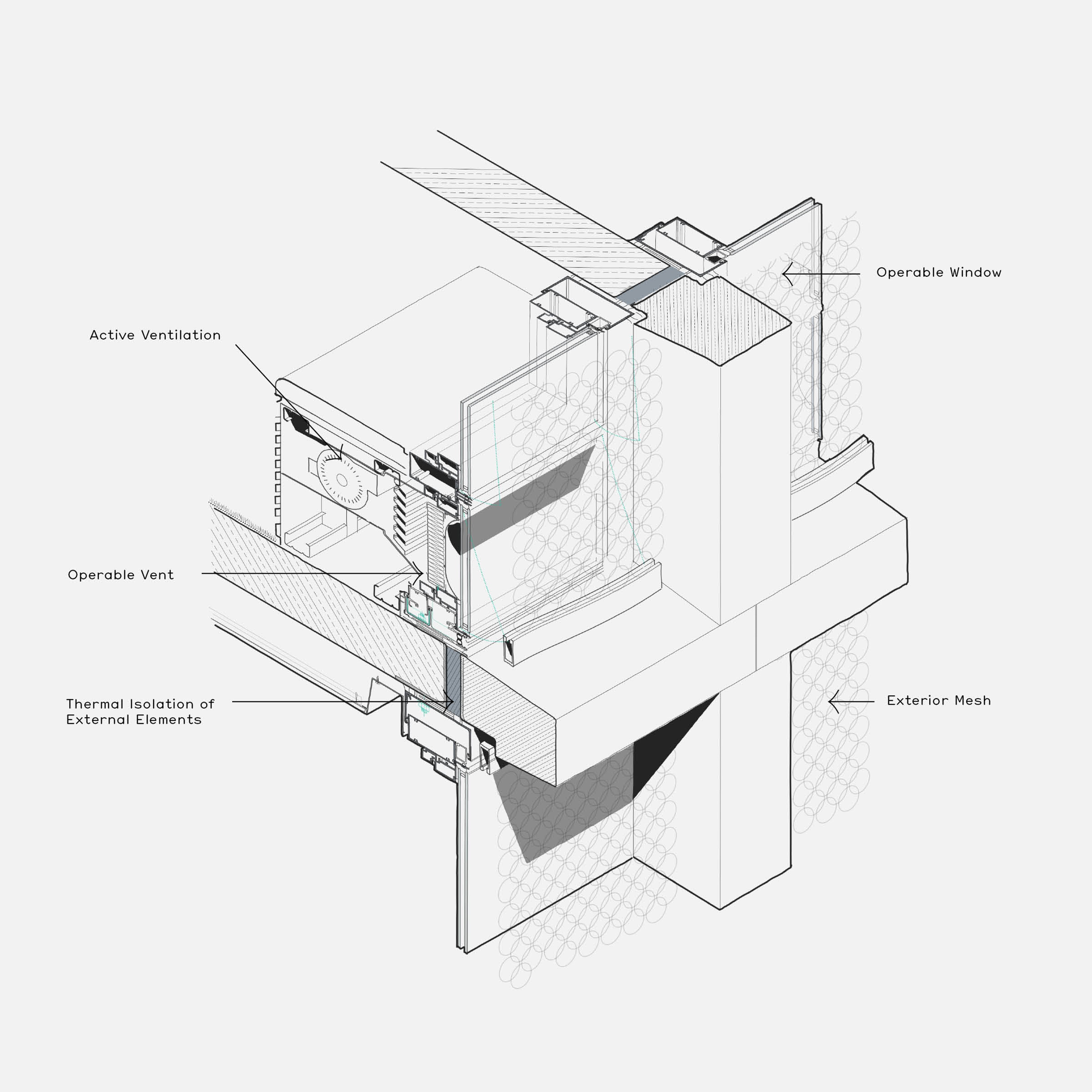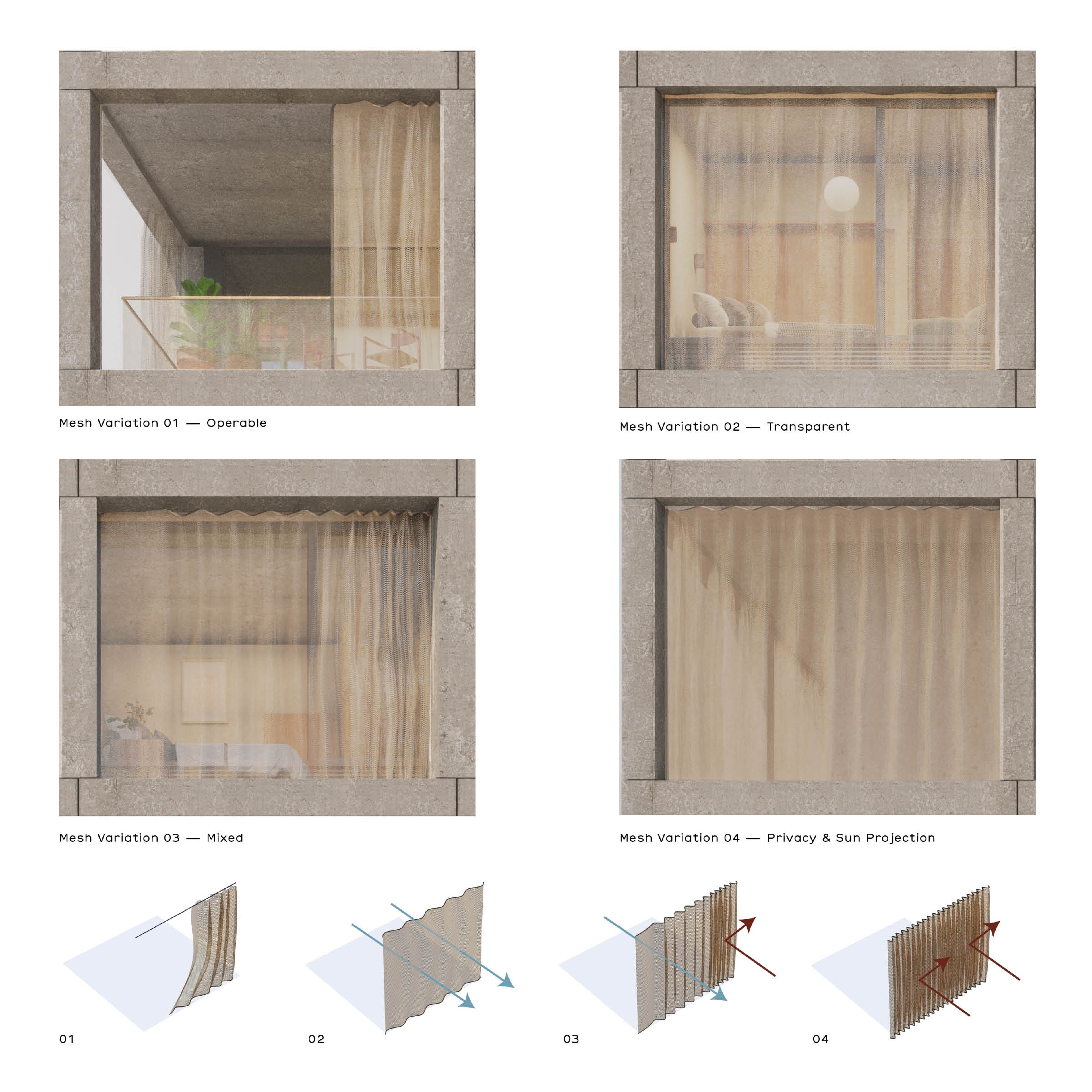 A series of curtains of transparent mesh within the grid provide a more localised layer of performance for the façade, varied according to specific heat load requirements, privacy, or extent of outlook characteristic of each grid bay.