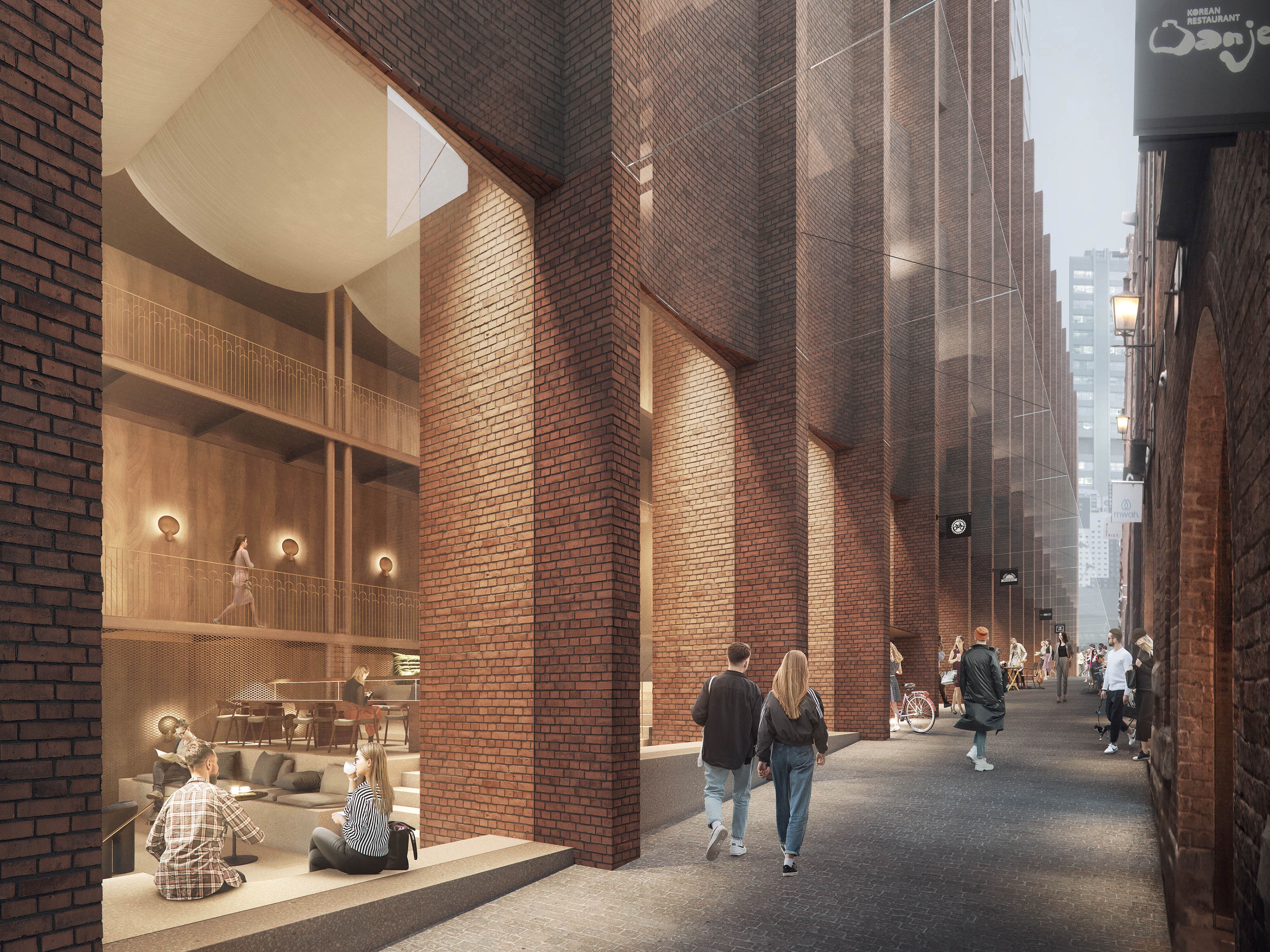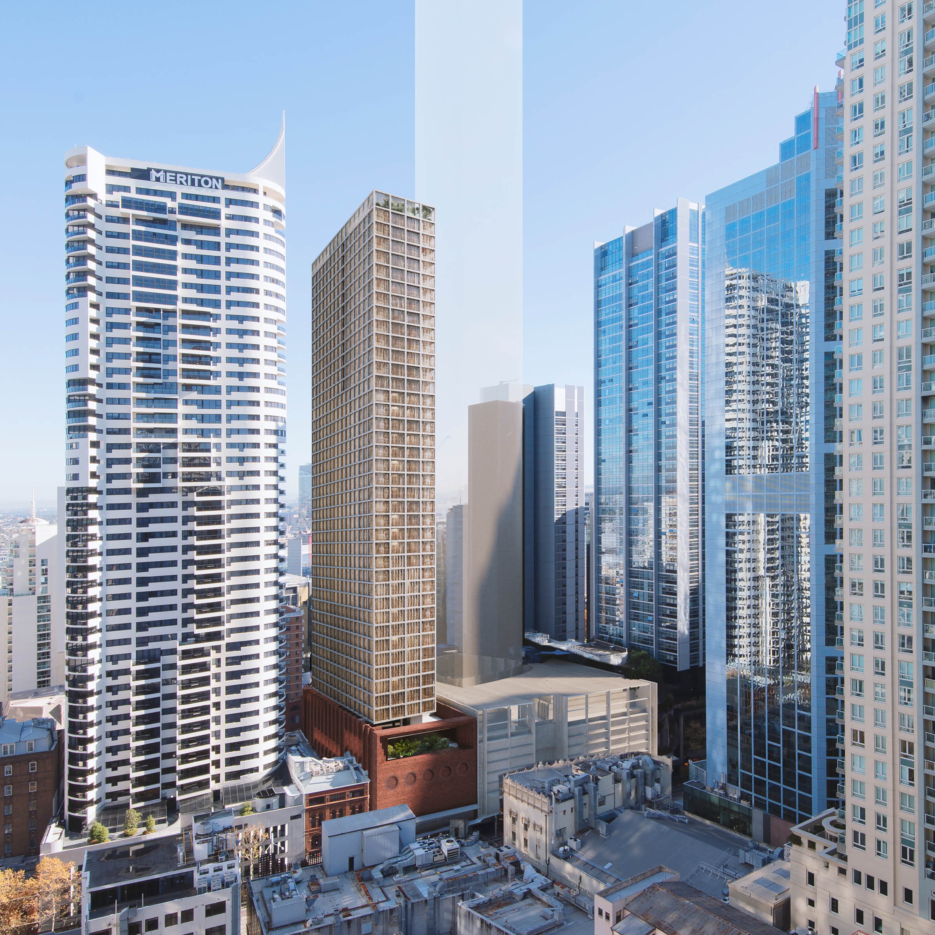 525 George St is a proposal for a mixed-use building housing cinemas, retail, hotel and residential building located in the heart of Sydney. The design was developed as part of an invited City of Sydney Design Excellence competition. Our approach was informed by the site’s rich theatrical, material history and the precinct’s tight grain urbanity.