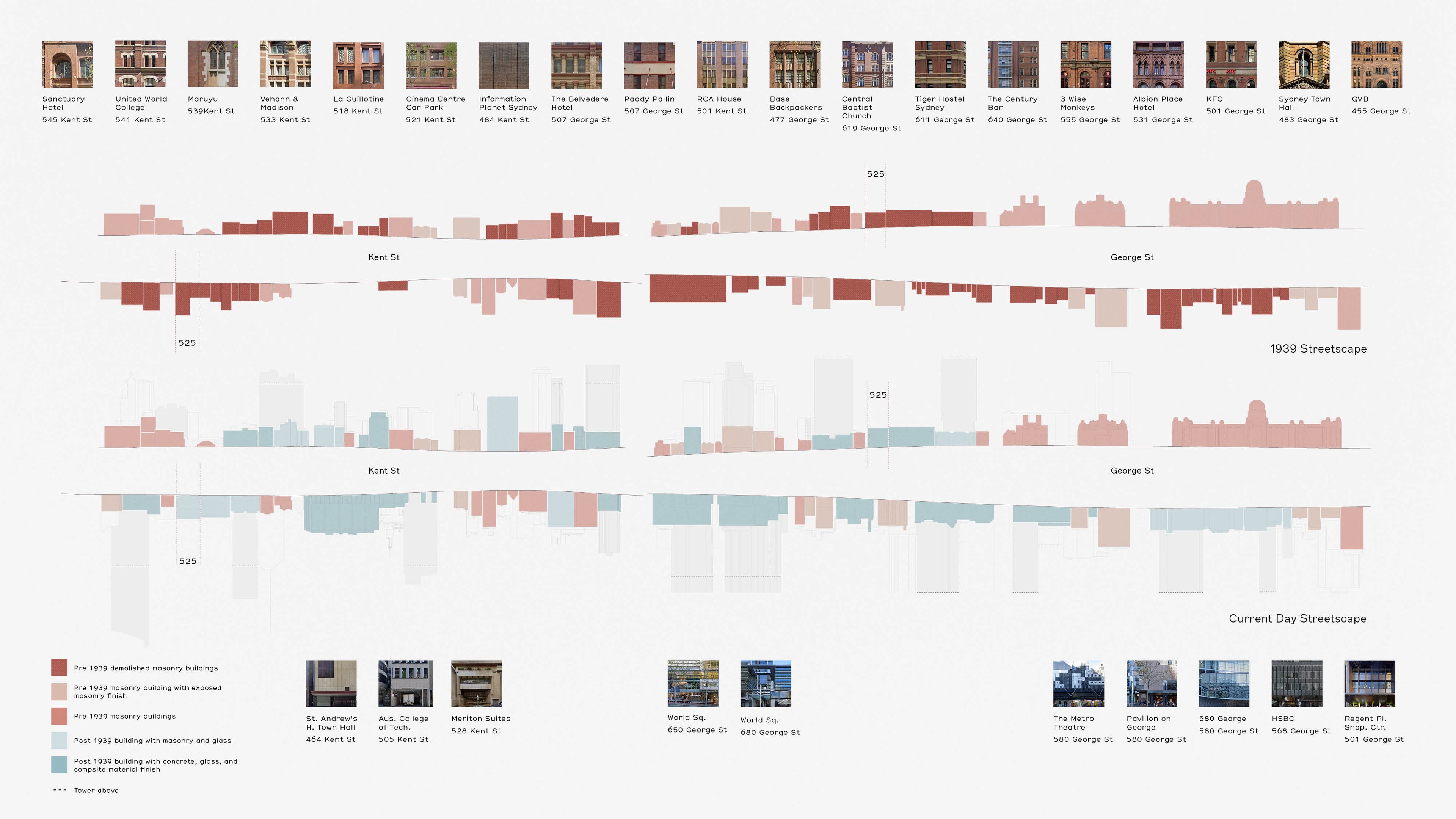 Our initial research studied the material history of construction on George St and Kent St, including the existing masonry heritage structures surrounding the site. We actively pursued a material proposition for the podium that re-stiches into the site the masonry building fabric disrupted by many of the entertainment buildings constructed on and adjacent the site since the 1980’s.