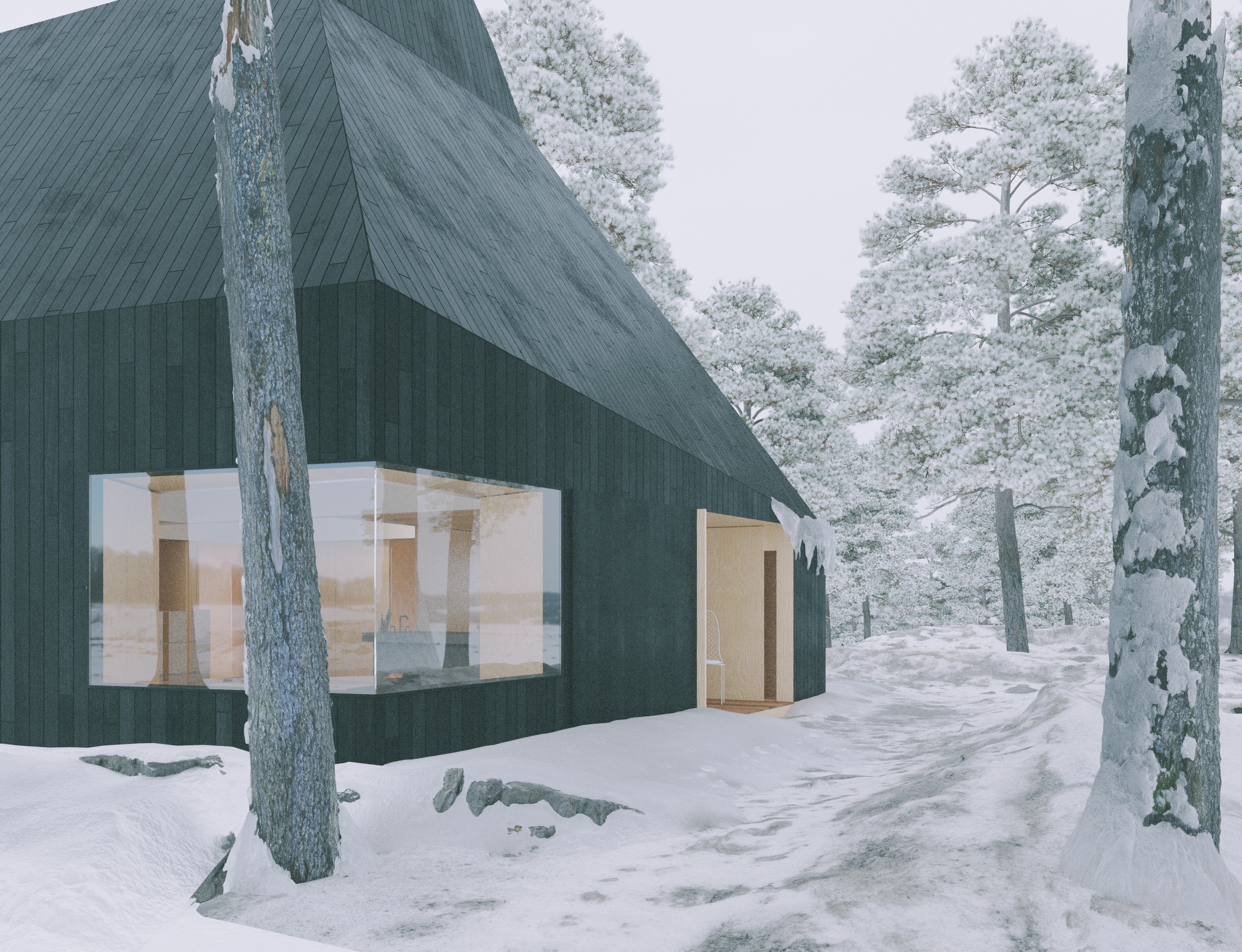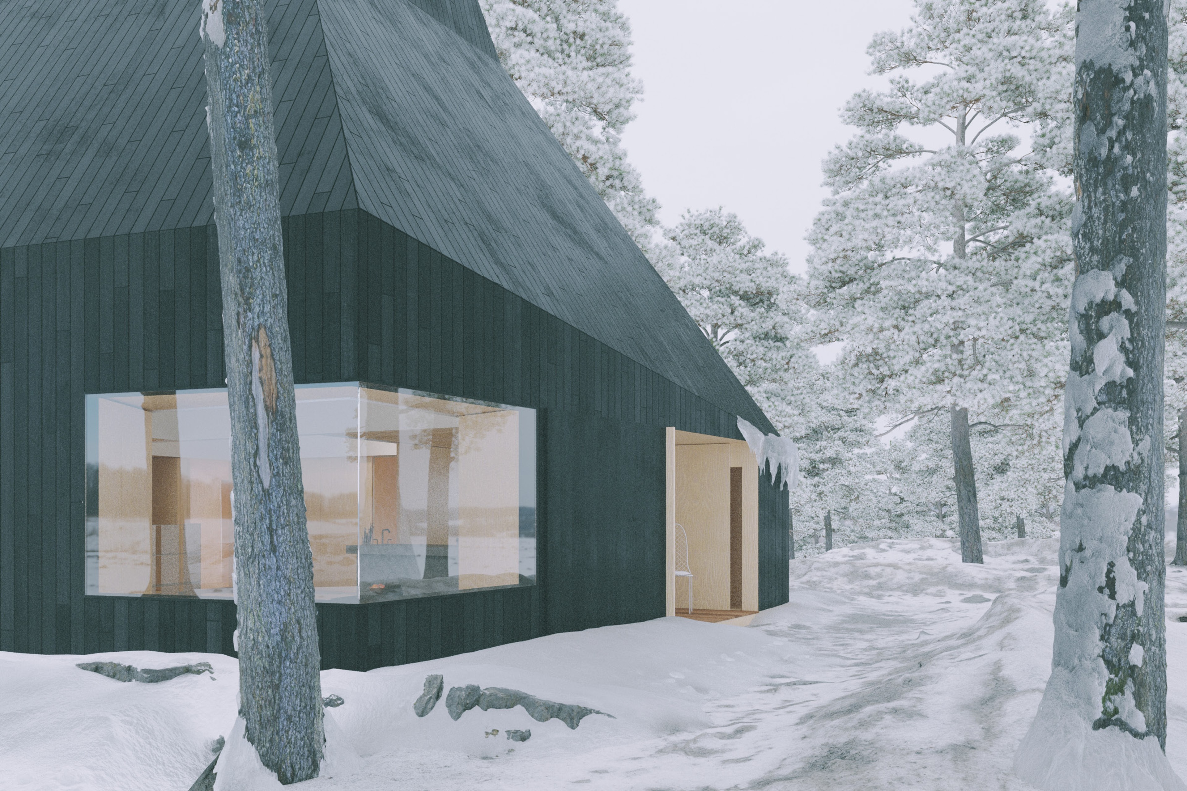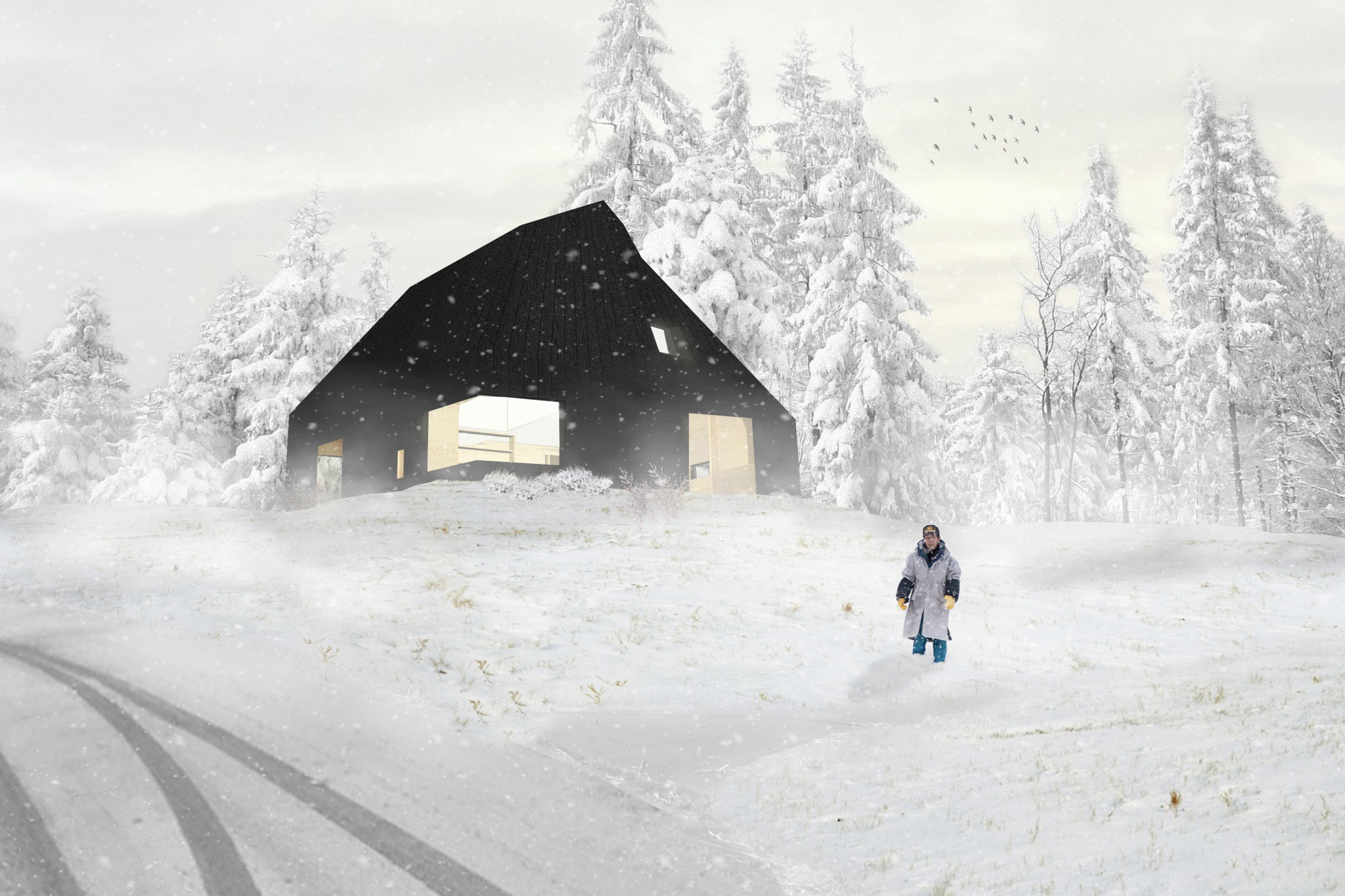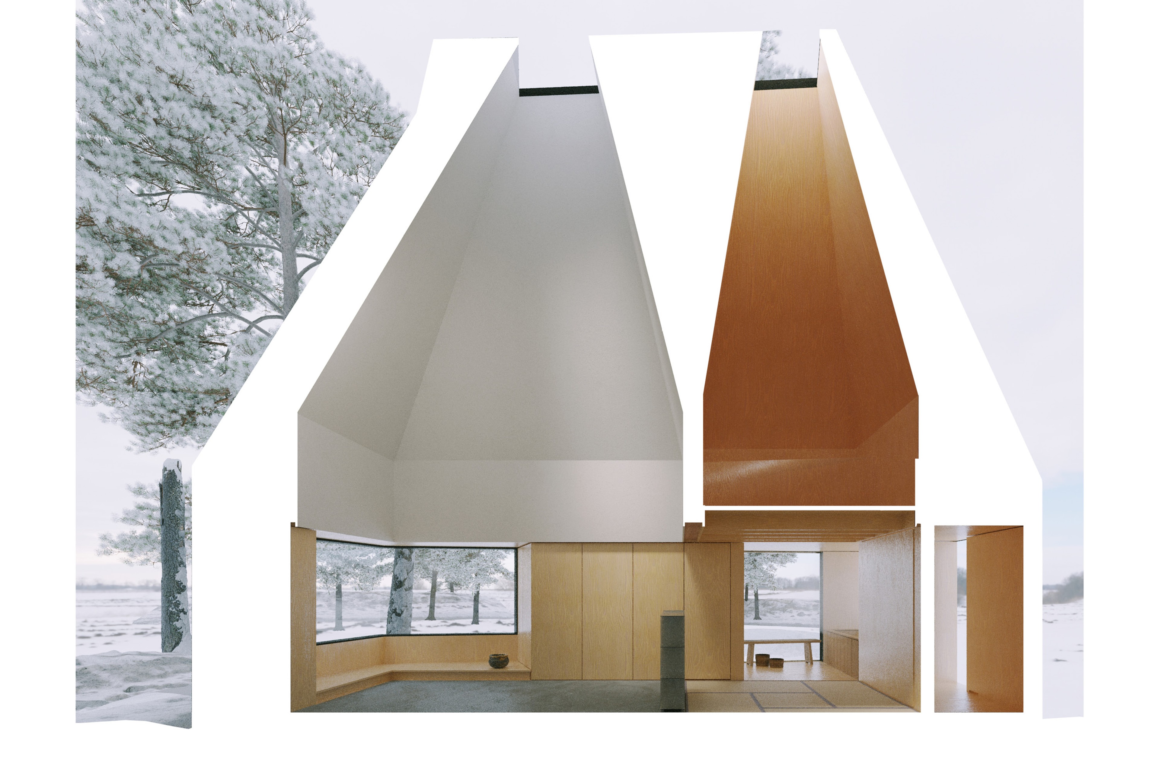 Above the walls a steeply pitched roofscape, containing four funnels of light inspired by the light of clouds and snow, encloses the pavilion.