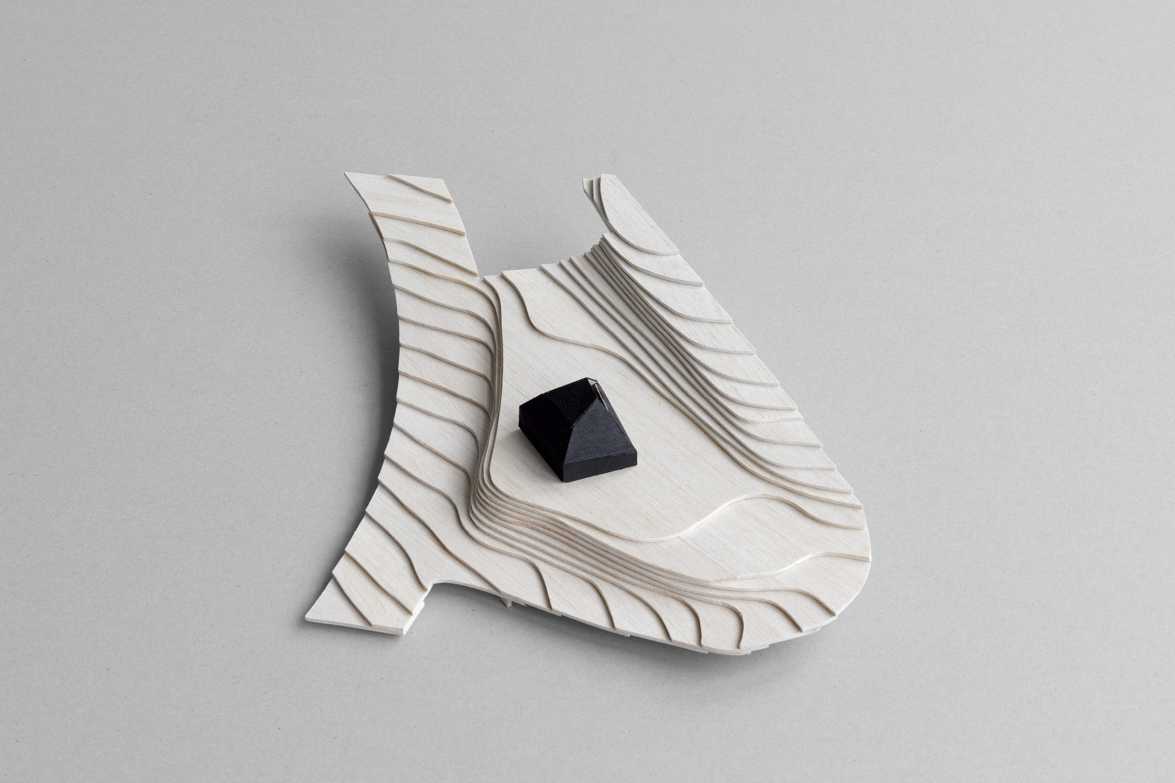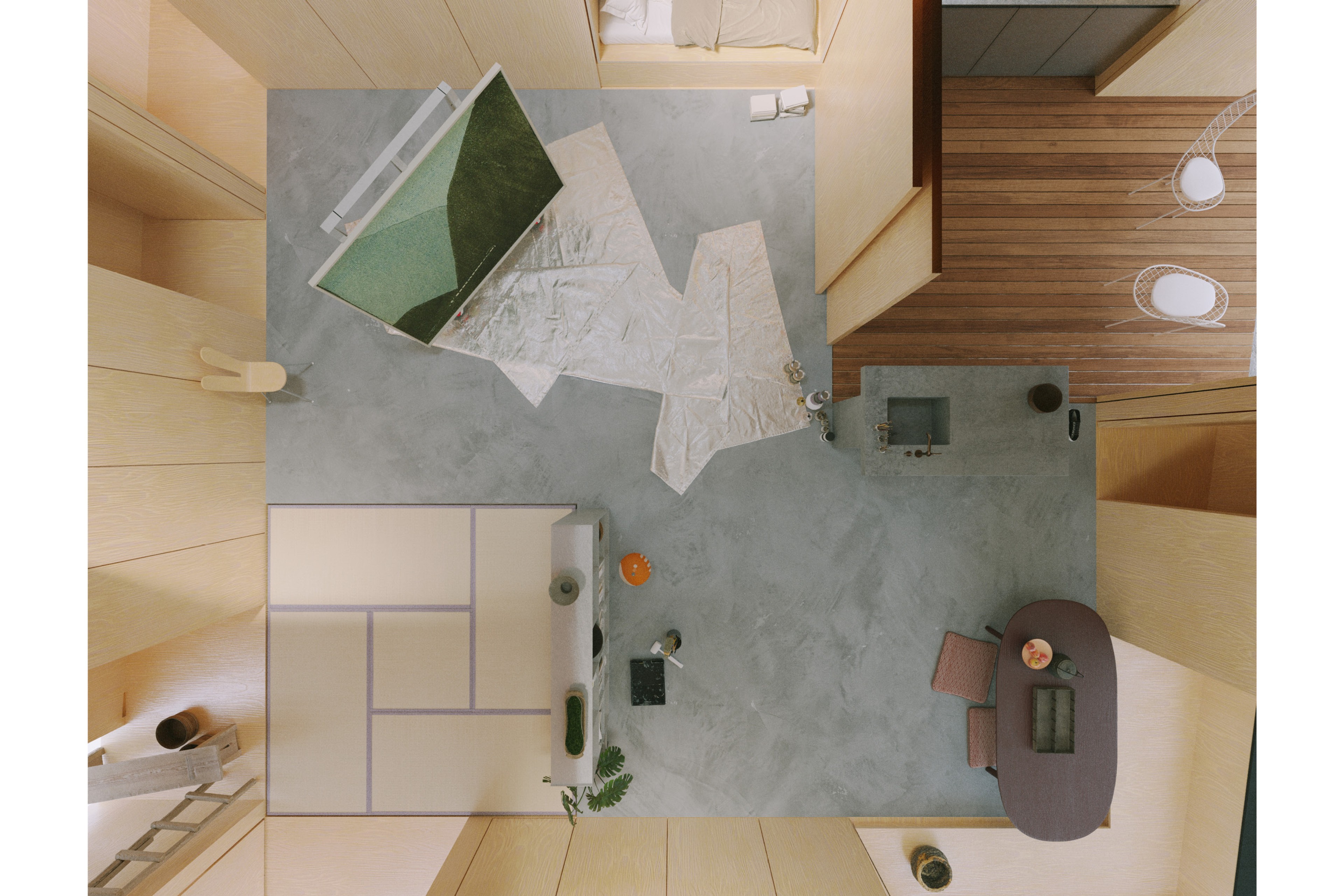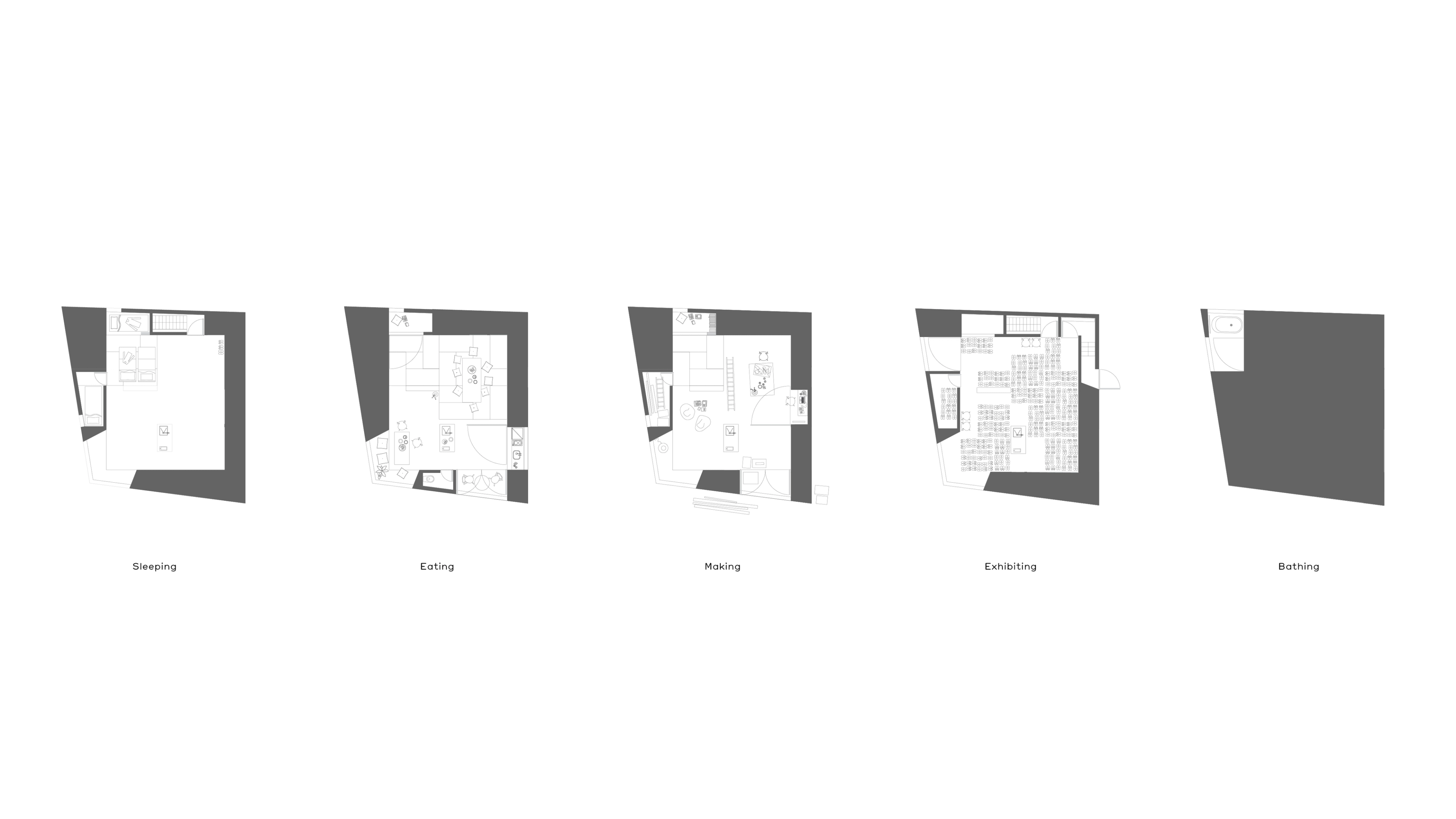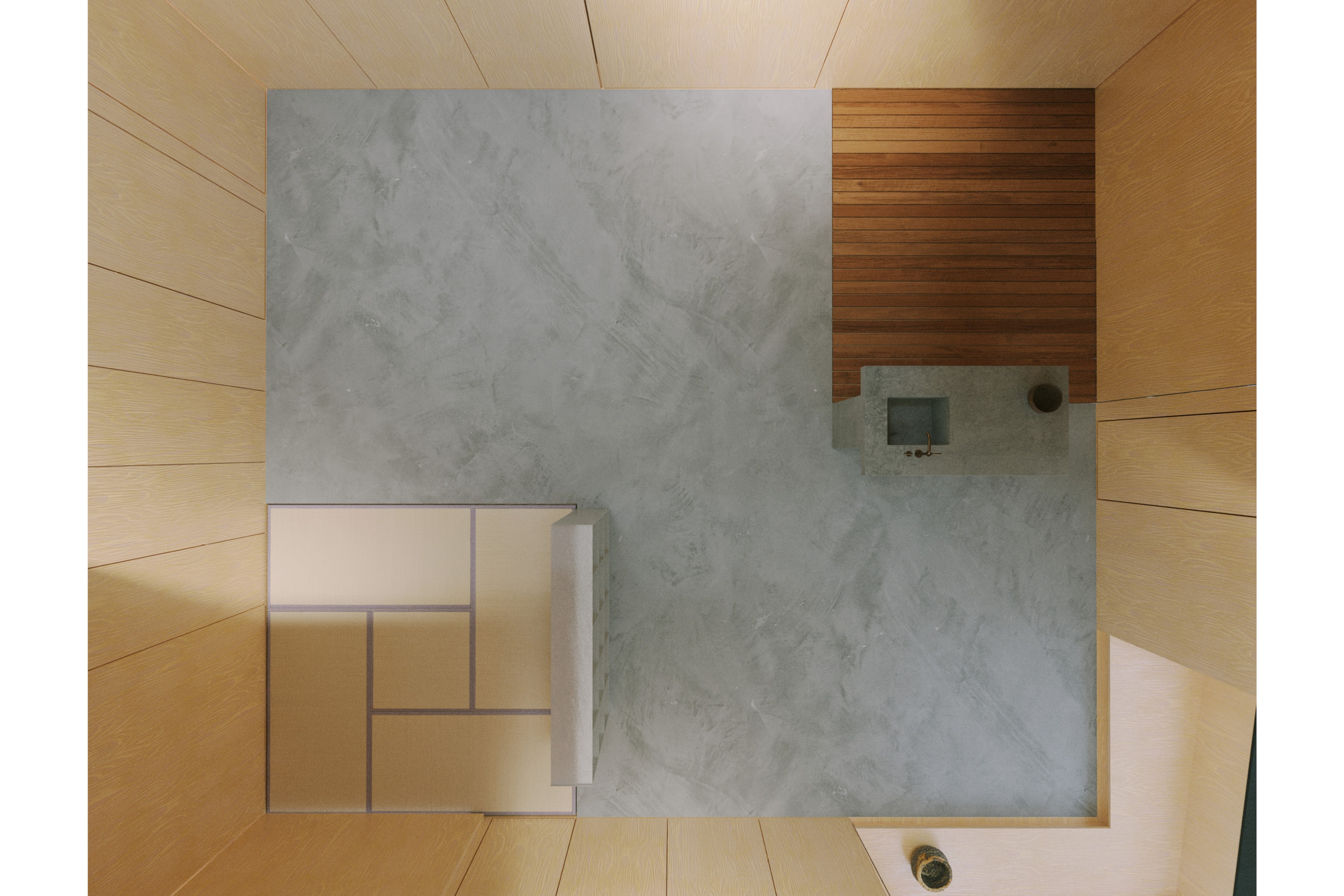 The design included three main elements. Firstly, an articulated floor surface suggesting possibilities of use within the free space of the atelier gallery. Surrounding this floor a thick inhabitable skin around the building’s perimeter organises the experiential, programmatic, structural and thermal performance of the pavilion, allowing a single room to be configured into a multiplicity of possibilities and relationships between eating, sleeping, dining, making and exhibiting.