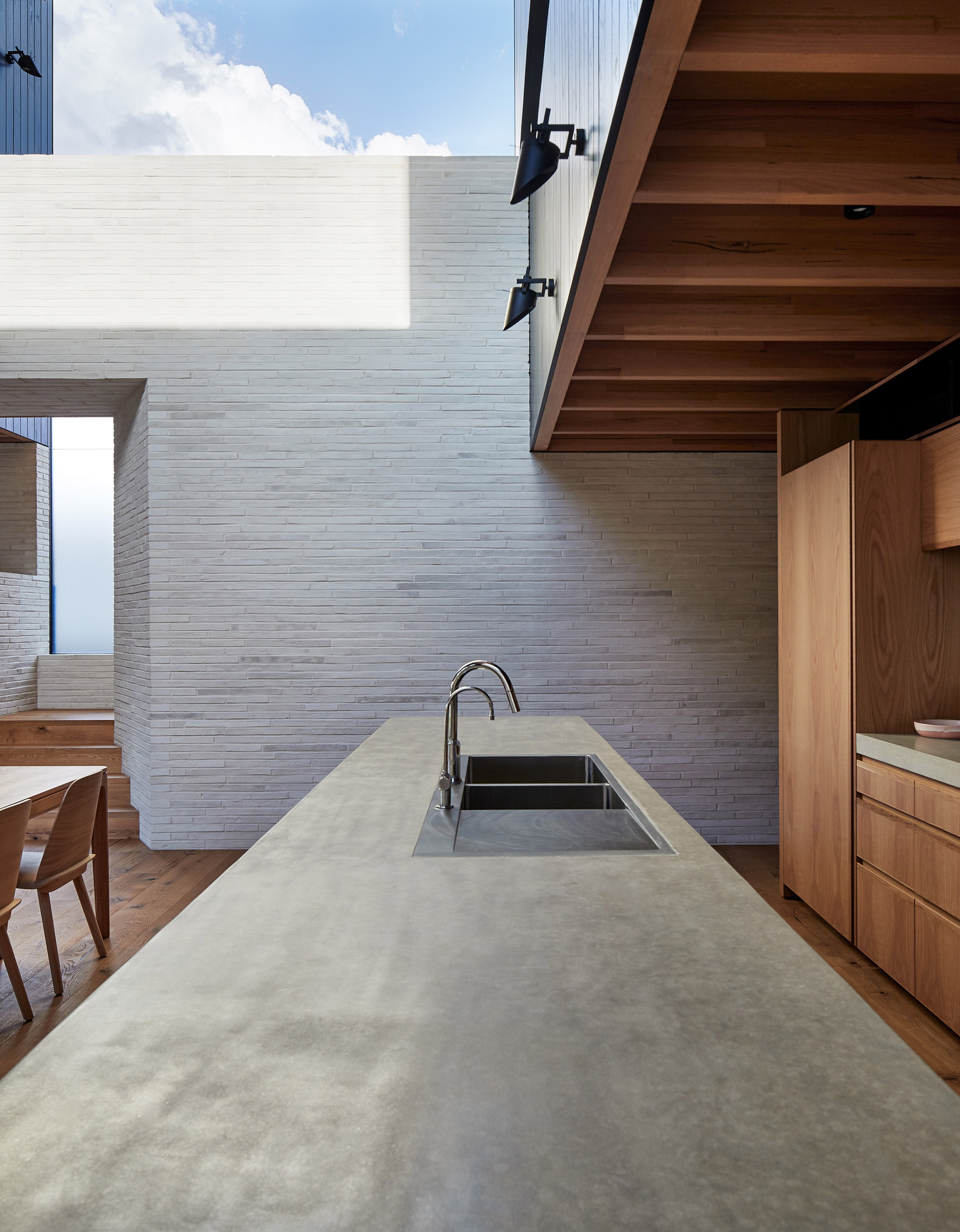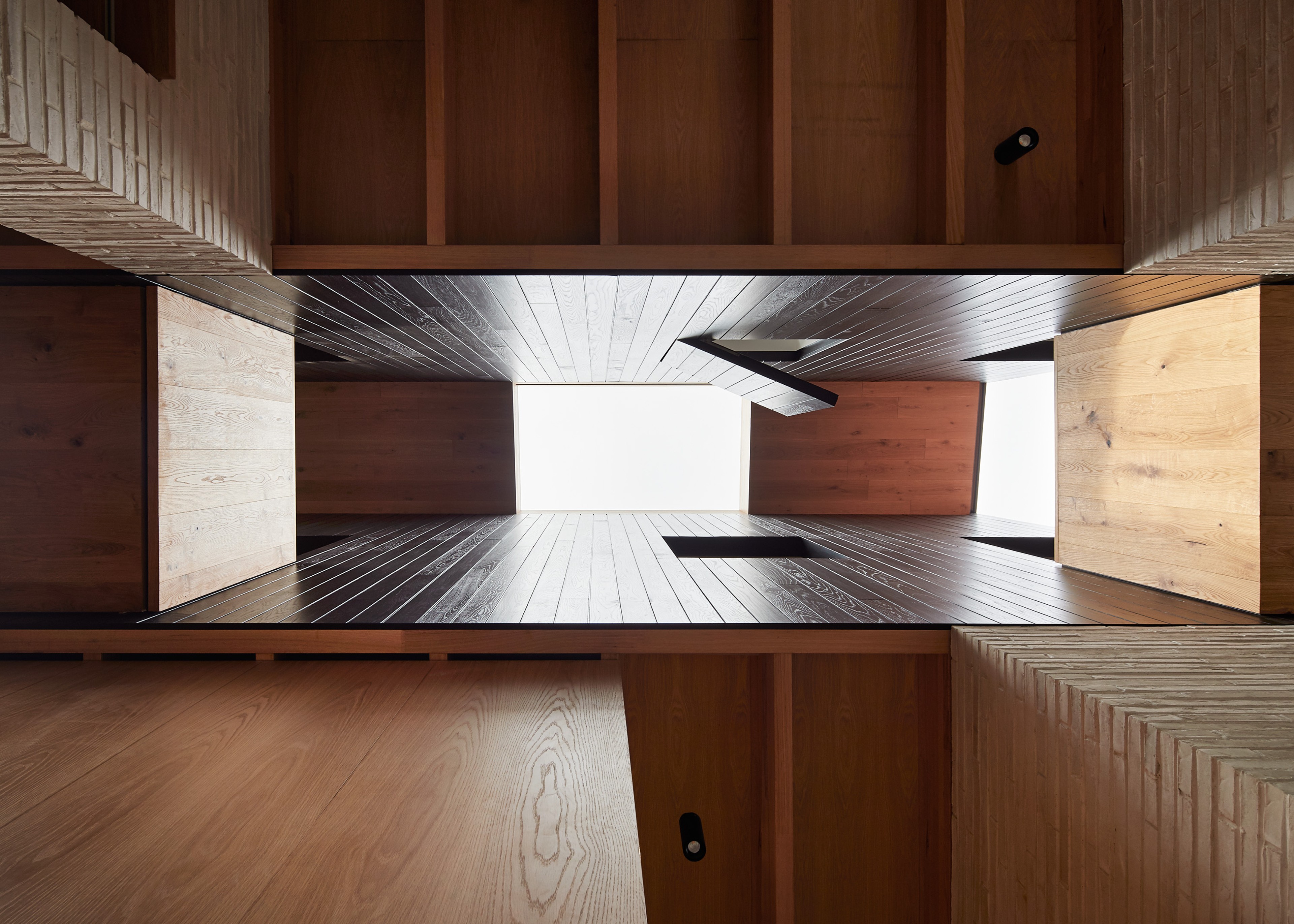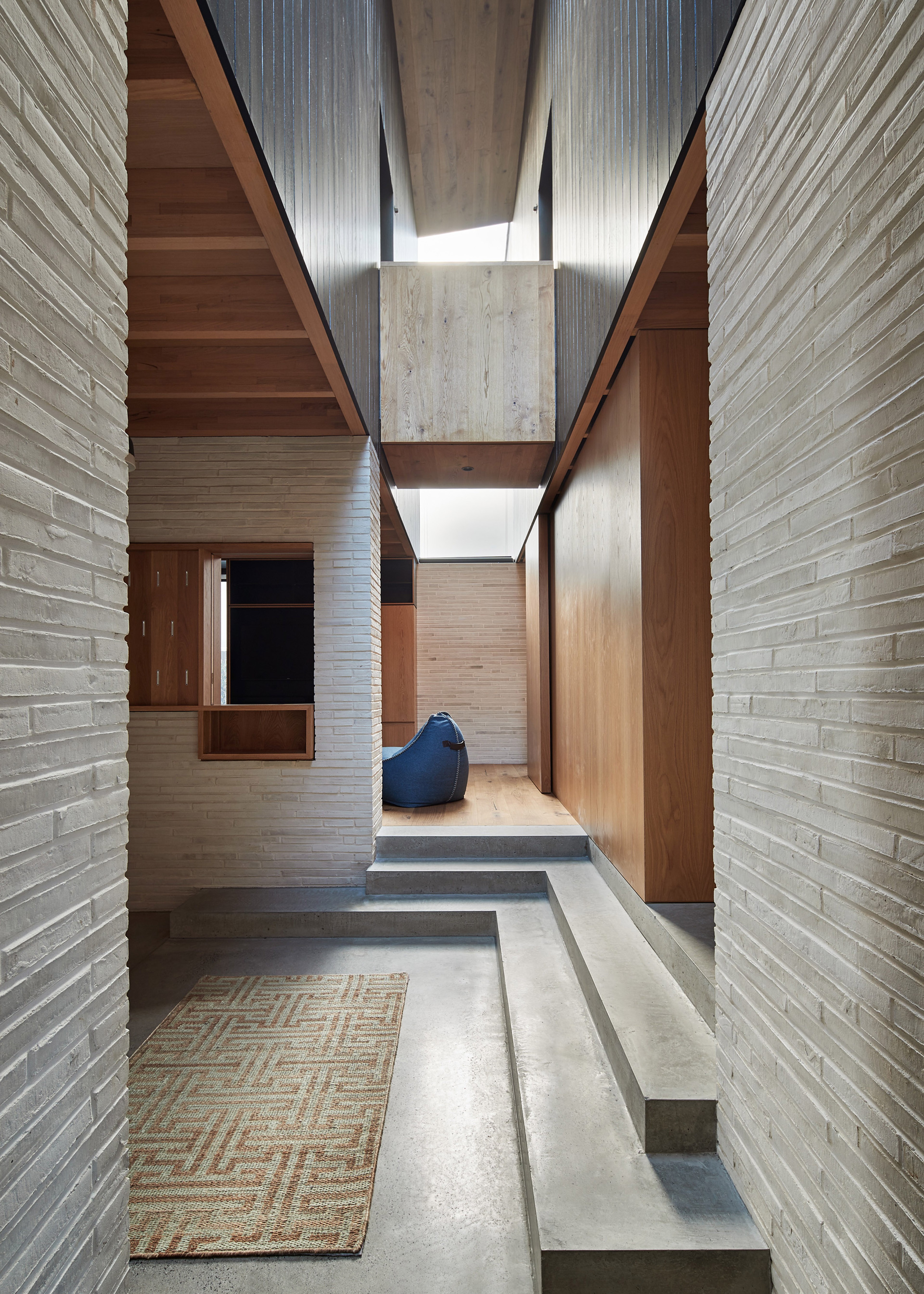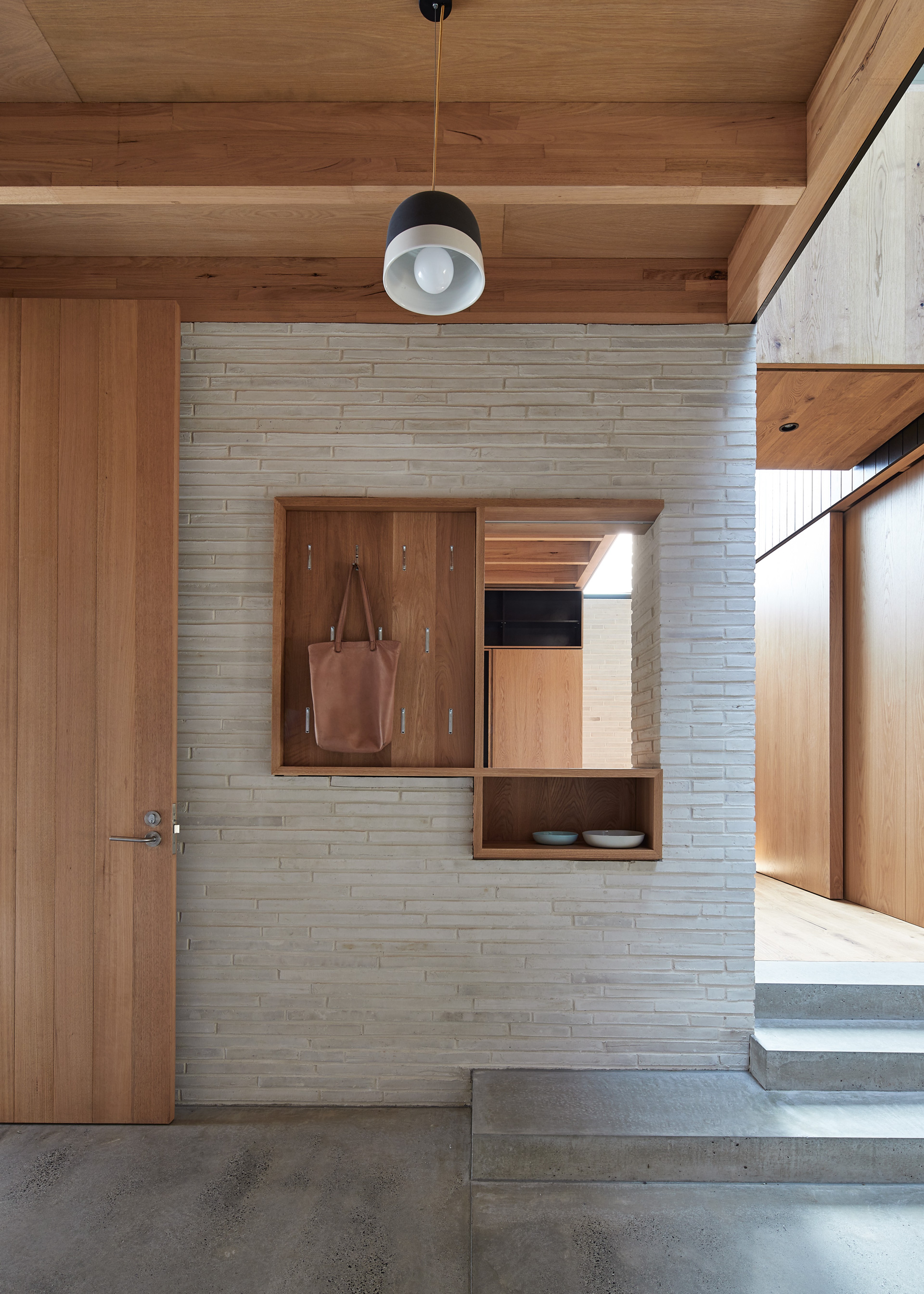 Refining a working method to achieve the texture of the Petersen brickwork was very important in the creation of the tactile feeling of the house. Great care was taken to co-ordinate timber finishes across different trades and suppliers – glulam supplier (Tasmanian Oak), plywood supplier and joinery (American oak). The construction resolution of these materials to maintain a simple, monolithic palette of concrete, brick, and timber was crucial in defining the interplay of a robust exterior and refined interior.