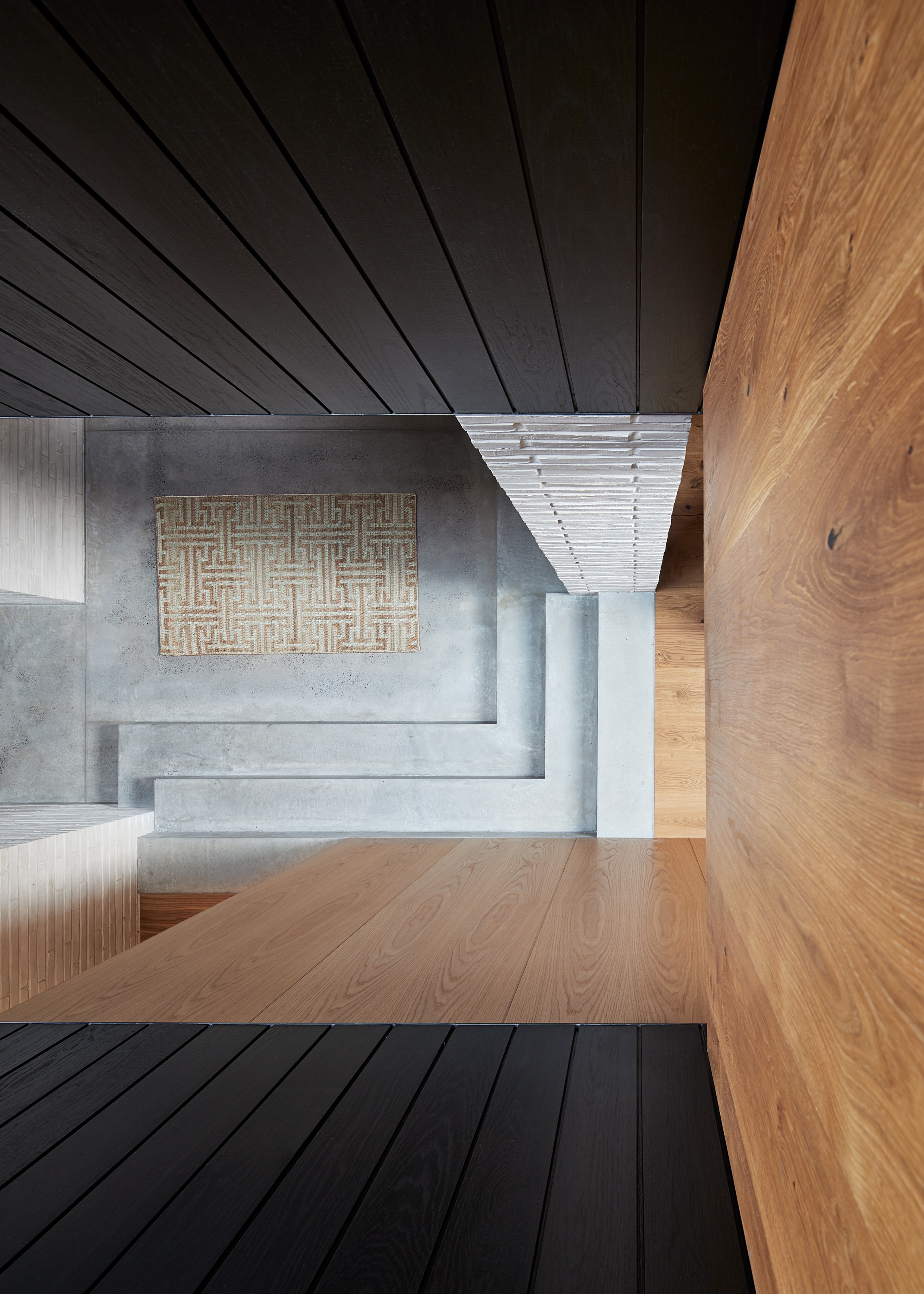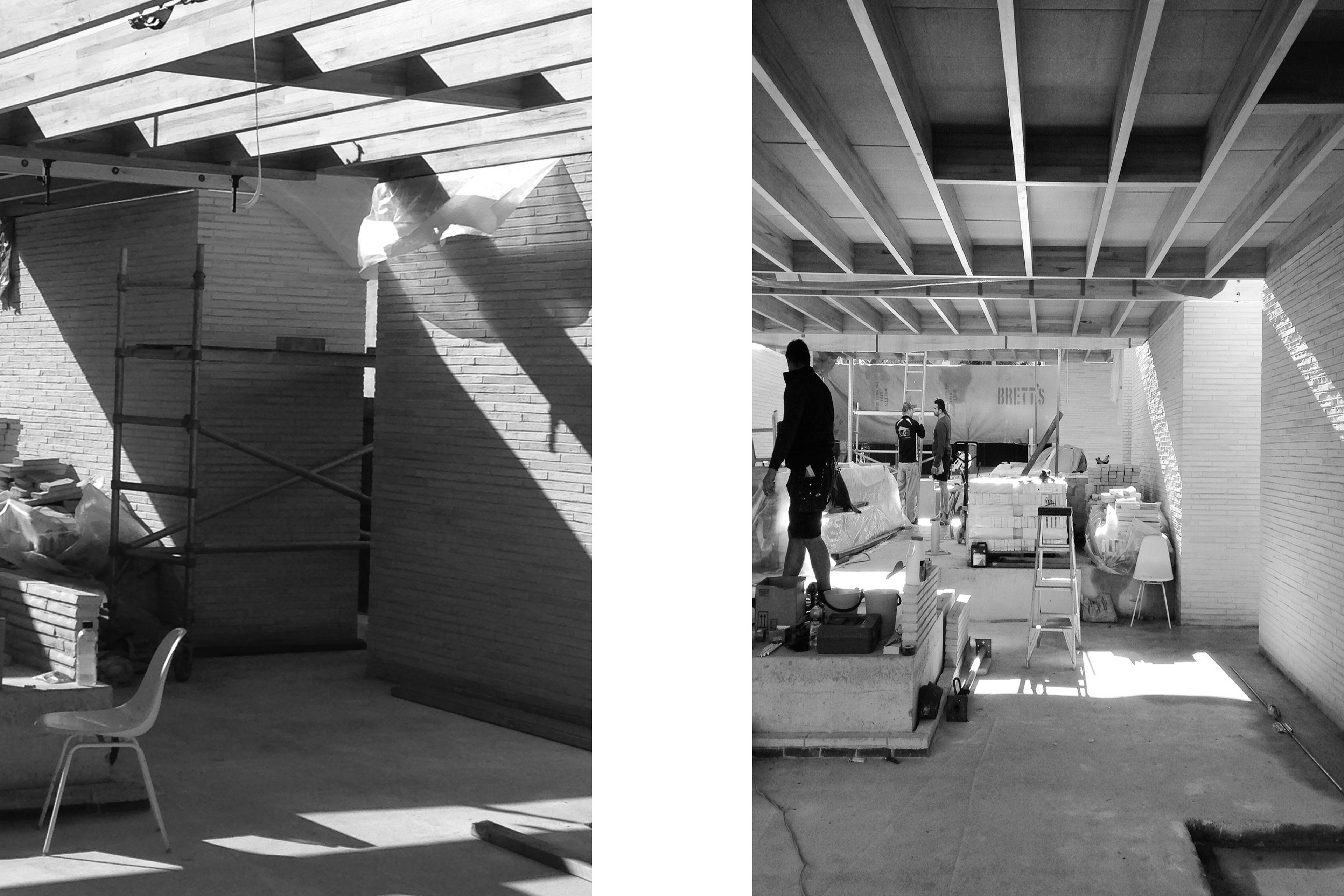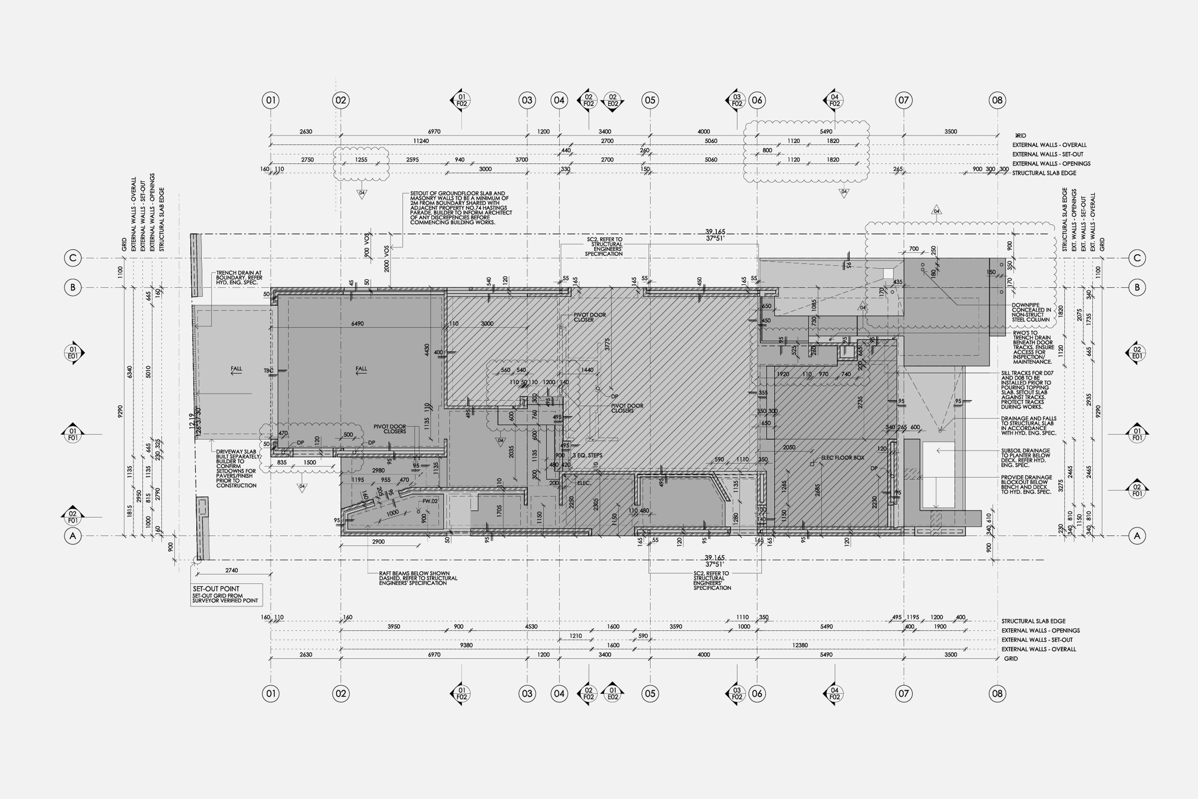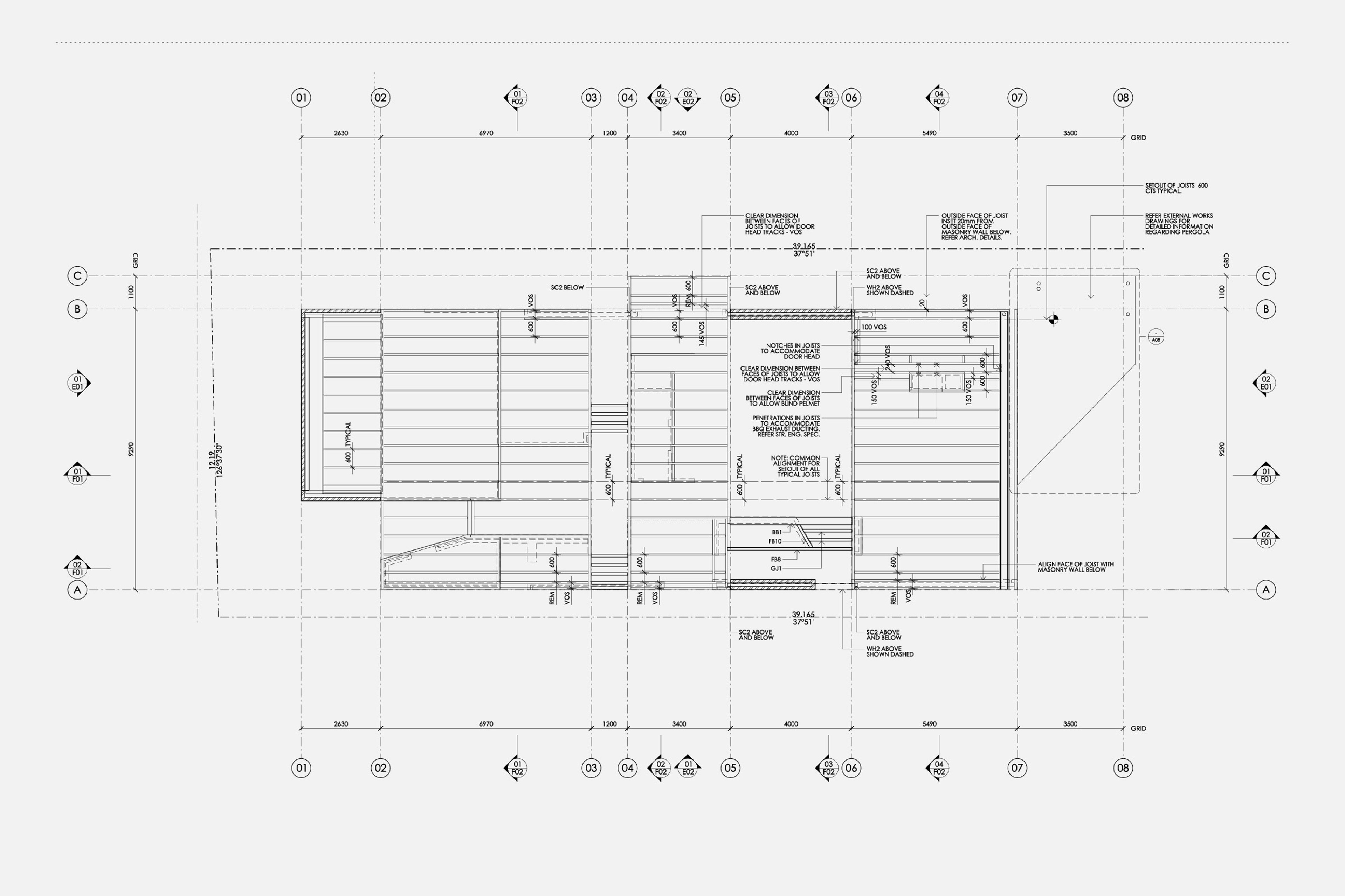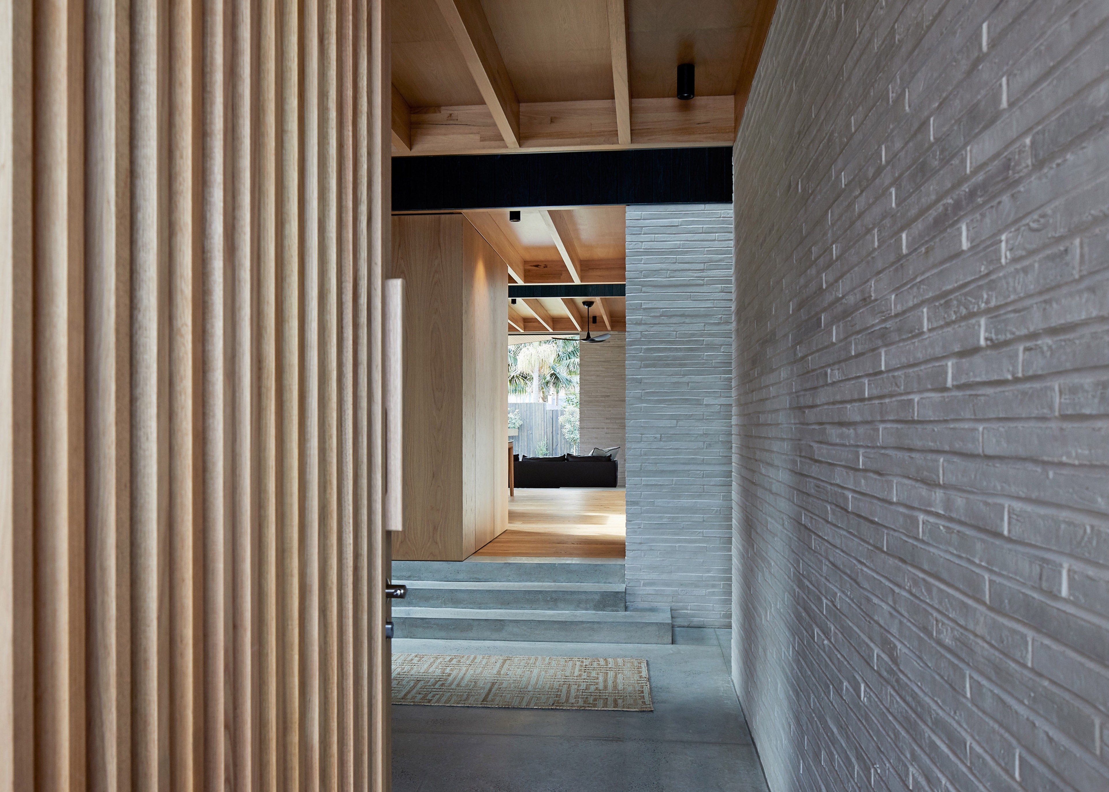 Refining a working method to achieve the texture of the Petersen brickwork was very important in the creation of the tactile feeling of the house. Great care was taken to co-ordinate timber finishes across different trades and suppliers – glulam supplier (Tasmanian Oak), plywood supplier and joinery (American oak). The construction resolution of these materials to maintain a simple, monolithic palette of concrete, brick, and timber was crucial in defining the interplay of a robust exterior and refined interior.
