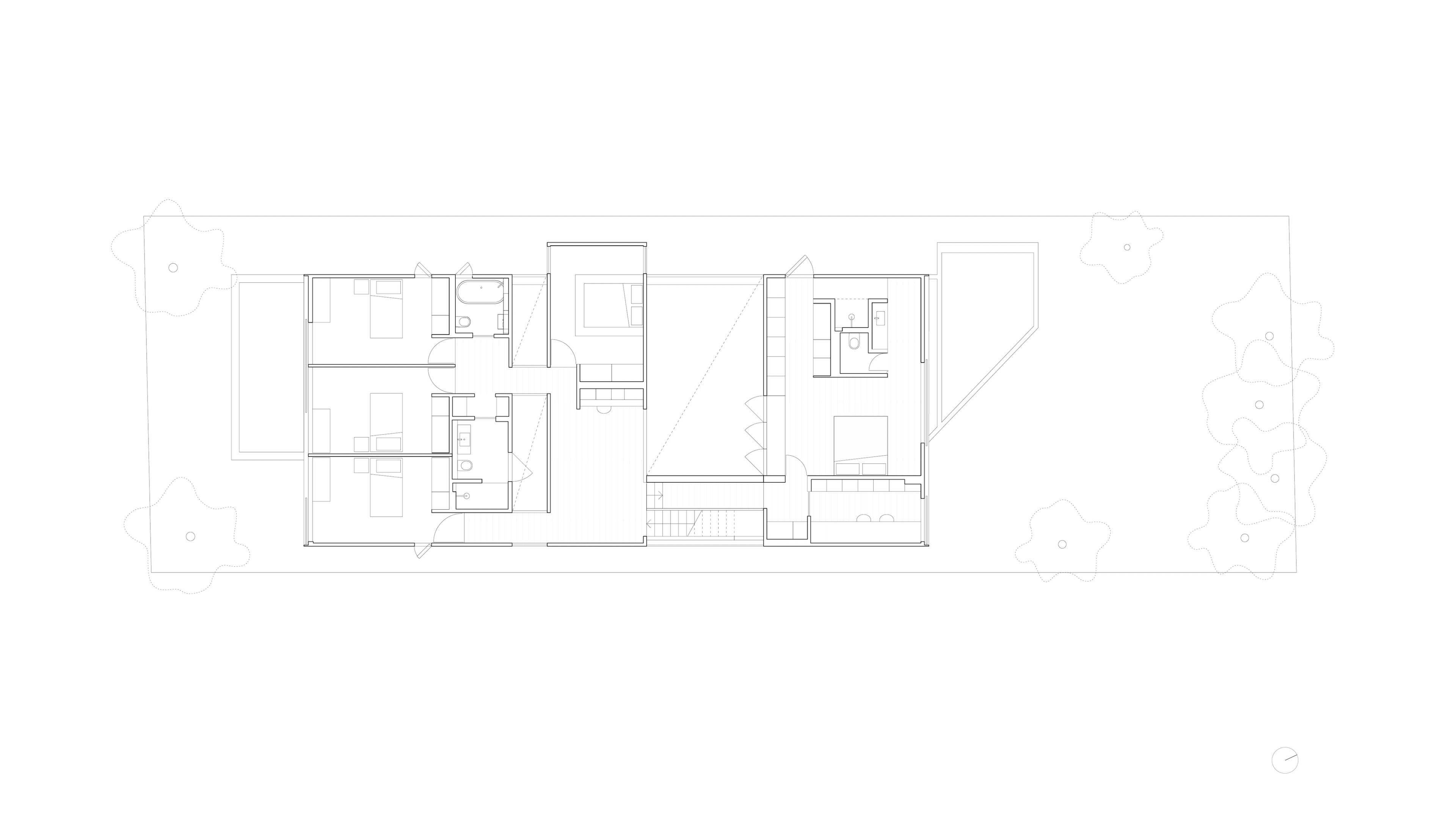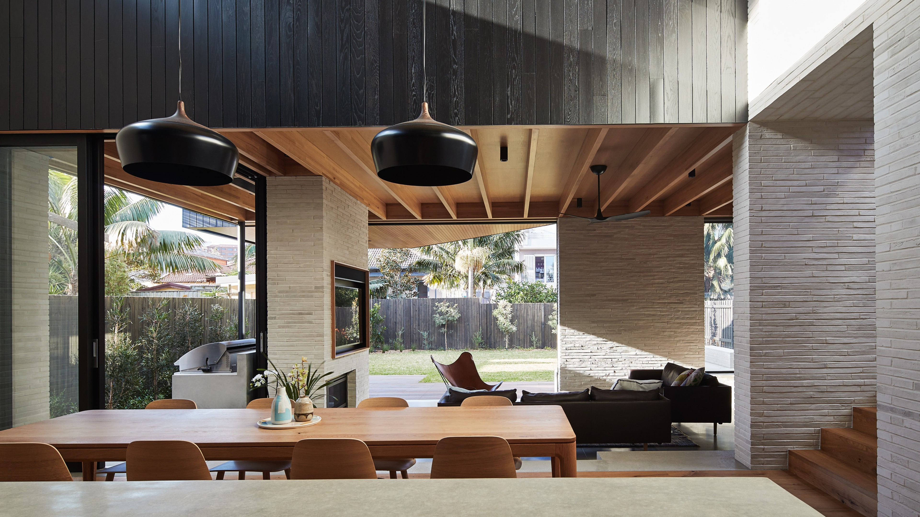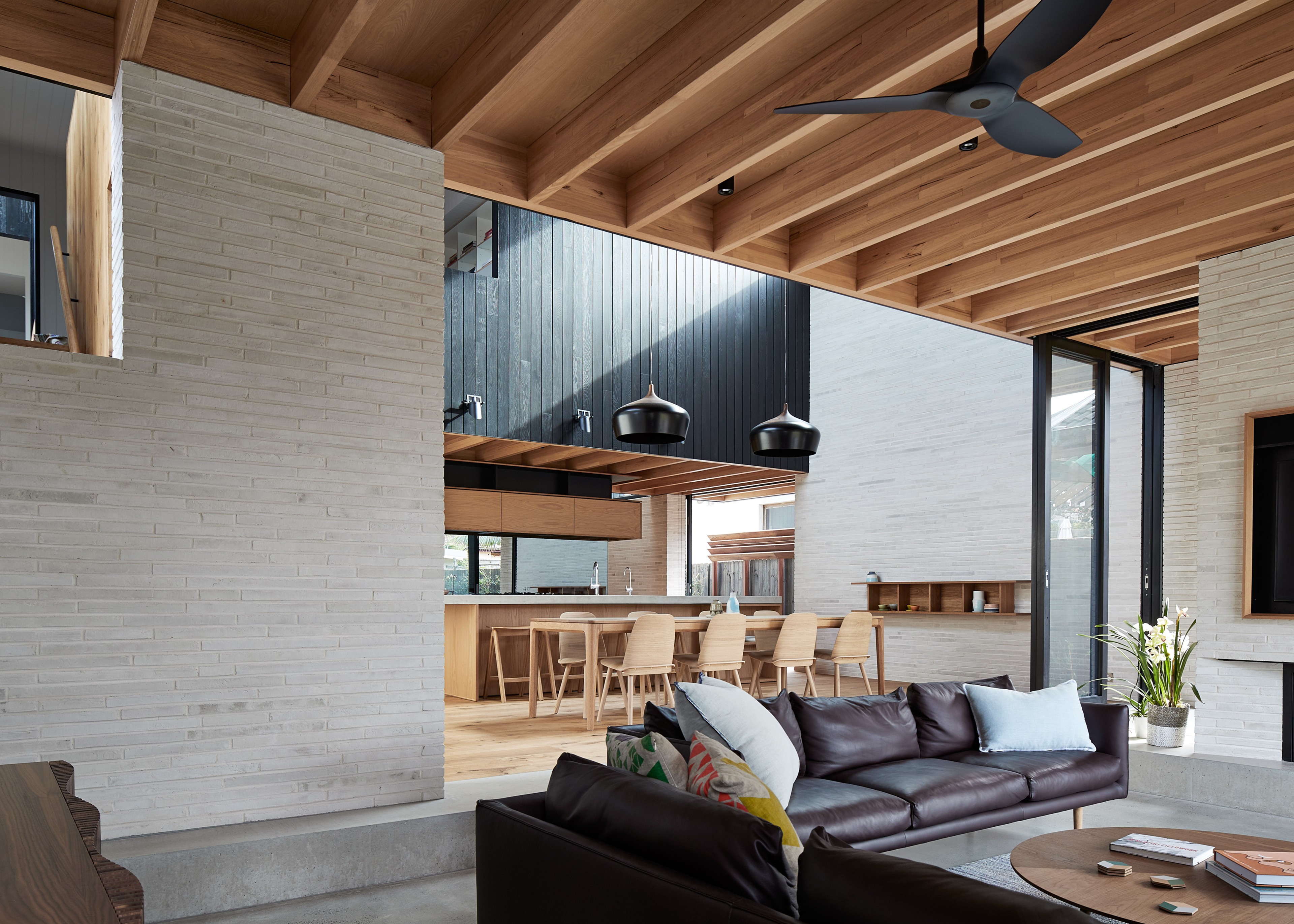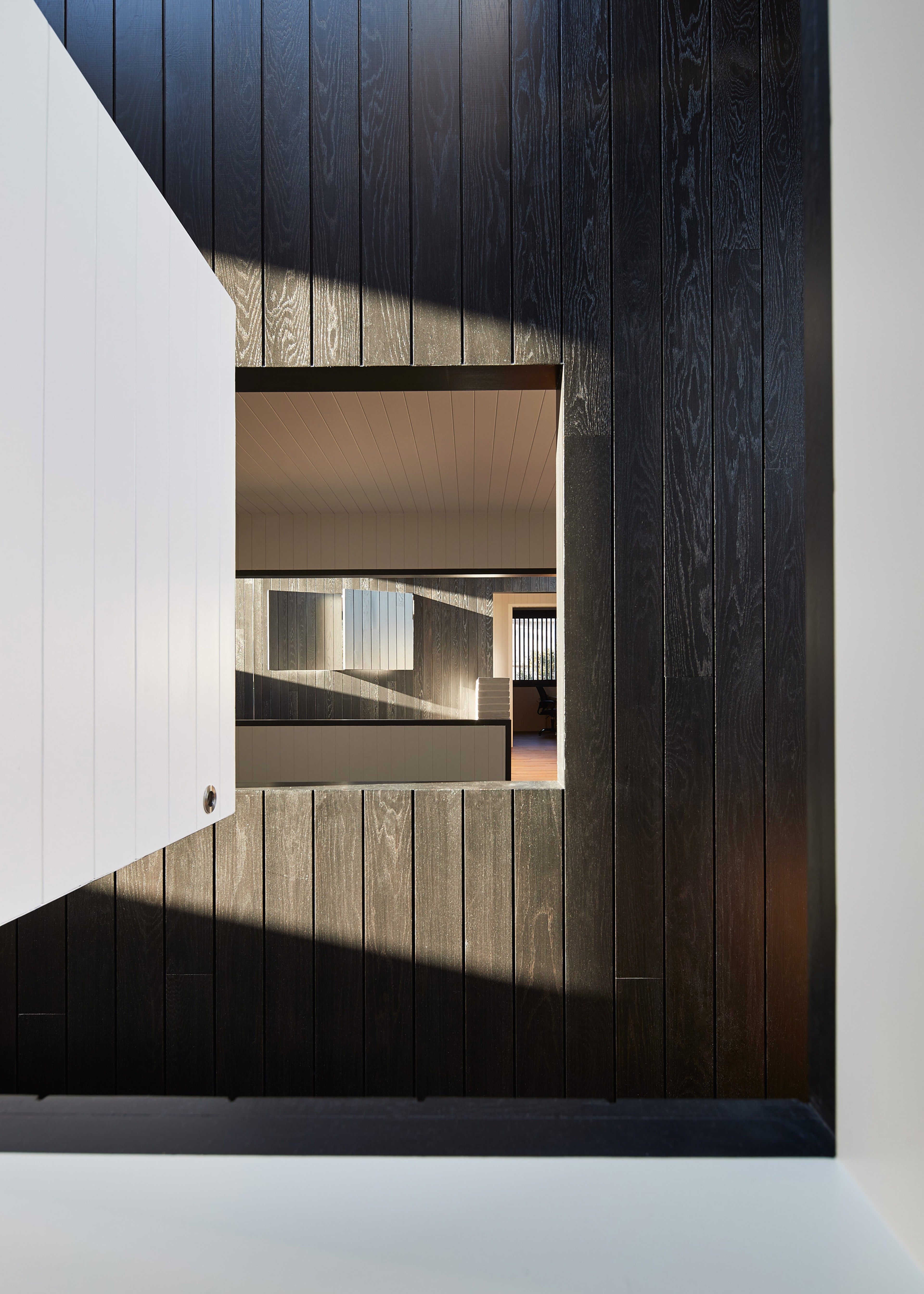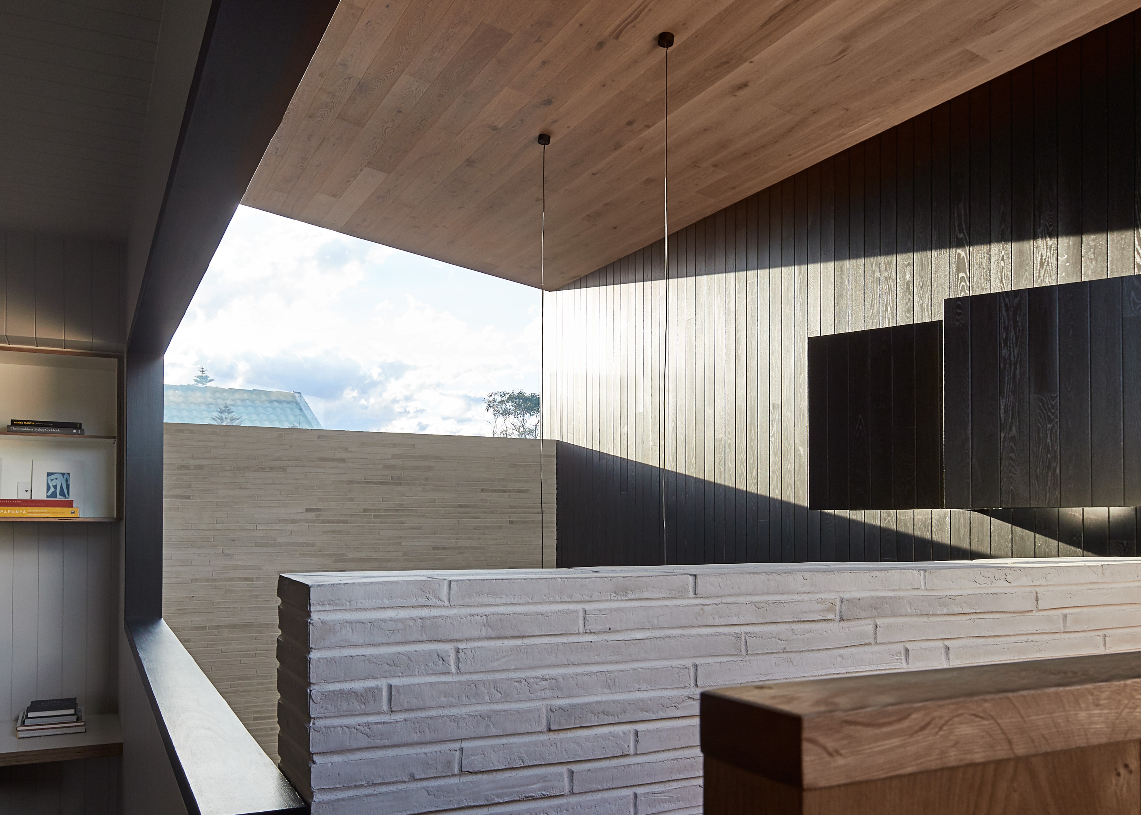 In the spatial and material resolution of the house a distinction was made between the ‘public’ programs and the ‘private’ programs of the house. All public programs are characterised by a robust natural palette that draws the exterior materials into the public interior – textured brick and black stained timber cladding. The more private interior rooms feature painted timber and American Oak joinery to create a light, intimate quality to bedrooms. Looking through the bridges and voids on the upper level creates a rich layering of spatial experience from private to the public areas of the house.