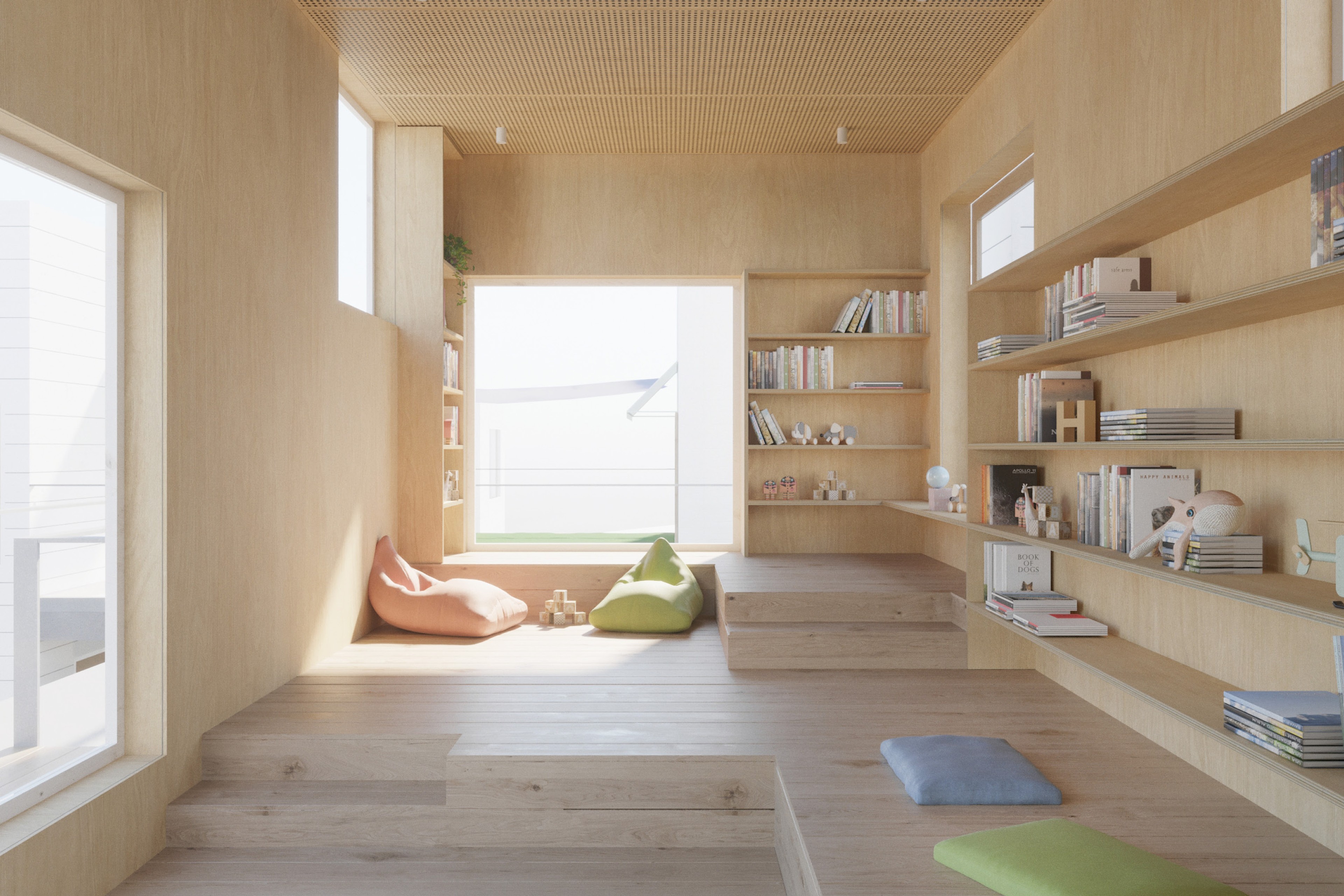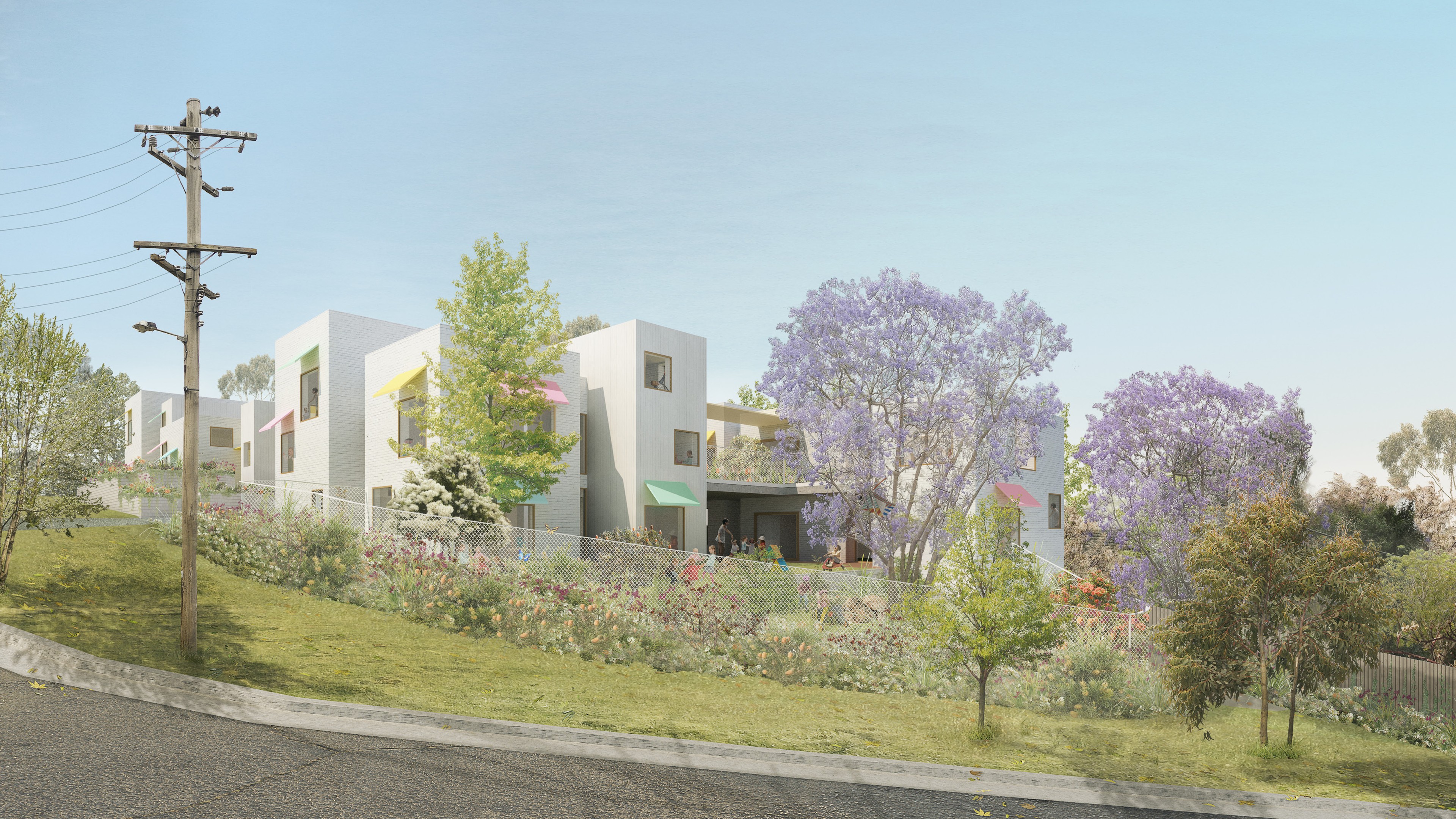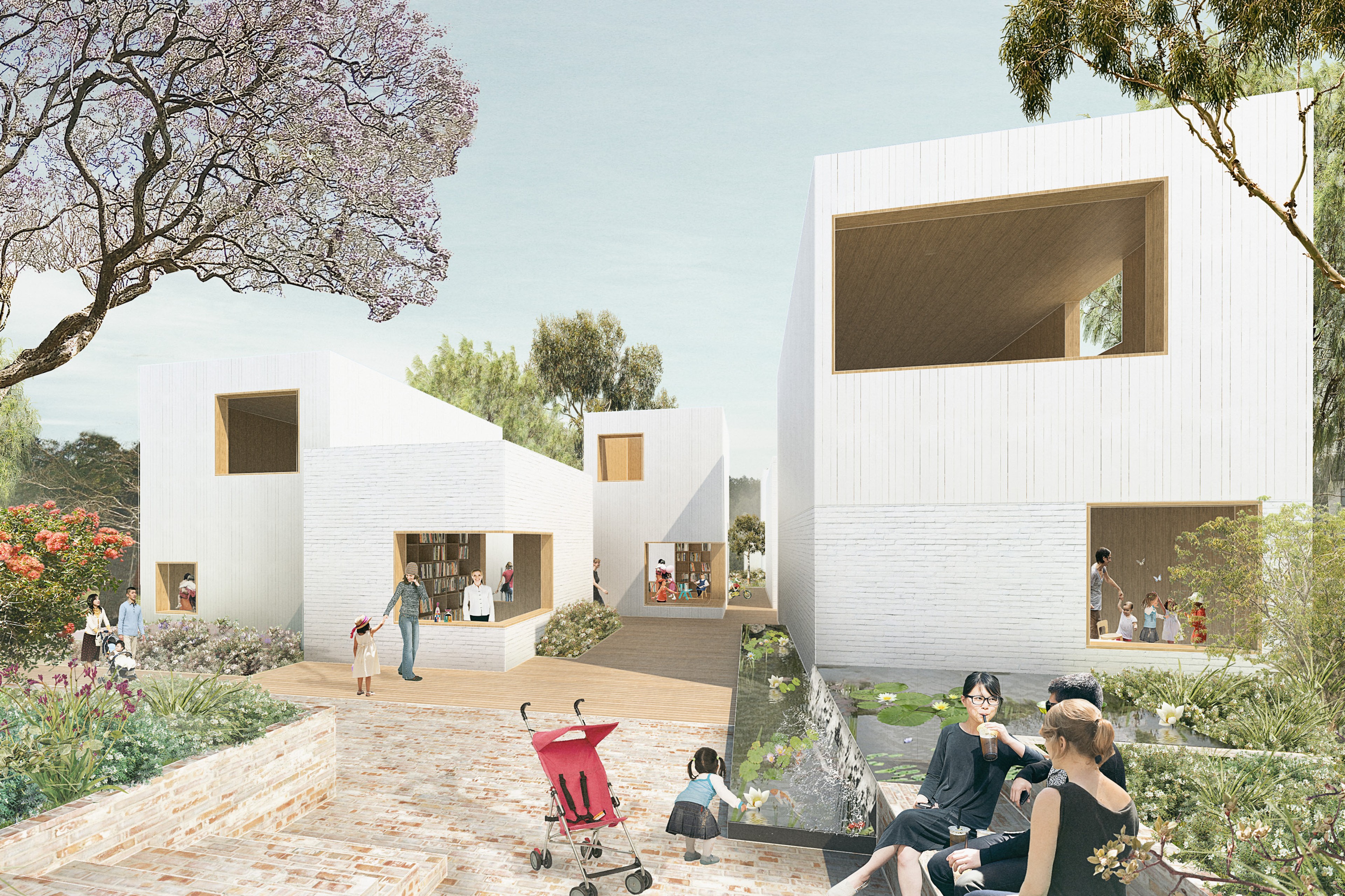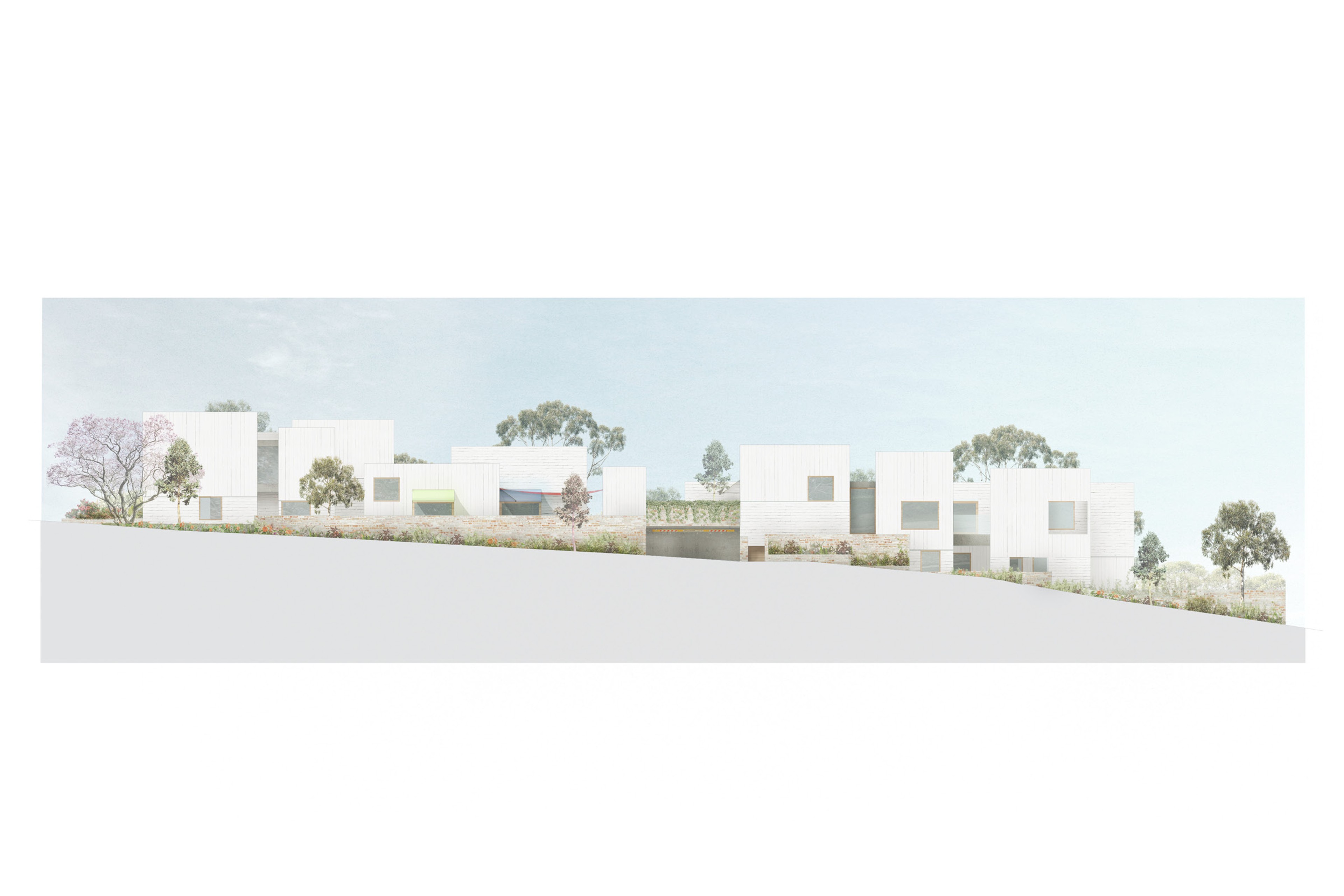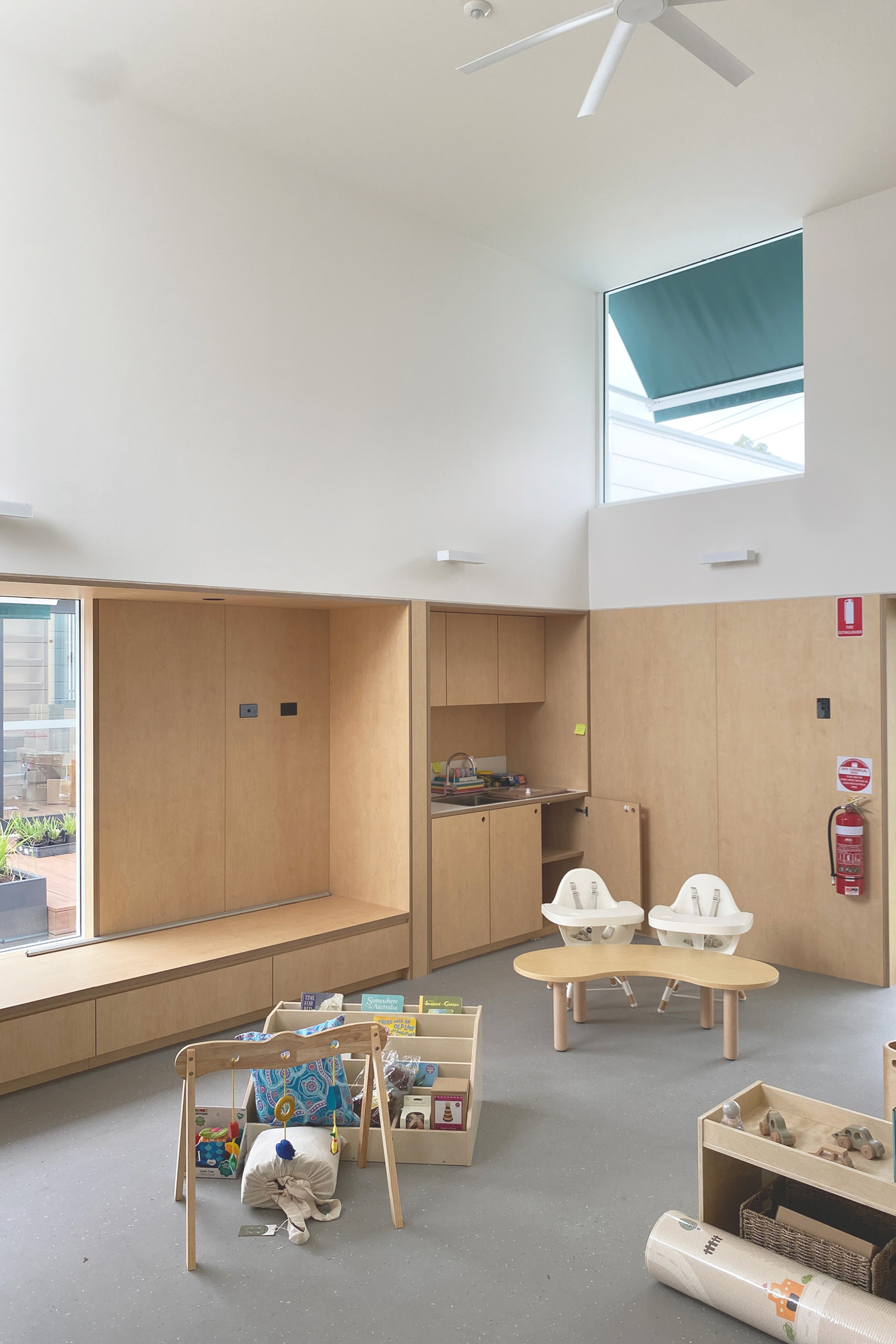 Located on a sloping site in North Rocks, our brief was for a new childcare to accommodate 99 children in a terraced centre with basement parking. Working with the natural terrain, we developed a concept of a dense hillside village, characterised by double storey childcare buildings and terraced gardens permitting direct and level access between all indoor and outdoor play spaces.