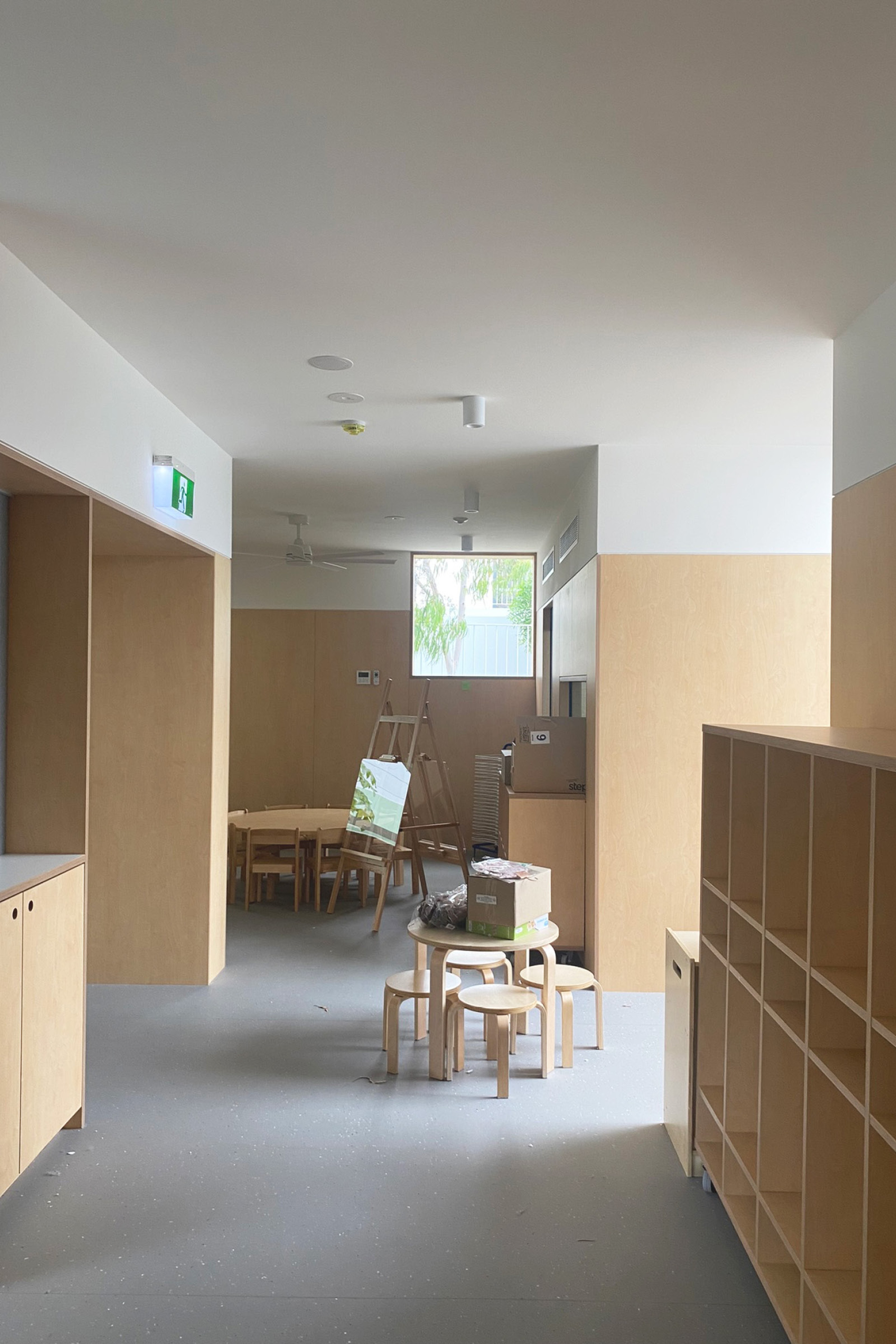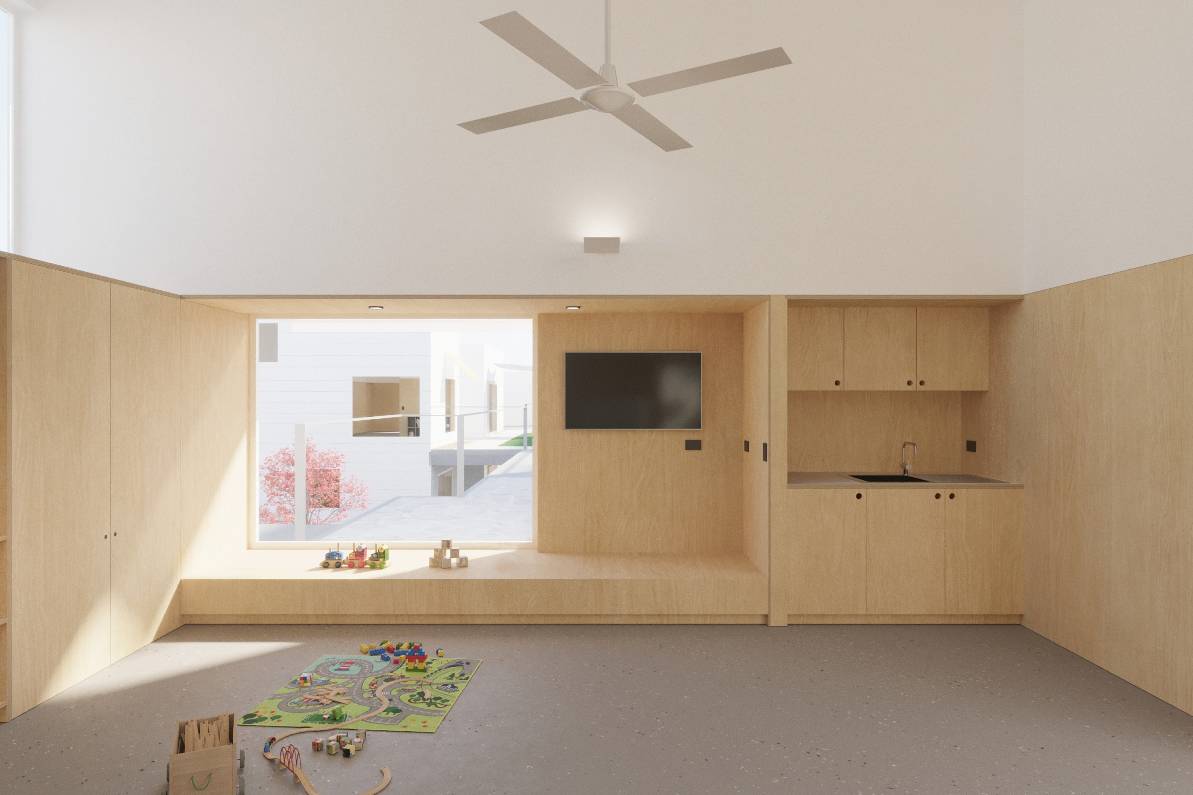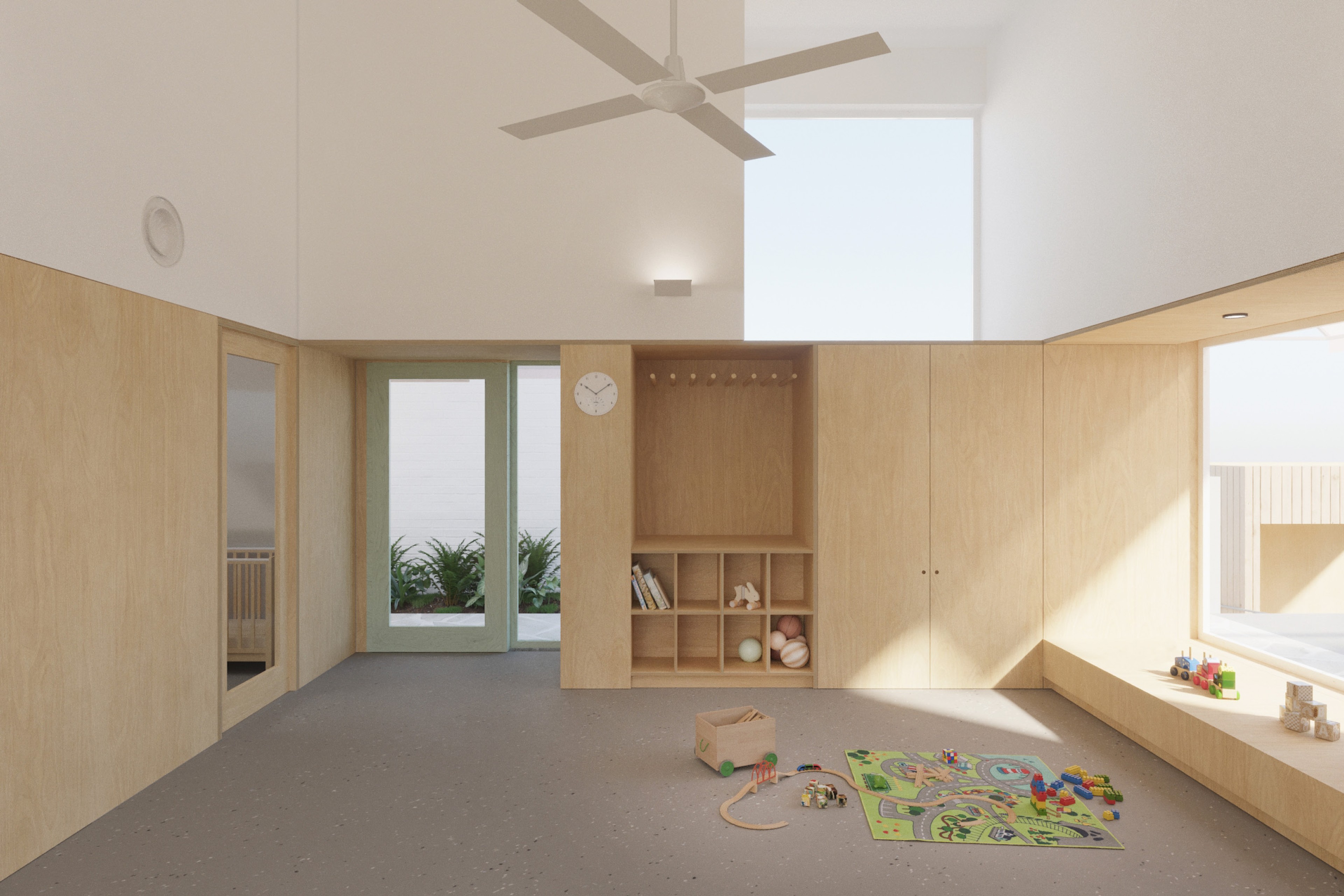 The footprint of the tightly scaled buildings responds to the scale of the surrounding residential neighbourhood. The language of a clustering of distinct forms creates a campus of buildings, allowing a greater community engagement within the childcare campus nestled into its suburban landscape.
