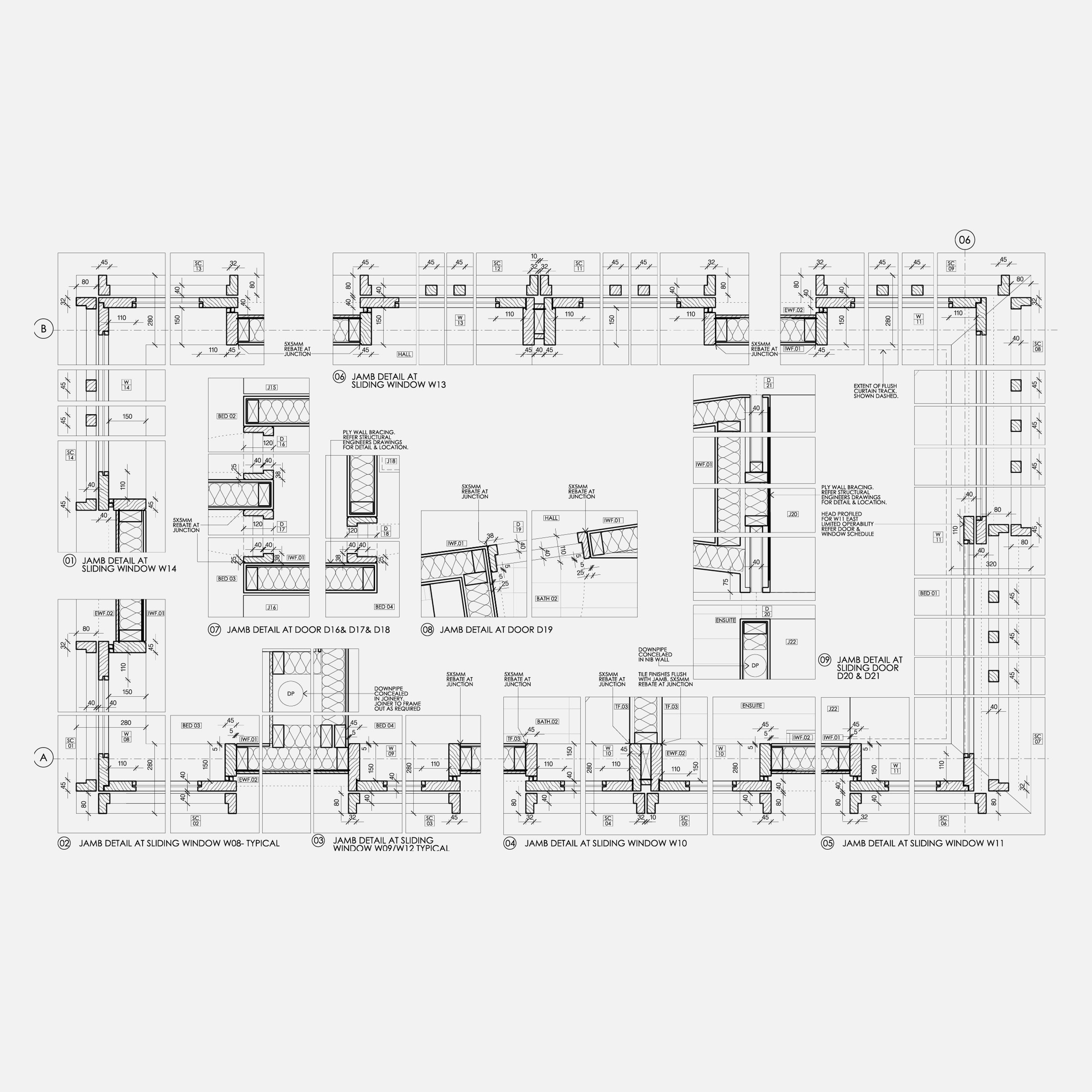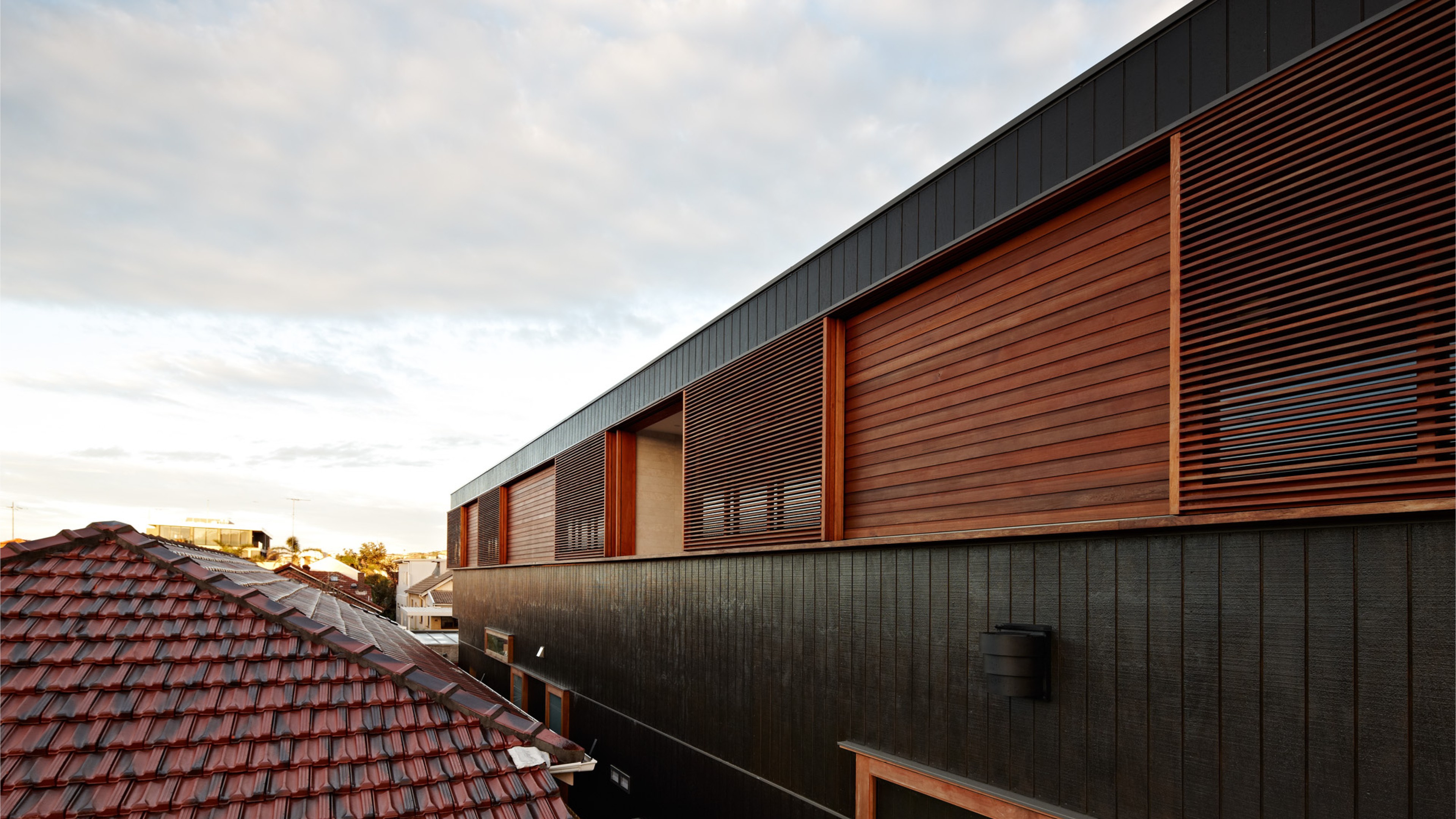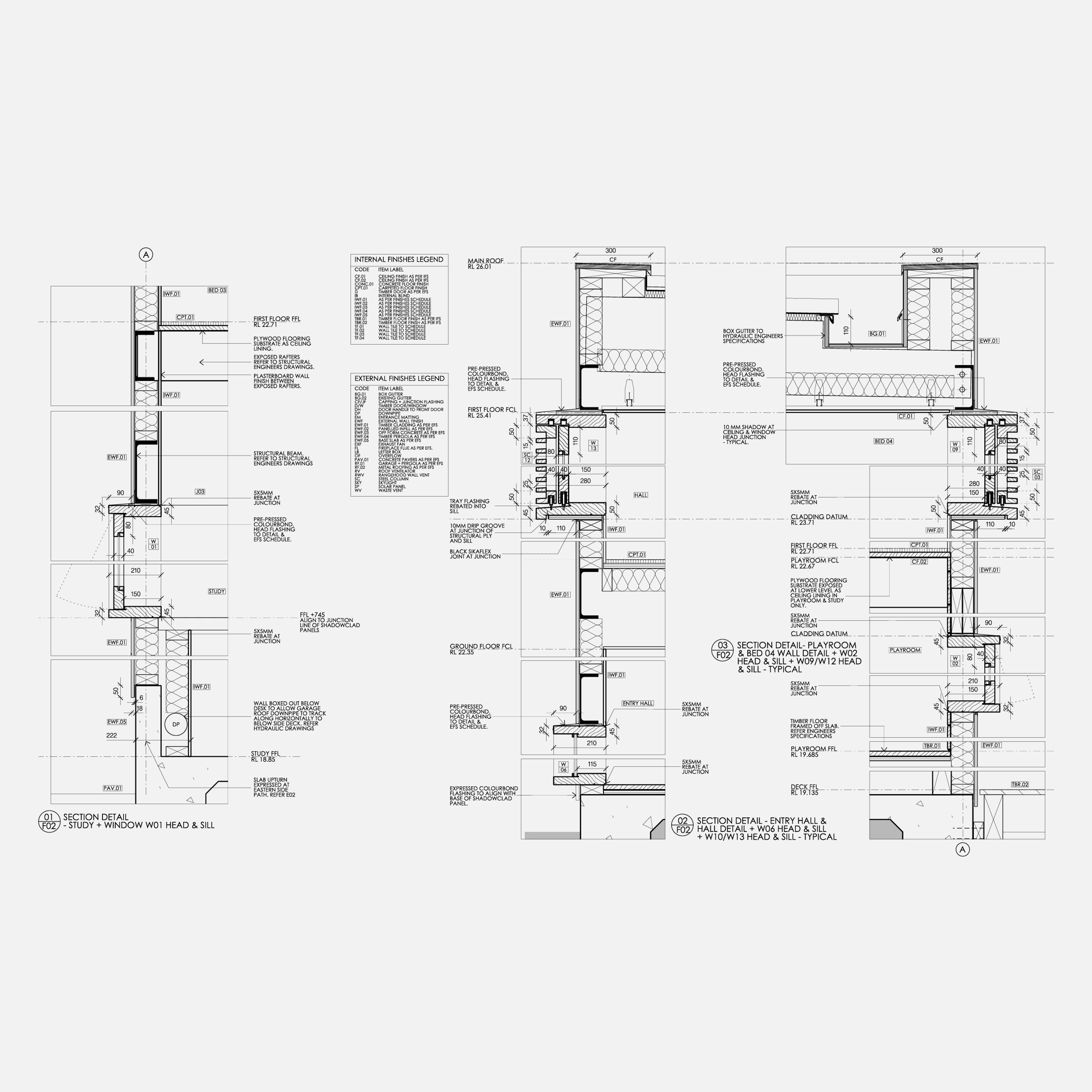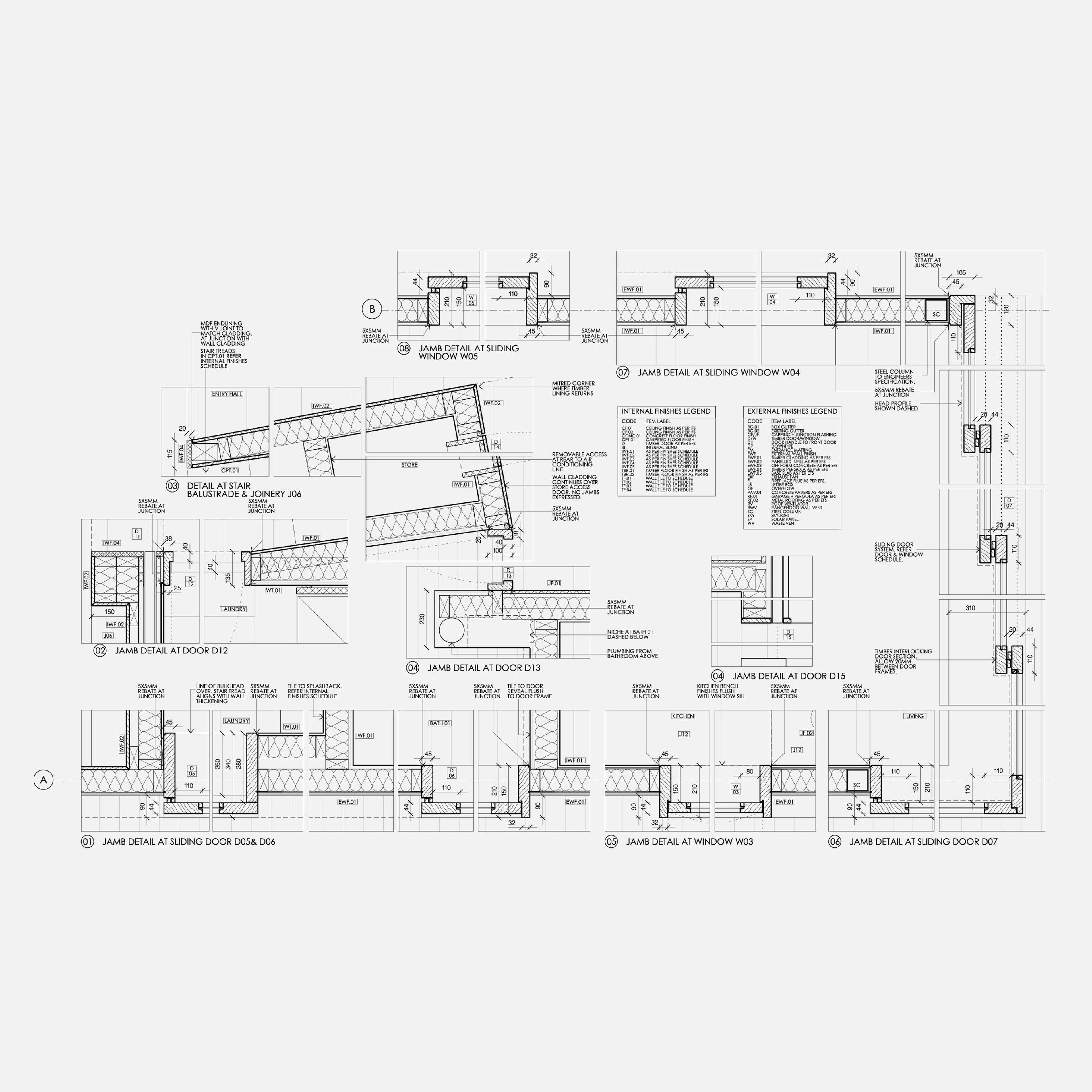 Meticulously constructed by the client as owner builder, a feature of the construction was the integration of a continuous band of a horizontal timber screens and windows on the upper level. Detailed to project forward of the façade, the co-ordination of these elements between the overall façade dimension and varying internal room dimensions required careful documentation of the operational function and setouts of the windows andscreens.