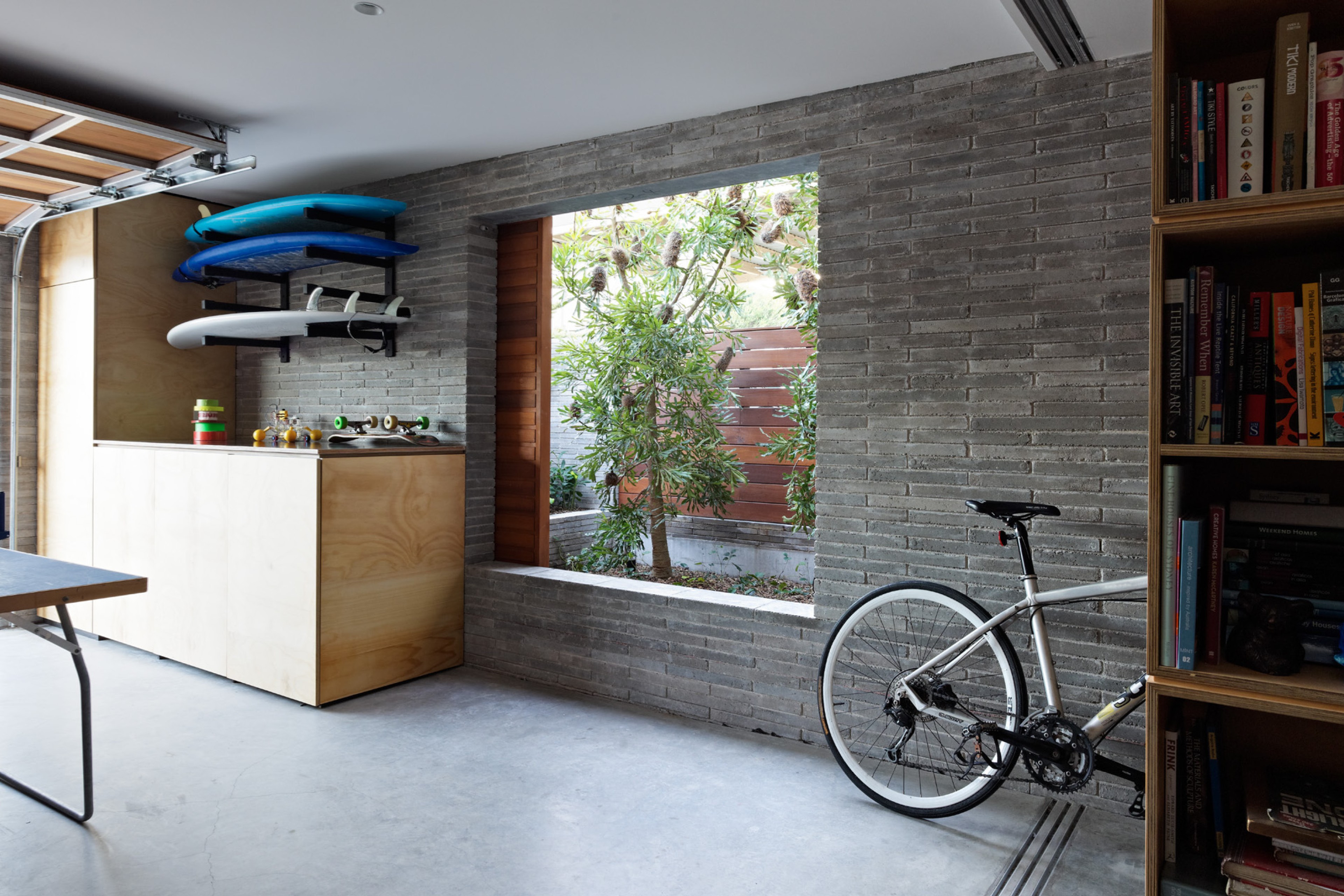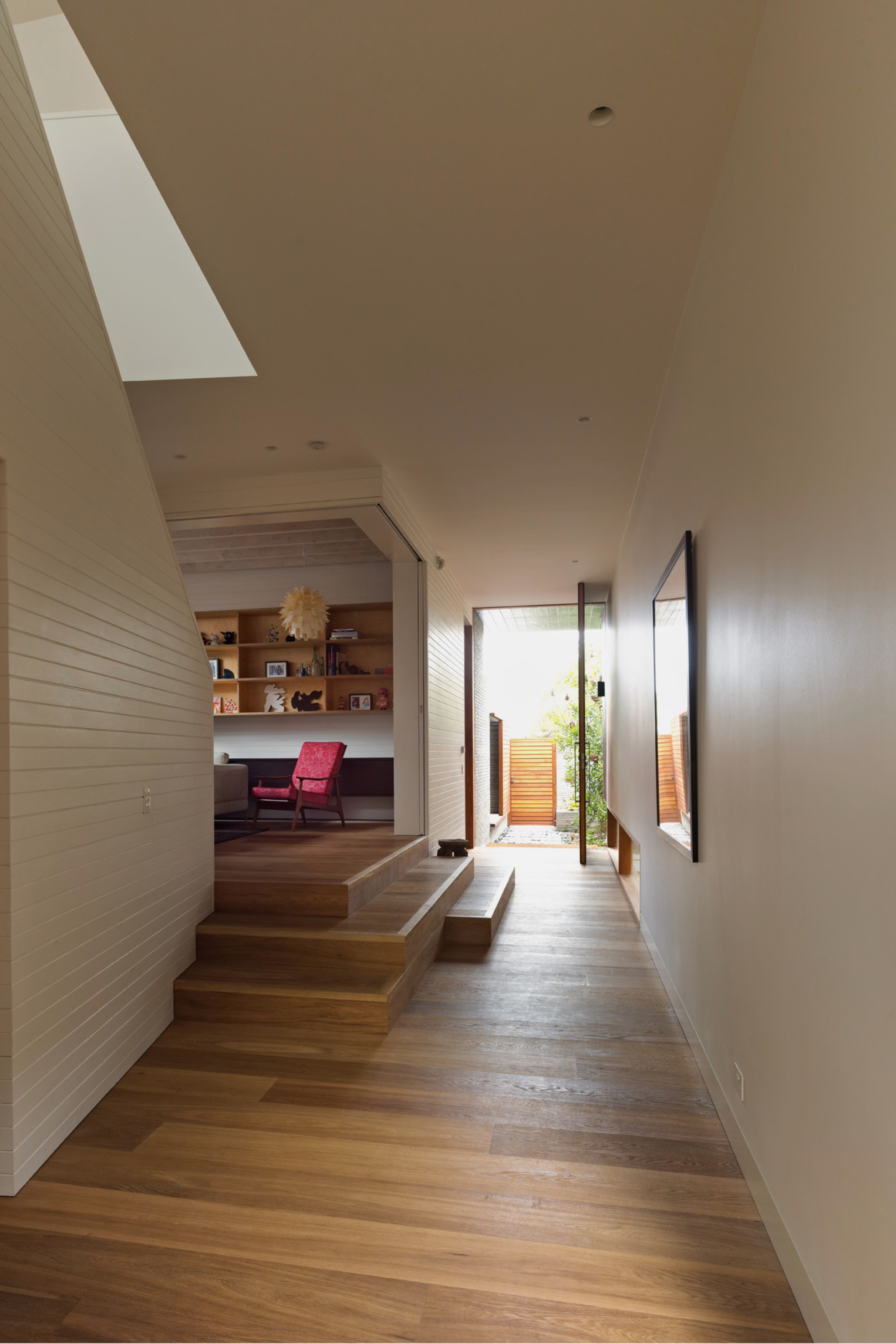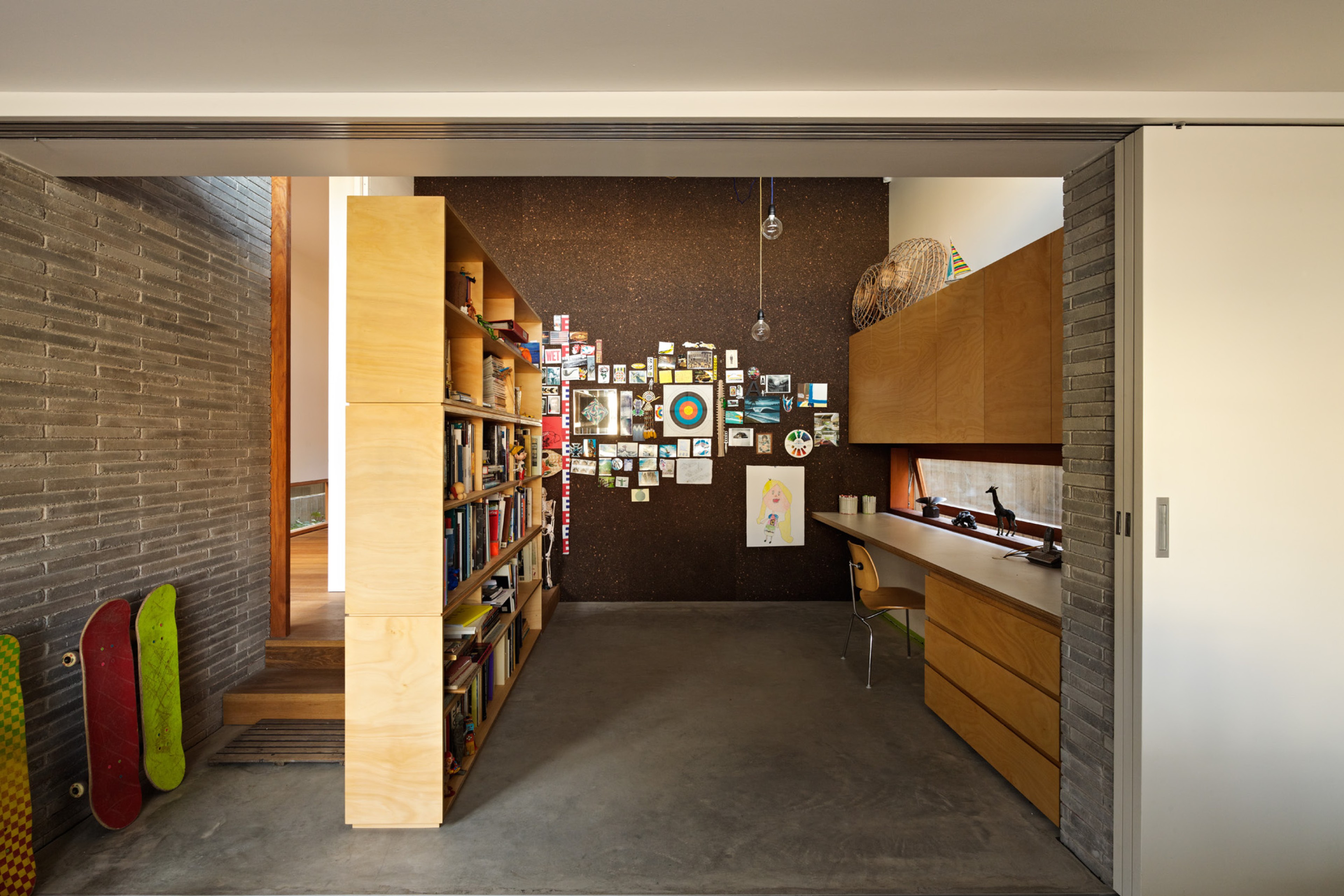 The idea of ‘borrowing’ space between elements (stair/void, upper circulation/void, entry hall/stair and TV room) is also used as a functional strategy, evident in the relationship of the home office and garage as interconnecting elements that allow the art director owner to expand and contract his workspace depending on whether he is building physical mock-ups or working digitally.