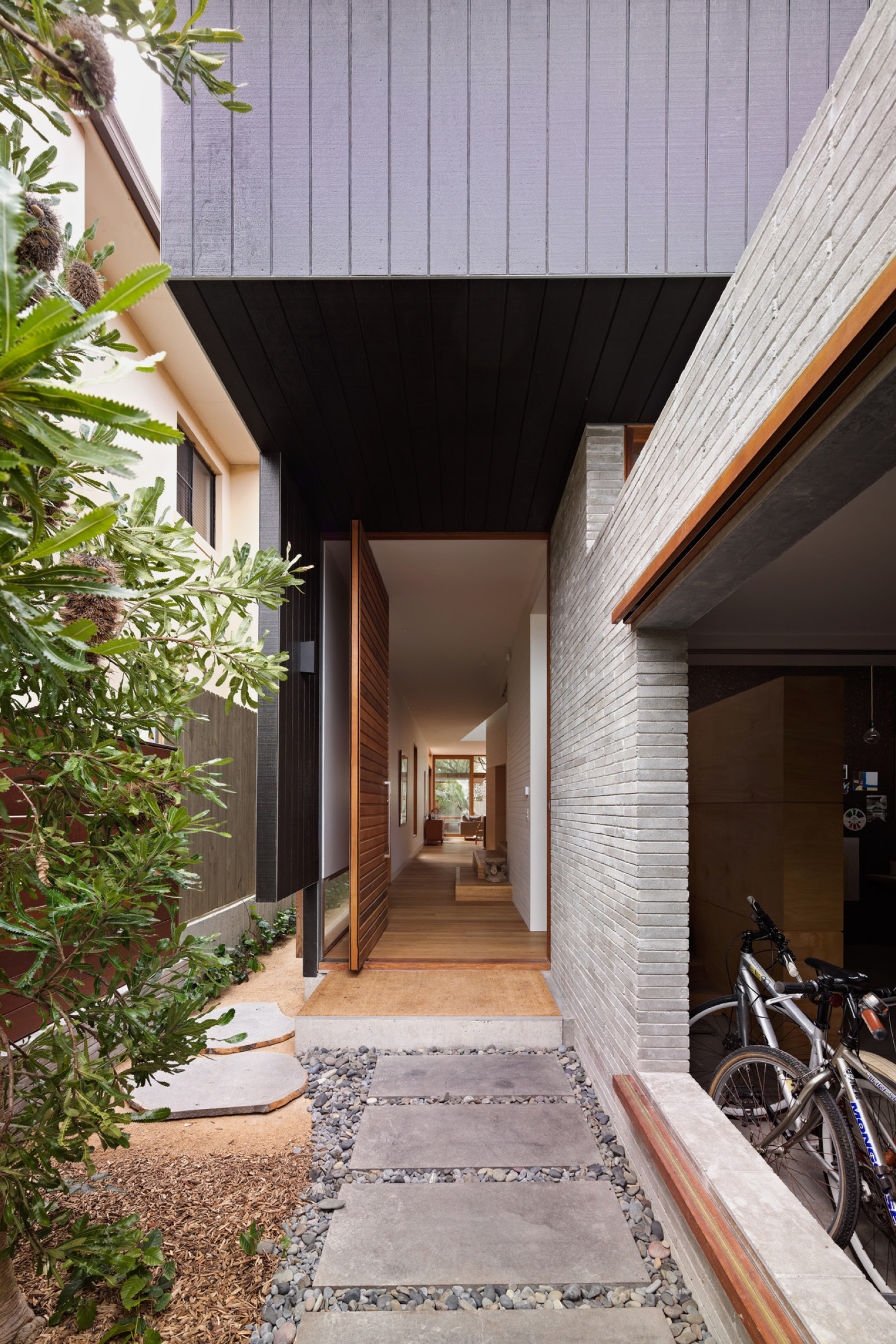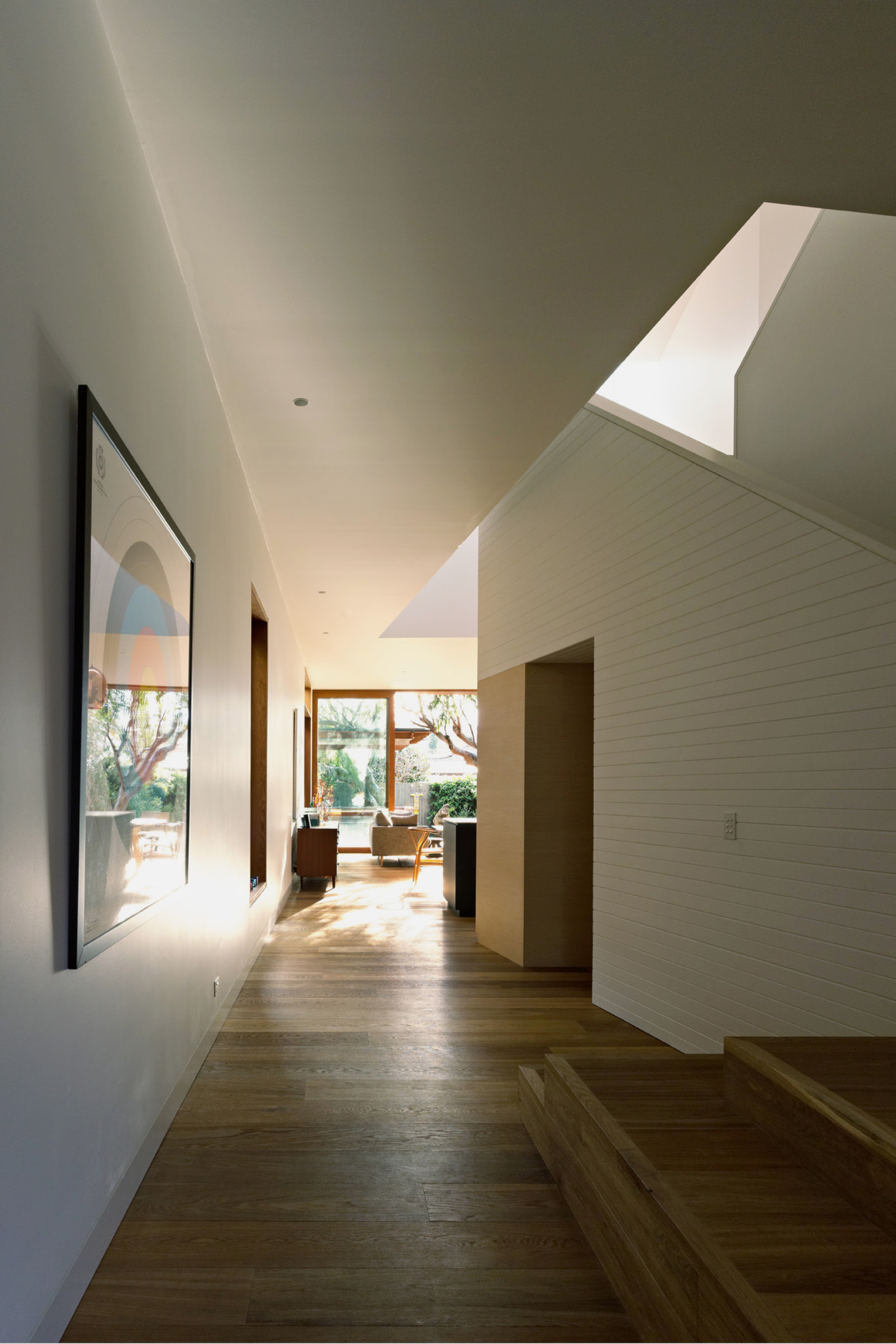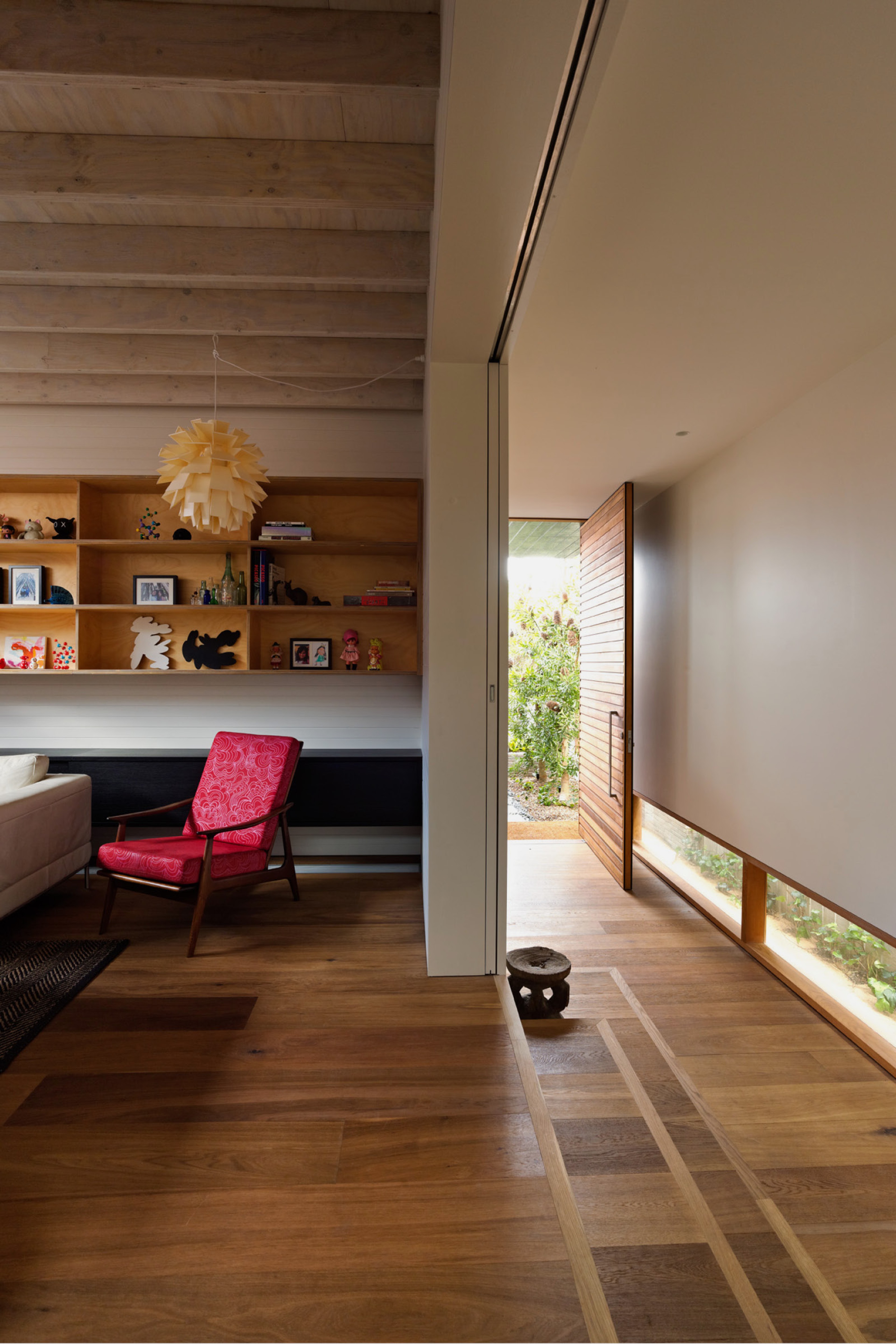 The idea of ‘borrowing’ space between elements (stair/void, upper circulation/void, entry hall/stair and TV room) is also used as a functional strategy, evident in the relationship of the home office and garage as interconnecting elements that allow the art director owner to expand and contract his workspace depending on whether he is building physical mock-ups or working digitally.