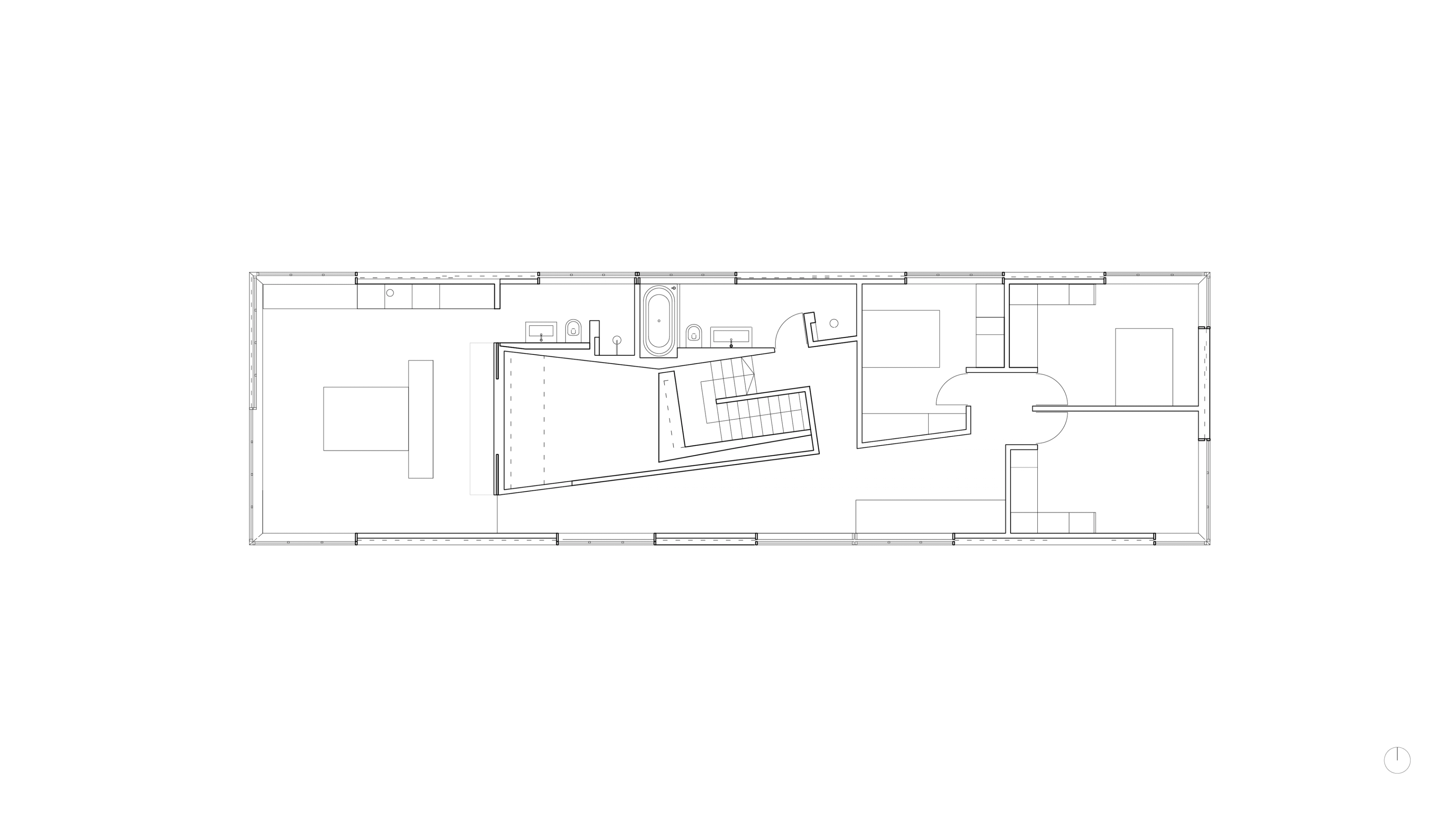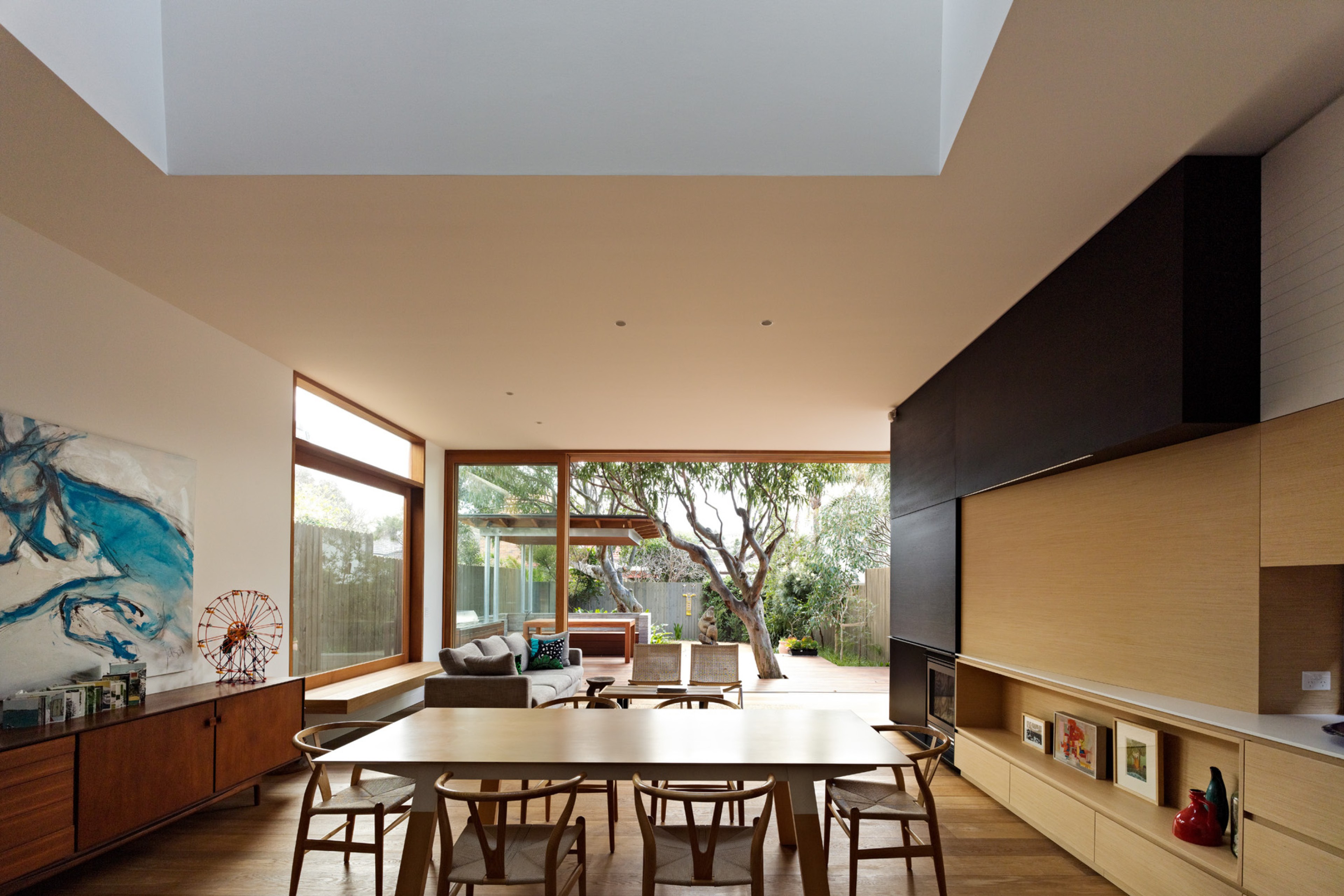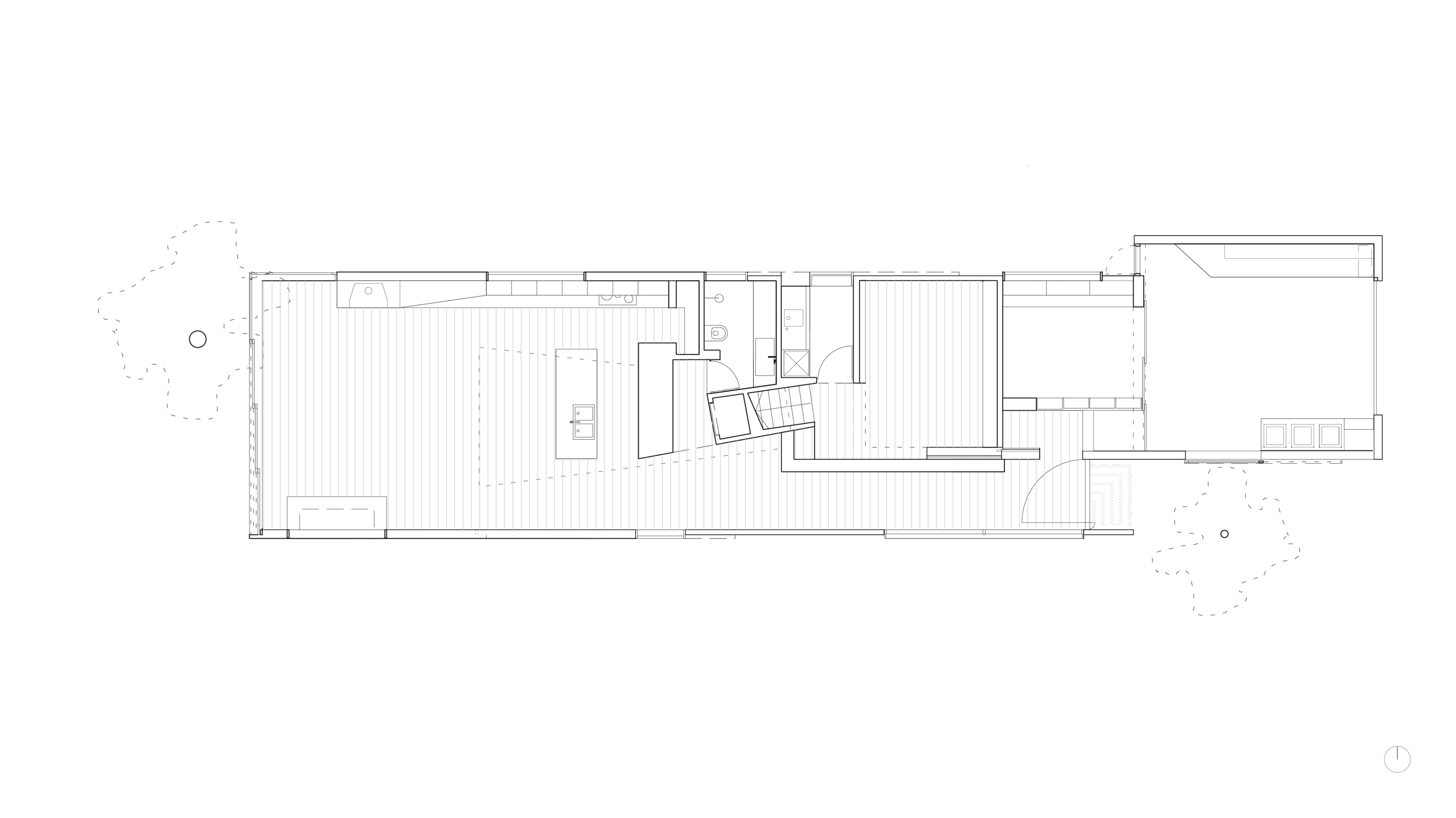 Our strategy was to accept the exterior envelope as a direct expression of the rectangular geometry of the site, but to use the elements of the interior to shift and re-orientate the spatial perception of the exterior linearity. Using the stair, a large skylight void, and a cluster of programs around these elements, the internal geometry has been orchestrated to orientate the house away from neighbours, and to create connections with the sky and the garden from both levels of the interior.