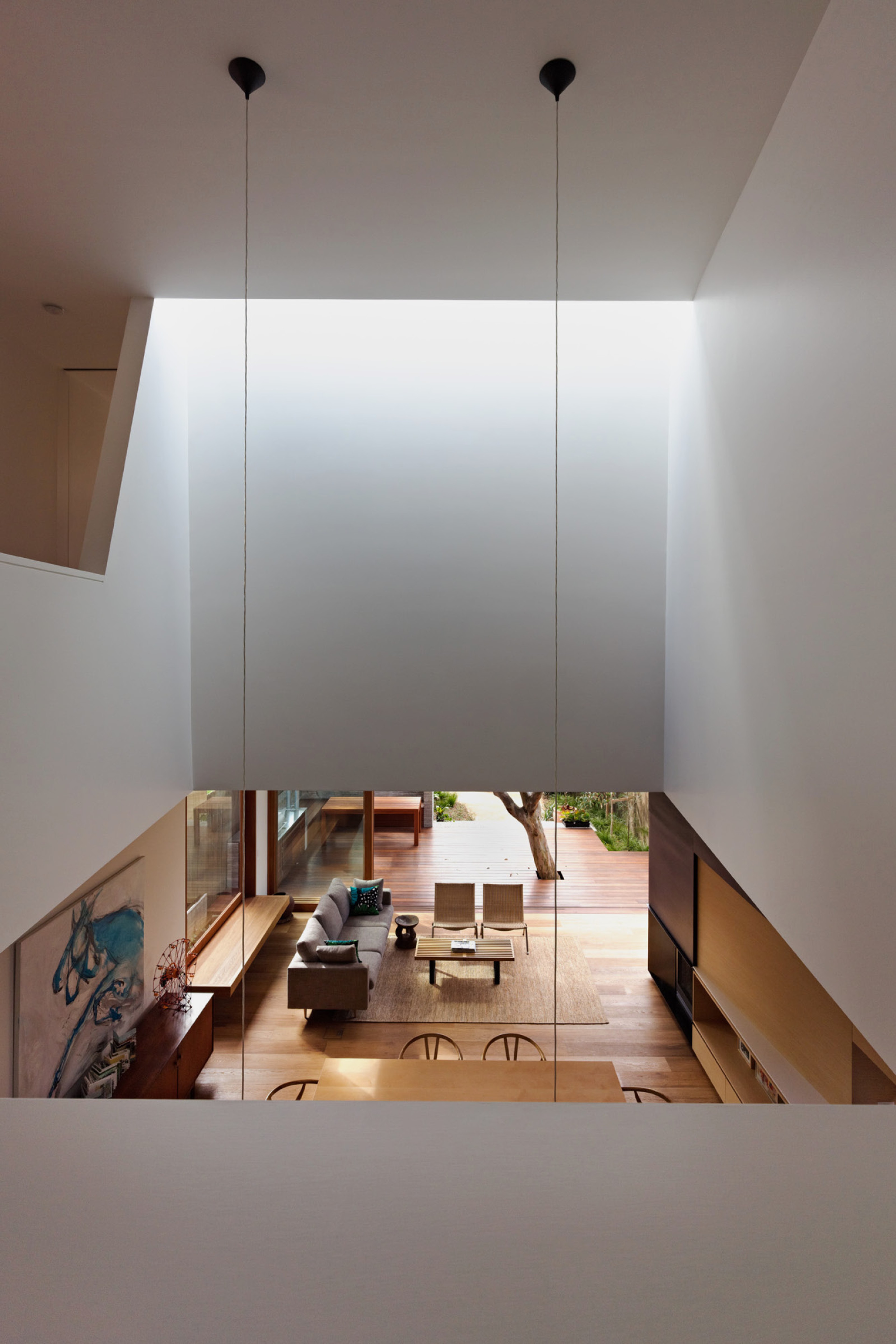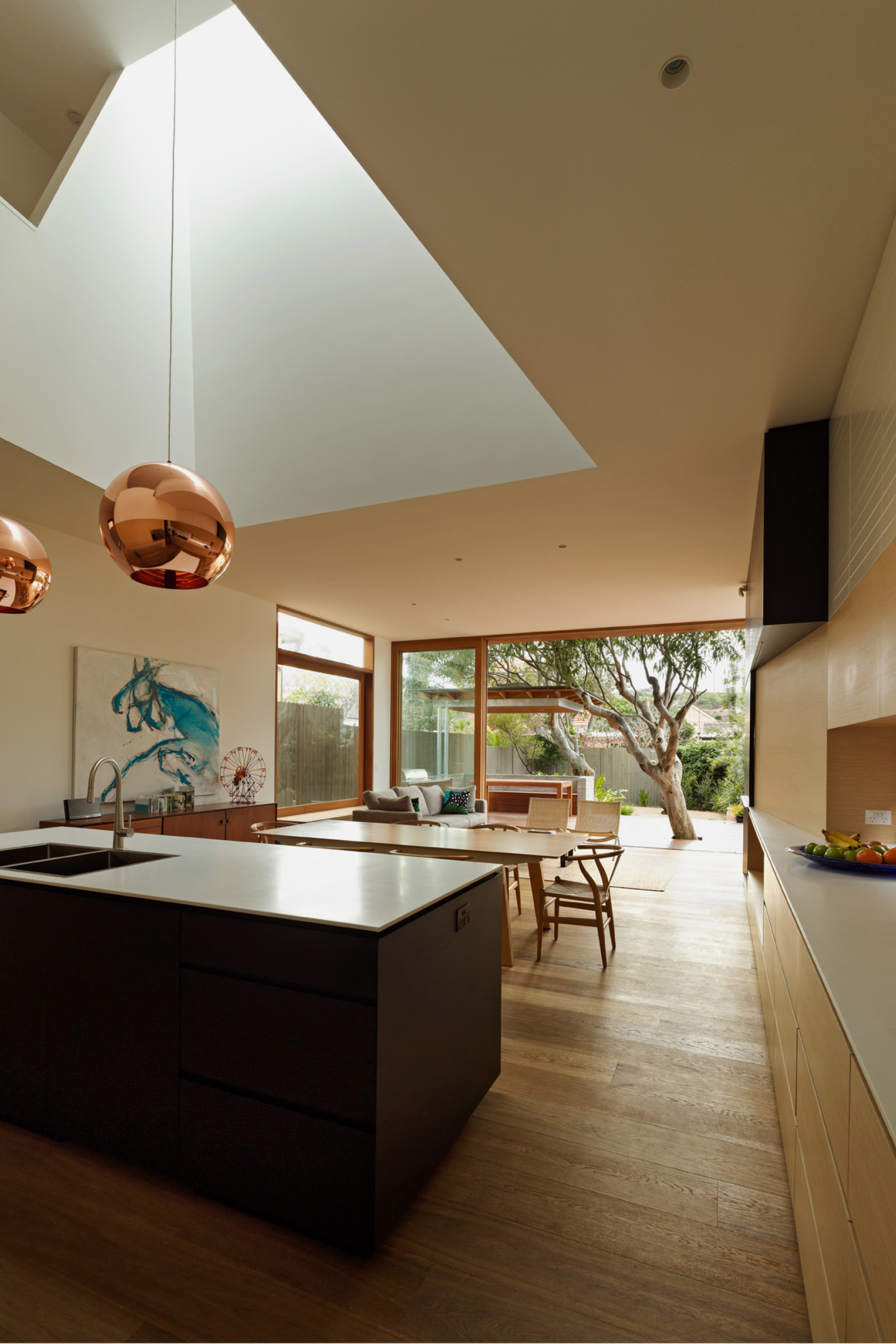 On the lower level the orientation of the stair, which begins as a sculptured platform that runs directly into the kids TV room, transforms the perception of a corridor on entering the house. The stair combines with the void over the kitchen and dining area to create connections to the sky and garden as the family move between the levels. On the upper level, the geometry of the void defines the alignment of the upper circulation, creating informal play spaces outside the children’s bedrooms, while creating sightlines between the upper circulation and the rear garden and trees.