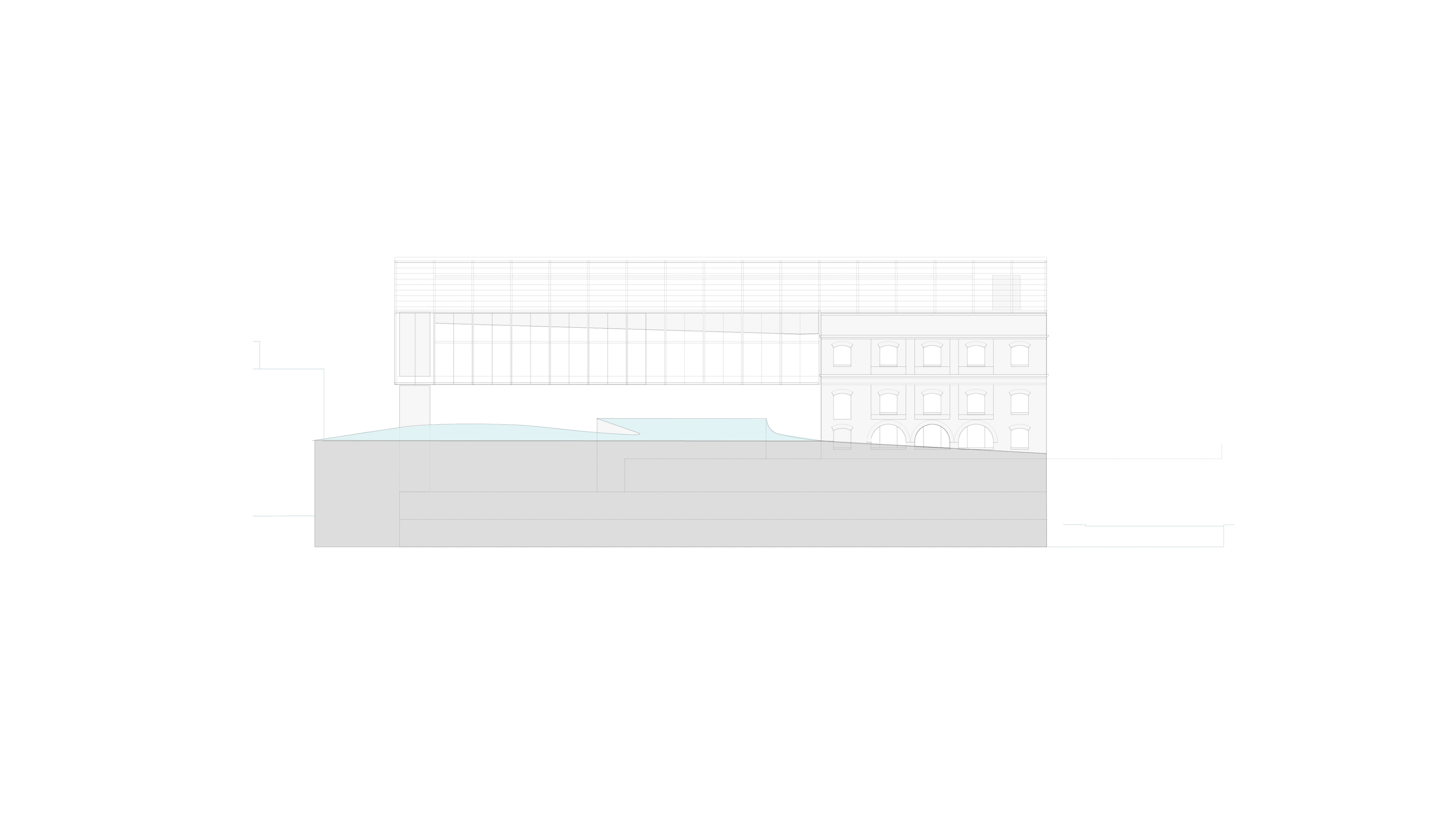Below the ground the pool created a carved landscape reminiscent of the sandstone harbour edge. At street level a clearing with an urban garden is proposed, framing Darling Harbour and the City beyond. Above the ground, the 50m pool occupies the privileged position of the car, floating on freeways above the City, positioning swimmers with a close proximity to the sky and the changing panorama of the western edge of the City.