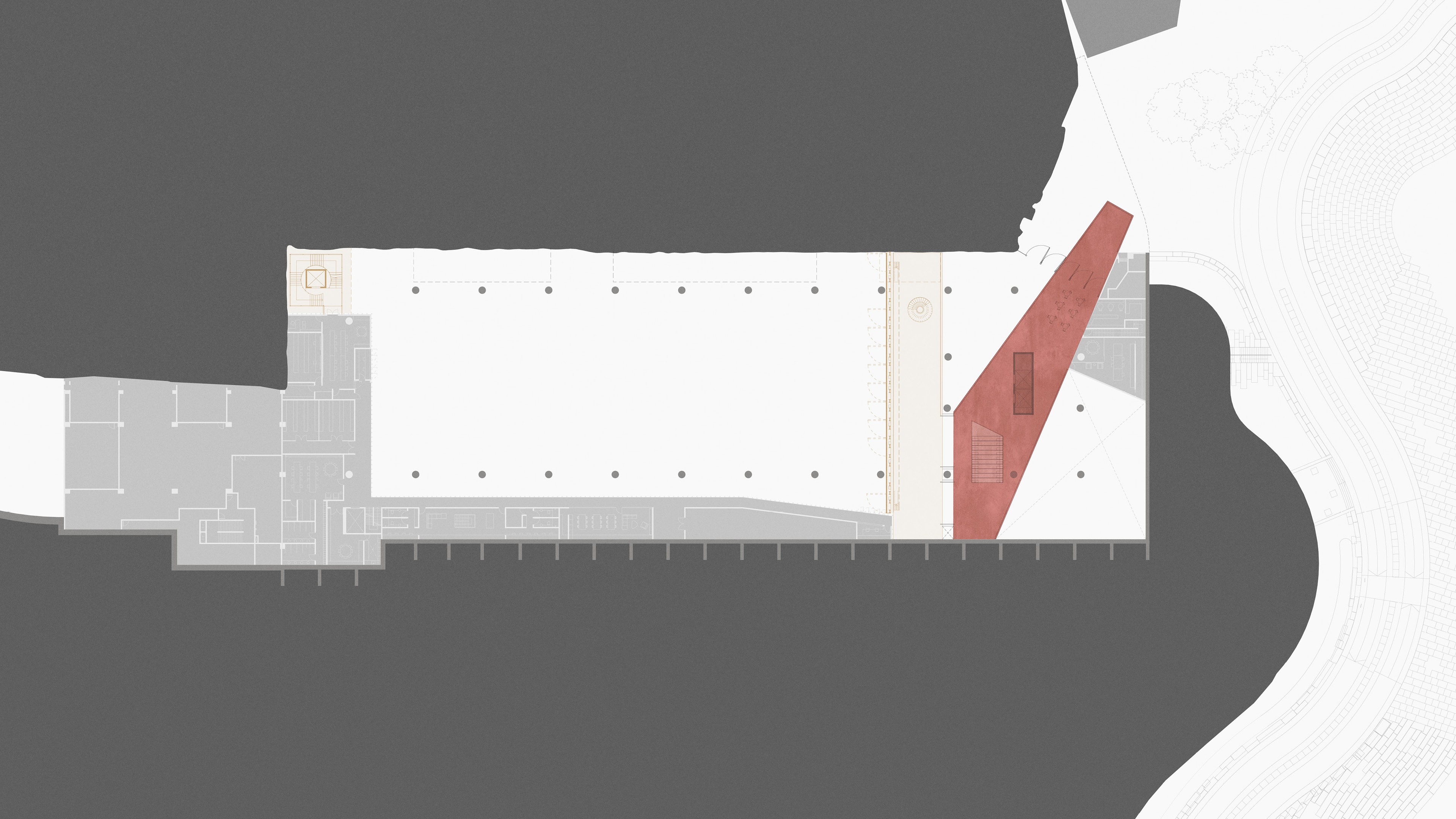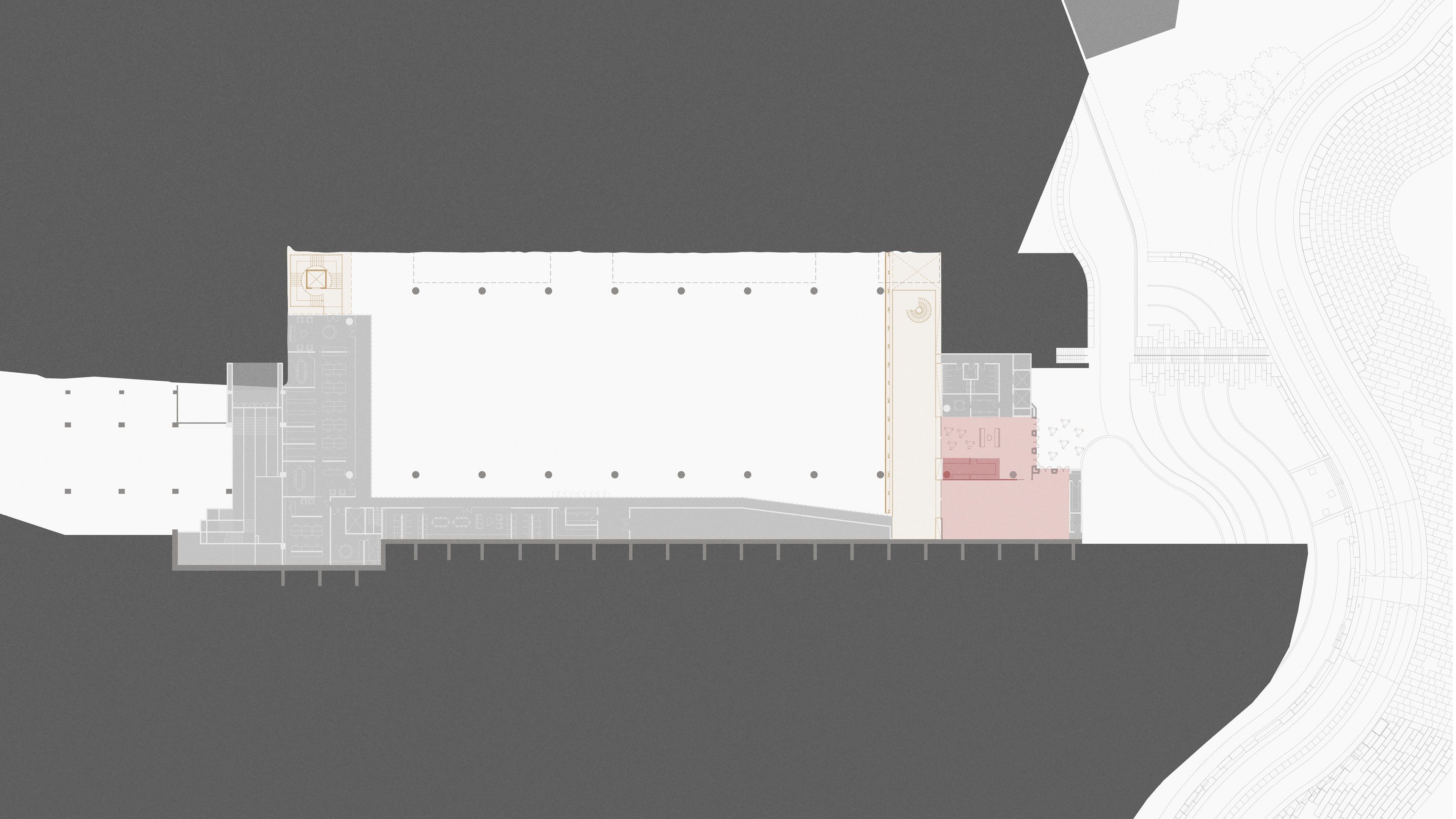 The two major design elements we proposed were a new plinth and adaptive scaffold. The plinth is conceived as a new topography that creates further opportunities for appropriation and performance, while providing a distinctive and legible entry experience. The reconfigured entry created by the plinth makes a new visual connection to Nawi Cove through an activated external terrace and café, reframing Nawi Cove while creating a subtle new identity for the Cutaway entry.