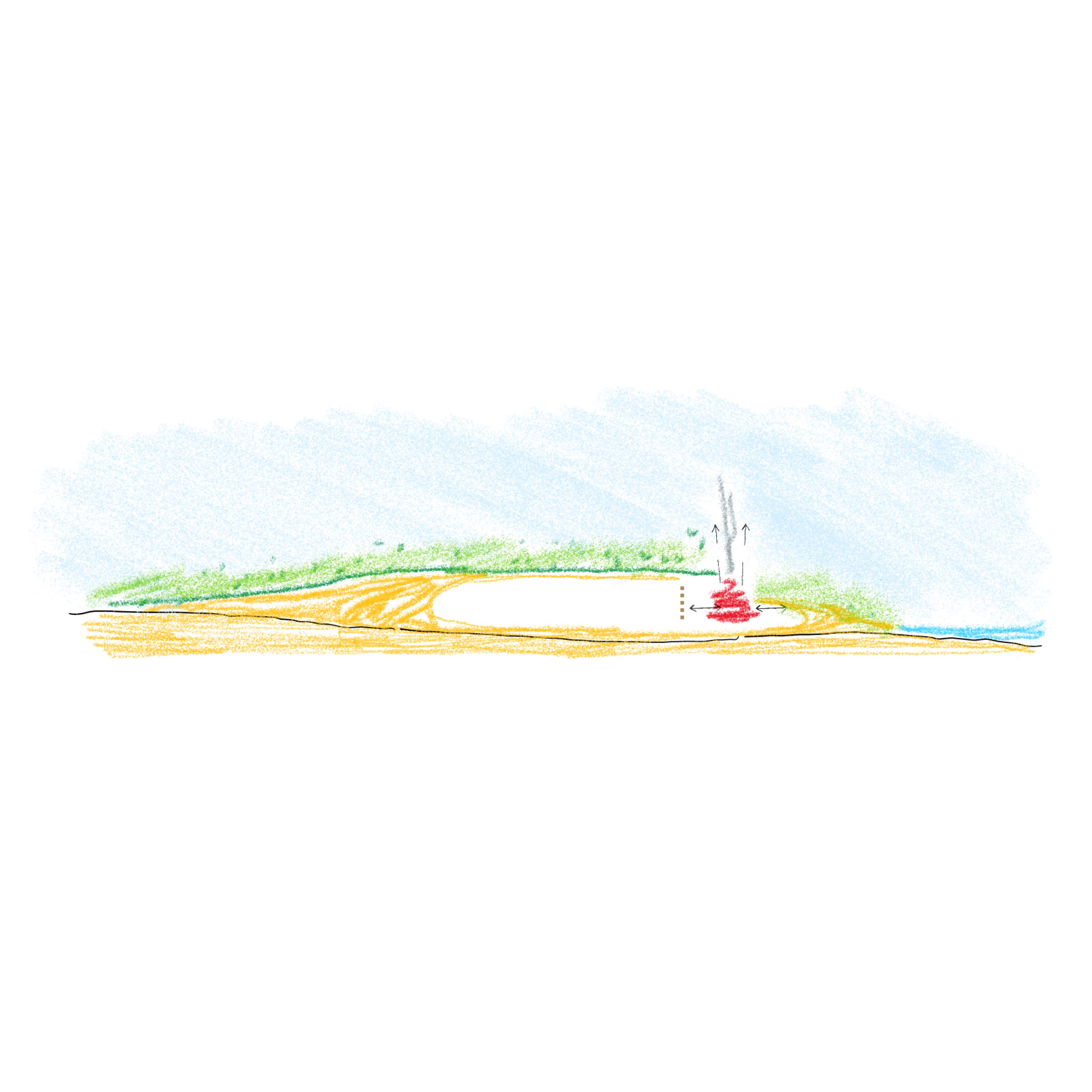 Our design introduces the phenomenon of fire as an element shaping this initial experience of the proposal – fire as interactive, enlivening and relational to the qualities of placemaking and gathering. Fire creates an in between space that facilitates interactions, cooking, cleansing, storytelling, obtaining warmth and clearing landscapes. Fire provides an embrace to welcome visitors and instigate new activities and interactions.