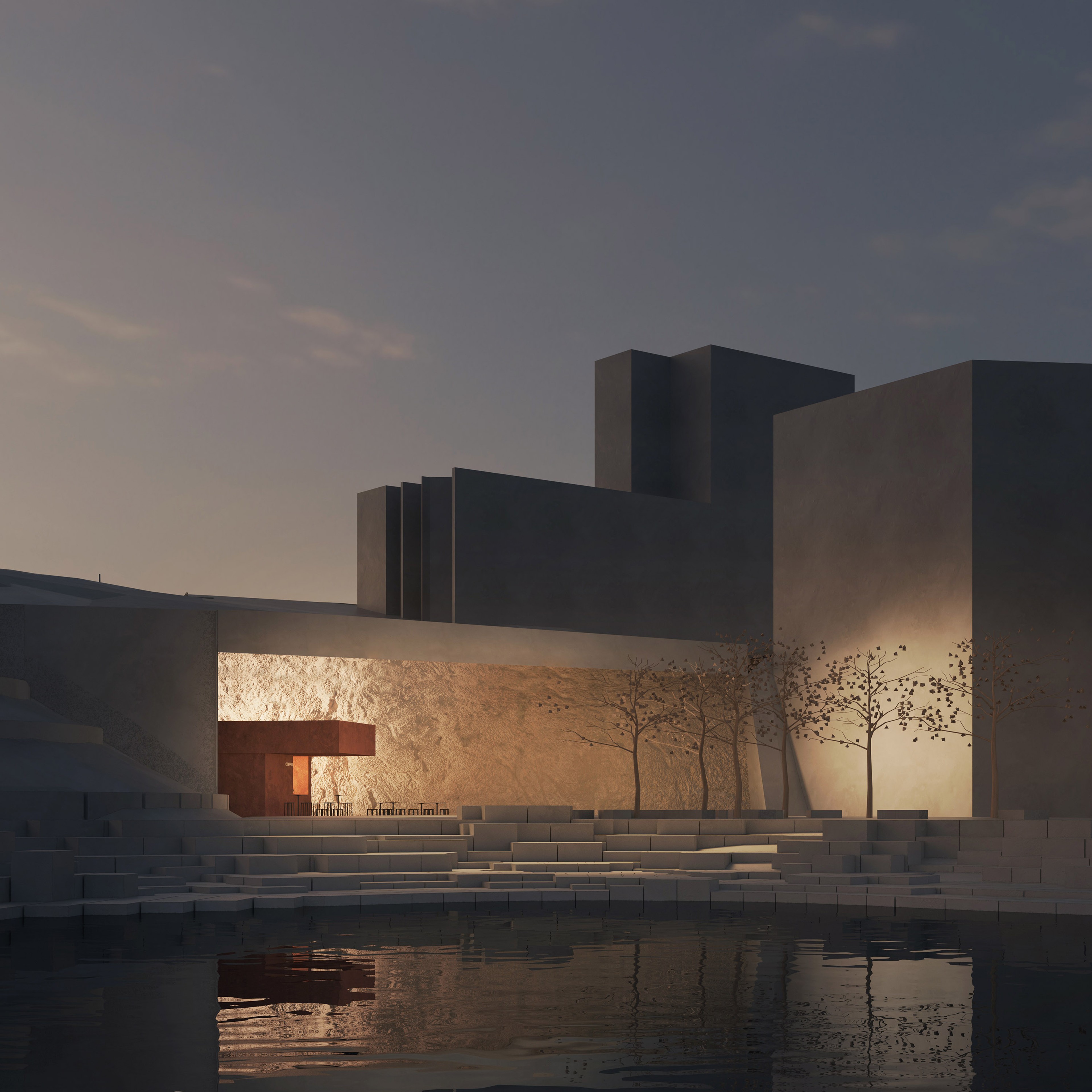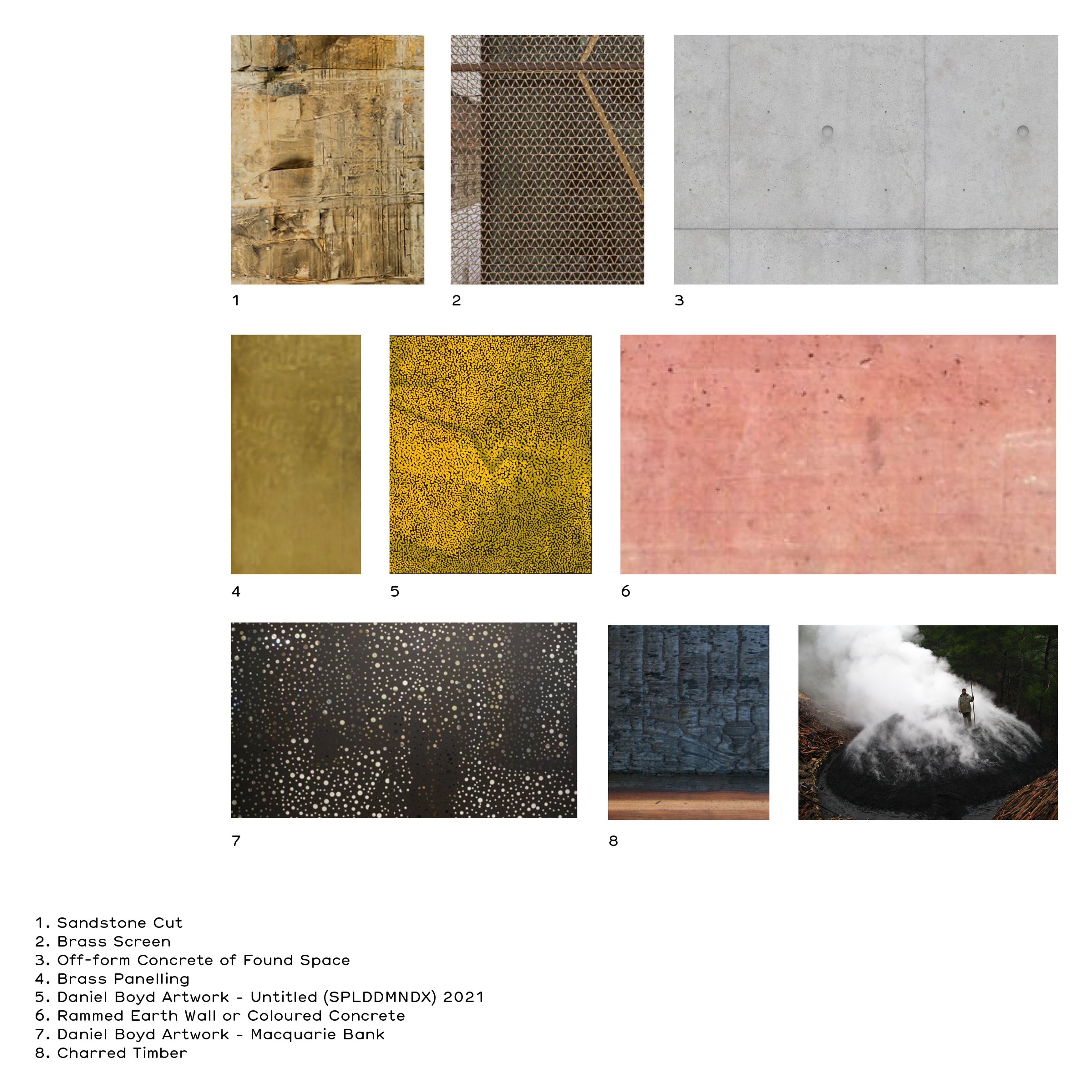 The material palette draws from the cavernous, elemental nature of the space – its concrete and sandstone – proposing the plinth in a red earth concrete, an engaging monolithic presence against concrete and sandstone.