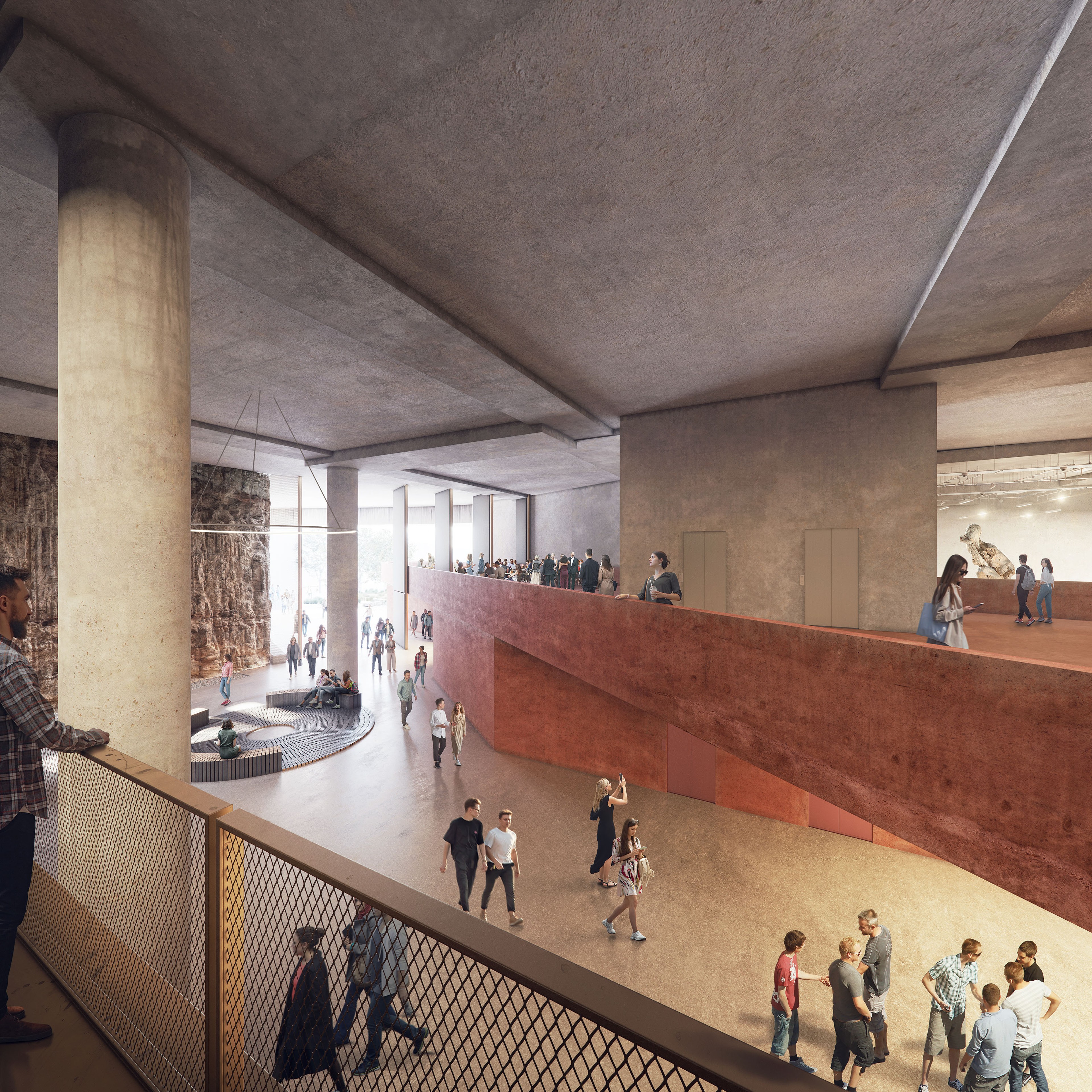 This strategy of connecting topographies creates the potential for the interior to connect and enrich three experiences of the city at different datums – the water level promenade of Nawi Cove and the main entry, with its impending activation through the new metro; the mid-level path that connects through to the Argyle cut with a new public room and gallery with a reframed view of the monumental cutaway interior (Waranara level); and the upper park level through the resolution of skylights and a new stair and lift connecting within the new park setting.