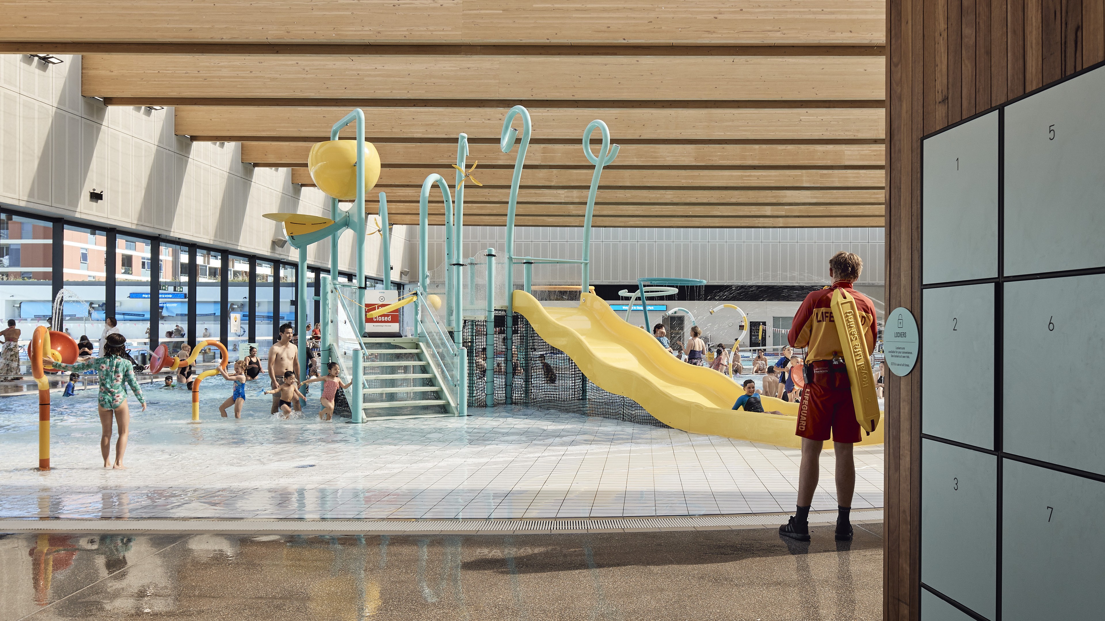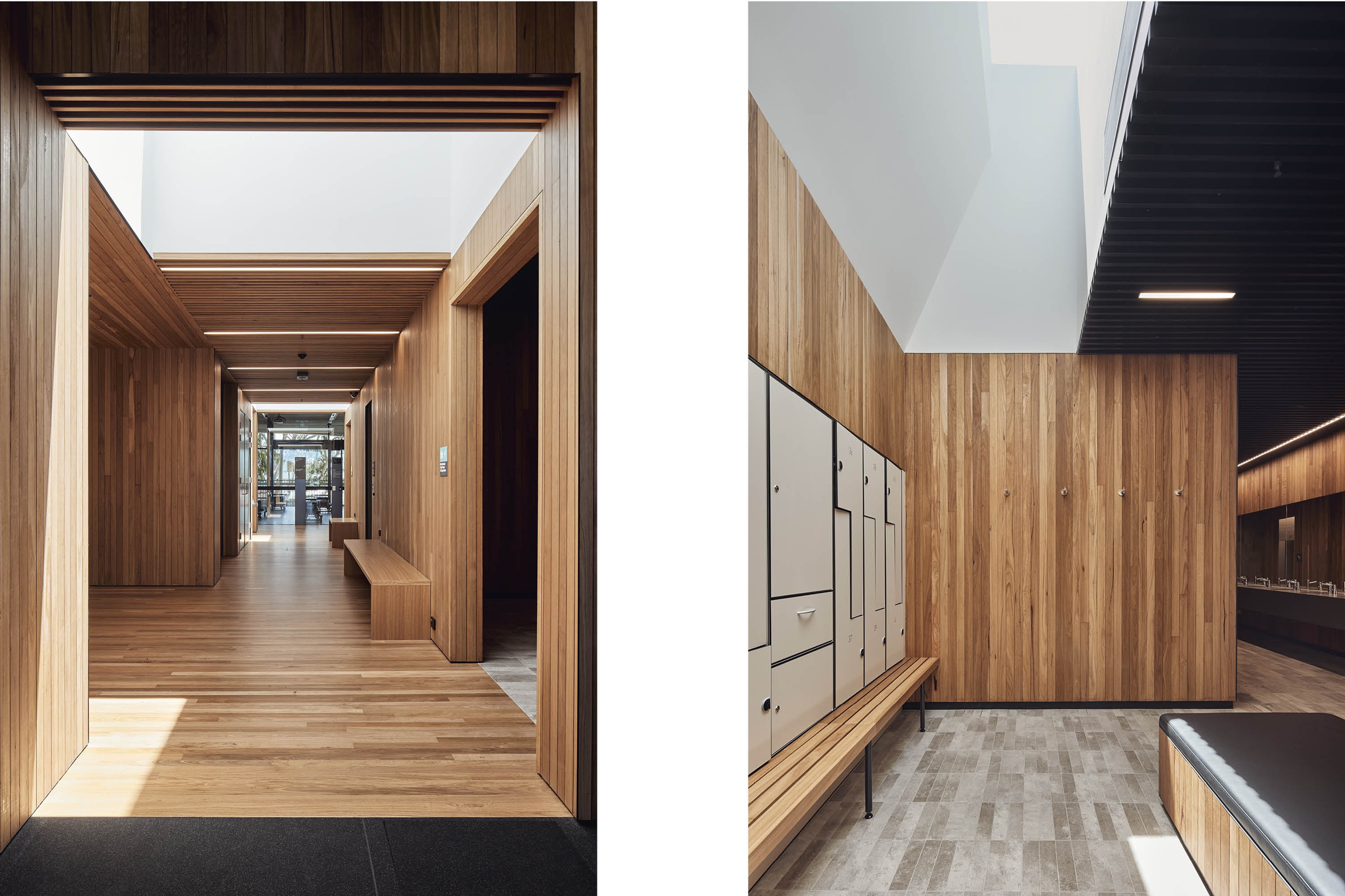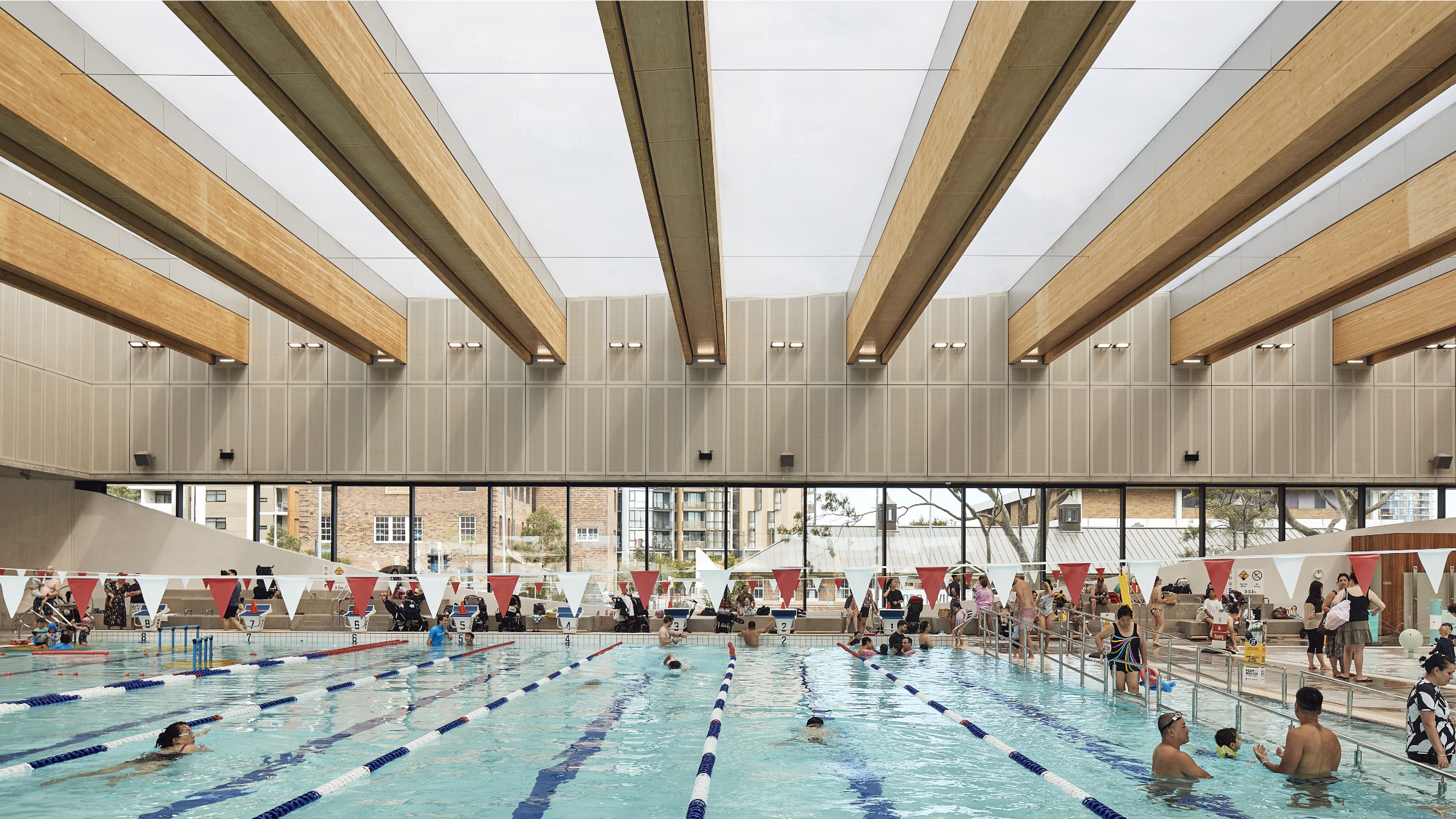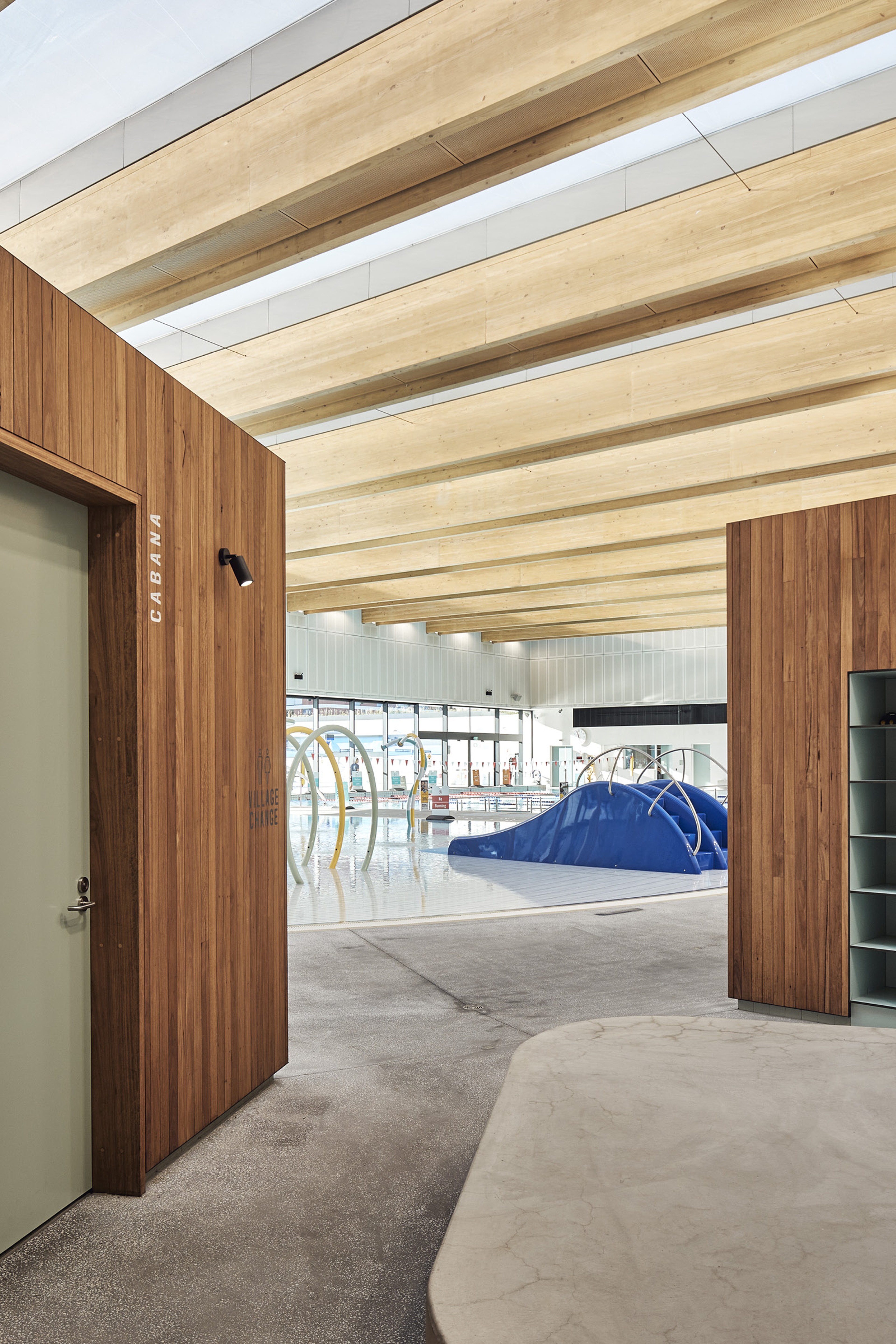 GPARC introduces a completely fresh material palette to the Aquatic Centre typology, including a mass timber structure with translucent ETFE pillows to create a warm and inviting interior pool hall filled withdaylight, playful references to beaches pools through the detailing and colour palette of the cabanas, and an emphasis oncommunity health and well being through the rich timber palette of the gym areas. The timber beams of the pool halls, put together in the 50m pool and craned into place over the two indoor pools, span 36m, the largest mass timber span in the Southern Hemisphere.