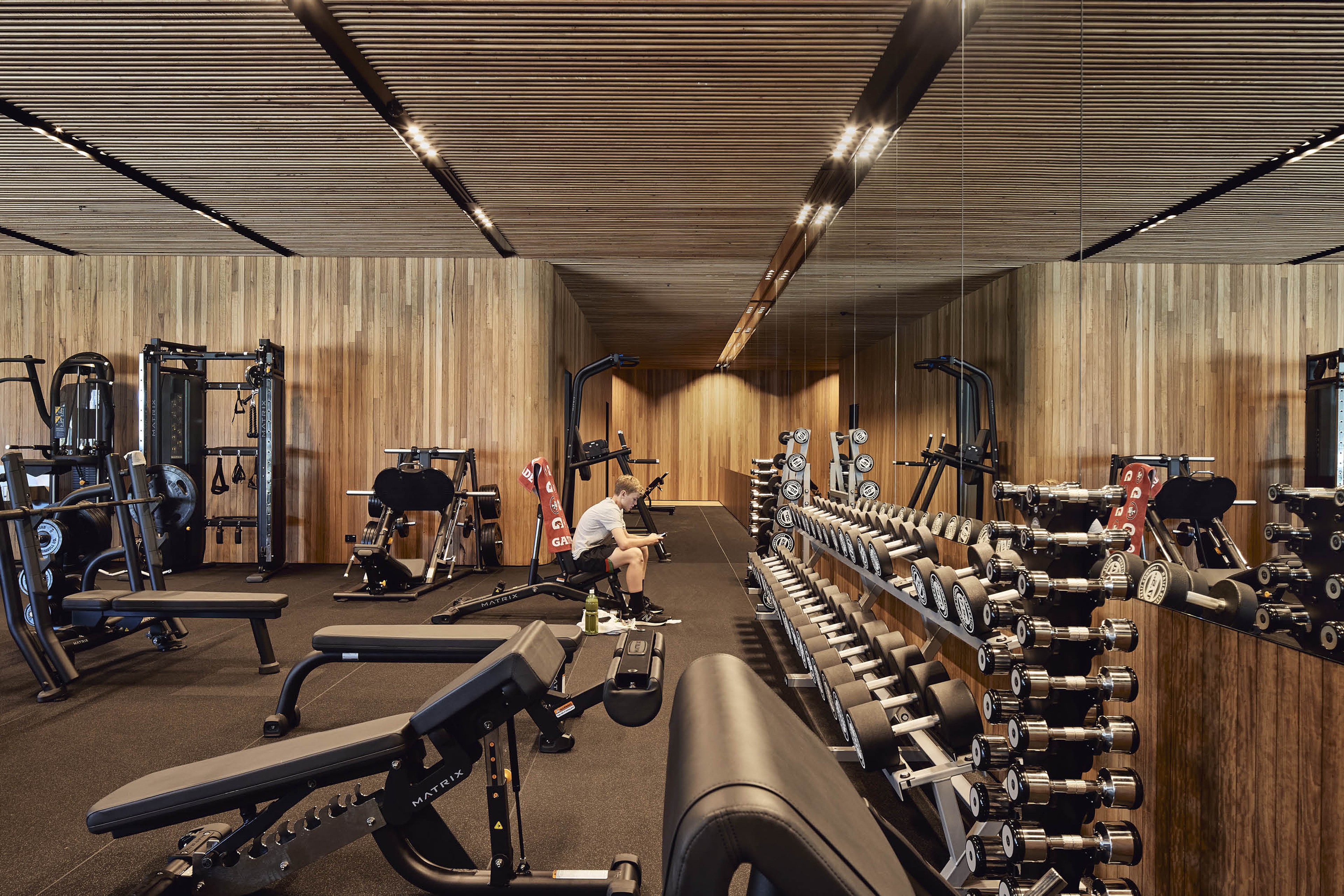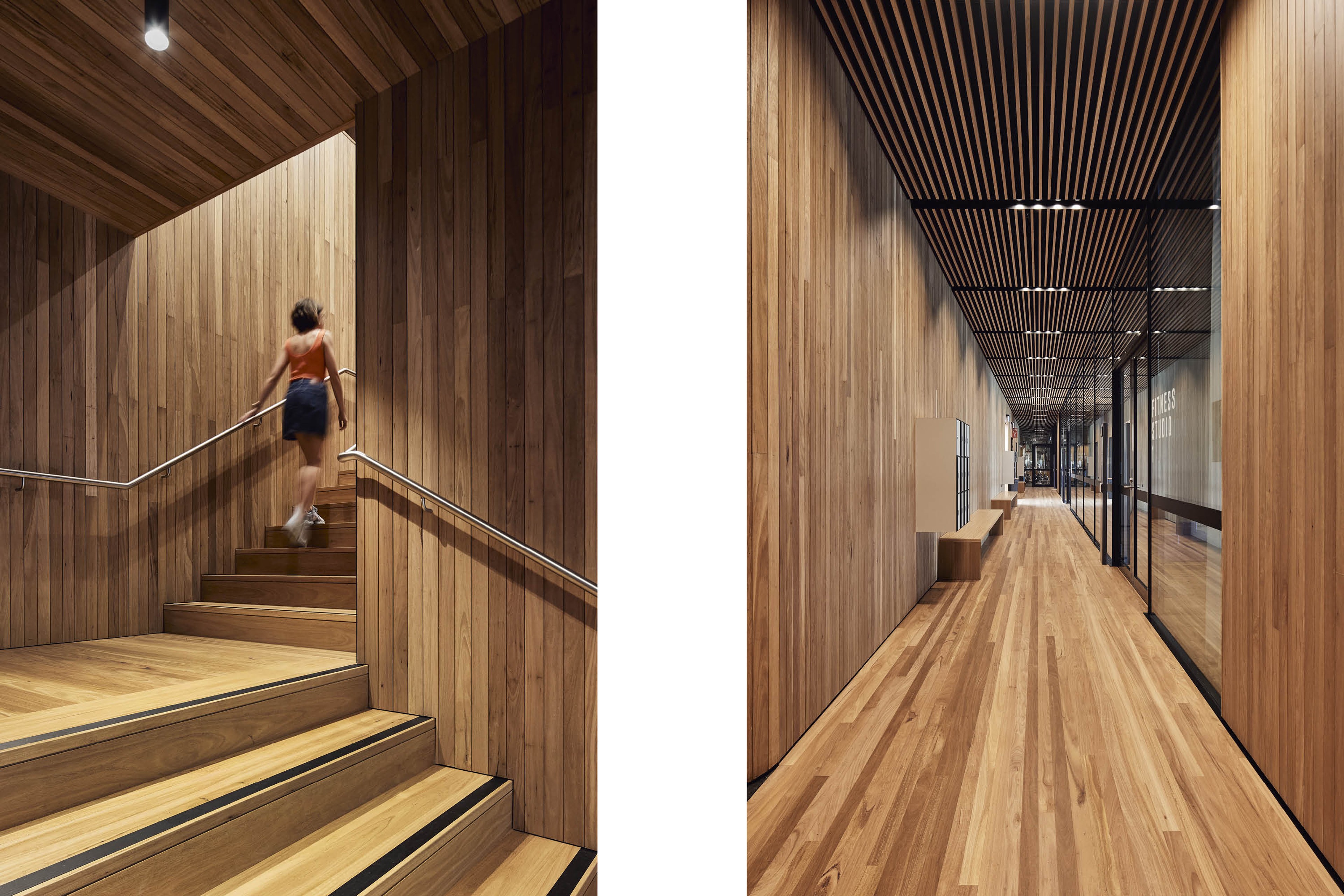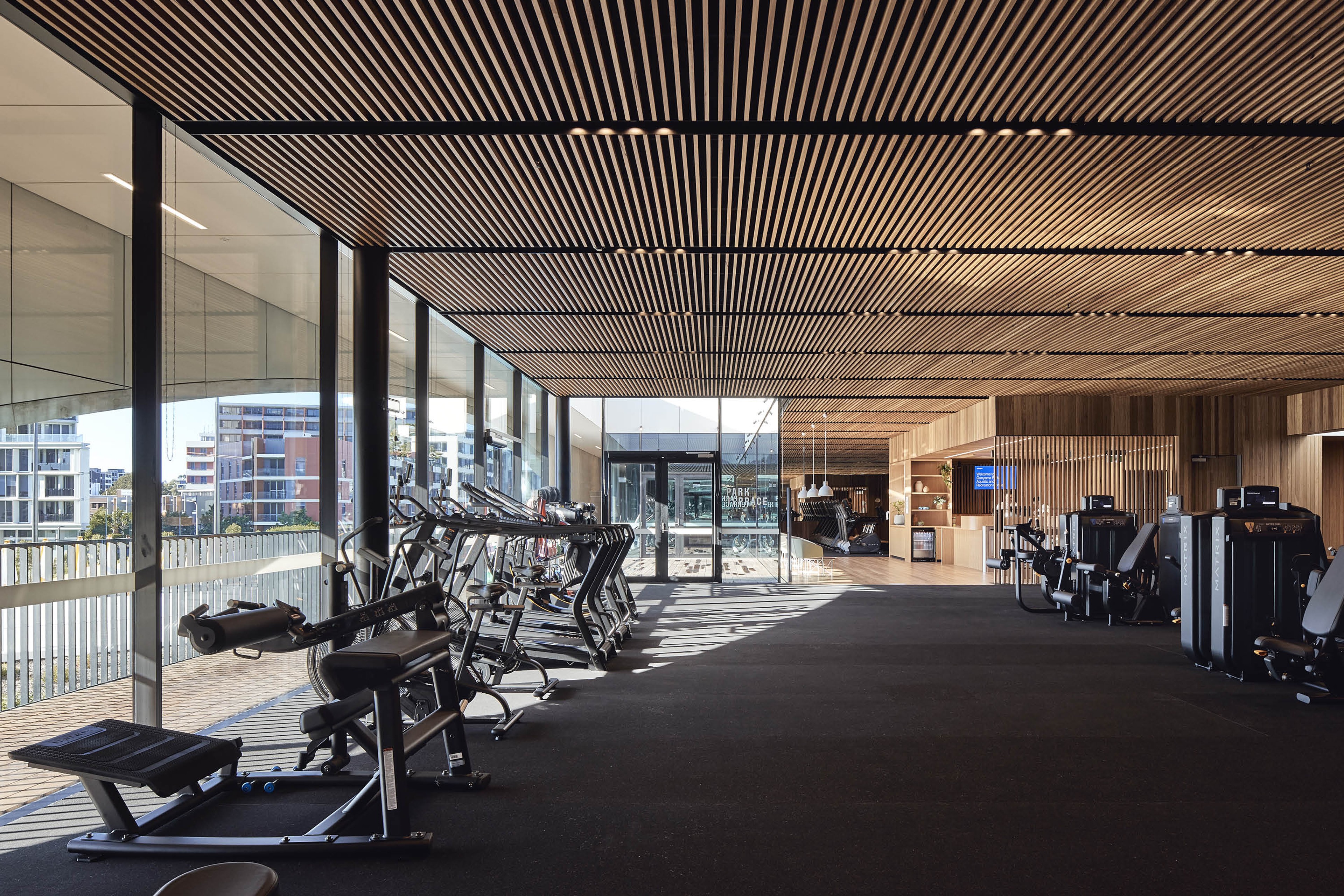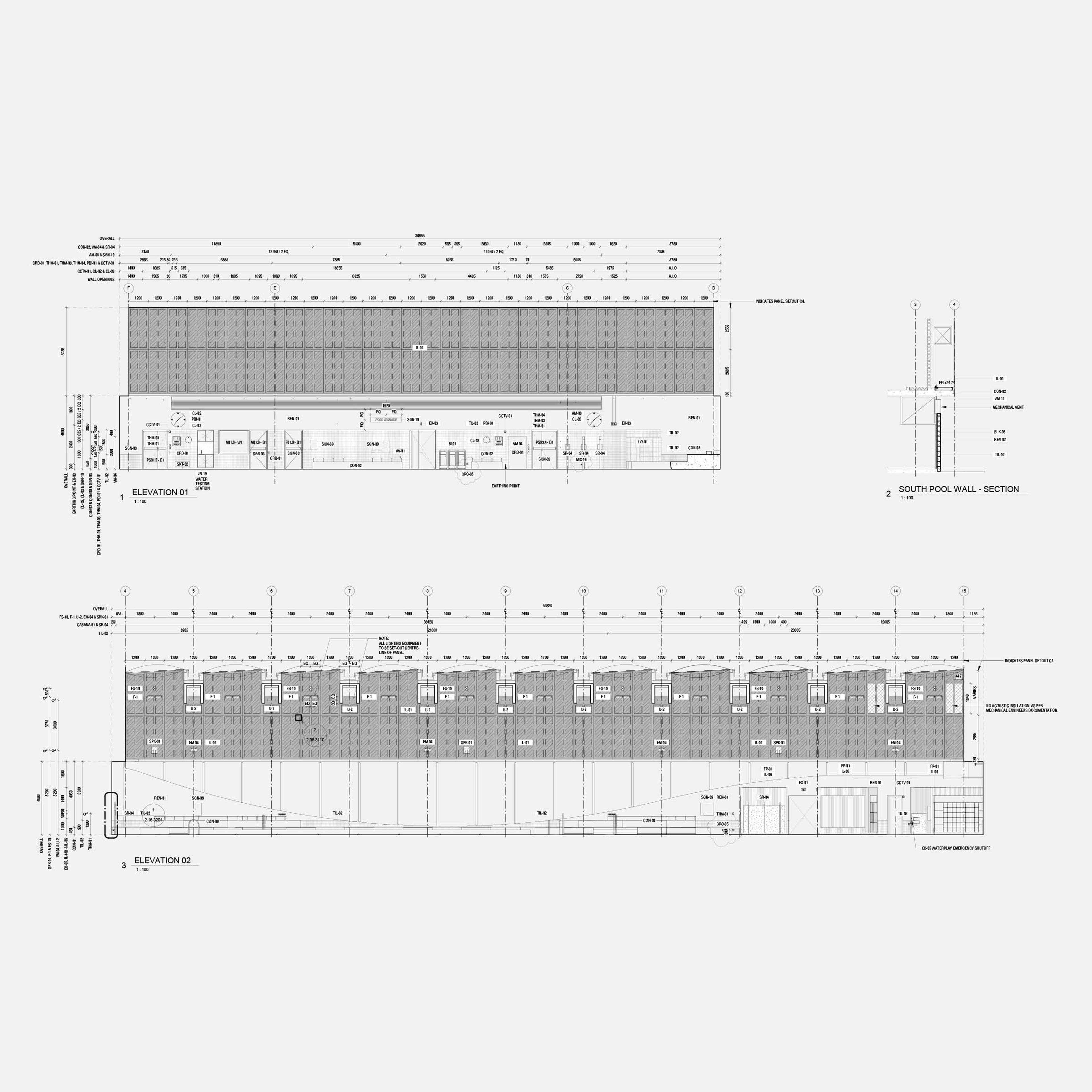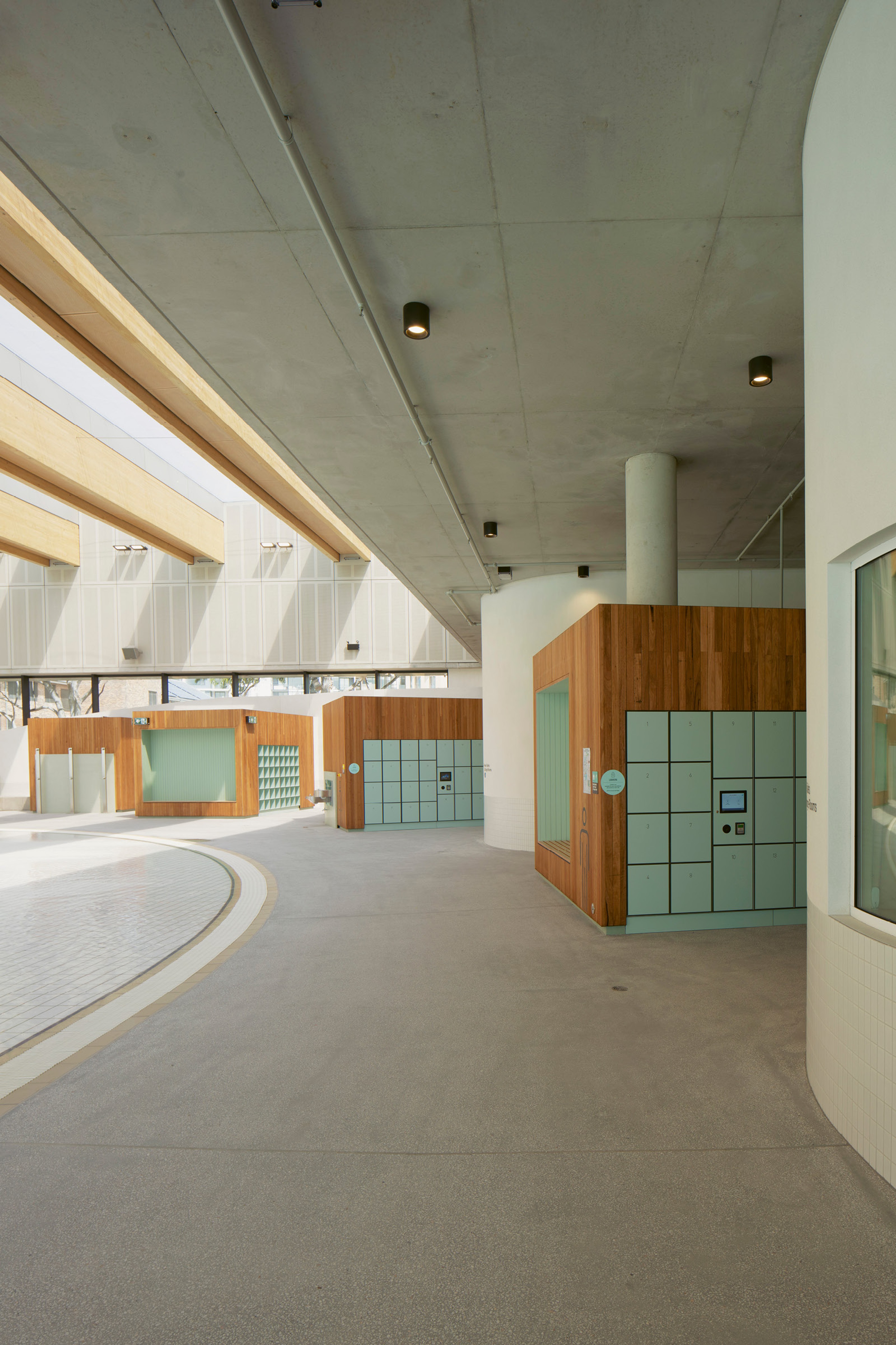 GPARC introduces a completely fresh material palette to the Aquatic Centre typology, including a mass timber structure with translucent ETFE pillows to create a warm and inviting interior pool hall filled withdaylight, playful references to beaches pools through the detailing and colour palette of the cabanas, and an emphasis oncommunity health and well being through the rich timber palette of the gym areas. The timber beams of the pool halls, put together in the 50m pool and craned into place over the two indoor pools, span 36m, the largest mass timber span in the Southern Hemisphere.