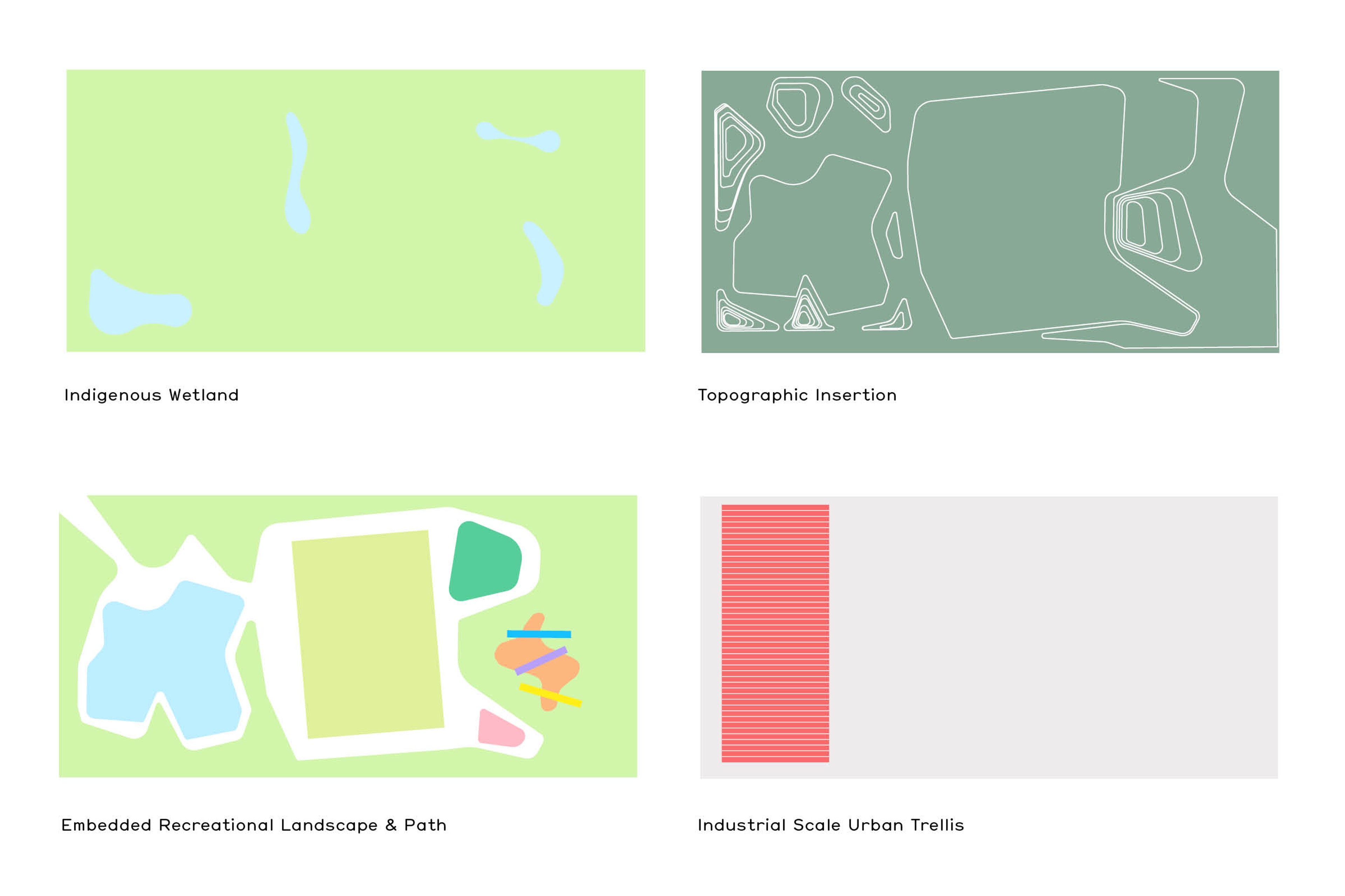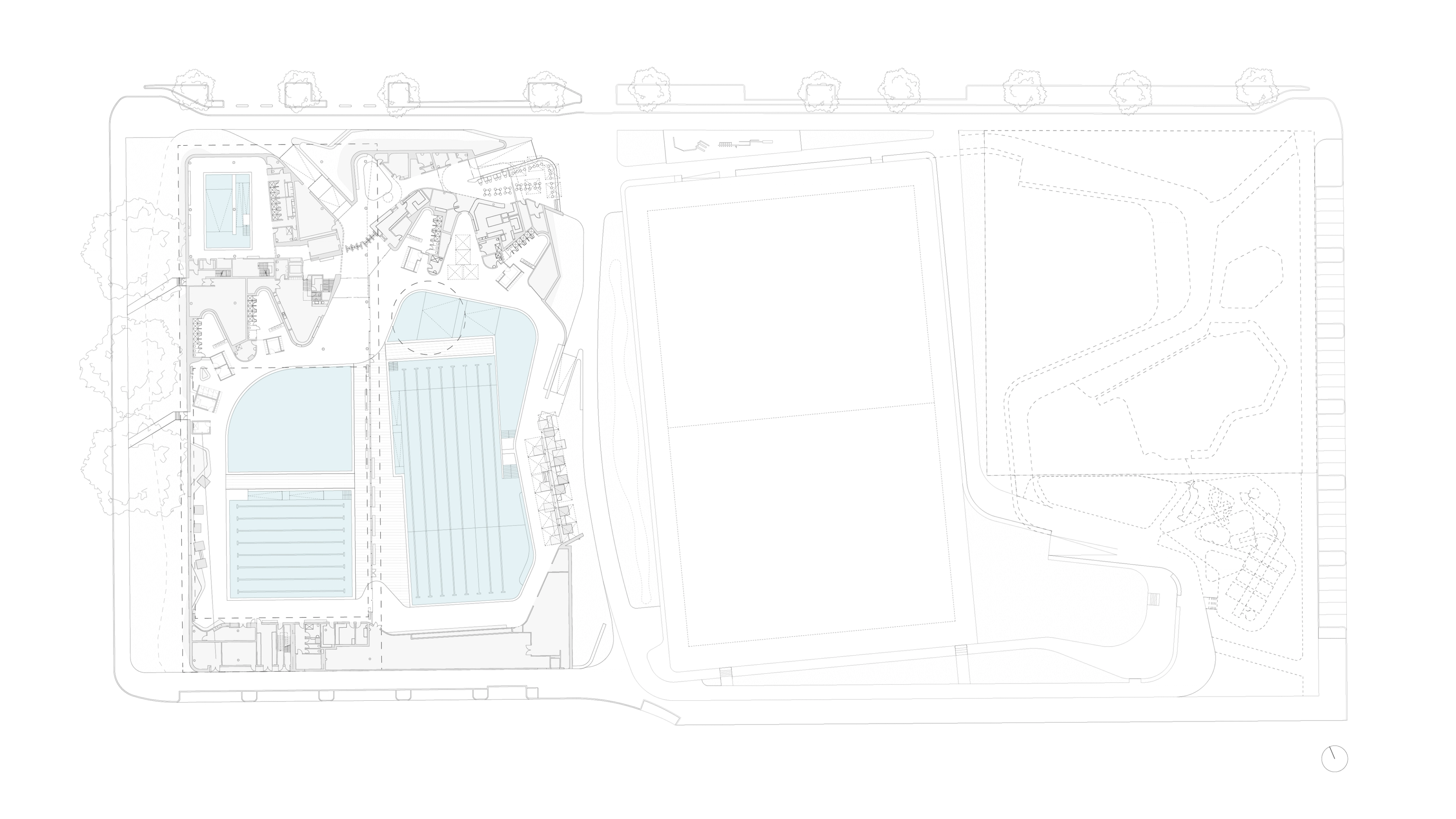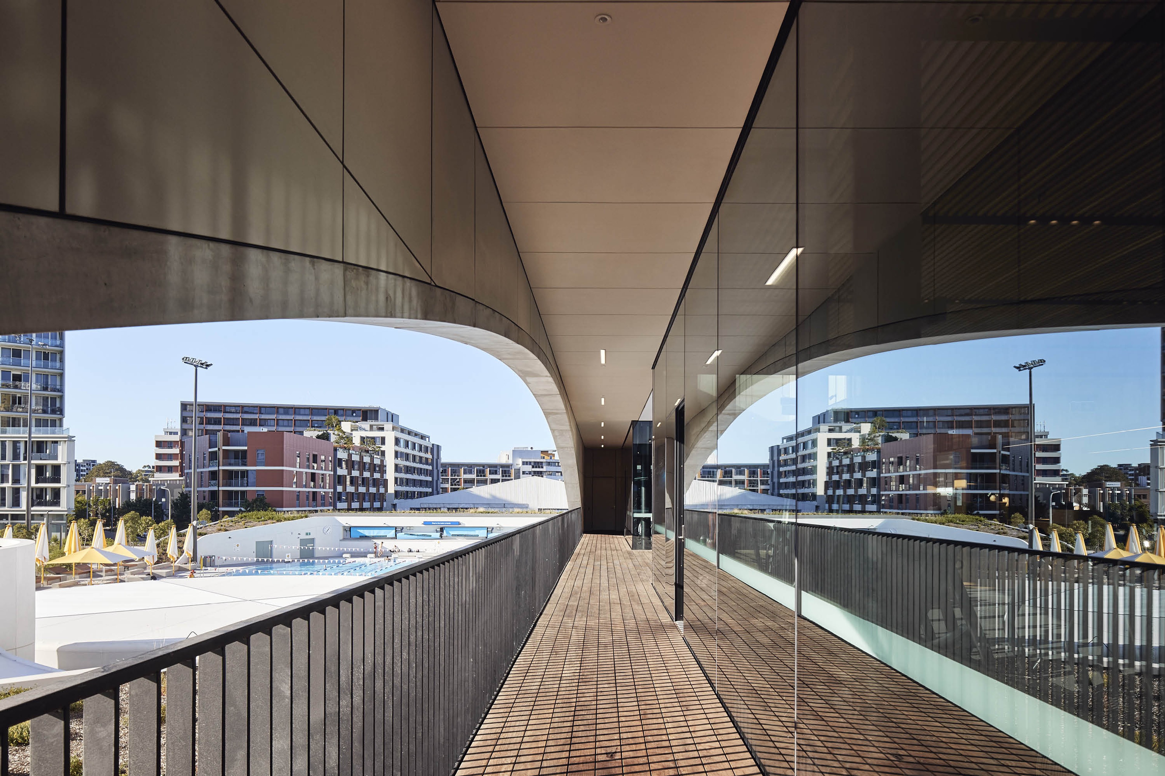 The site was re-imagined as a continuous wetland landscape of the original Botany Swamp, with a series of pool and recreational landscapes embedded through topographic insertions into the wetland landscape, creating a continuous park footprint across the whole site. The enclosure of the Aquatic Centre was created by an industrial scale urban trellis floating over this park landscape – a remnant large span roof reminiscent of the structures of the area prior to its contemporary transformation in the face of industrial obsolescence.