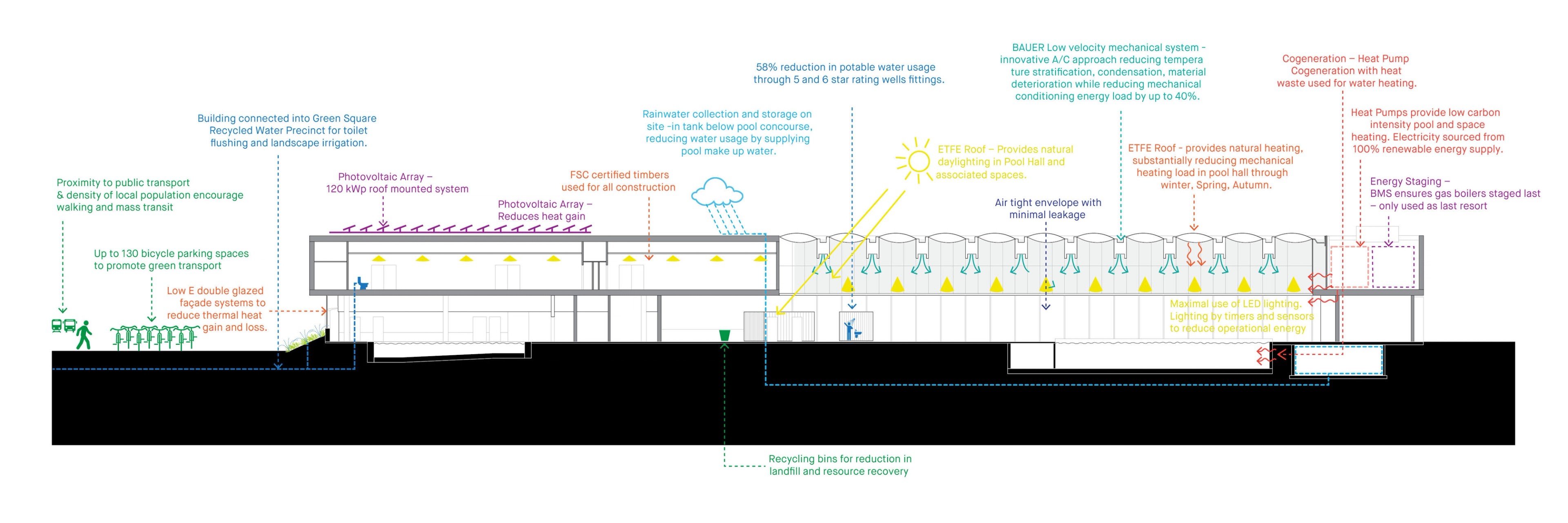 GPARC achieves a 5 Star Green Star Design and As Built rating from the Green Building Council of Australia – the highest Aquatic Centre in Australia to achieve this rating. Sustainability initiatives include: a 150kw Photovoltaic array of 420 panels providing a local renewable energy source for the building, a 200-260kw Cogeneration unit with heat waste used for water heating, heat pumps providing a low carbon intensity pool and space heating, electricity sourced from 100% renewable energy suppliers. An innovative ETFE roof providing natural daylighting in the pool hall, while creating a natural source of heating that reduces the mechanical heating load in the pool hall, an innovative Bauer low velocity mechanical system reducing temperature stratification, condensation, and material deterioration while reducing mechanical conditioning energy loads, an air tight building envelope with high performance double glazed IGU’s, rainwater collection and storage on site used for pool make upwater.