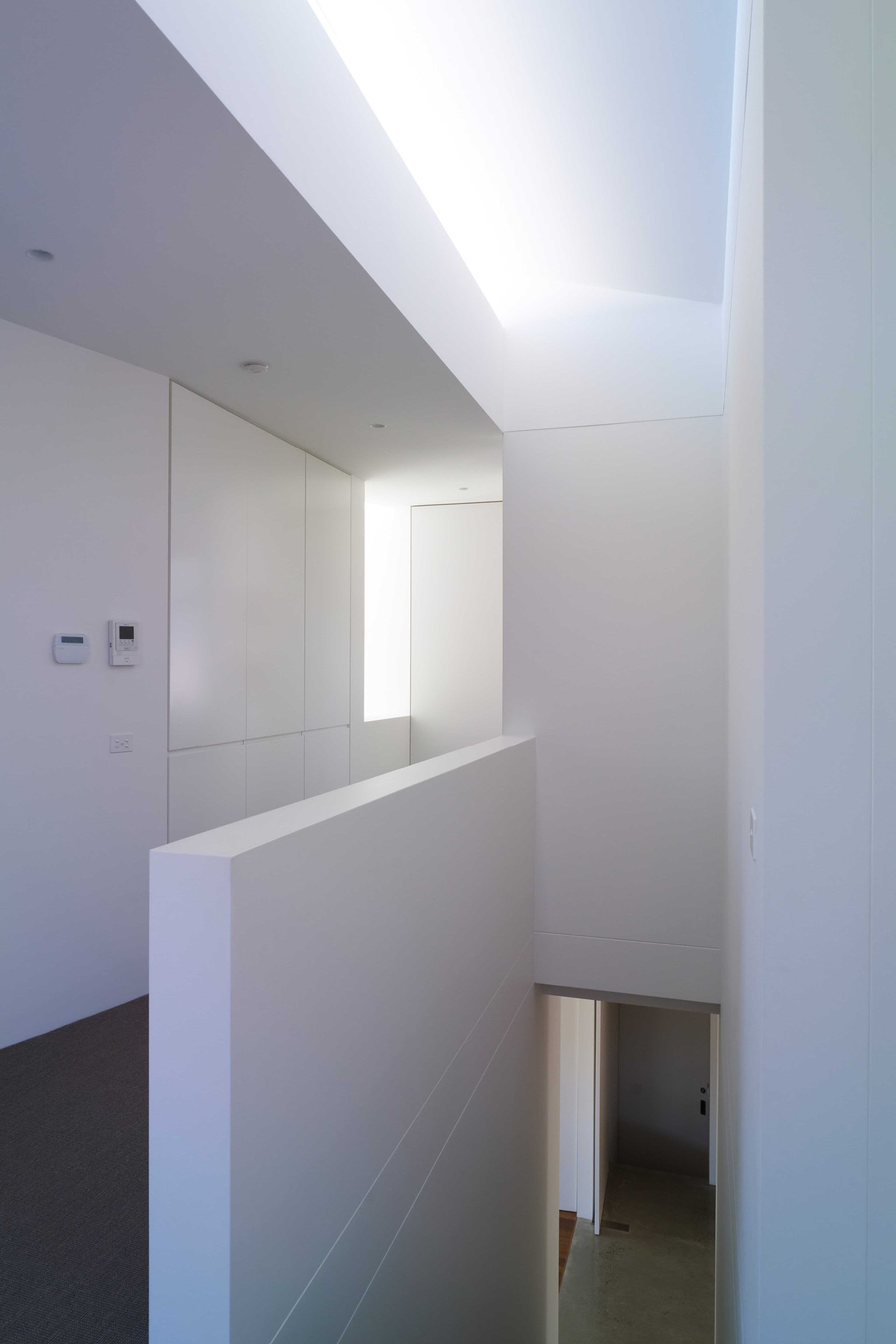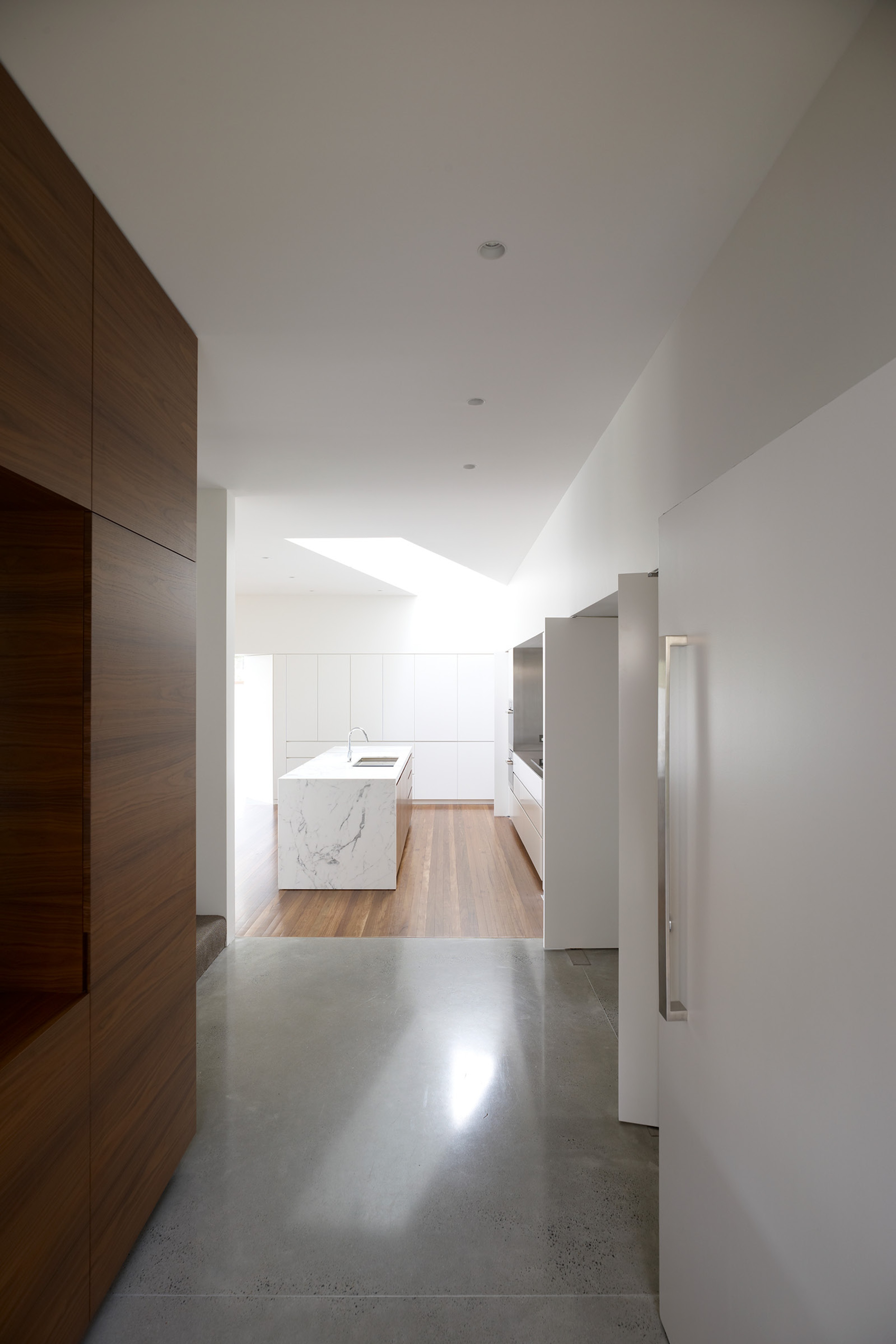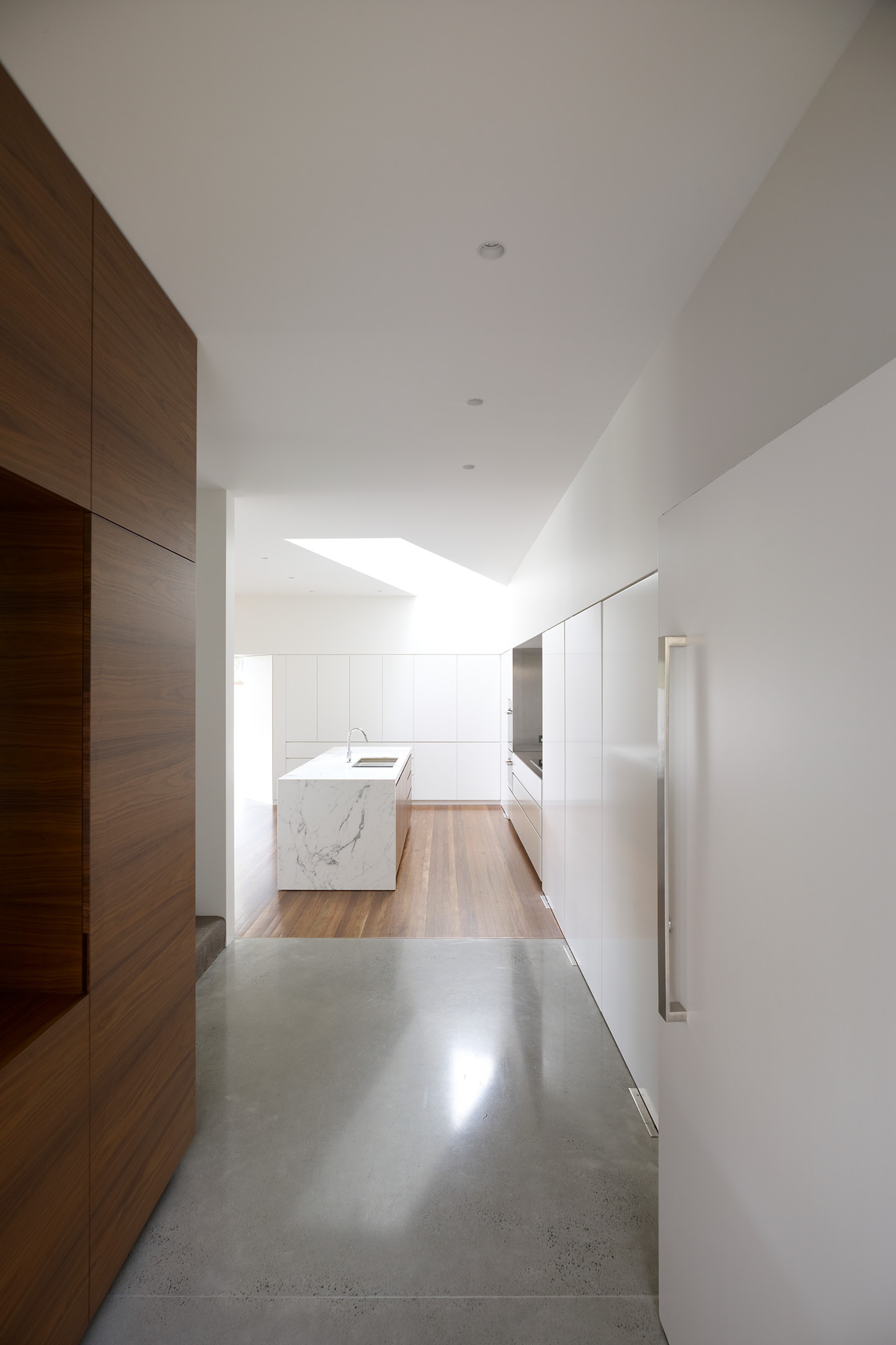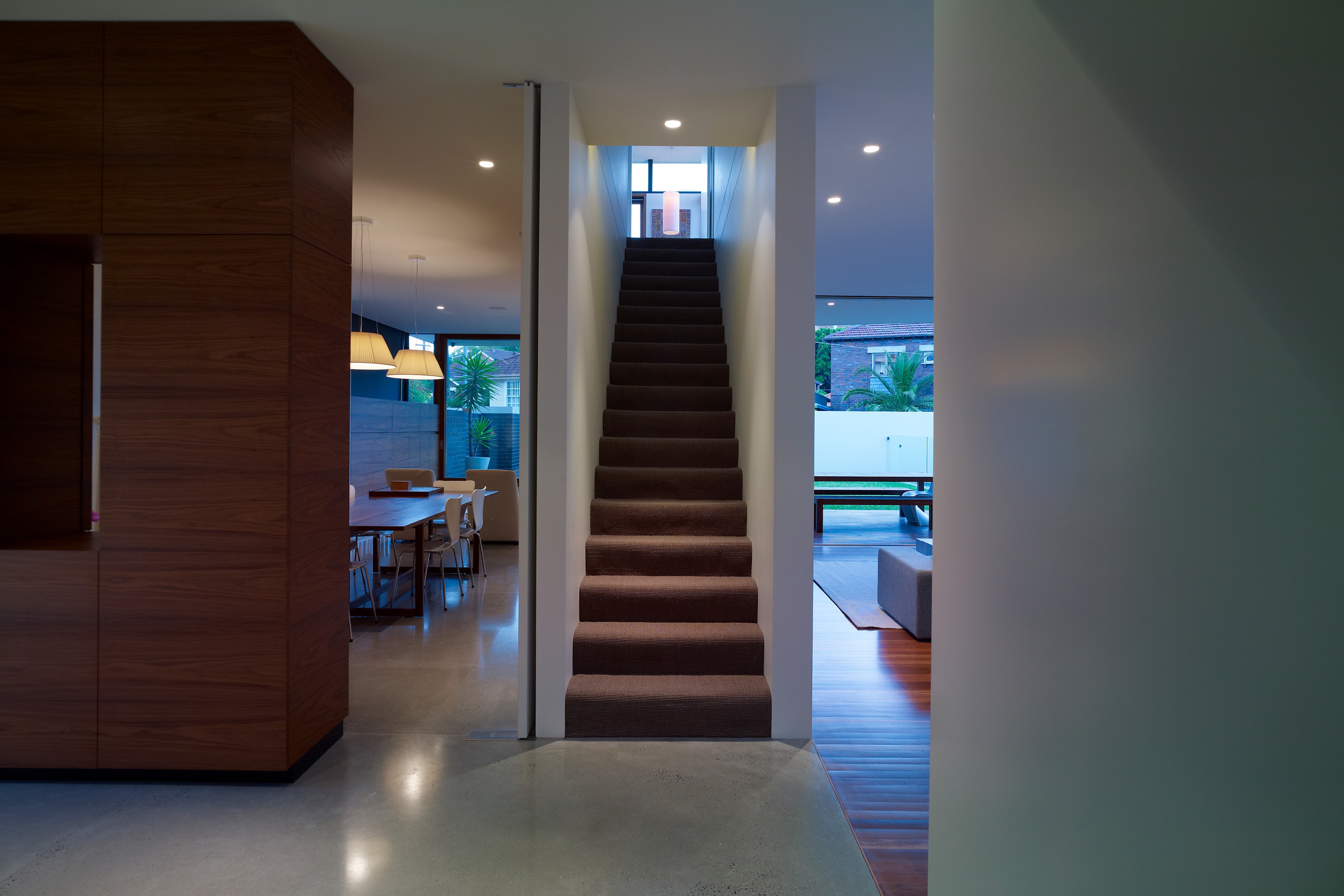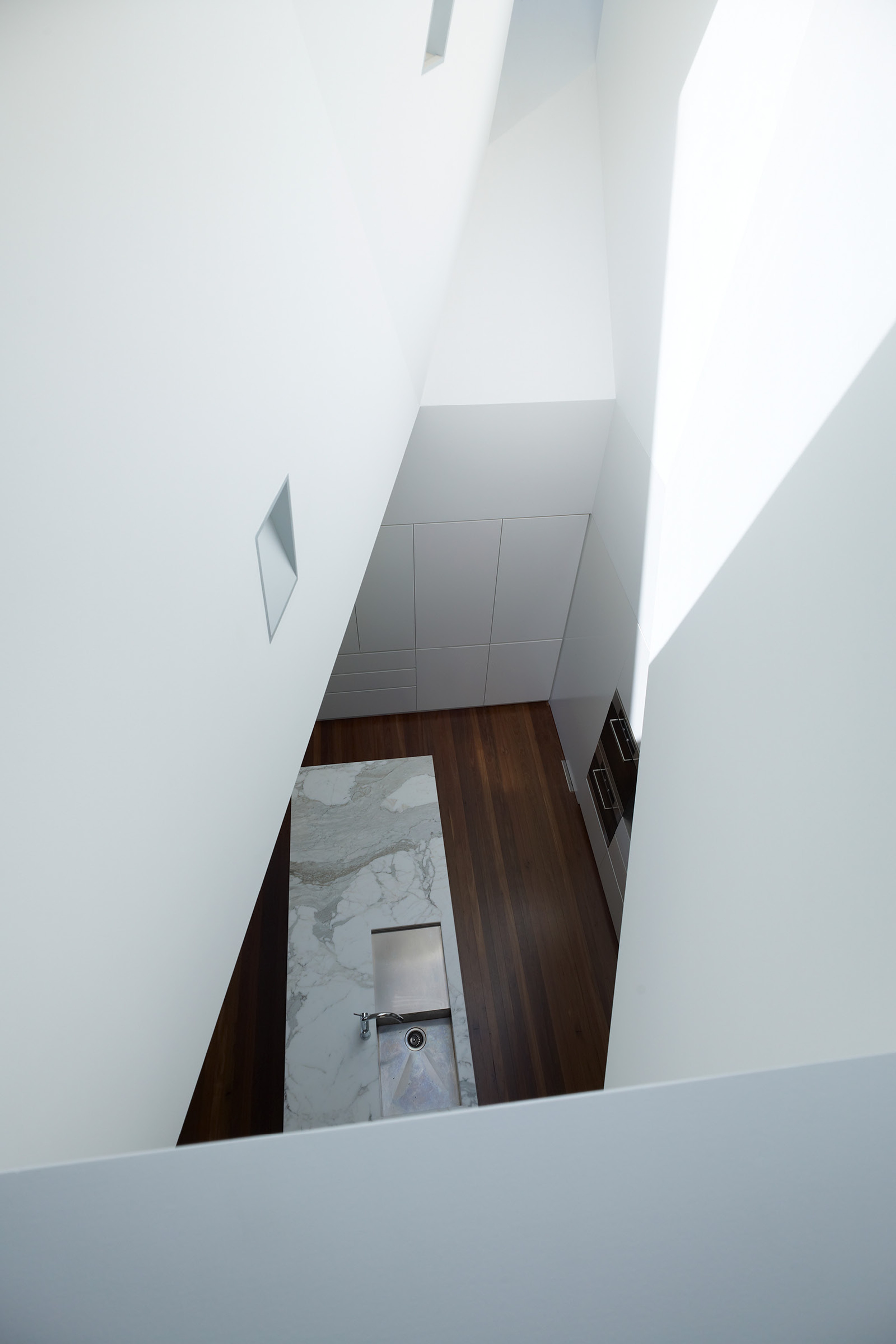 Within the complex geometry of the site we gave each floor plan a different layout according to its position in relation to the datum of the boundary fence – for the more private ground floor we created orthogonal rooms orientated to the sun and the garden. For the upper level the geometry shifts to increase privacy and capture views across the suburban landscape and to the ocean beyond.