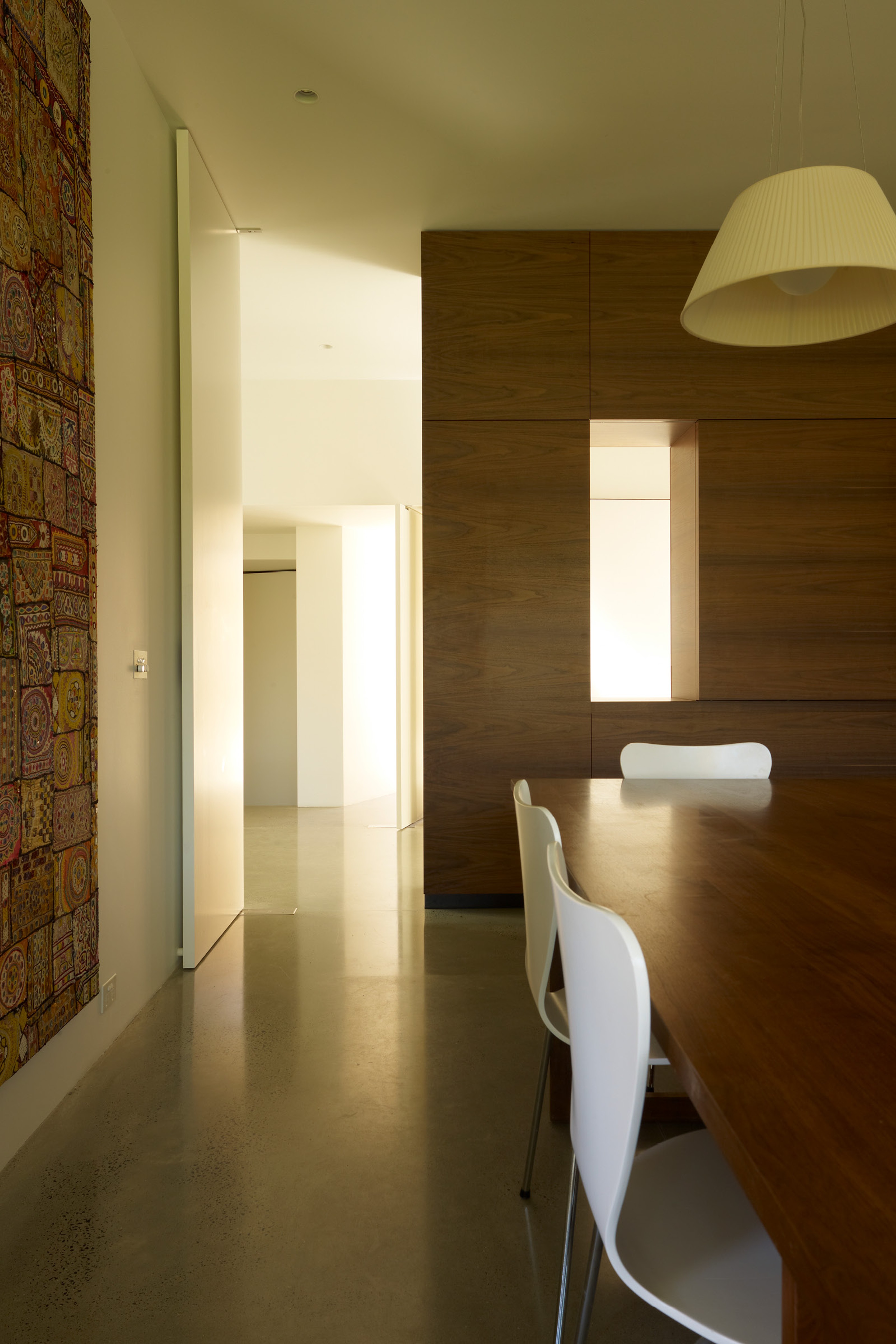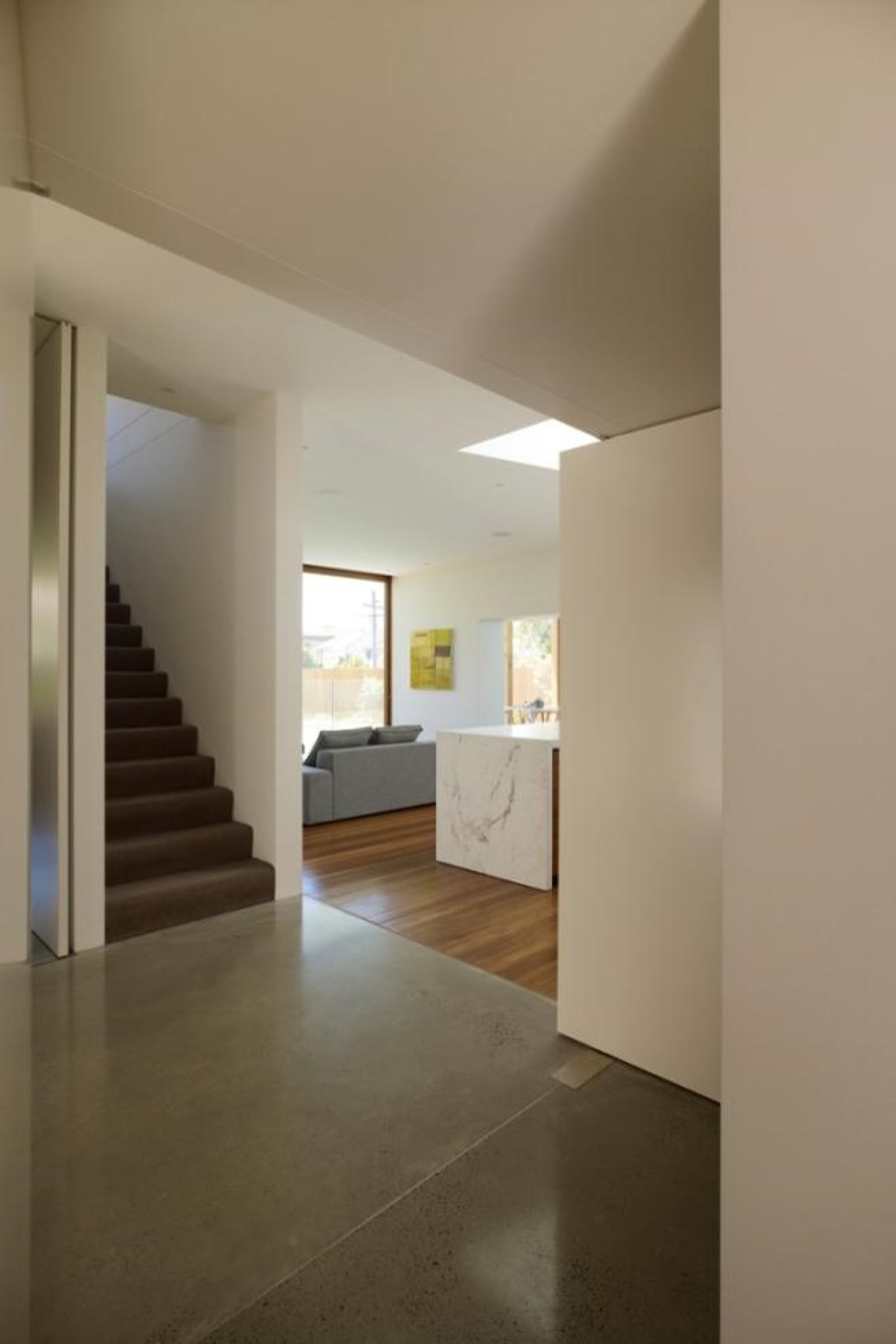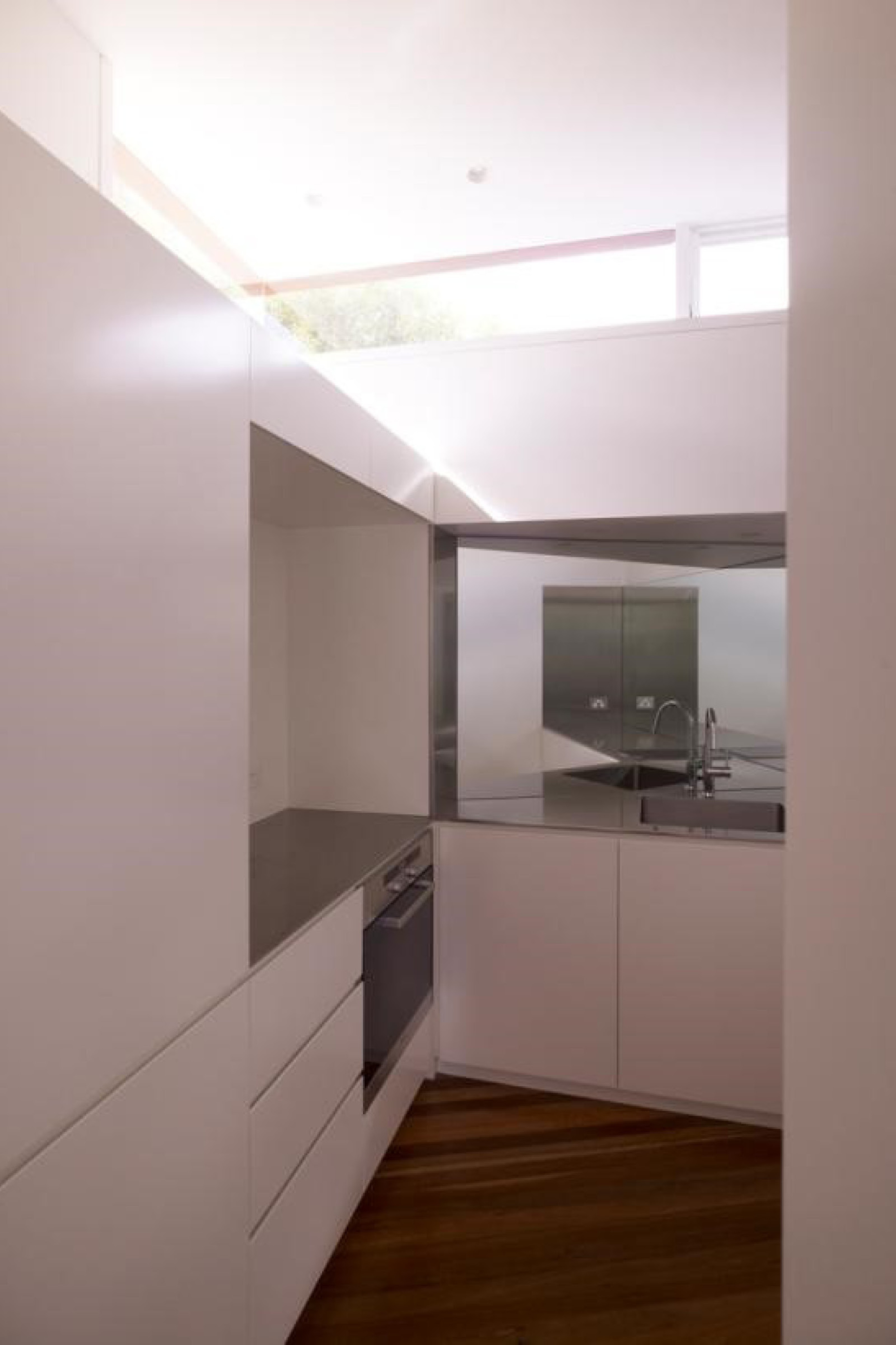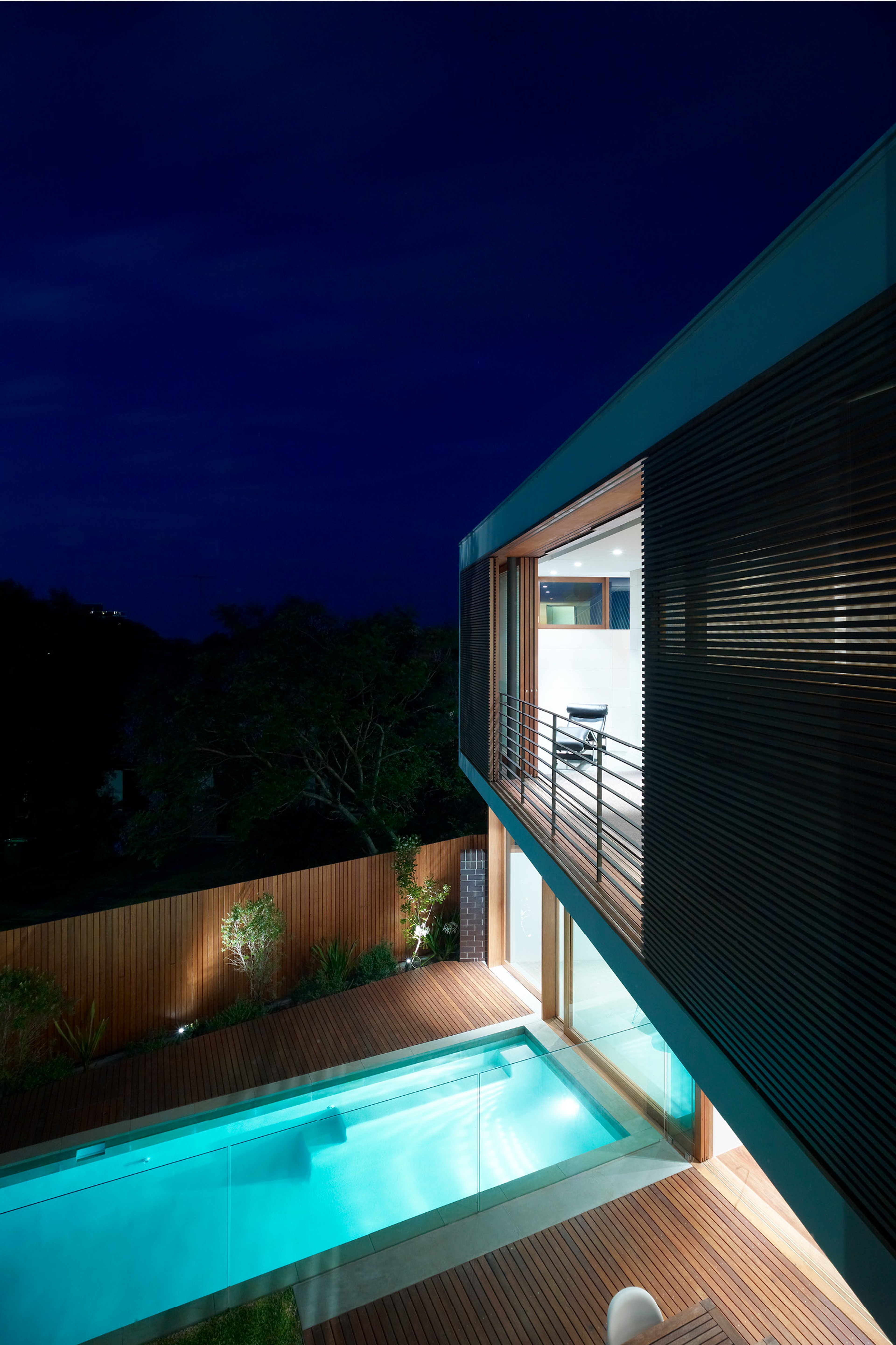Within the complex geometry of the site we gave each floor plan a different layout according to its position in relation to the datum of the boundary fence – for the more private ground floor we created orthogonal rooms orientated to the sun and the garden. For the upper level the geometry shifts to increase privacy and capture views across the suburban landscape and to the ocean beyond.