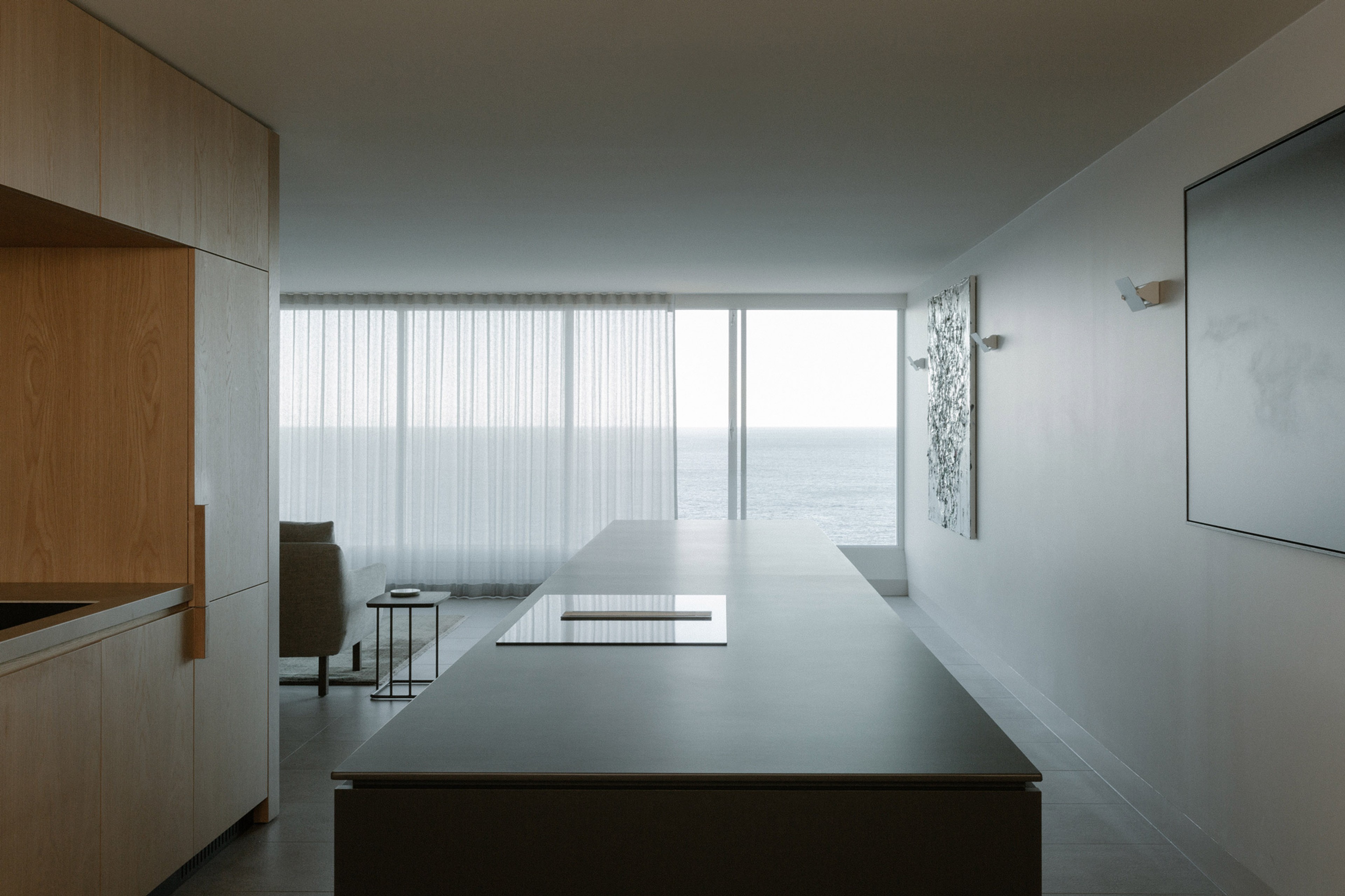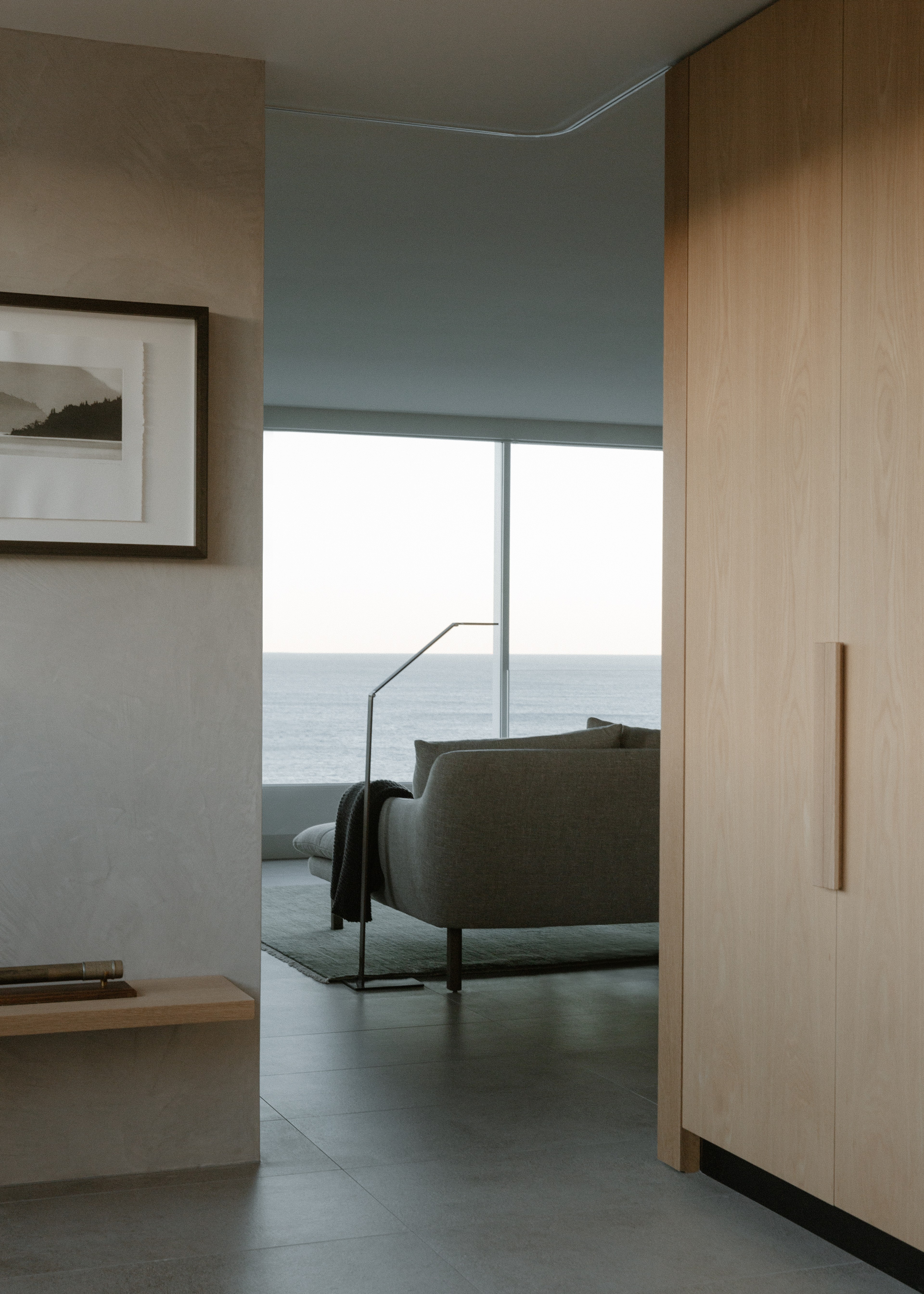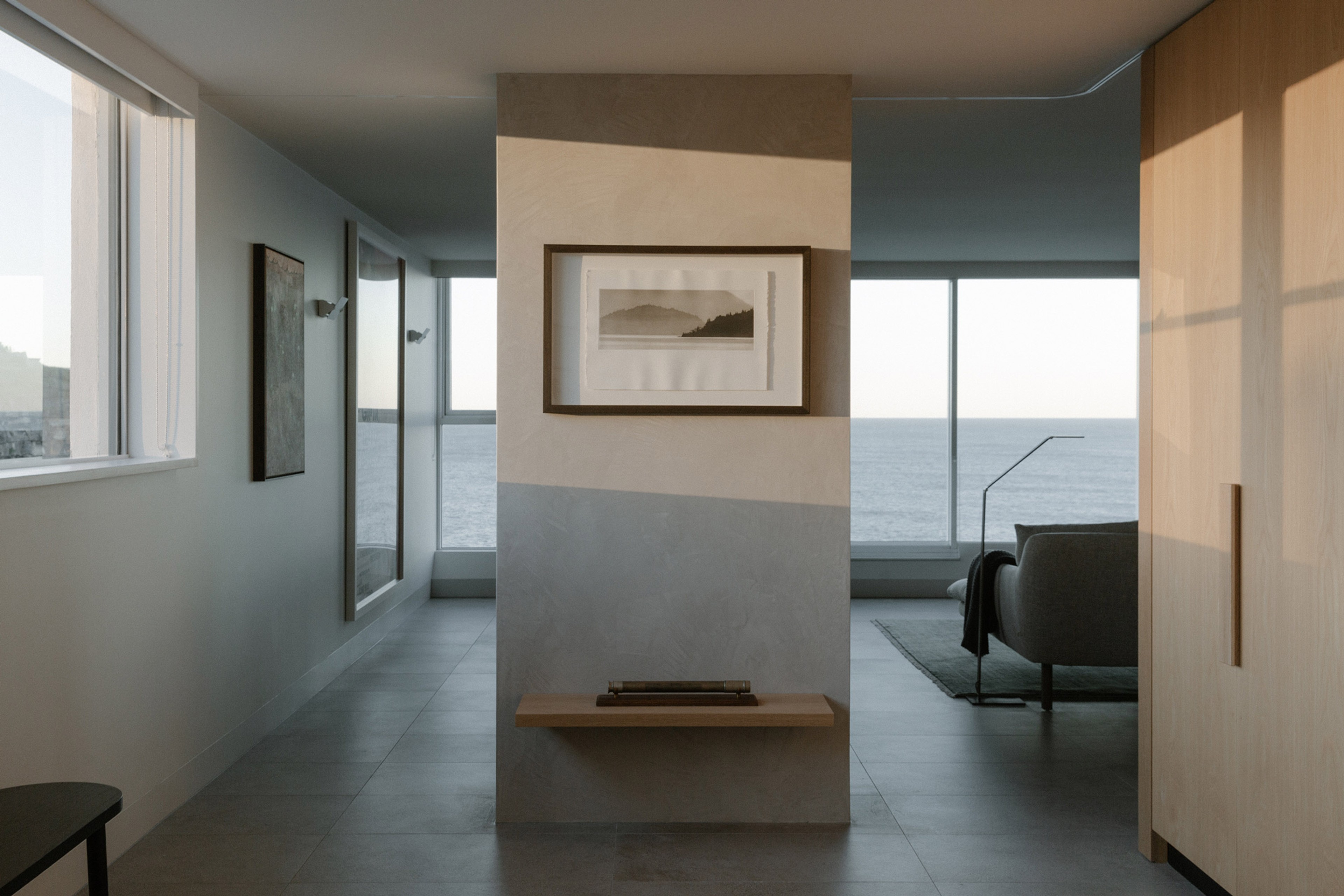 Our proposal removed walls and rooms to create one coherent space with a central, elemental core housing the bathroom, kitchen storage, and robe. This transition from a rooms-based plan to a more modernist open plan allowed all the spaces of the apartment to experience the immediacy of the sheer ocean cliffs, water, and horizon.
