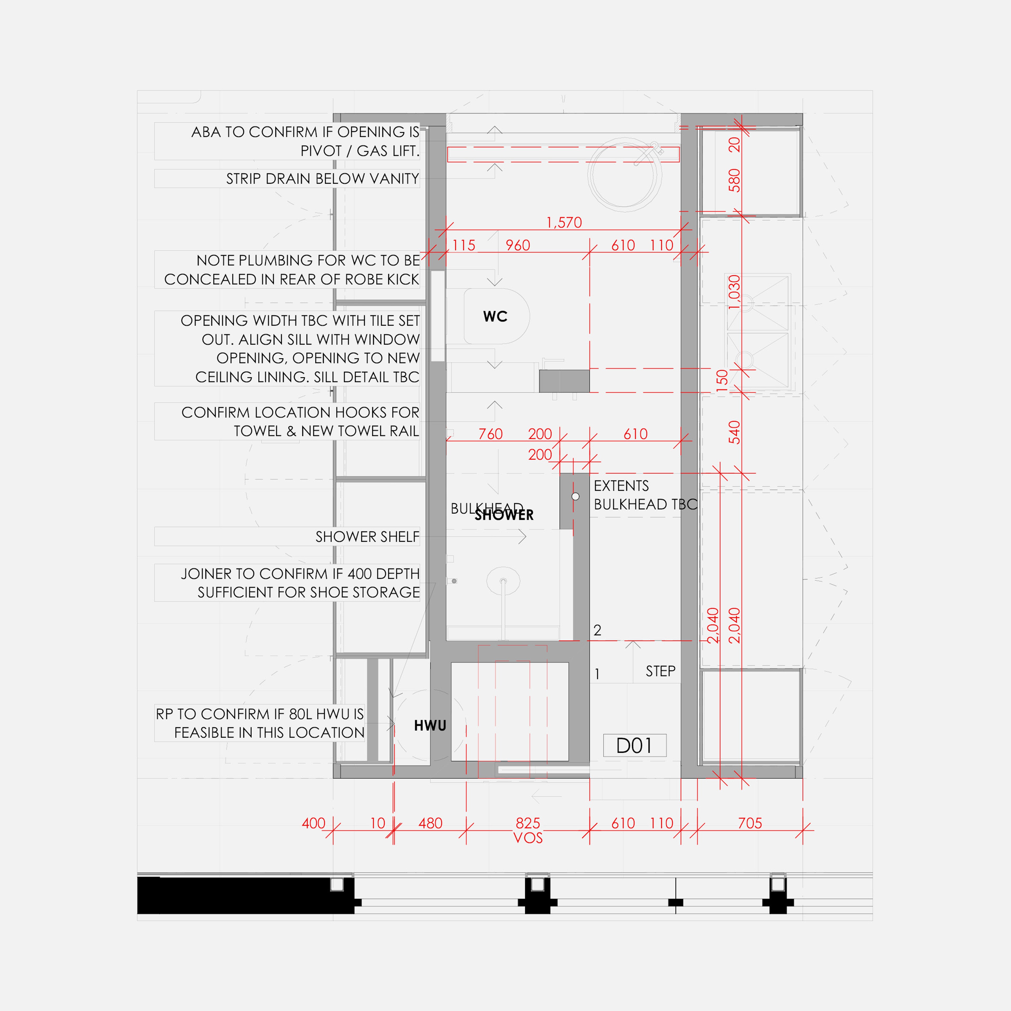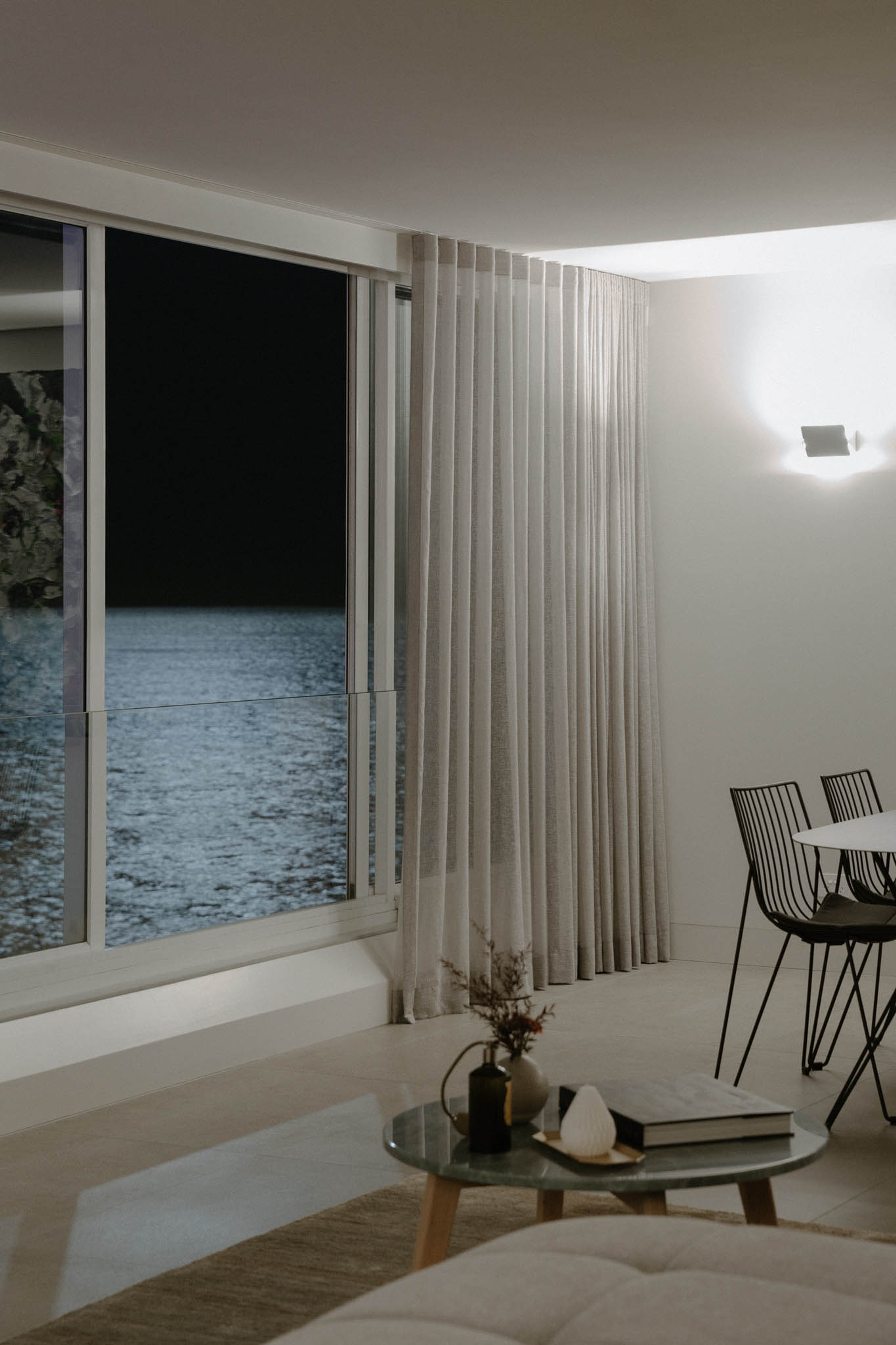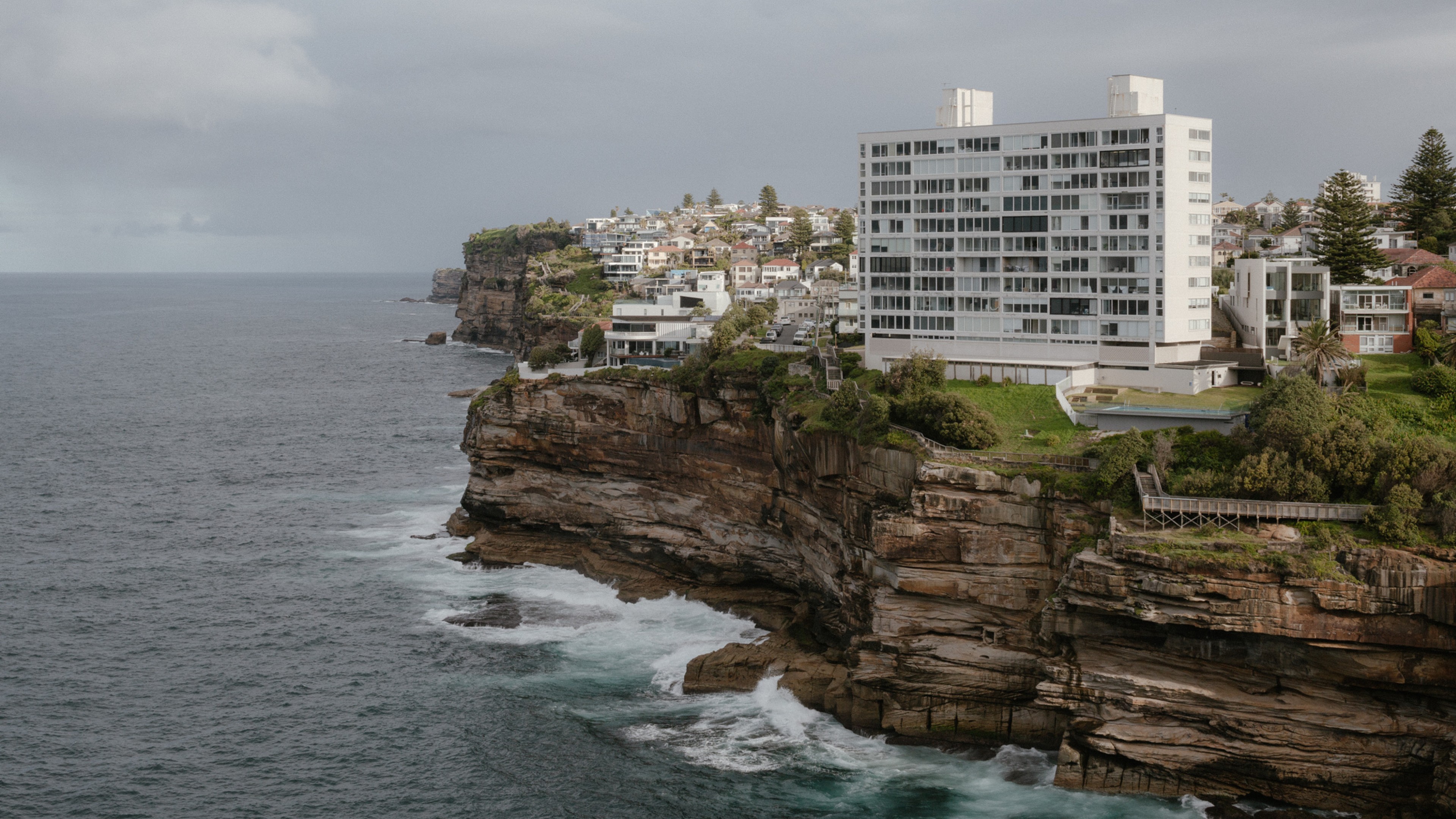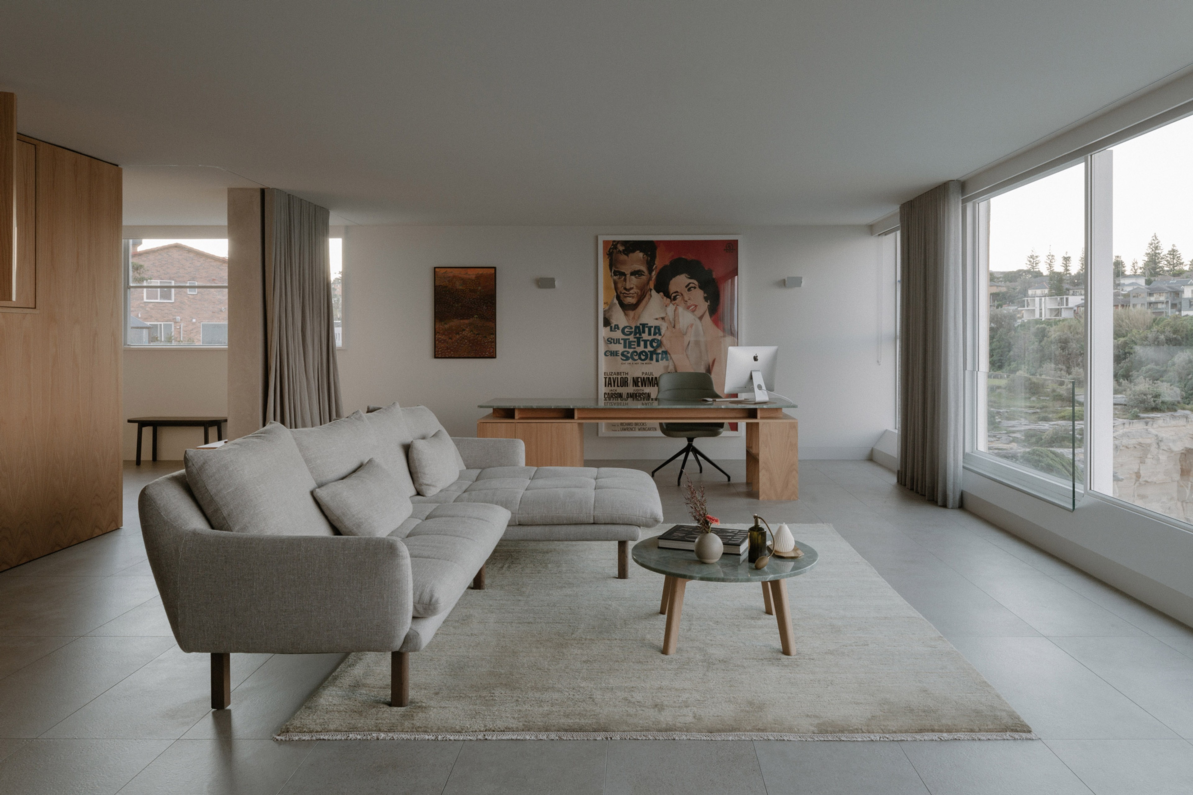 Our proposal removed walls and rooms to create one coherent space with a central, elemental core housing the bathroom, kitchen storage, and robe. This transition from a rooms-based plan to a more modernist open plan allowed all the spaces of the apartment to experience the immediacy of the sheer ocean cliffs, water, and horizon.