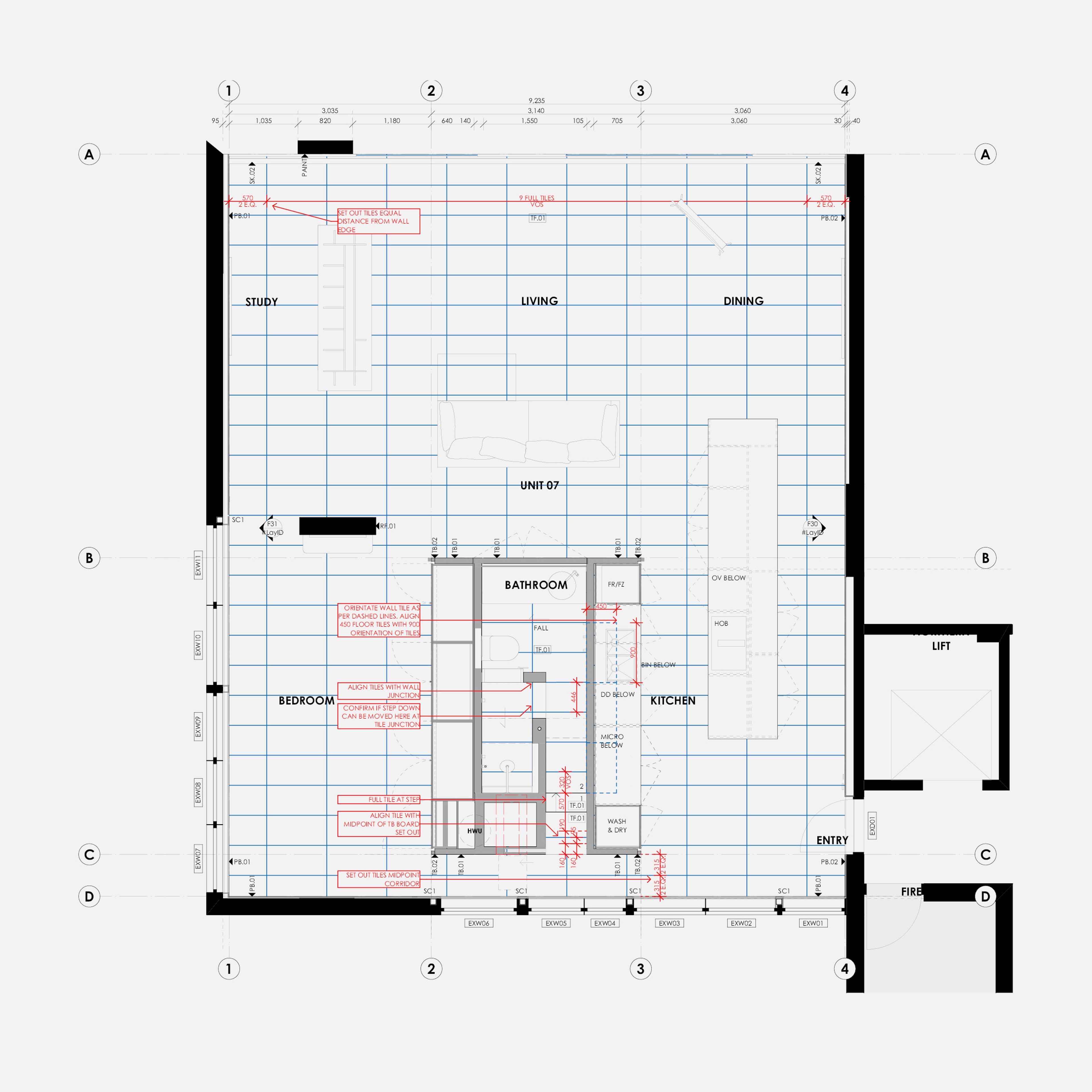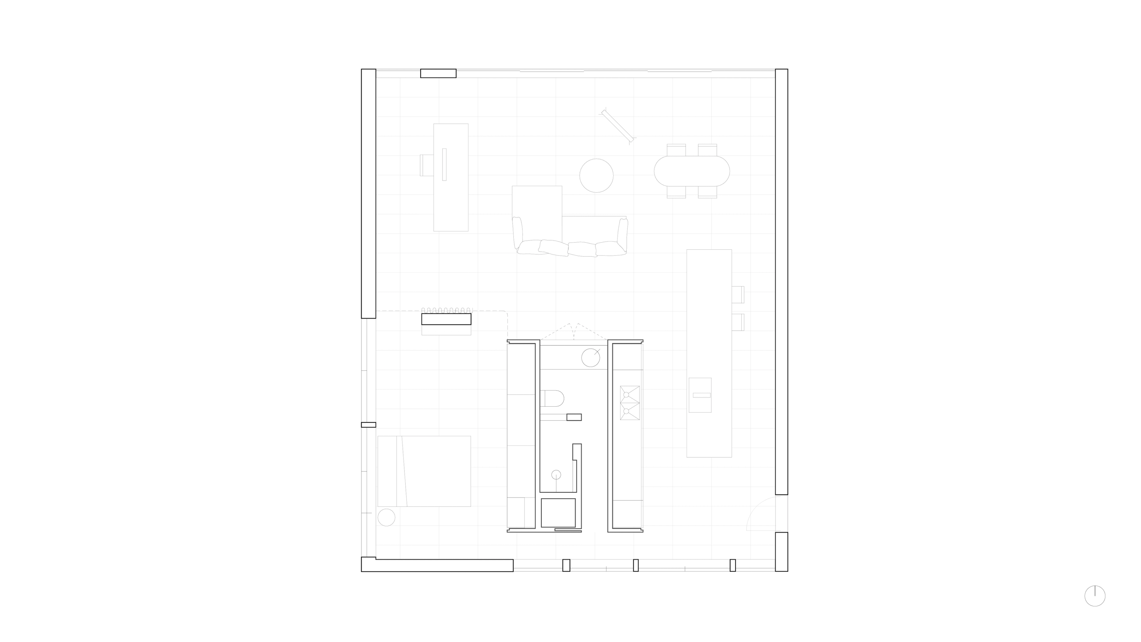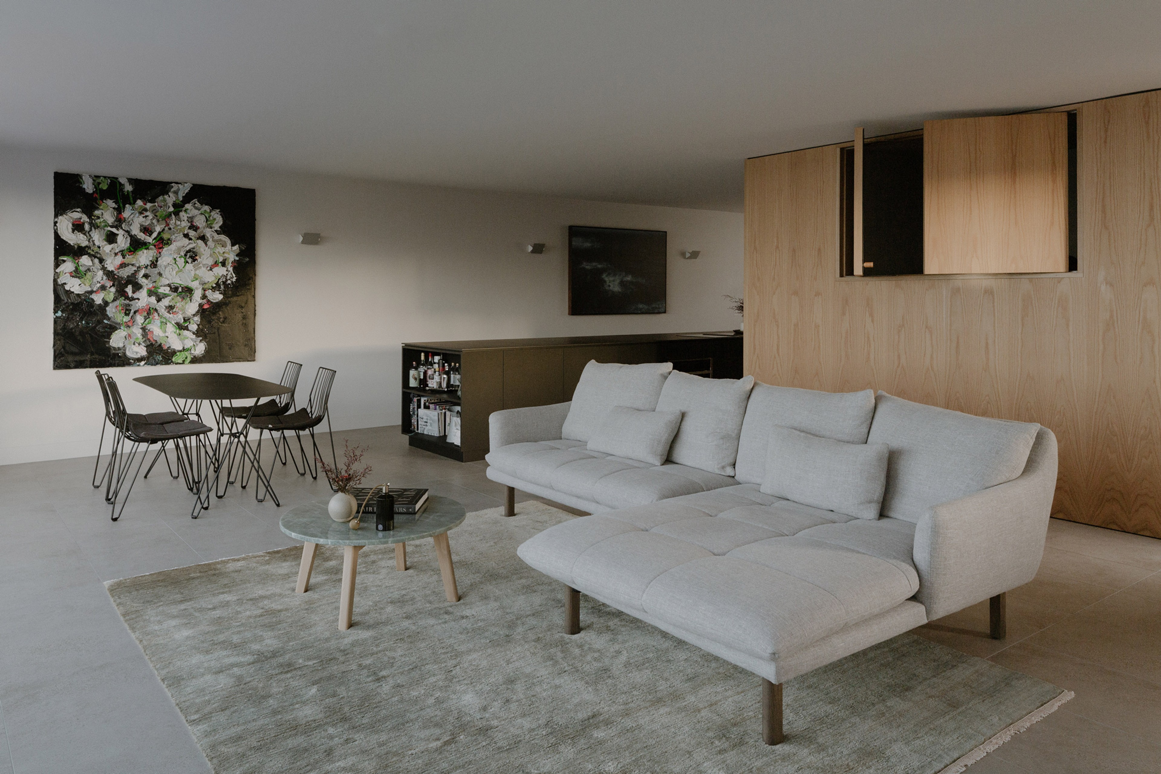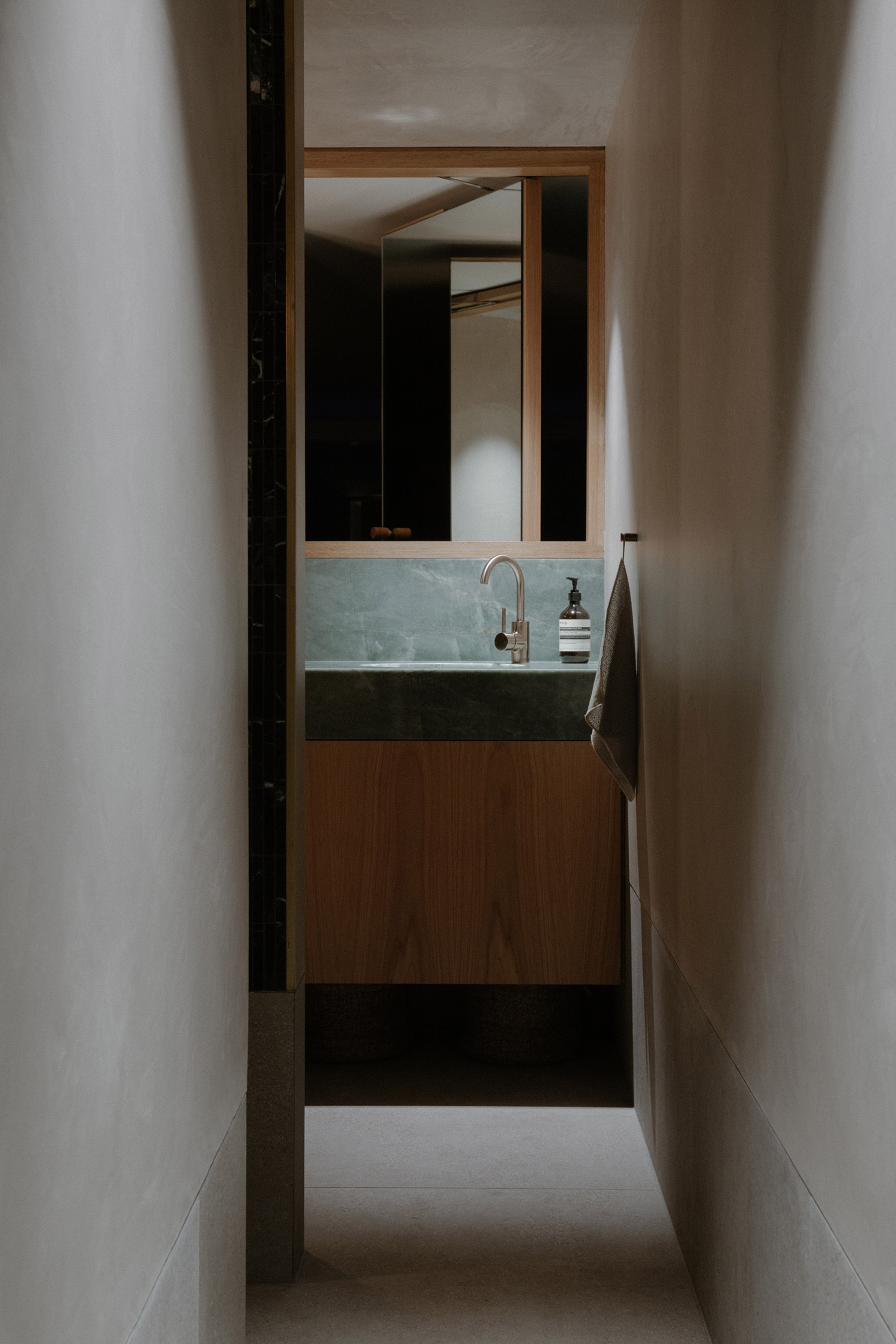 With the tight scale of the core we explored miniaturisation as a theme, dimensioning passages and thresholds to their absolute minimum, creating a micro-world of contained interior spaces as a contrast to the open and generous spatial experience of the main apartment interior.