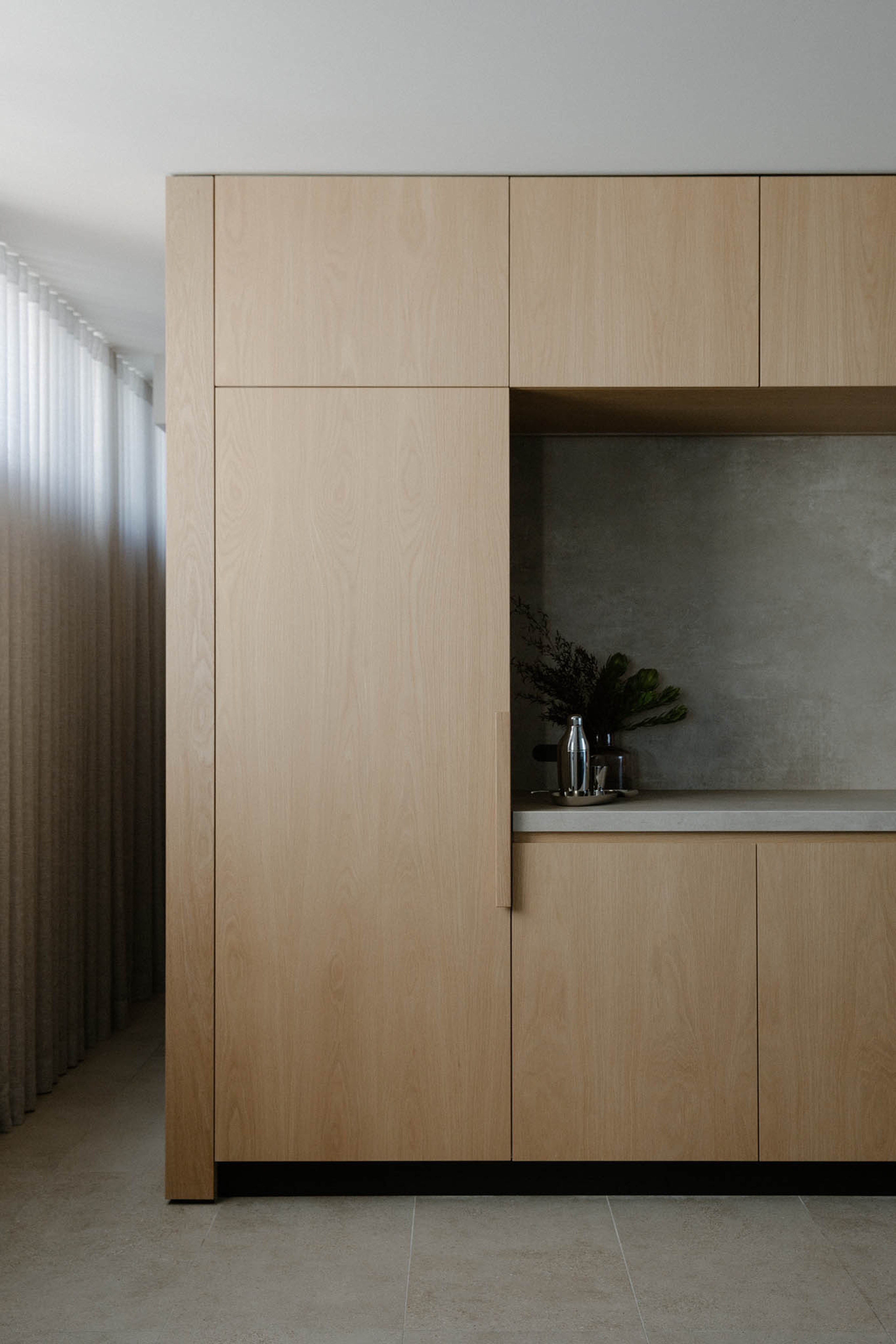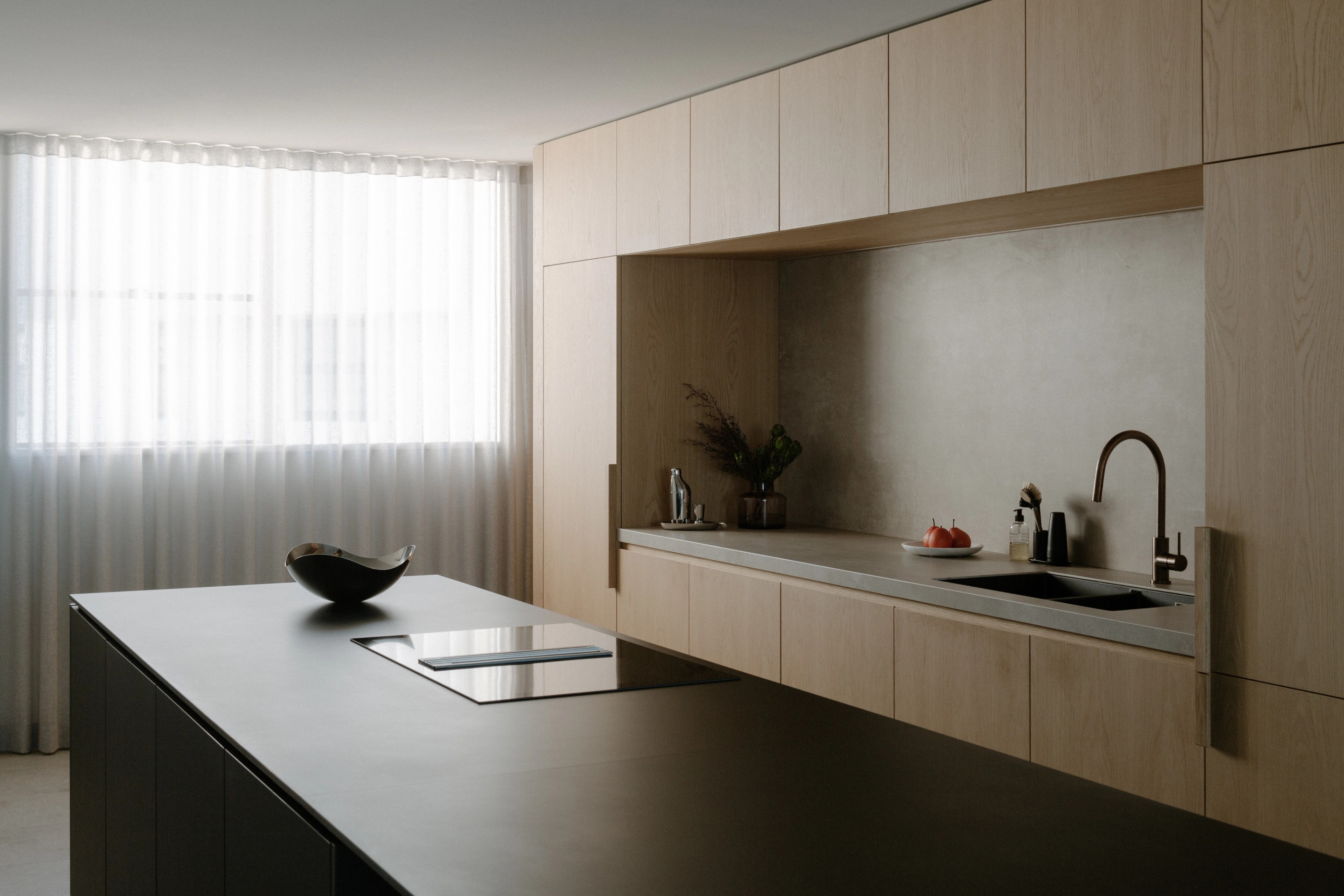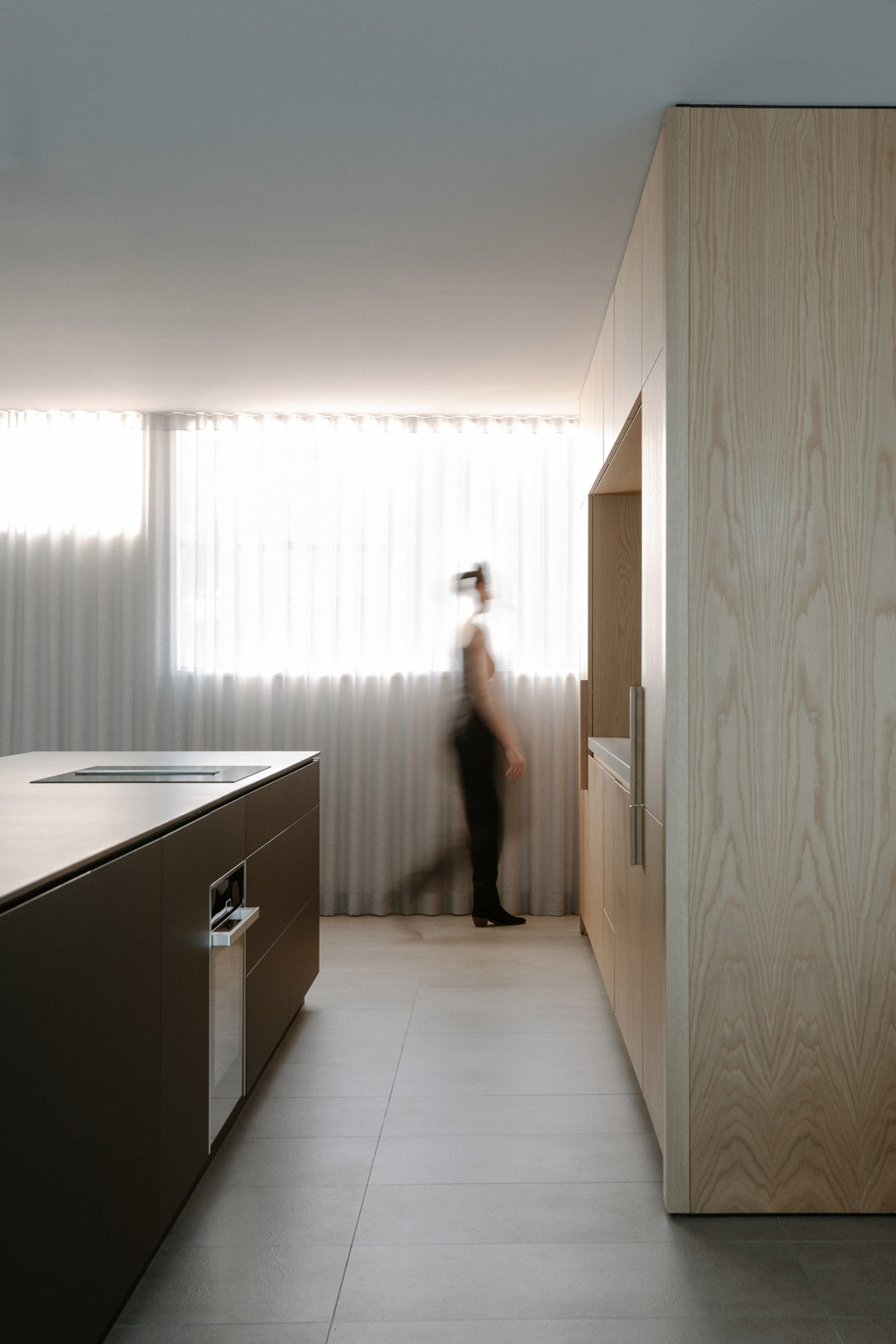 Material selection was purposefully limited. An emerald, smeraldo slab was chosen for the desk and vanity, the movement of the veins echoing the churning whitewash below. The expansive black island bench brings a depth and grounding to the space, in contrast to the lightness and texture of oak cabinetry. Curtains offer a softness, to counter the intensity of the northeast light and allow the bedroom to be closed or open to the public realm.
