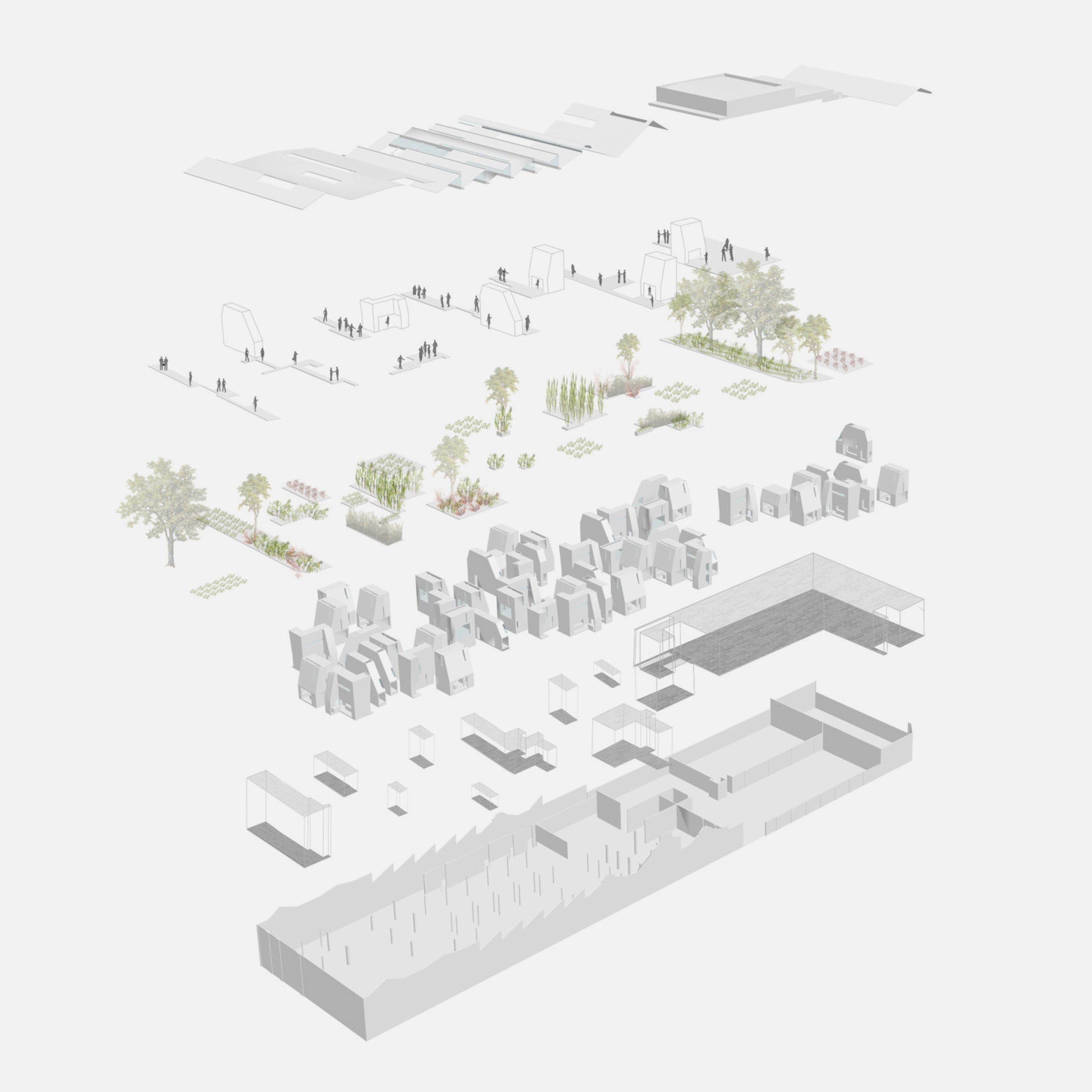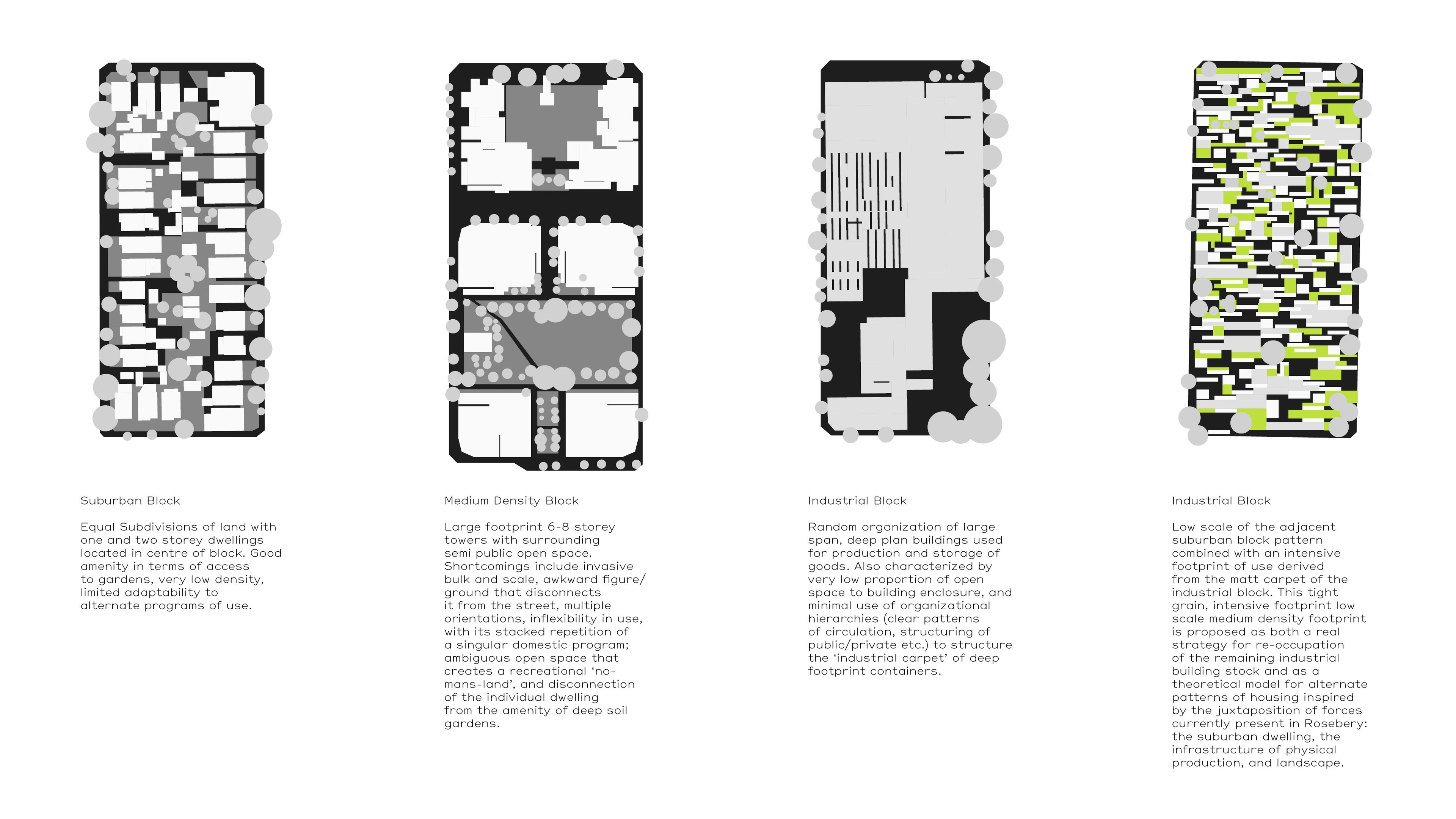 As an alternative to the ubiquitous medium density apartment type, we proposed a hybrid block configuration that maintains the low scale of the adjacent suburban block pattern combined with an intensive footprint of use derived from the matt carpet of the industrial block. Configurations are structured around the insertion of a domestic compactus of brick cores containing essential domestic and environmental infrastructure. This tight grain, intensive mixed-use, low scale medium density footprint is proposed as both a real strategy for re-occupation of the remaining industrial building stock and as a theoretical model for alternate patterns of housing inspired by the juxtaposition of forces currently present in Rosebery: the suburban dwelling, the infrastructure of physical production, and landscape.