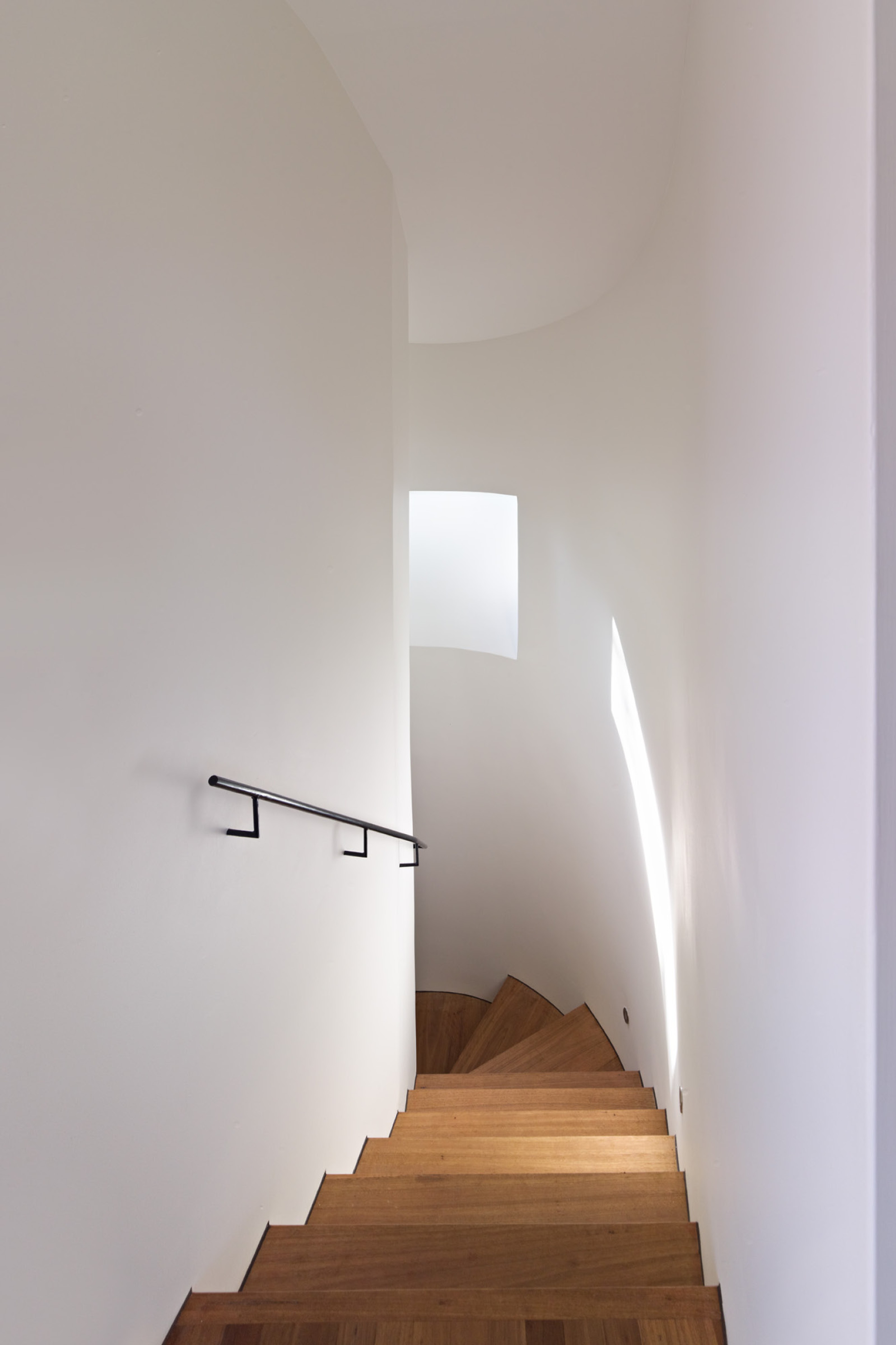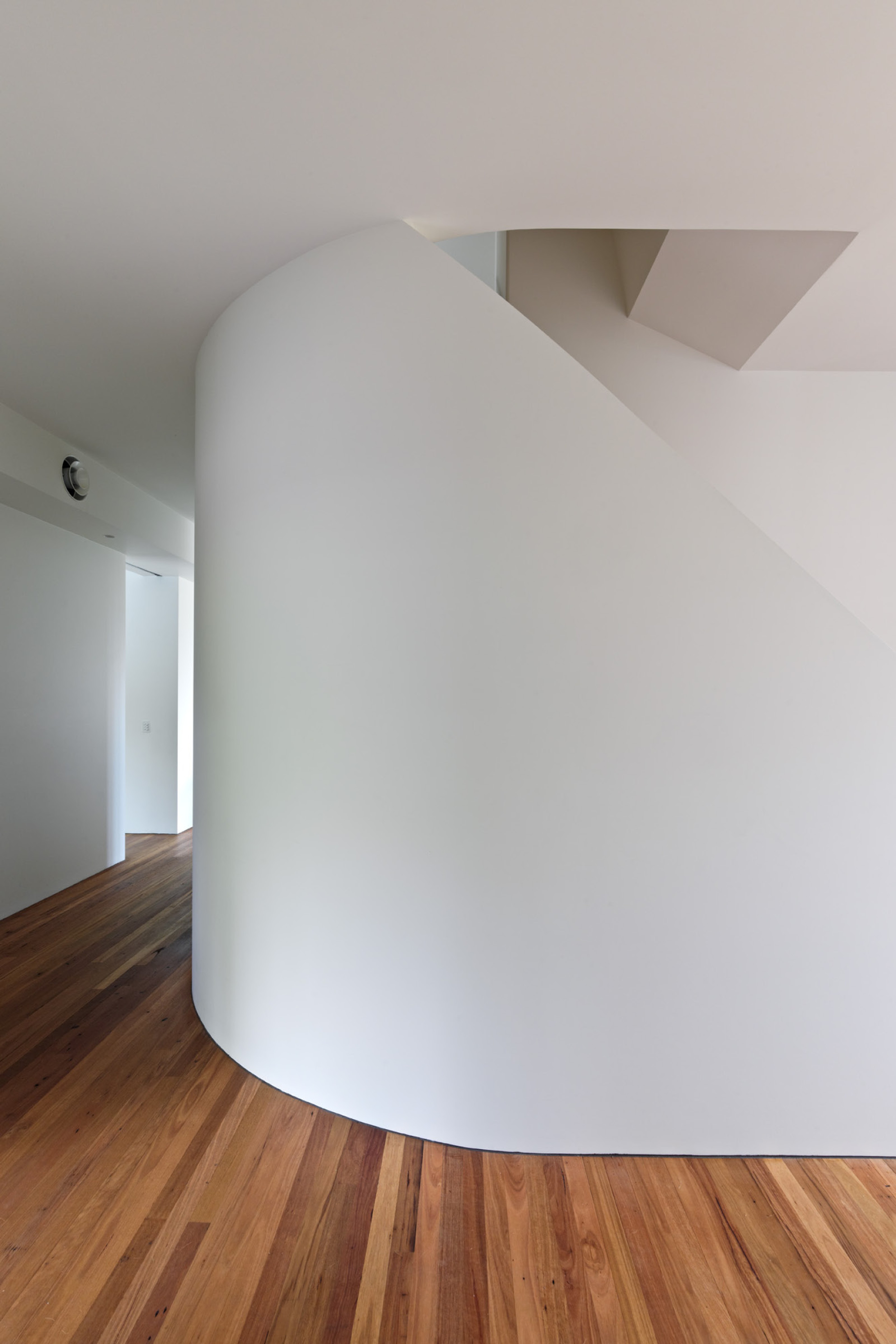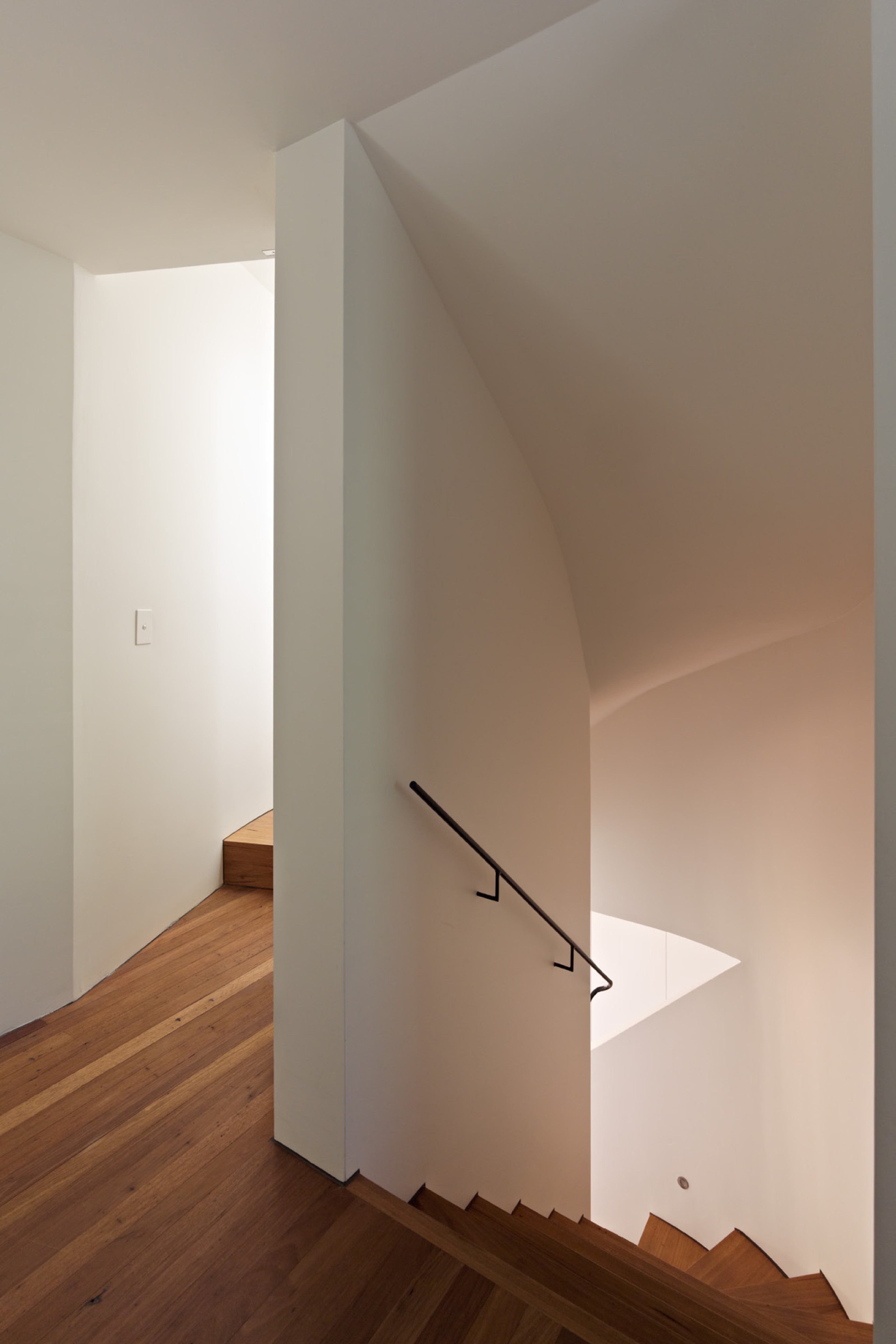 To increase the perception of space within the tight footprint of the existing levels, we grouped as many functions as we could in a tight core around a rebuilt stair, allowing the full length of the periphery walls to be revealed on the interior, increasing the scale of each room. The circulation between levels was built around the fireplace chimney, with the tightly curved walls of the stair peeling away to draw light and open views to the sky from within this central core.