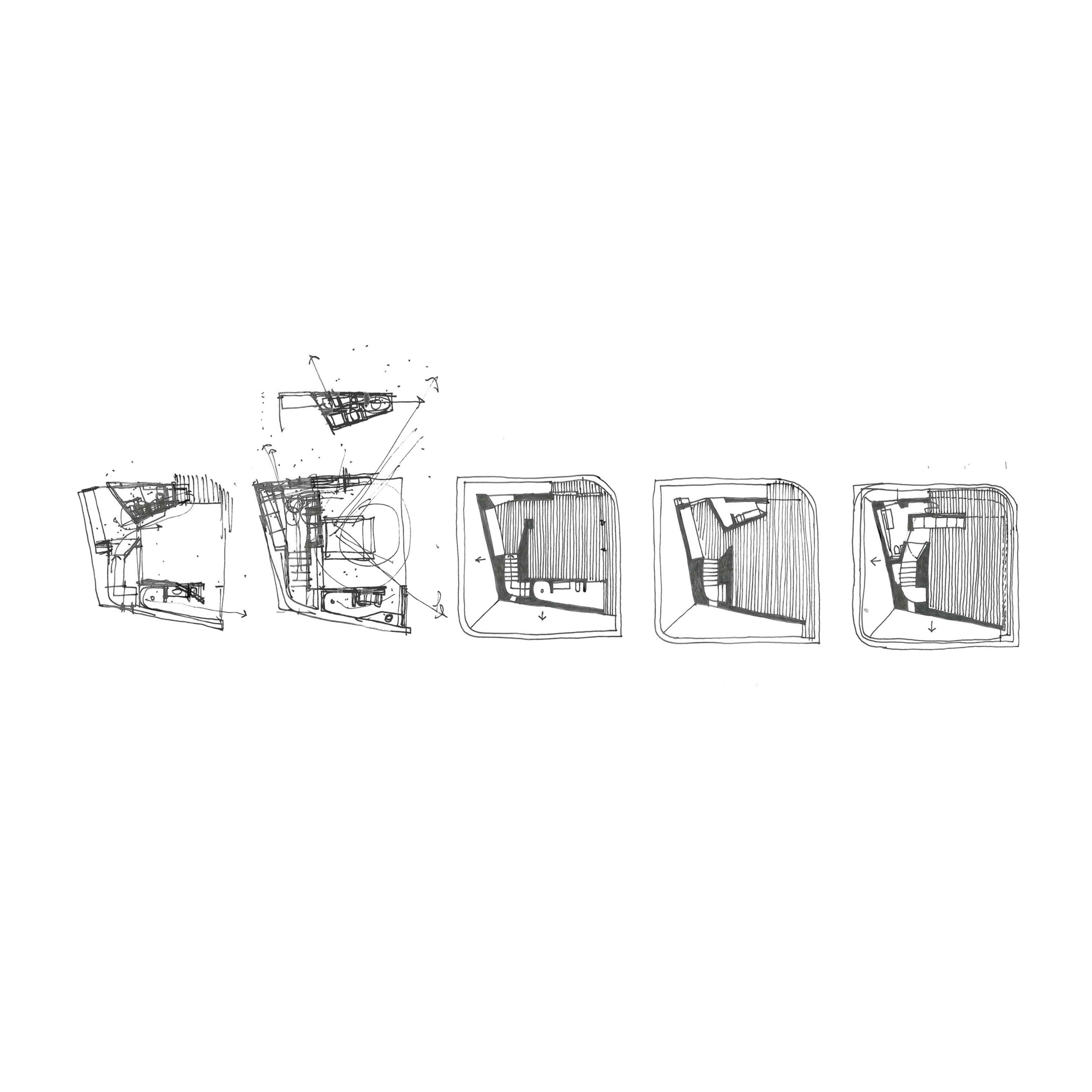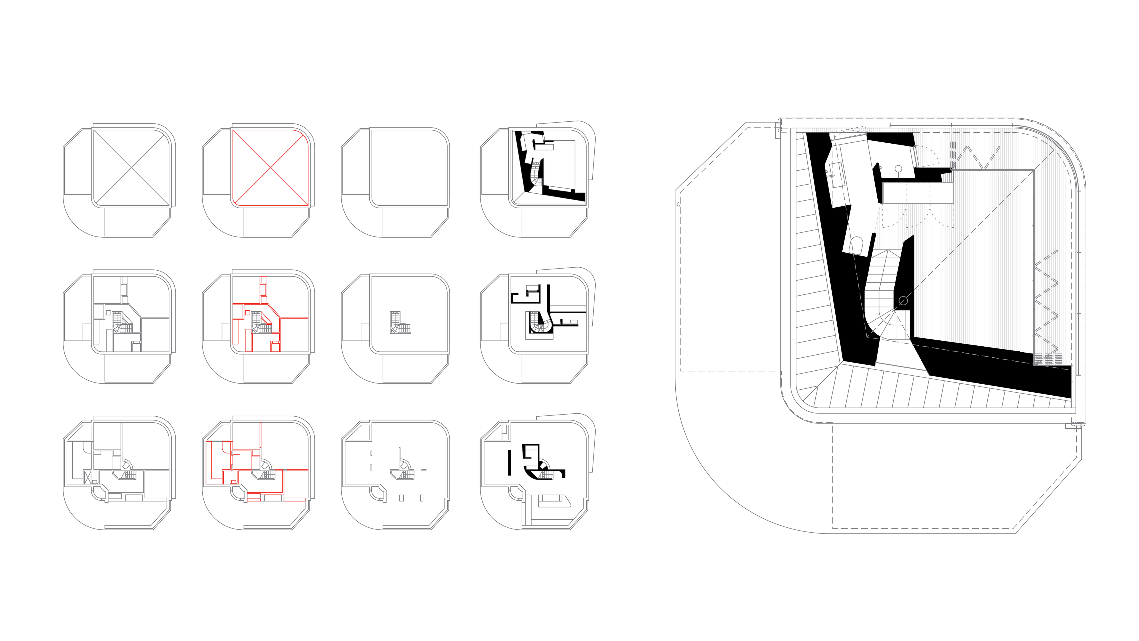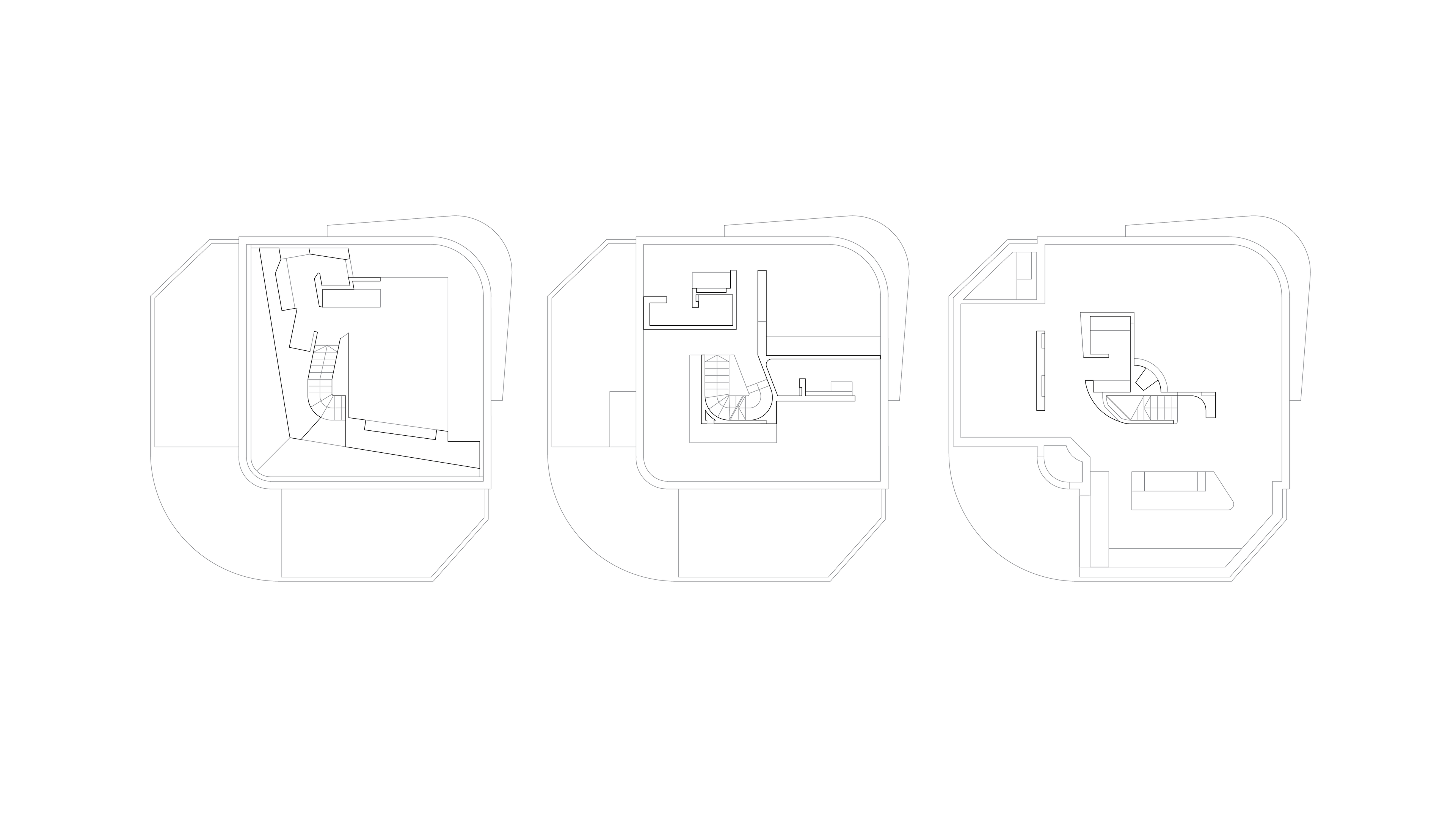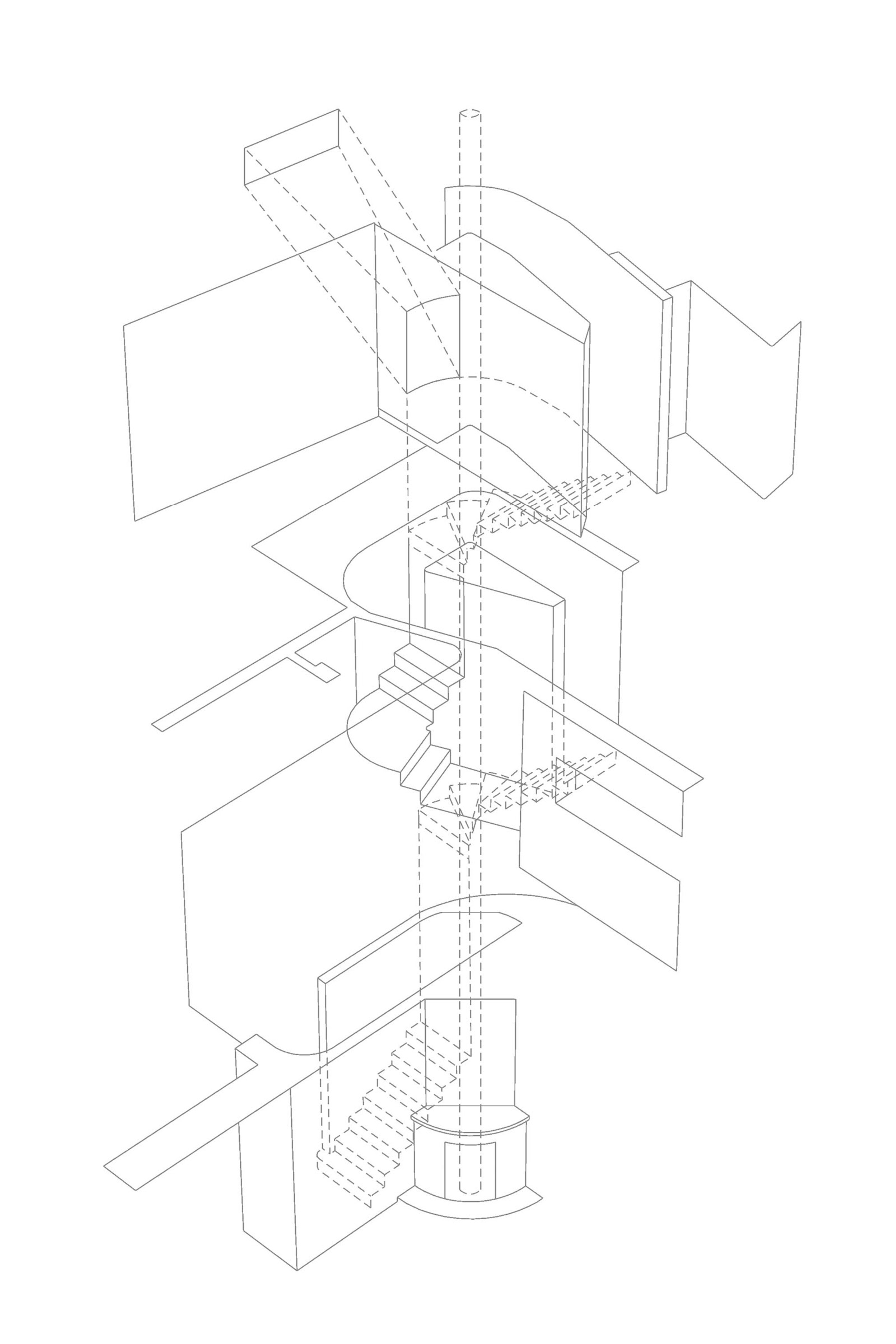 To increase the perception of space within the tight footprint of the existing levels, we grouped as many functions as we could in a tight core around a rebuilt stair, allowing the full length of the periphery walls to be revealed on the interior, increasing the scale of each room. The circulation between levels was built around the fireplace chimney, with the tightly curved walls of the stair peeling away to draw light and open views to the sky from within this central core.