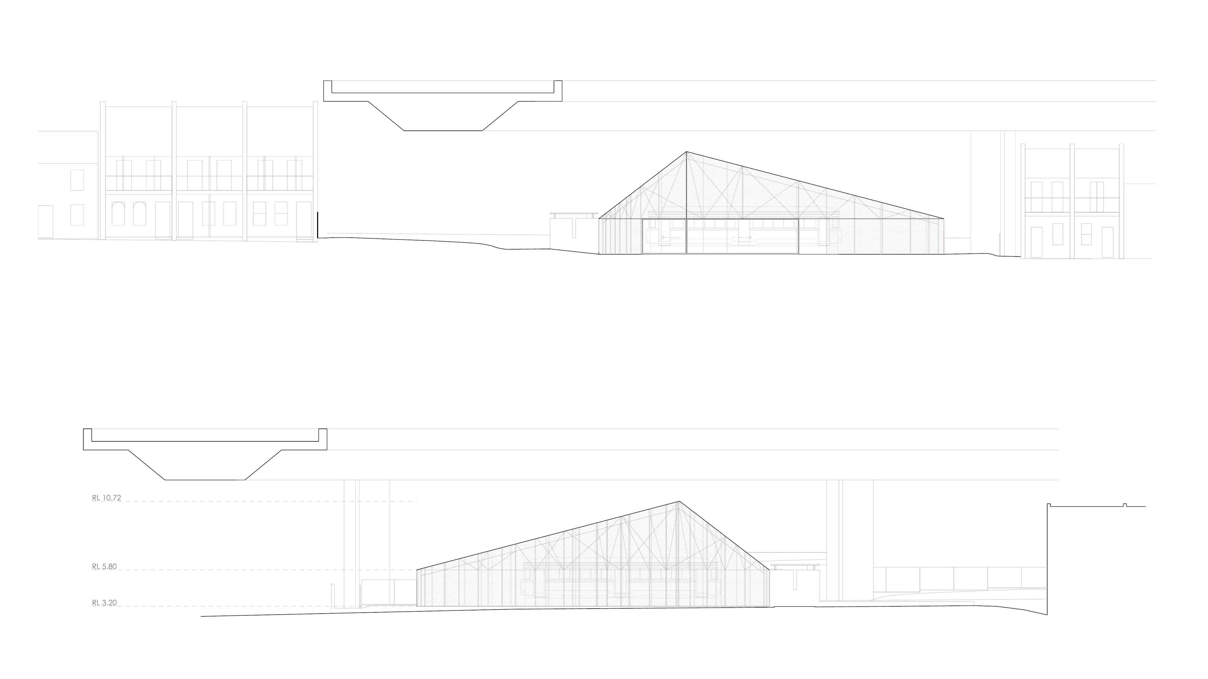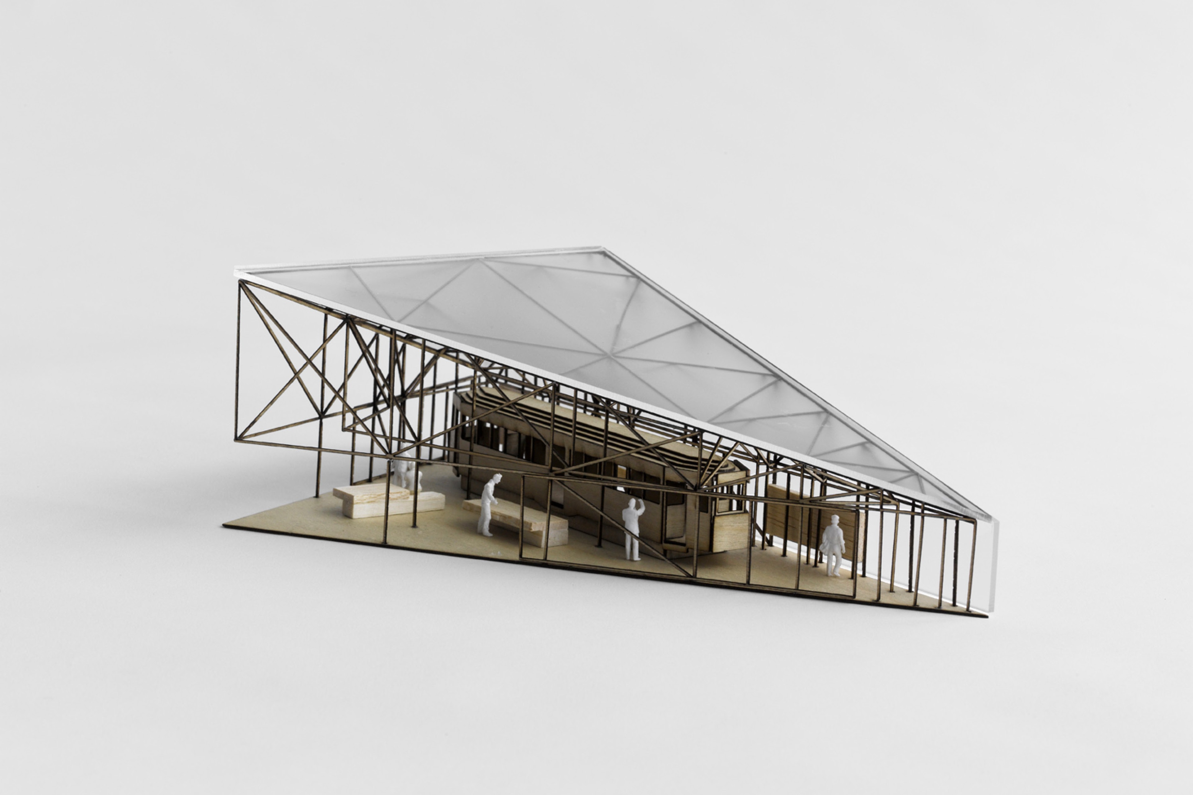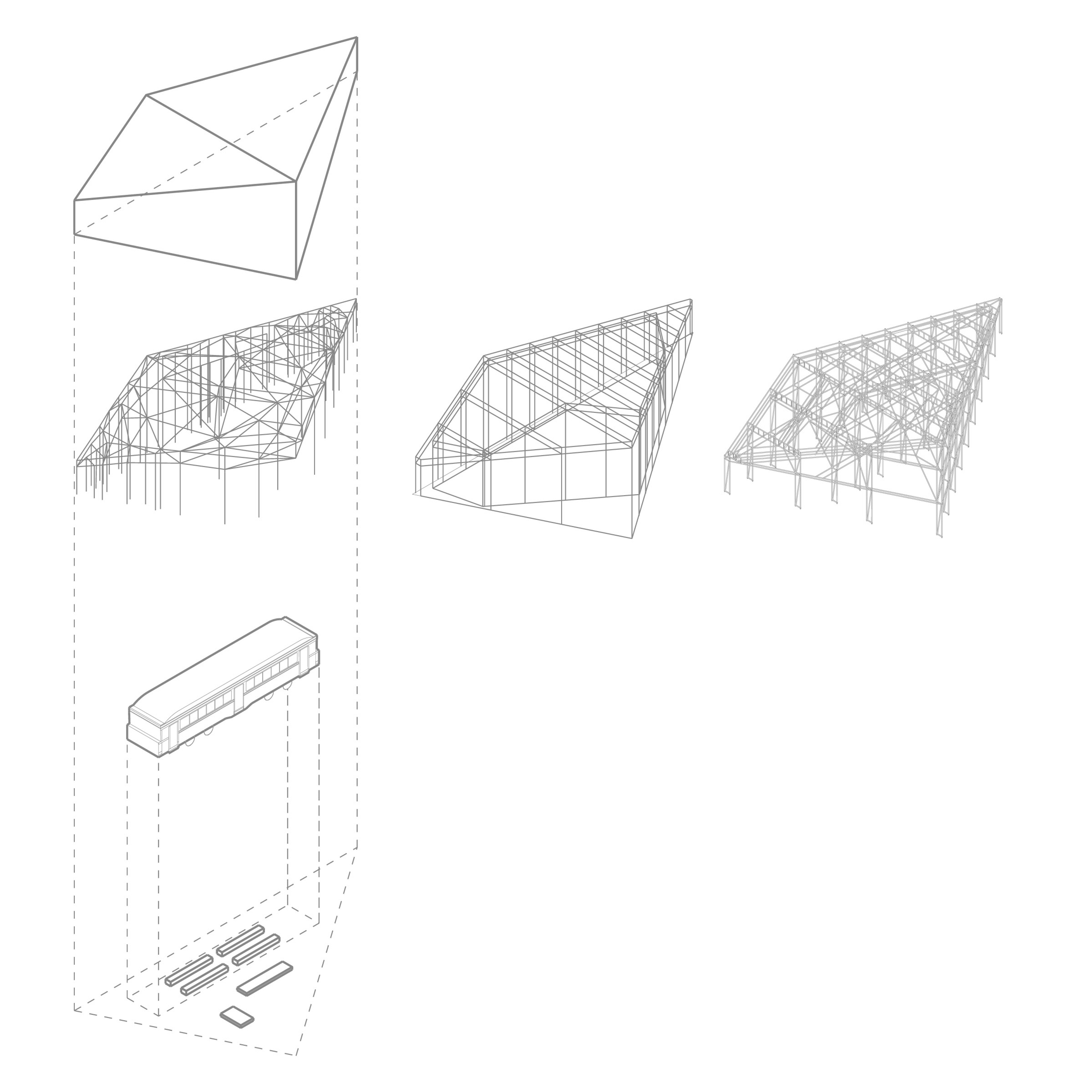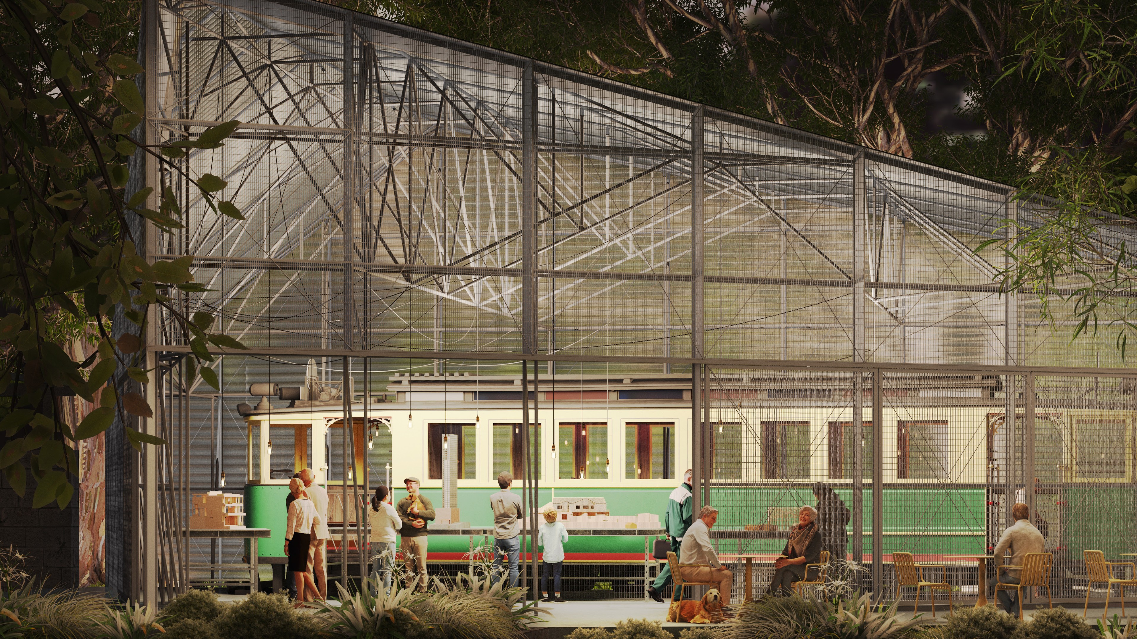 Our design of the enclosure attempts to very directly evoke the iconic form of the ‘shed’. The design of the roof draws on two sources for this ‘shed’ form – typical examples of vernacular work sheds, and a more specific reference to the industrial shed currently housing the tram, with the triangular roof like a fragment of the sawtooth roof that has been relocated with the tram.