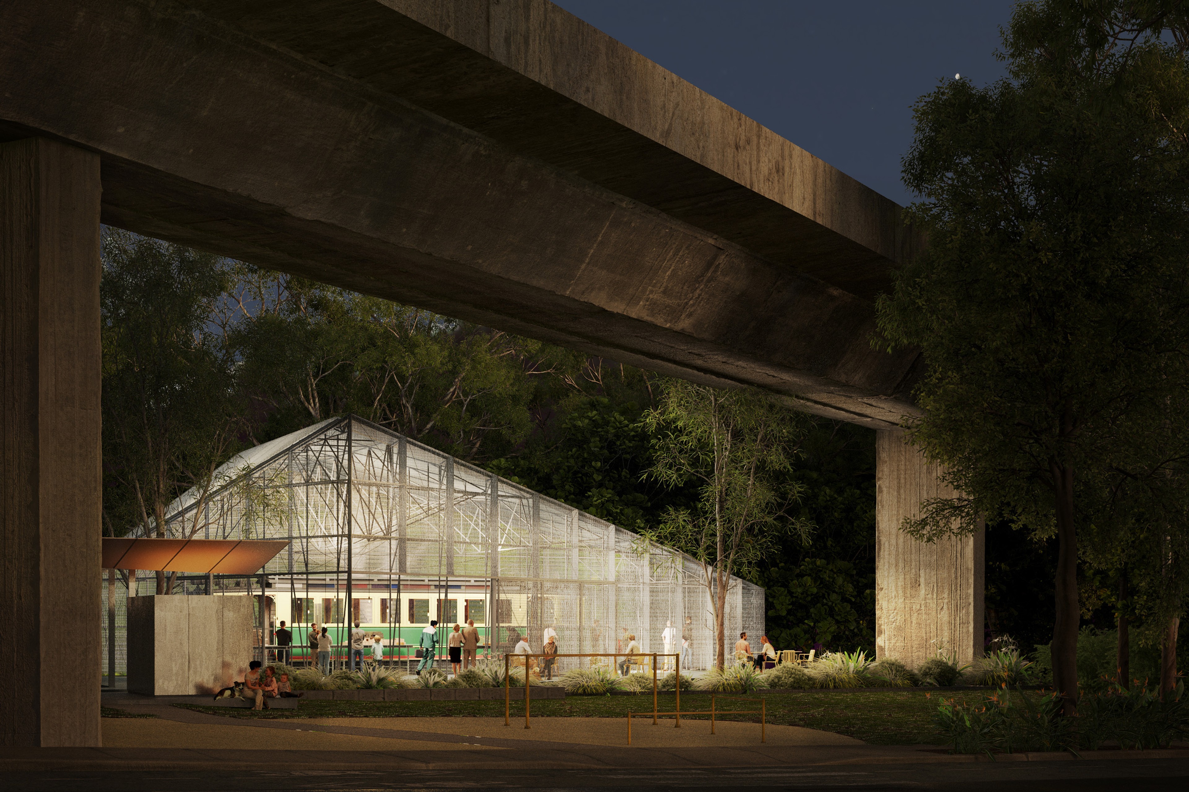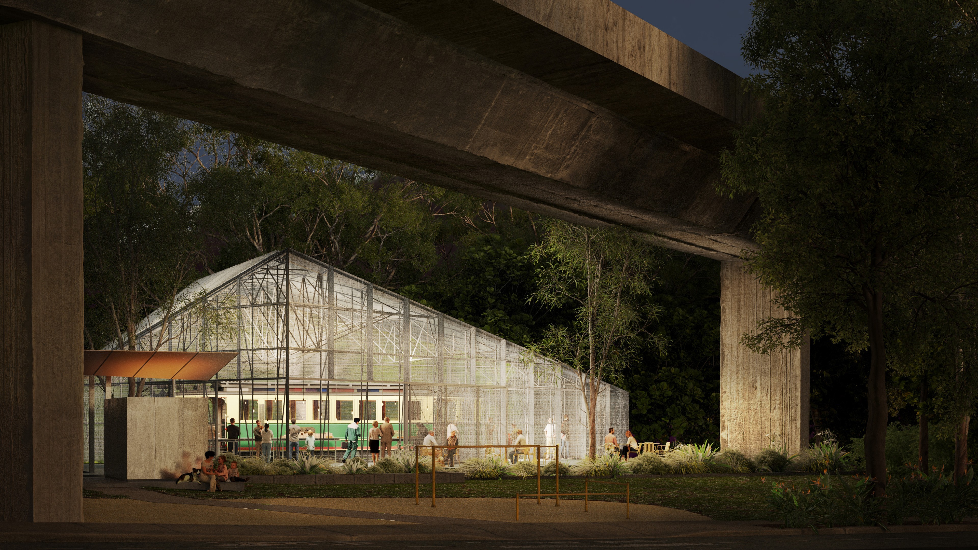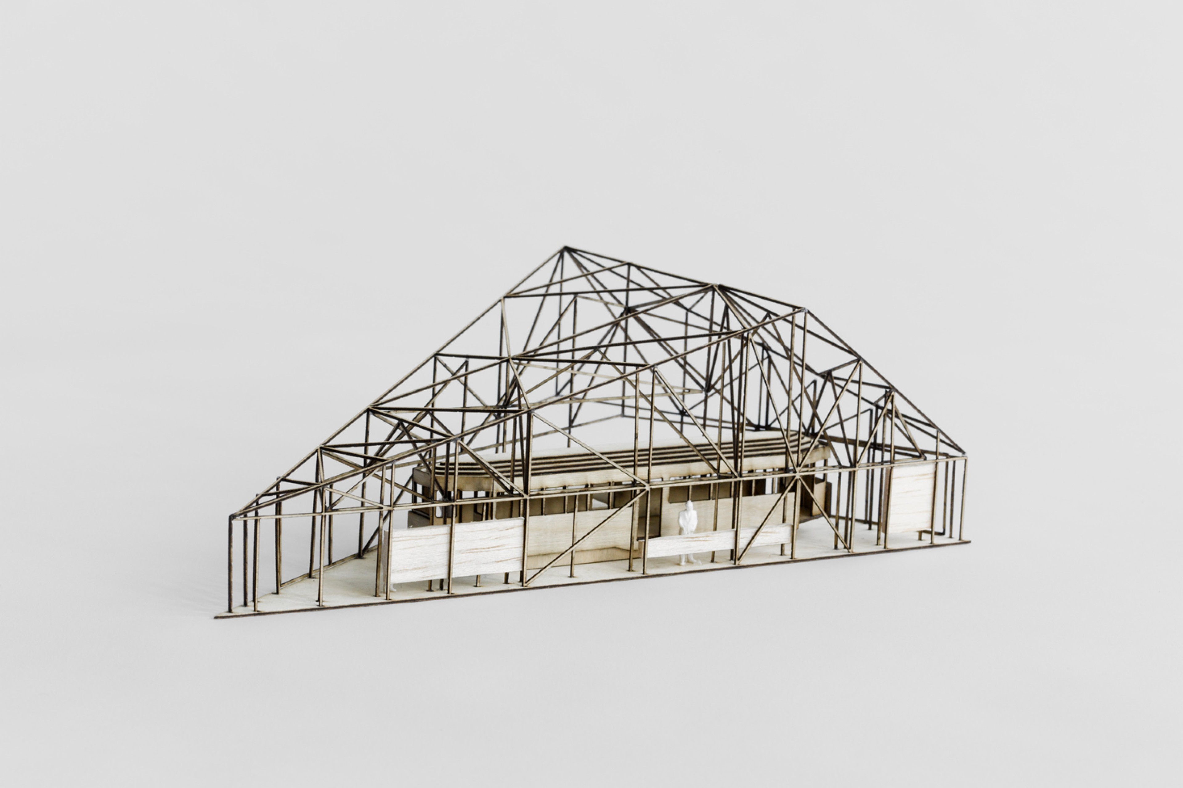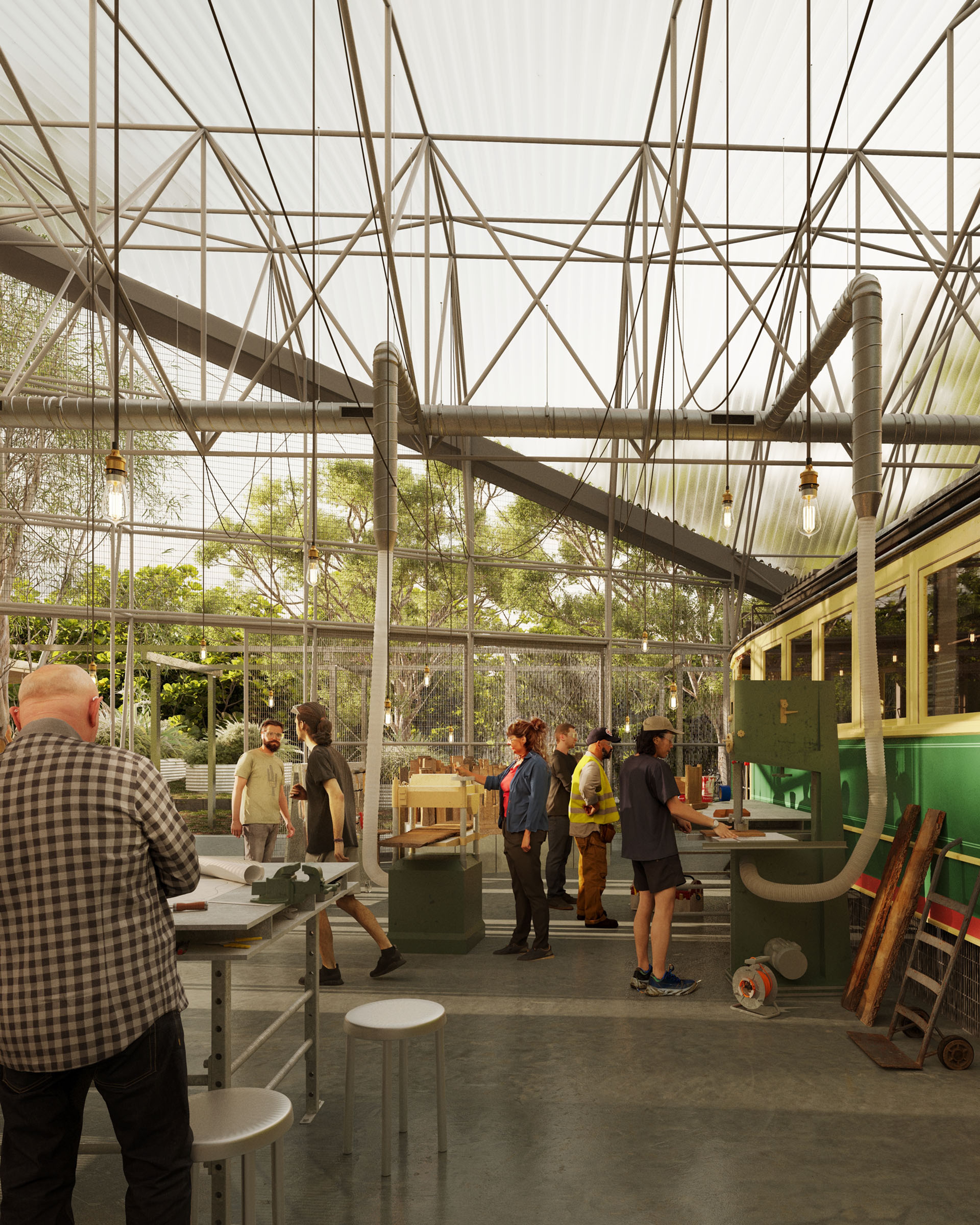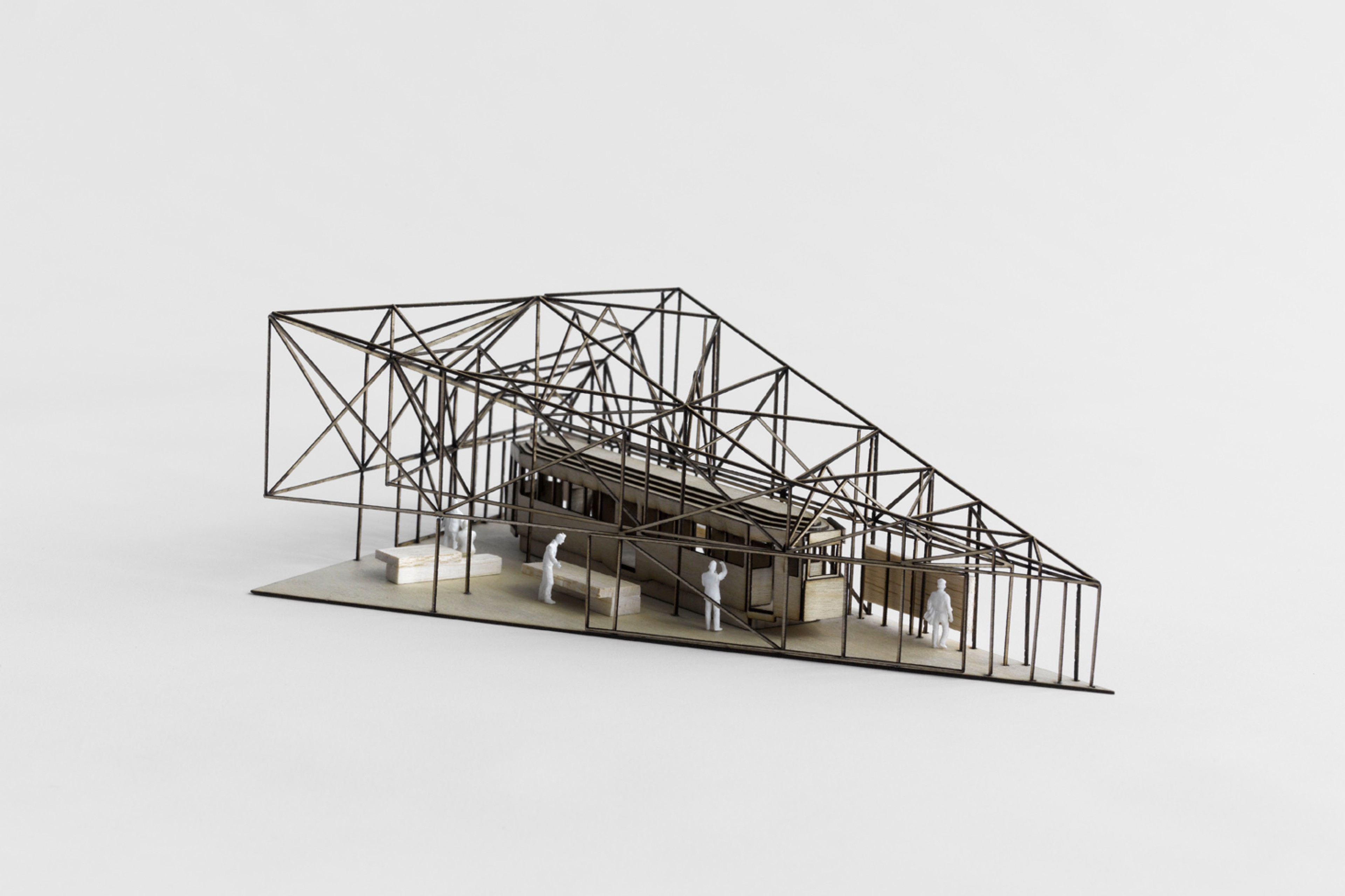 Our design of the enclosure attempts to very directly evoke the iconic form of the ‘shed’. The design of the roof draws on two sources for this ‘shed’ form – typical examples of vernacular work sheds, and a more specific reference to the industrial shed currently housing the tram, with the triangular roof like a fragment of the sawtooth roof that has been relocated with the tram.