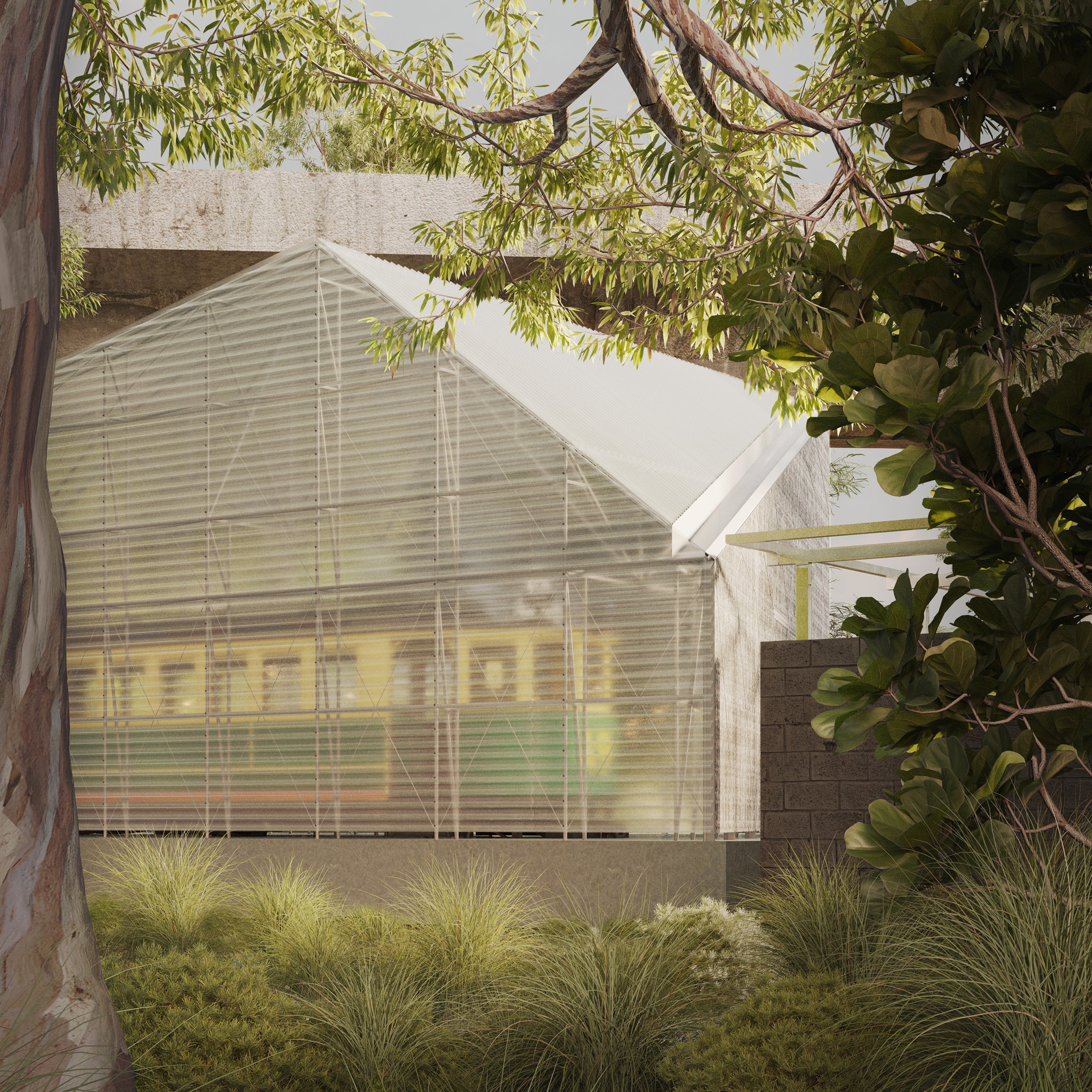 With the primary structure developed as a scaffold like matrix of minimally dimensioned steel CHS’s, the façade is a combination of galvanised mesh and polycarbonate, creating a raw, robust and cost effective material palette that creates a light and airy veranda like interior space.