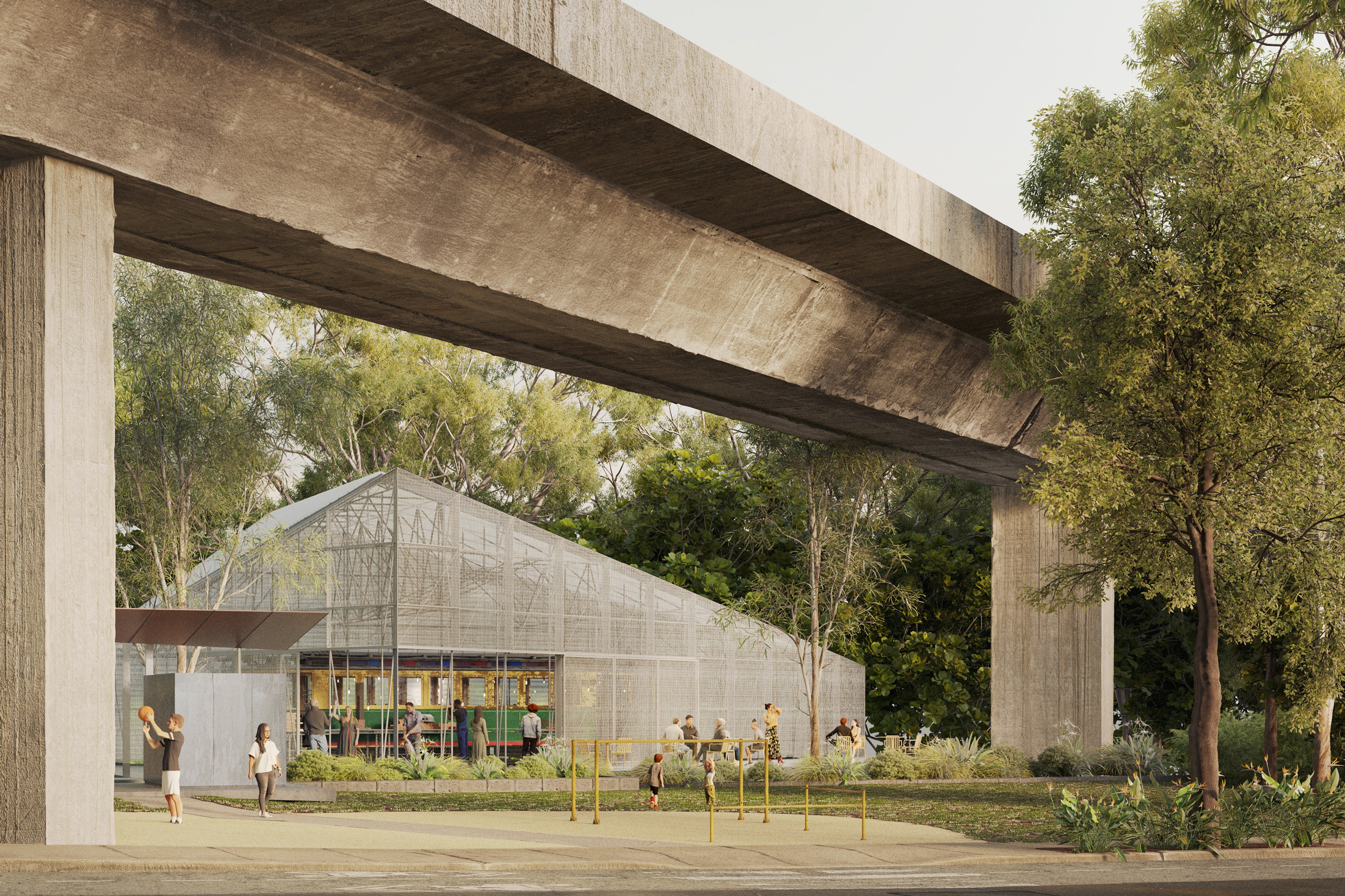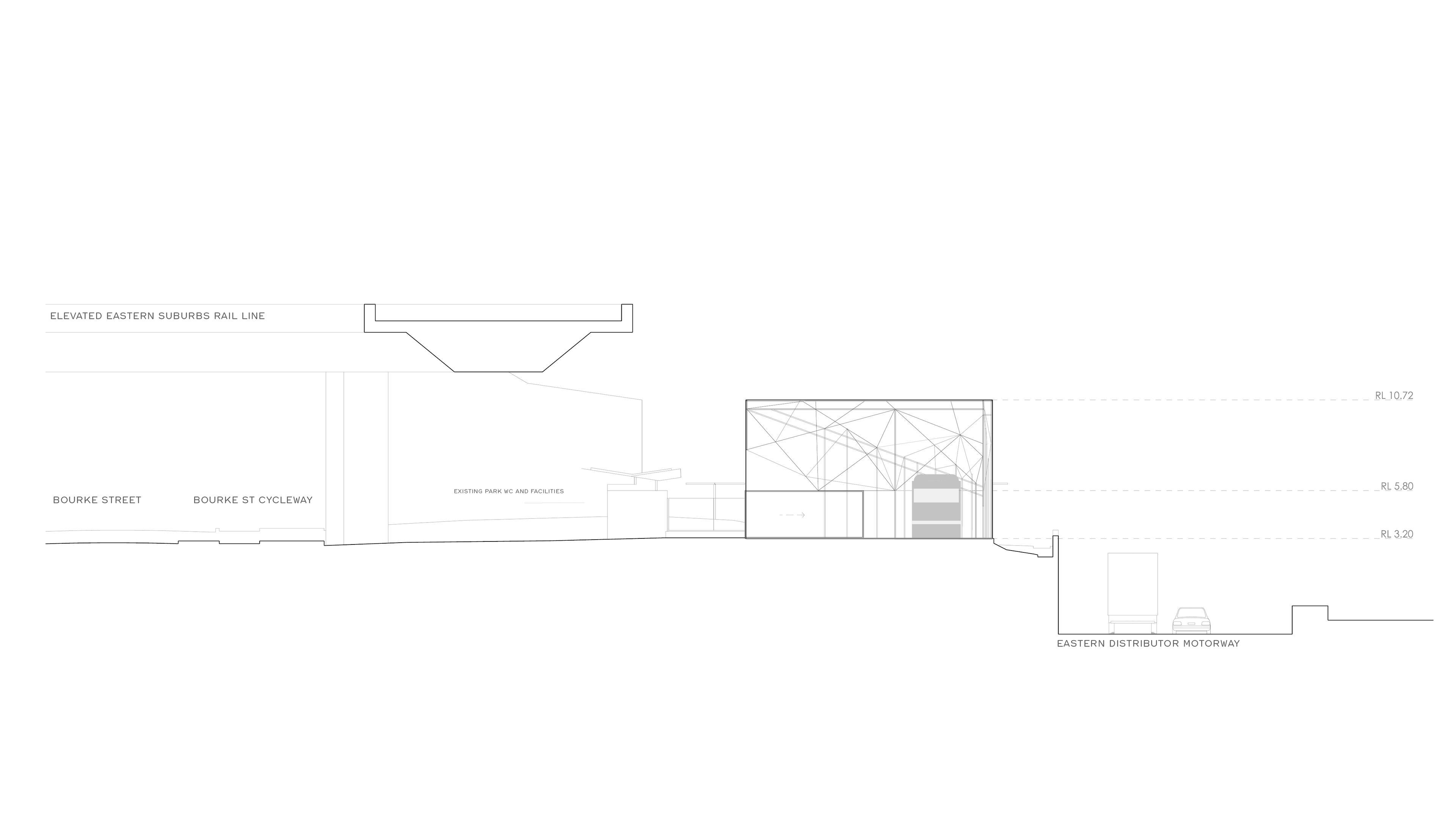 Commissioned by the City of Sydney, our project brief for this gritty urban site in Woolloomooloo was to provide a ‘mens and womens shed’– a social space that helps build self esteem through craft and making for a diverse local community including rough sleepers. To be incorporated in the enclosure was a disused tram, functioning both as a working interior and an element to restore as part of the shed’s activities.